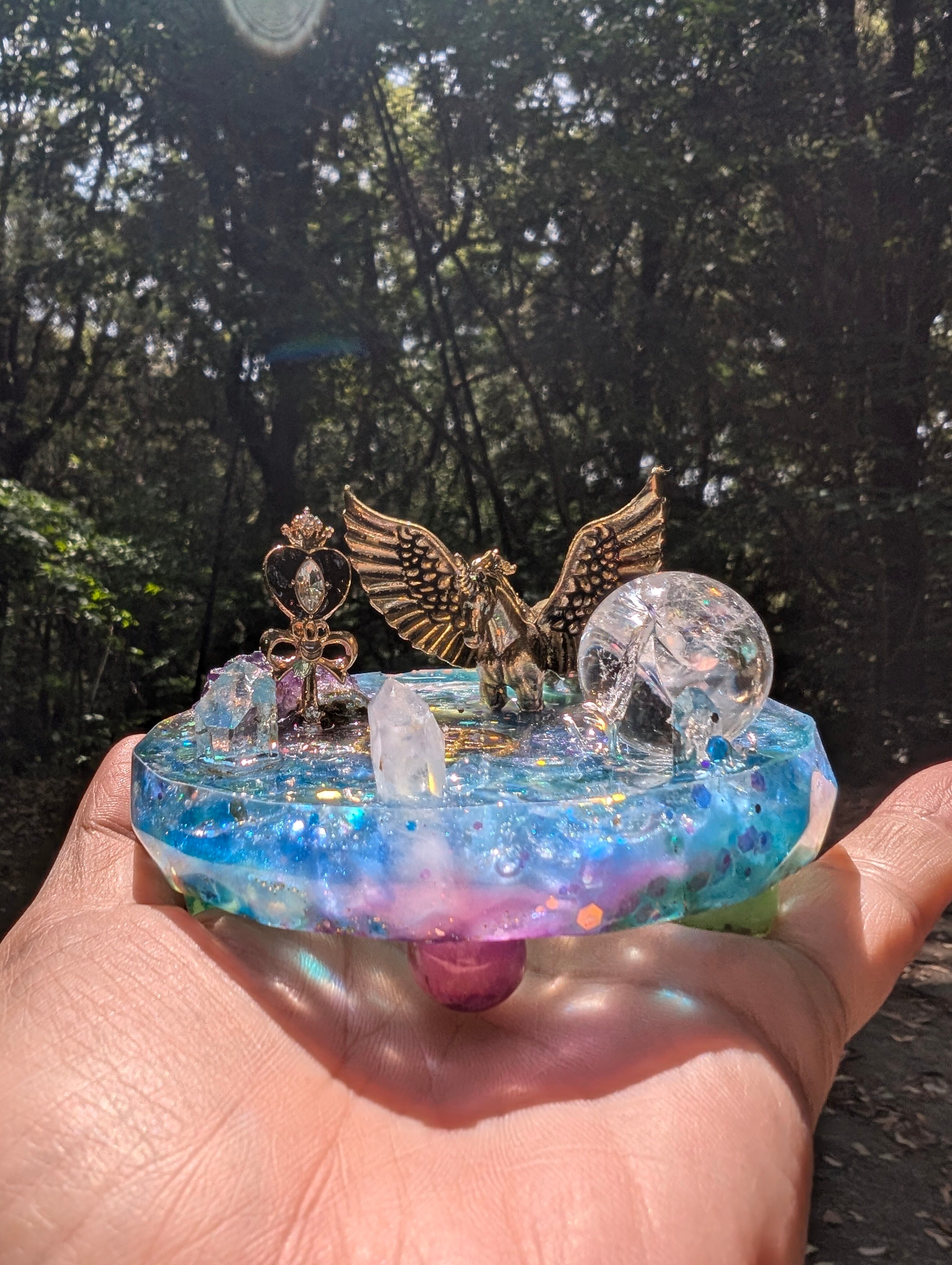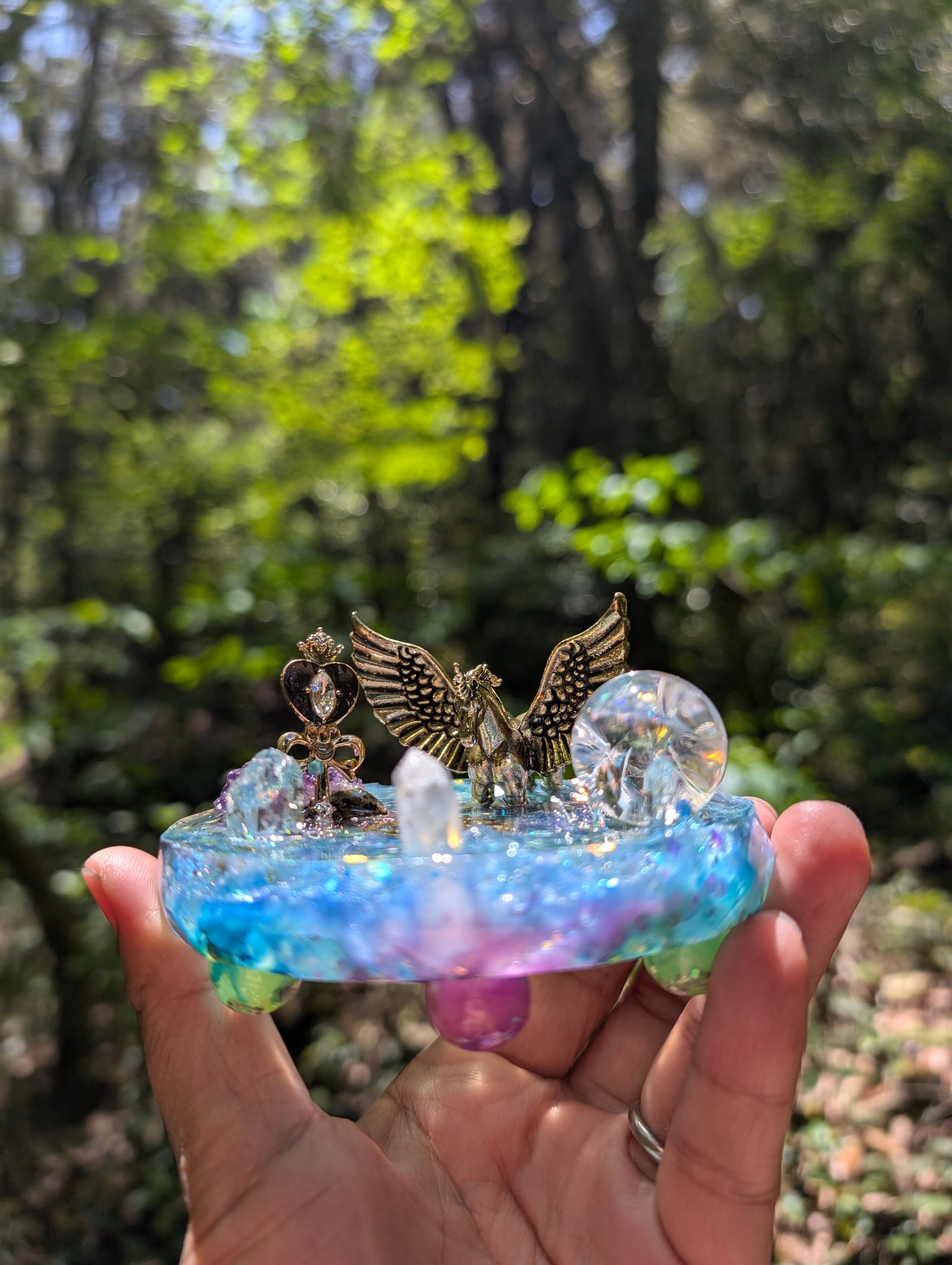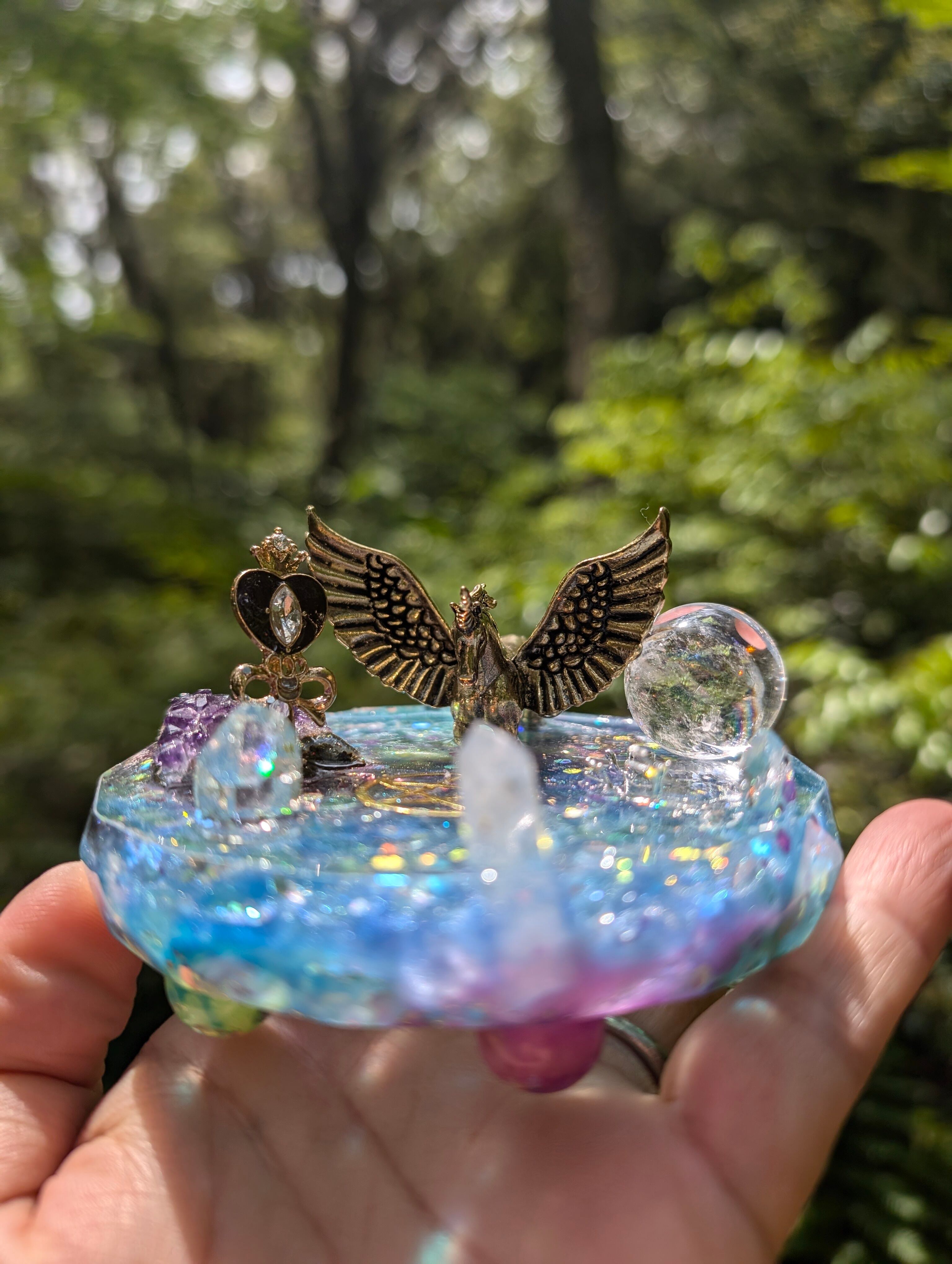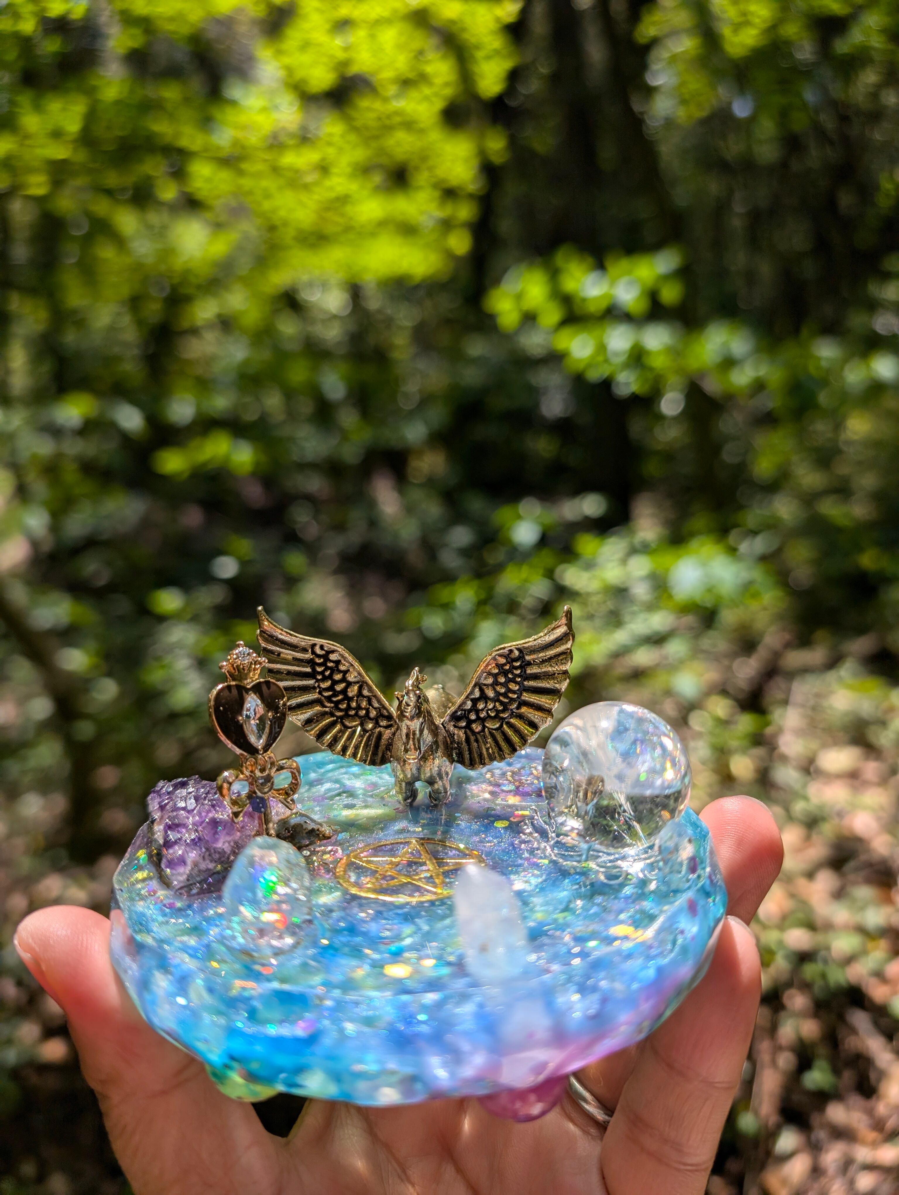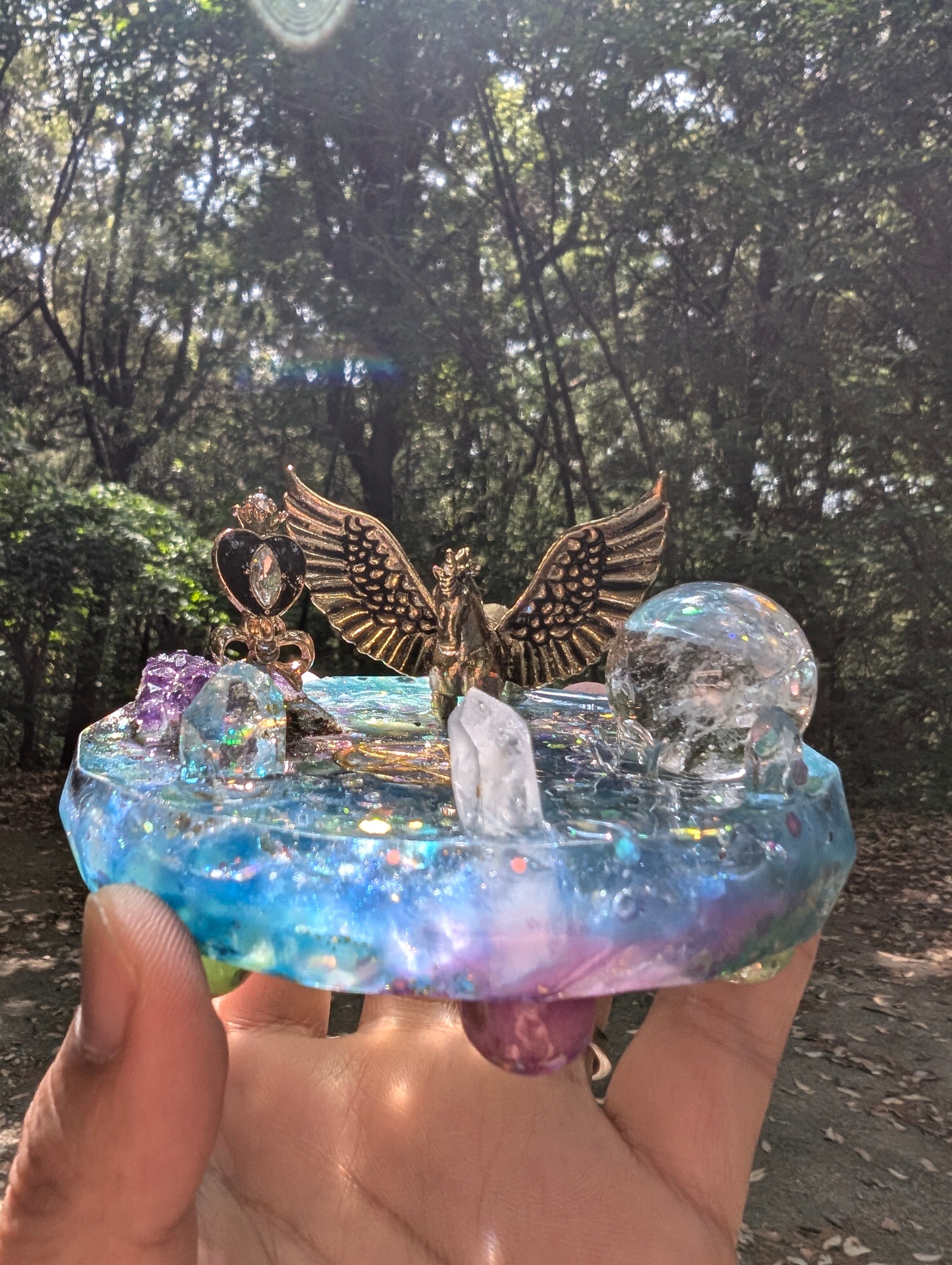 その湖はとても美しく、鏡のように水晶玉(虹が沢山入ったアイリスクォーツ)が湖を映し出します。アイリスクォーツは取り外しできます。