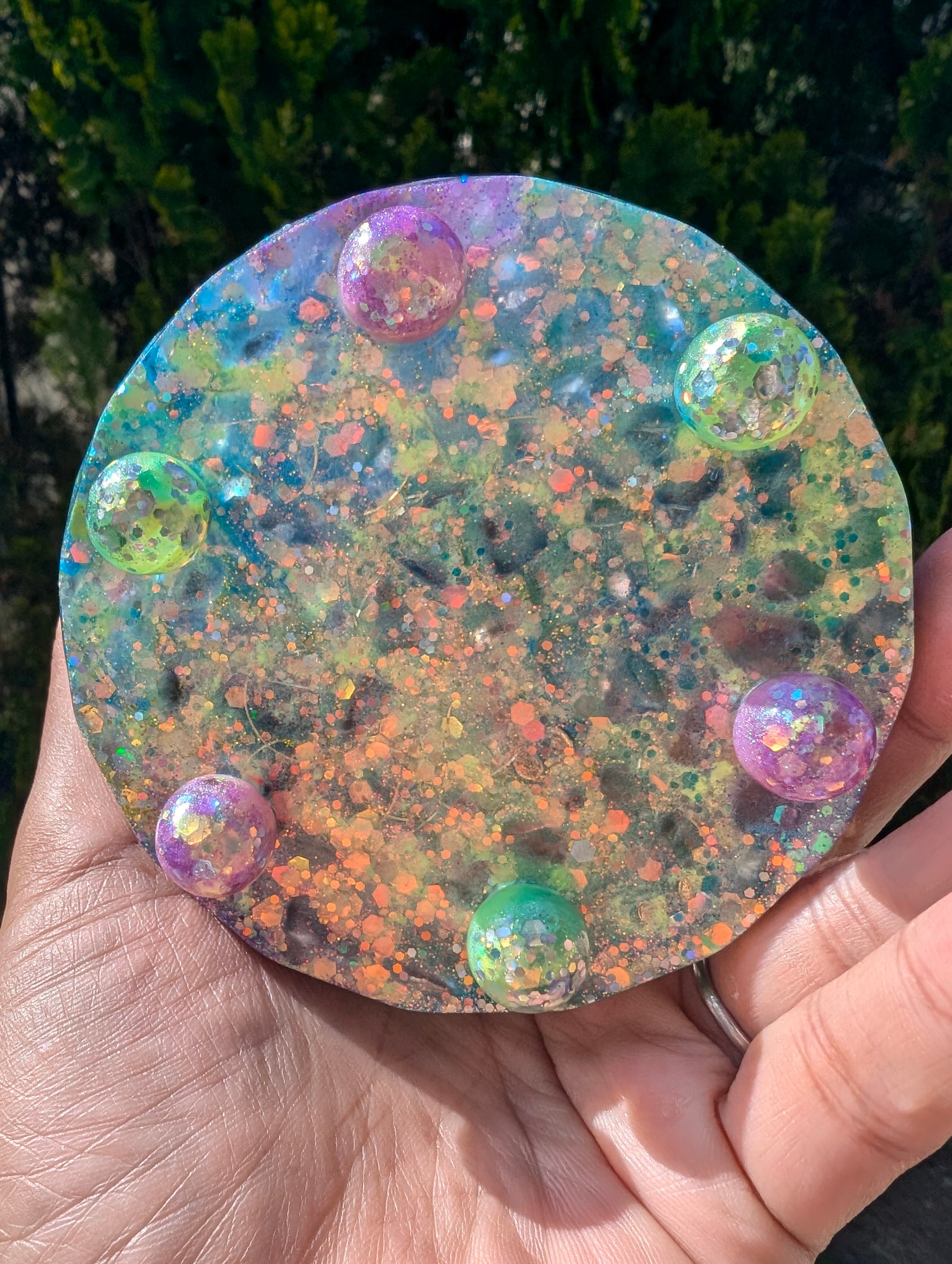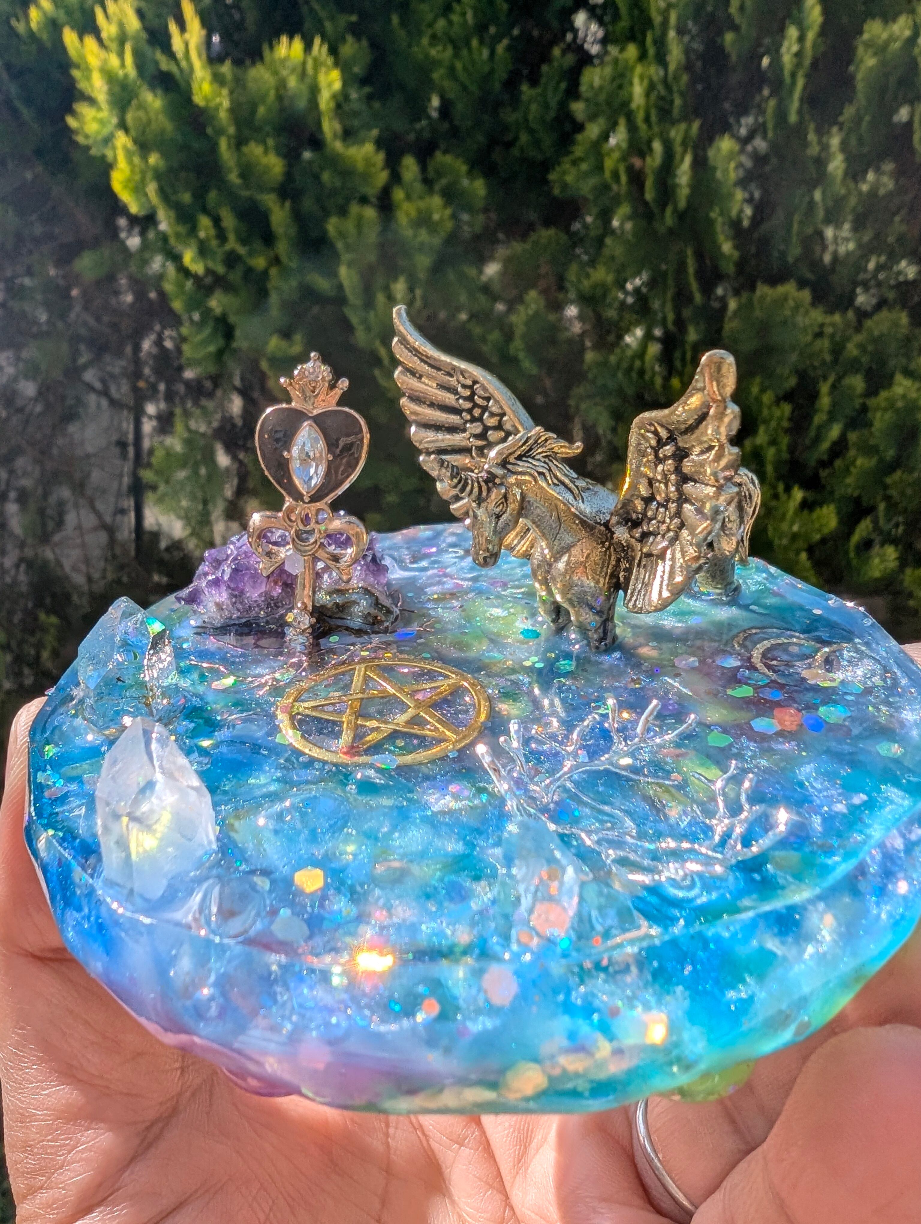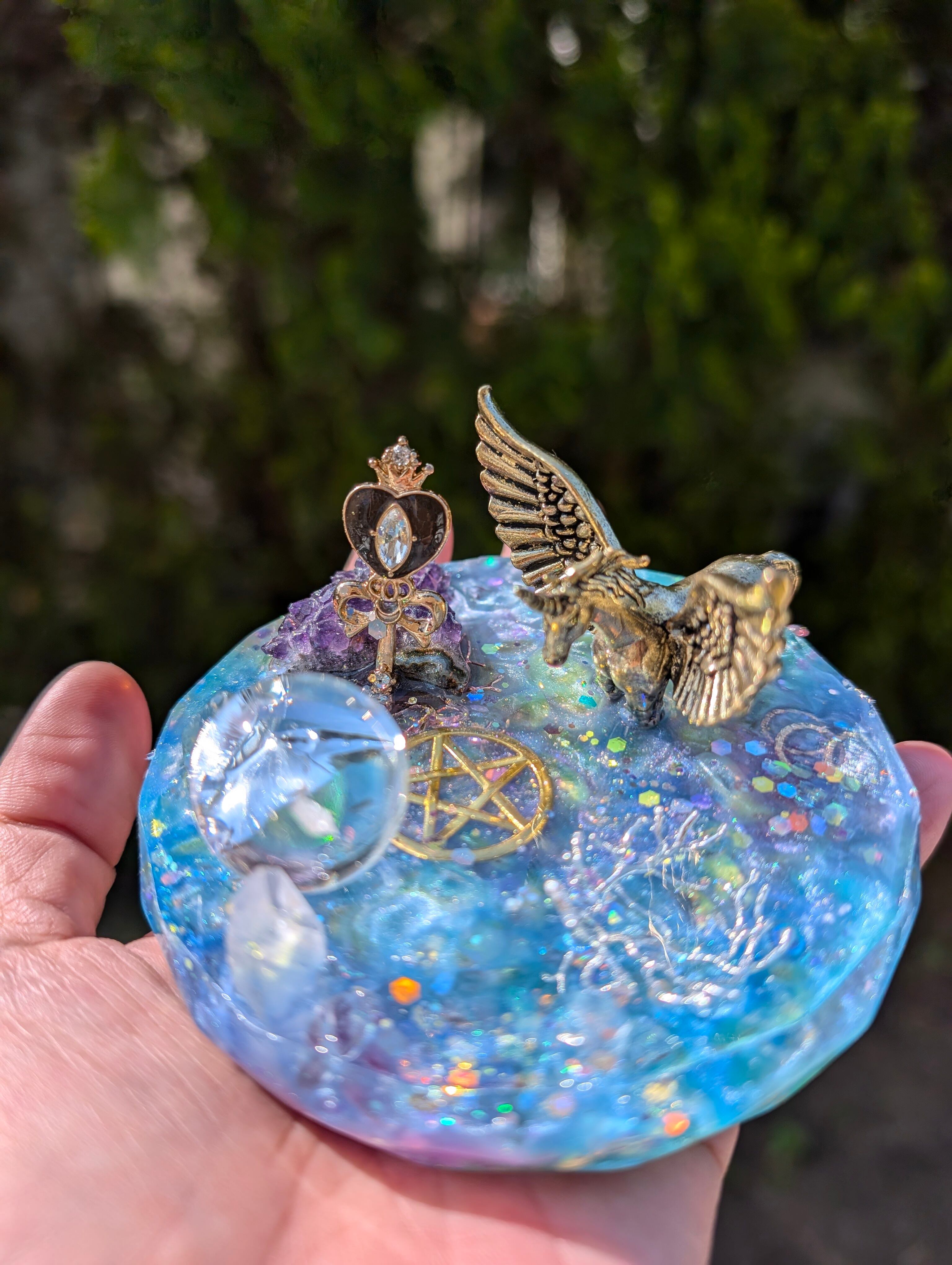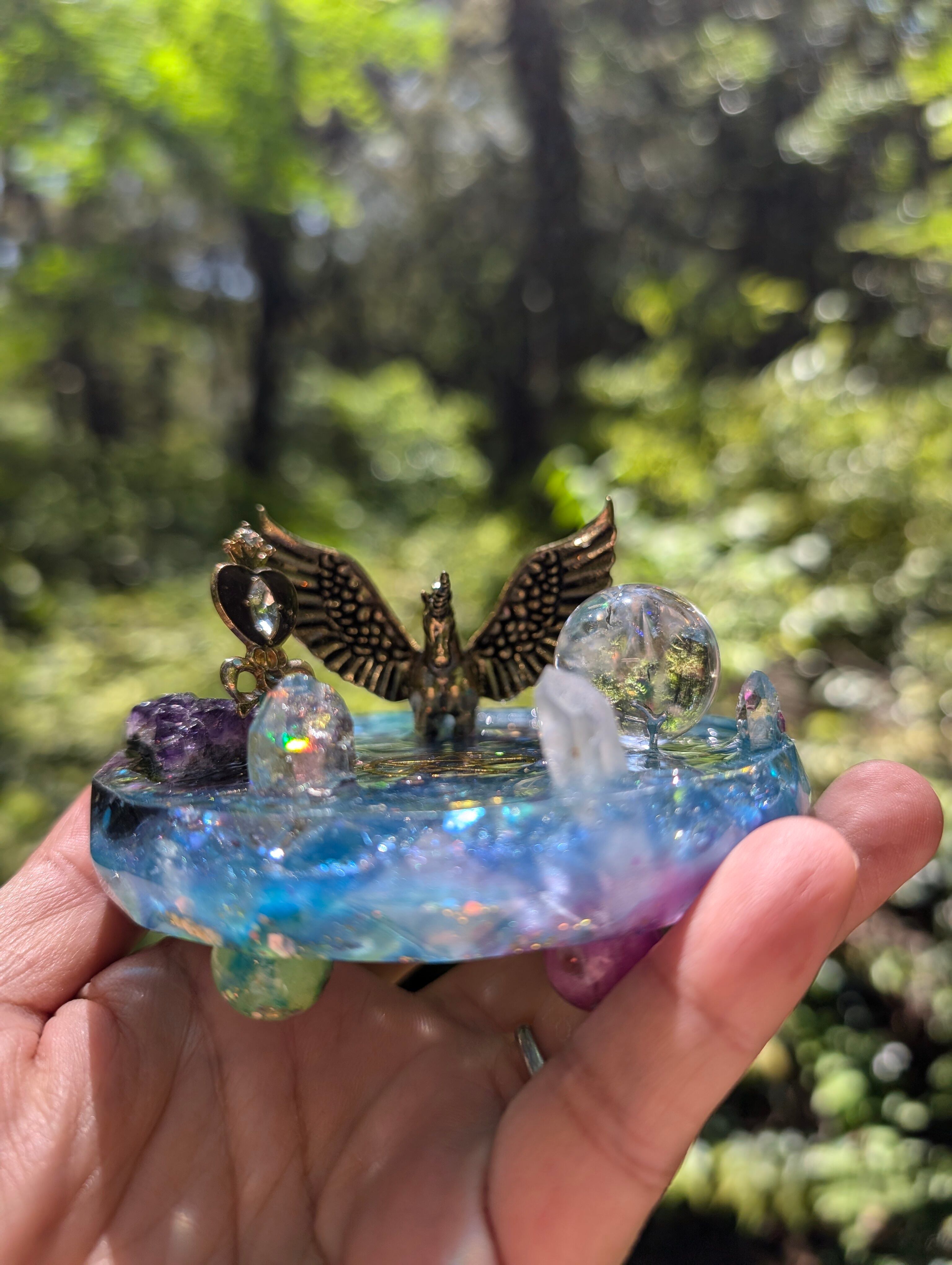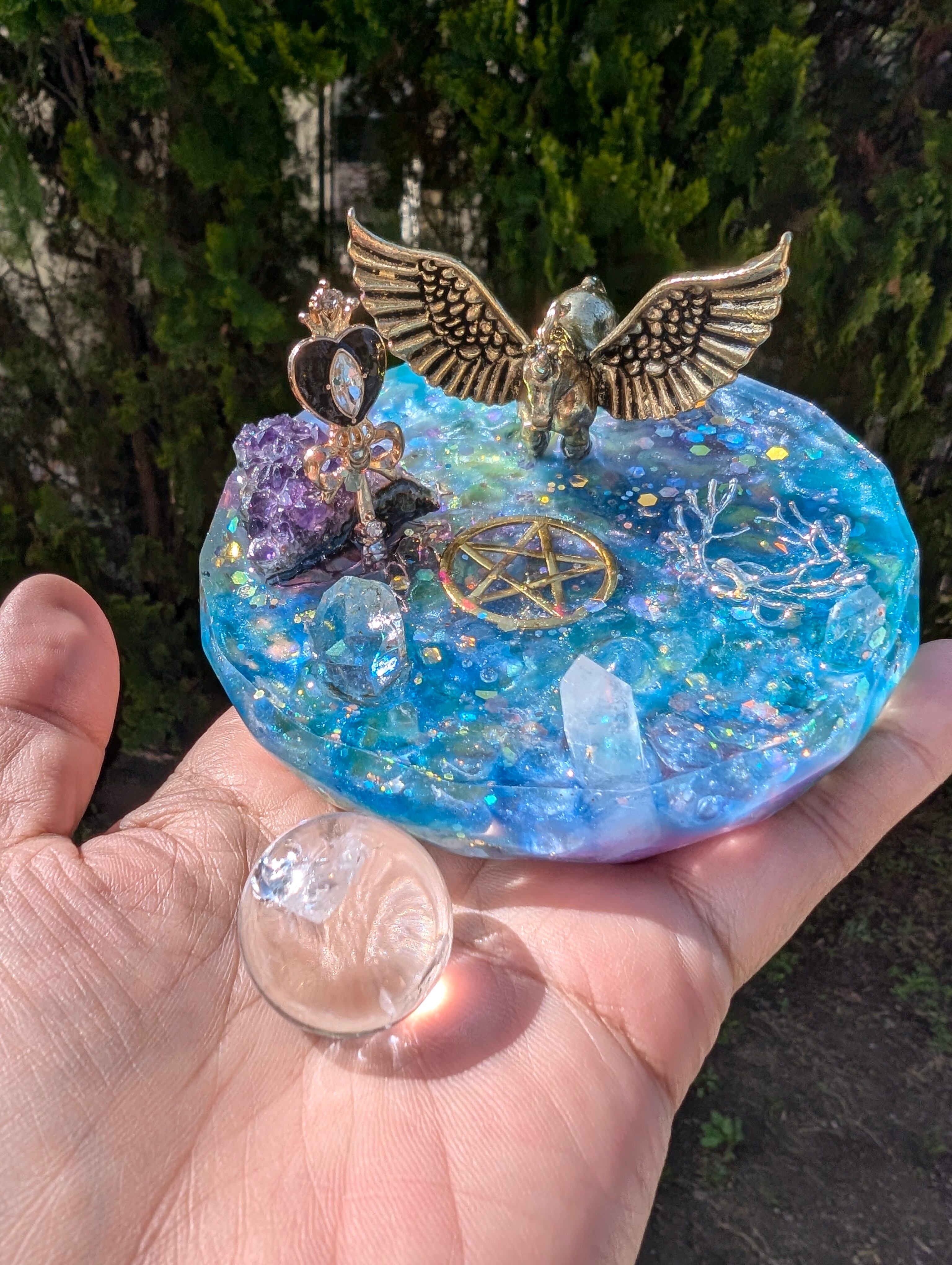 その湖はとても美しく、鏡のように水晶玉(虹が沢山入ったアイリスクォーツ)が湖を映し出します。アイリスクォーツは取り外しできます。