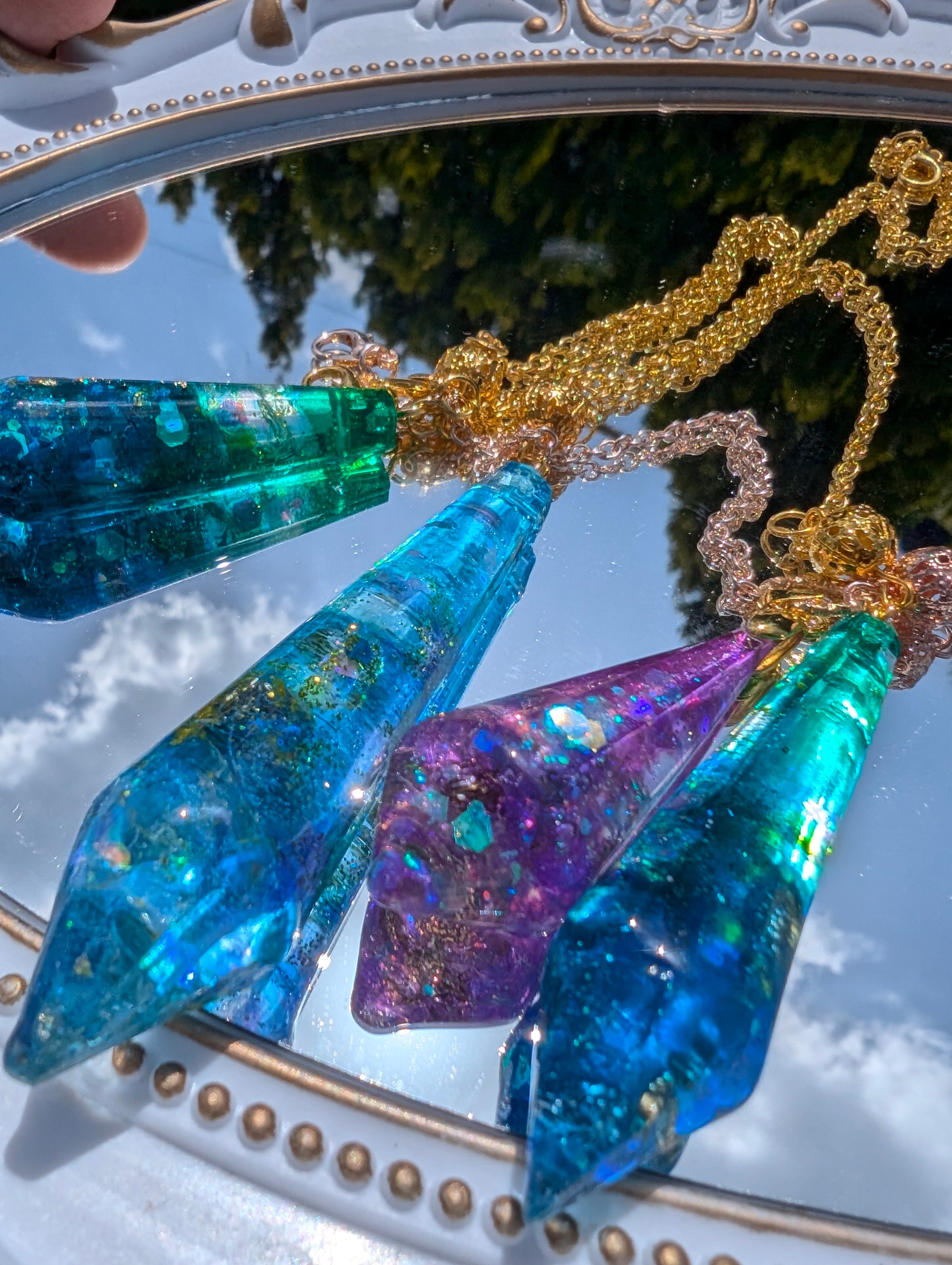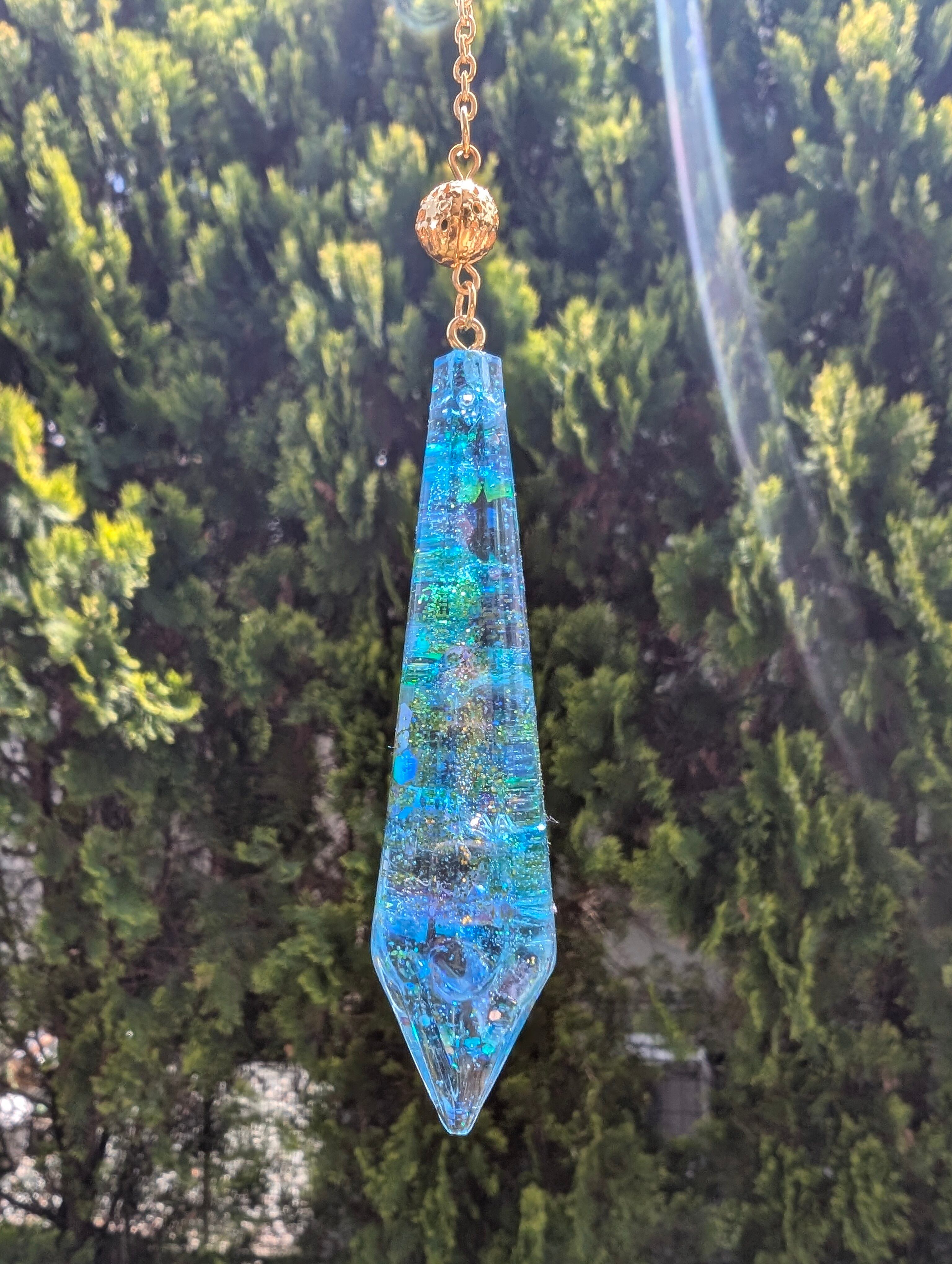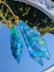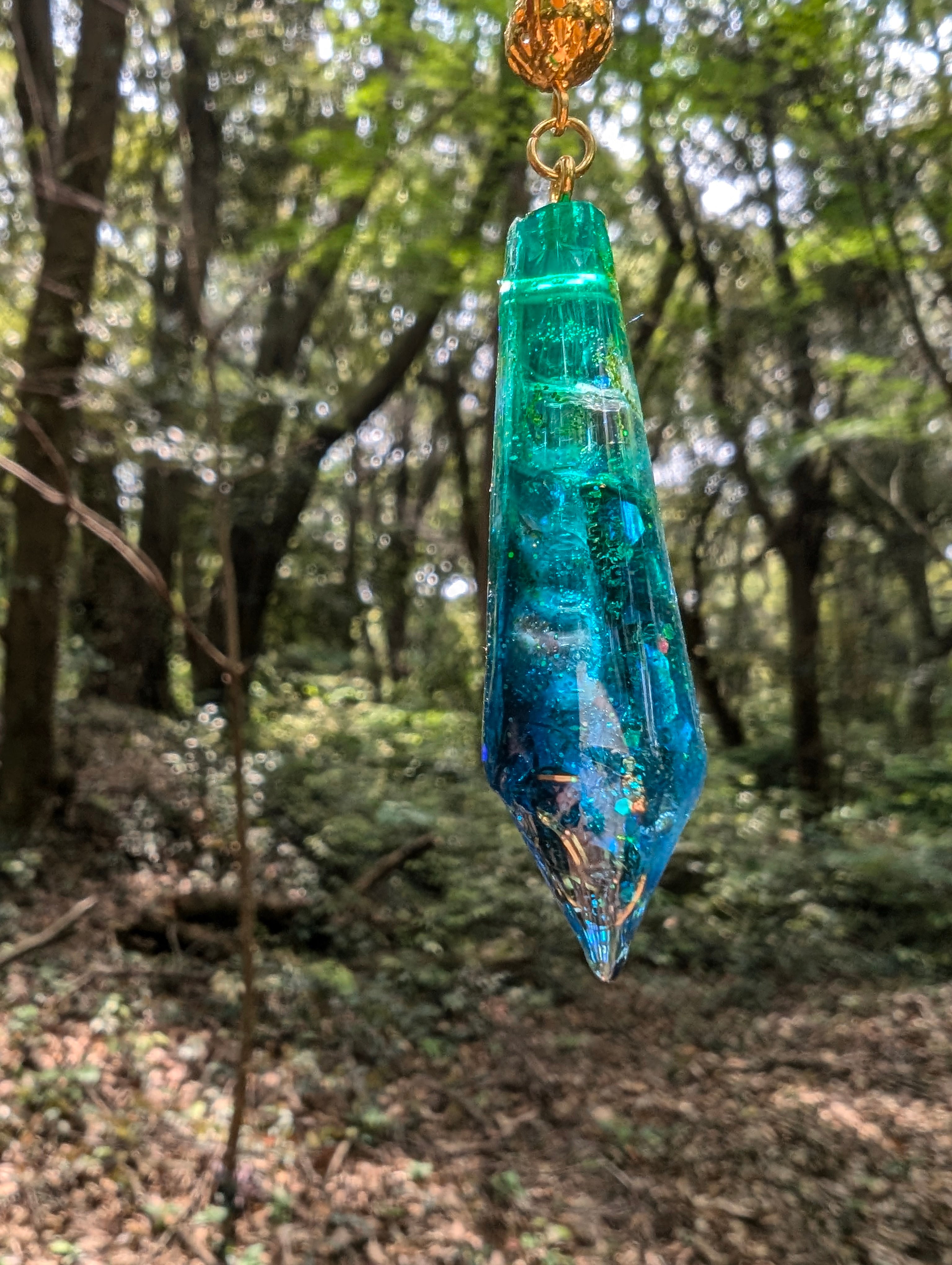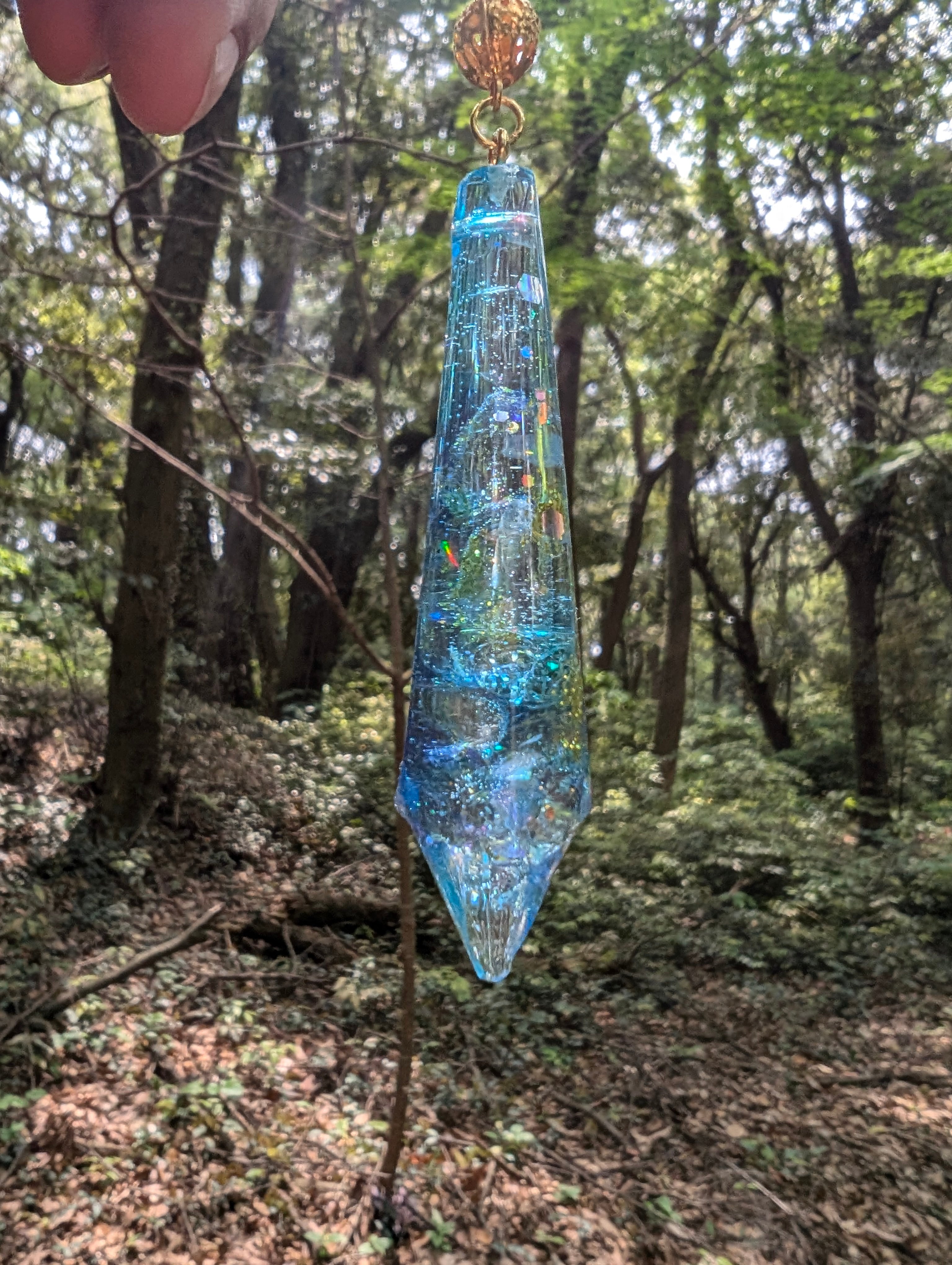 ①ブルーのサイズ(オルゴナイトの部分7.5cm、紐の長さ19.5cm 合わせて約27cm)