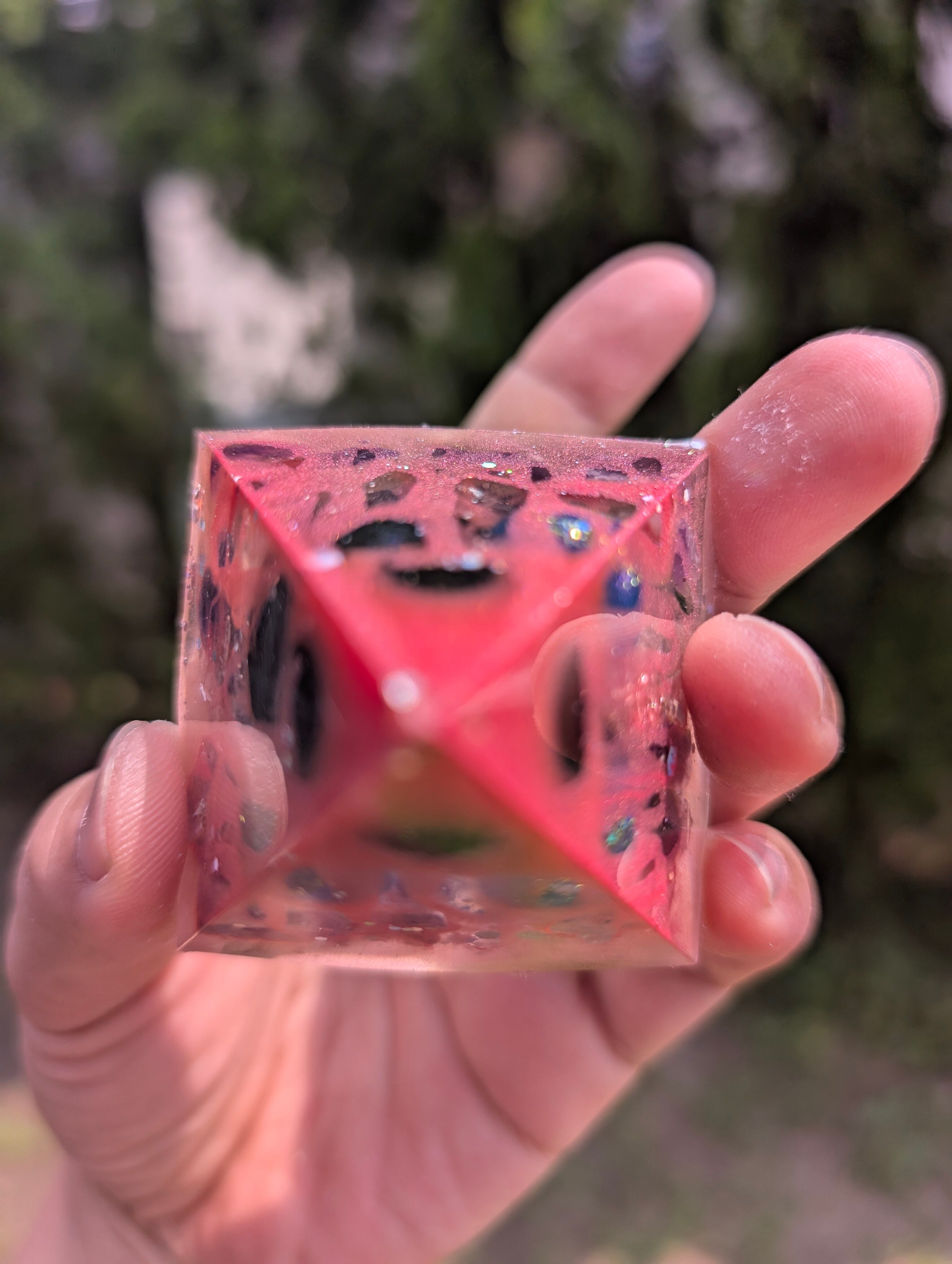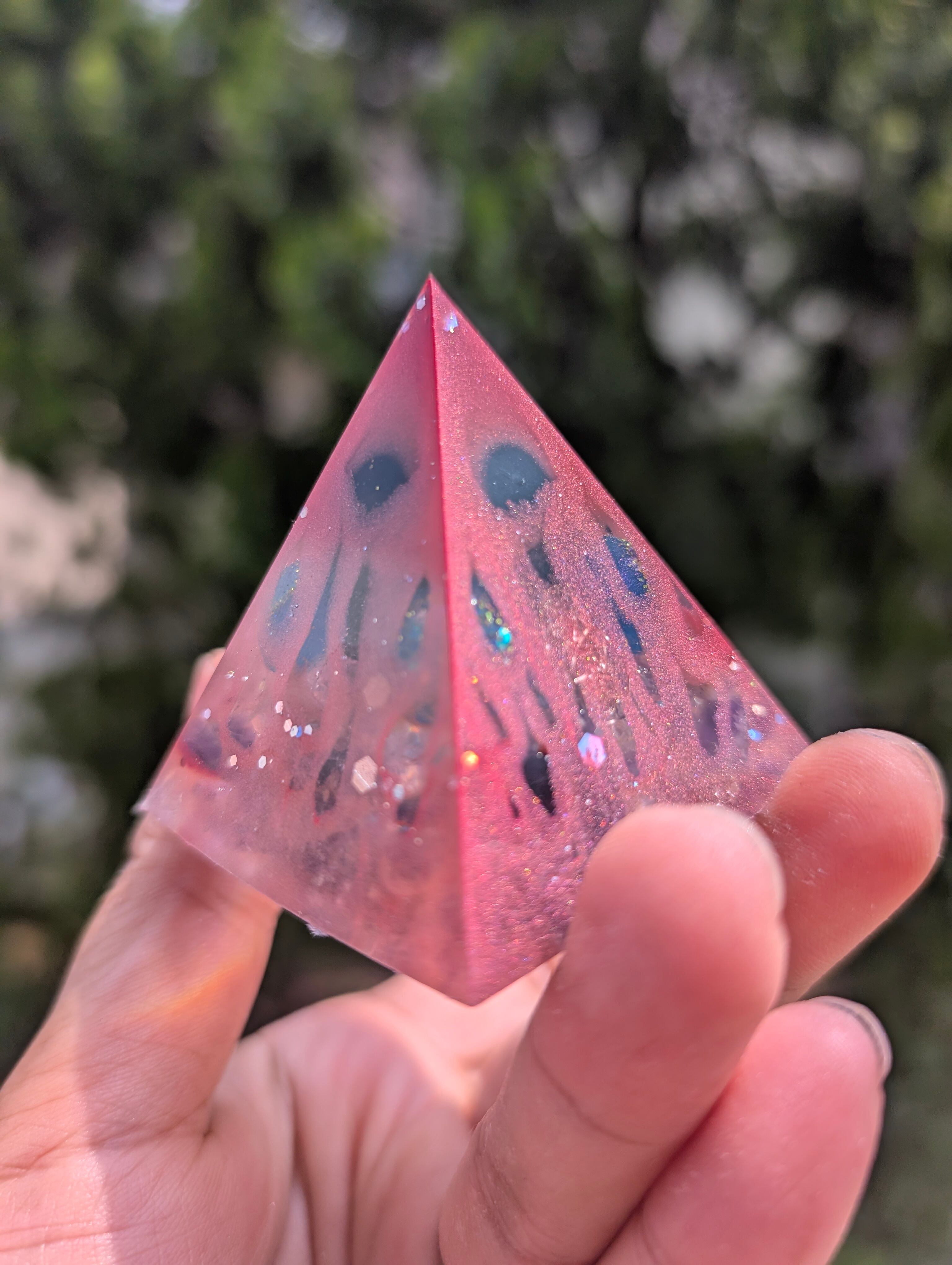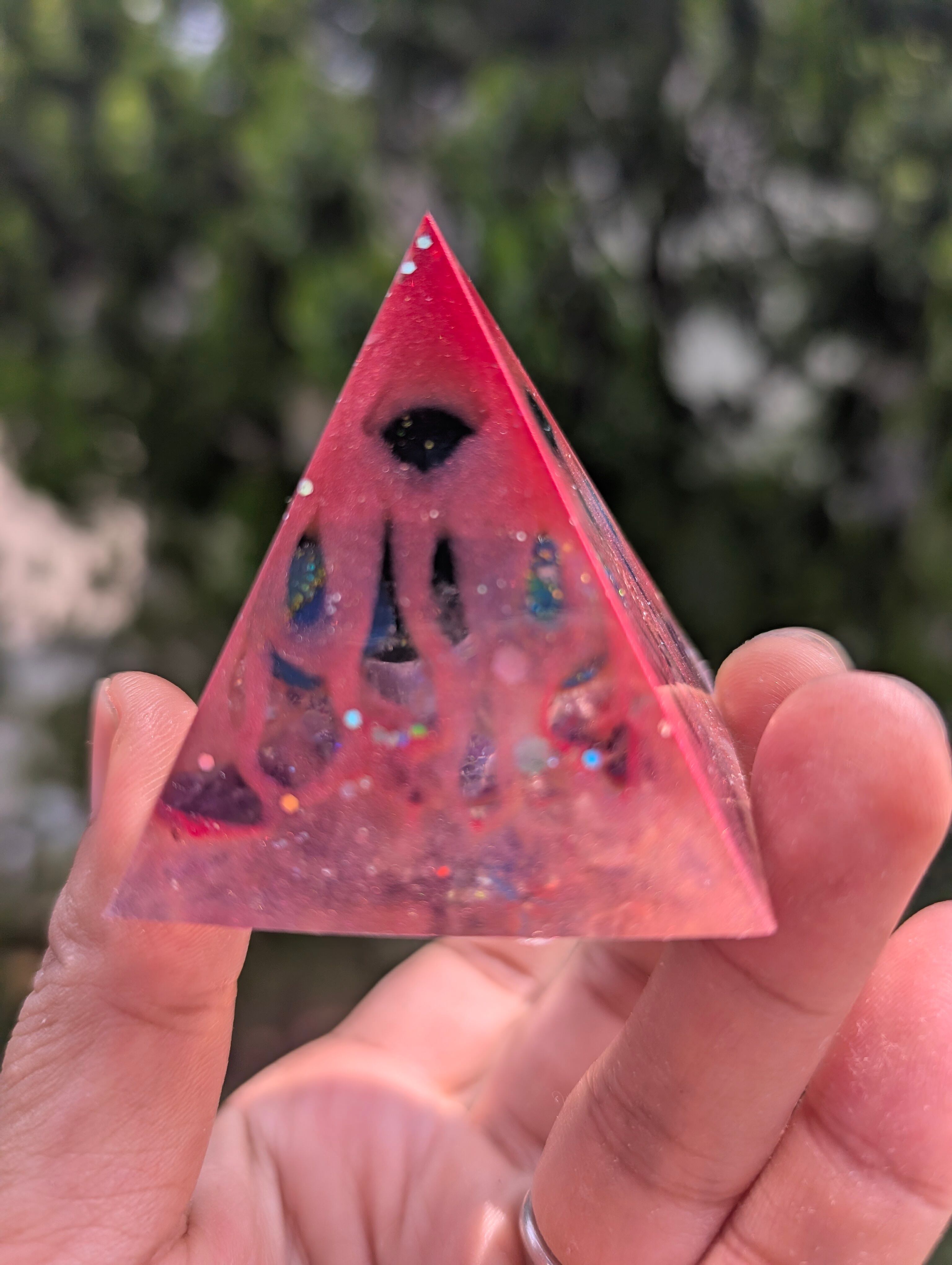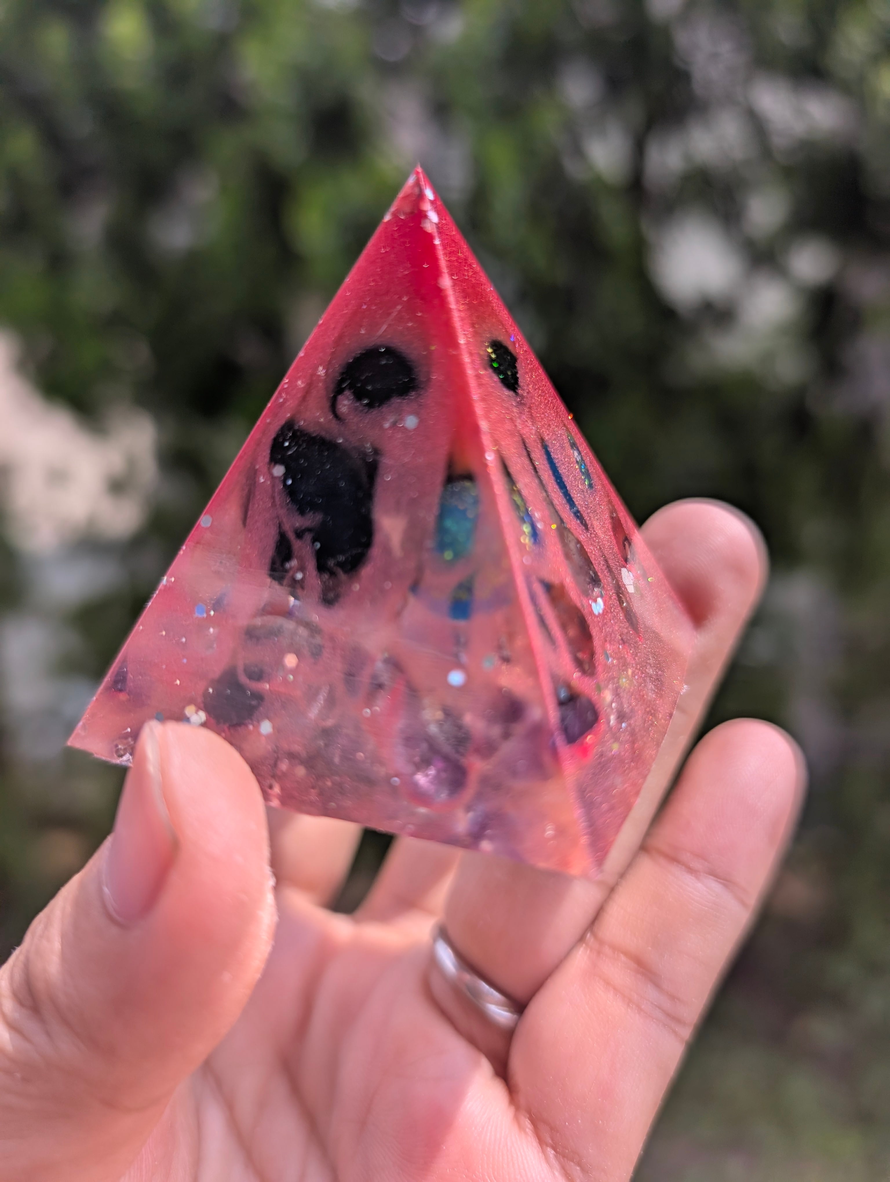 こちらは、盛り塩で作った龍の青玉が3個、麻炭で作った黒玉が1つ入った赤龍オルゴナイトです✨その下には、水晶、アメジストがたっぷり入っています!