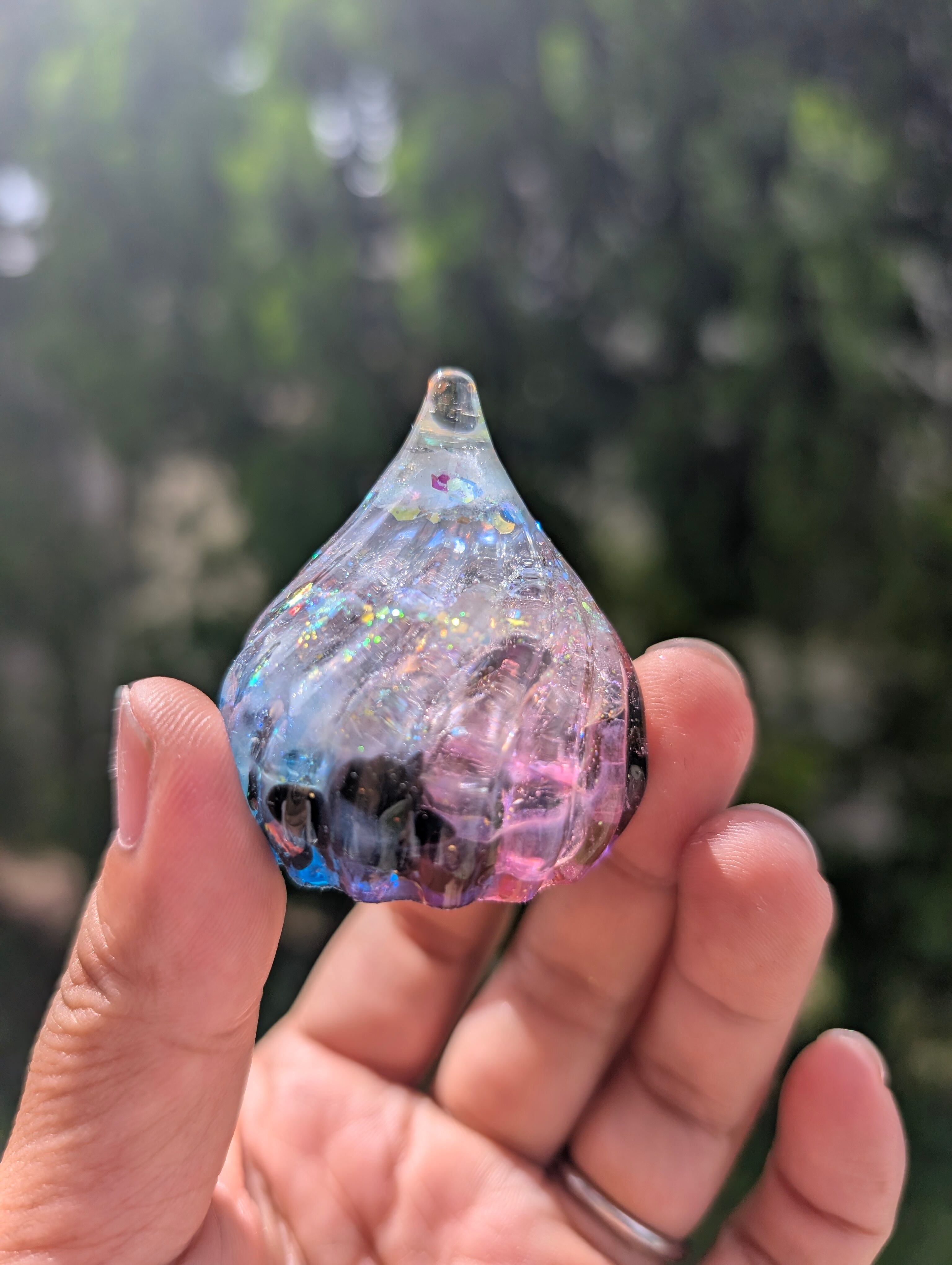 トップには、オーロラに光り輝く盛り塩を封入しました。使用しております神塩は、福岡県久留米市に鎮座する高良大社さまのお塩です。