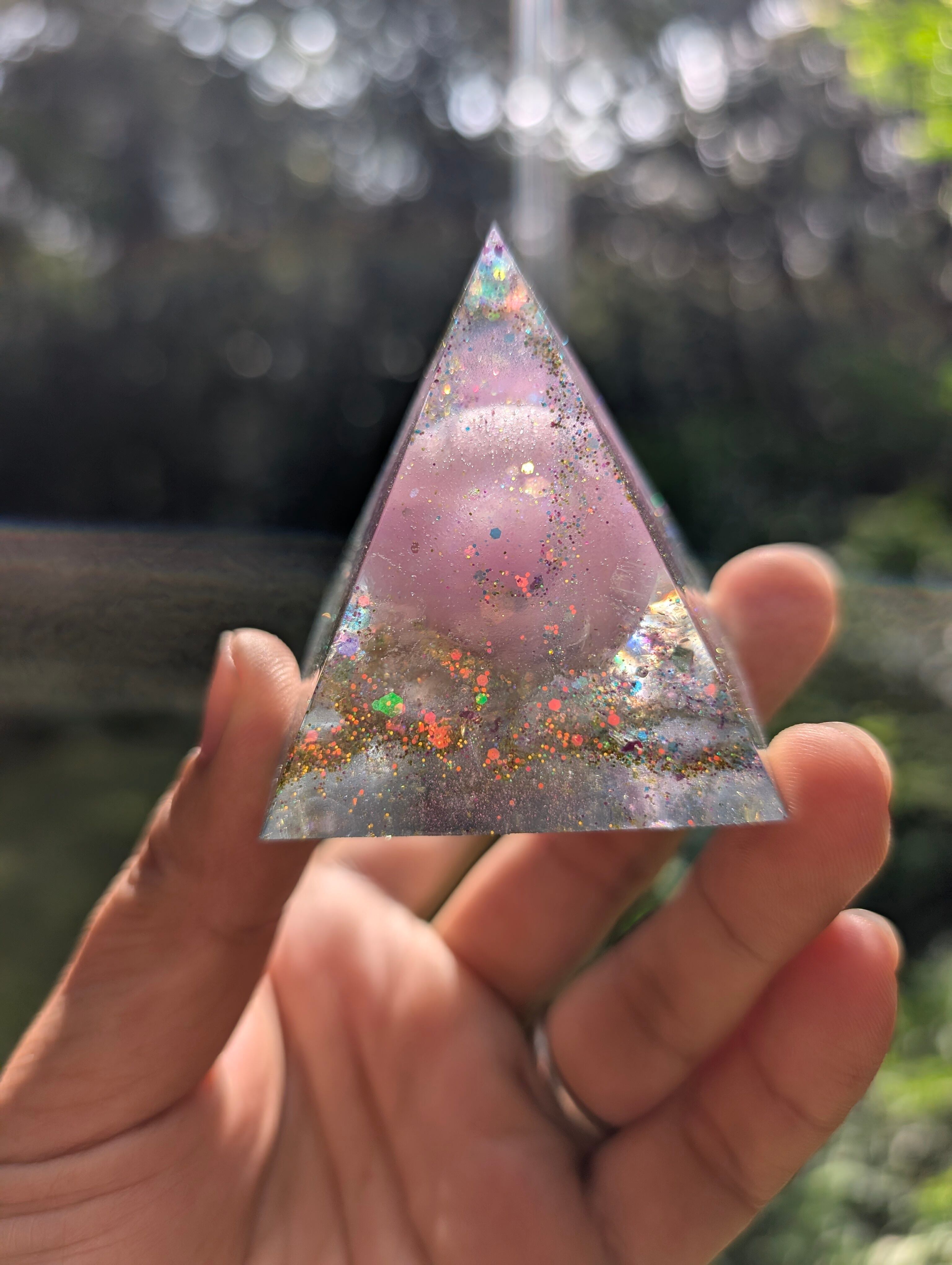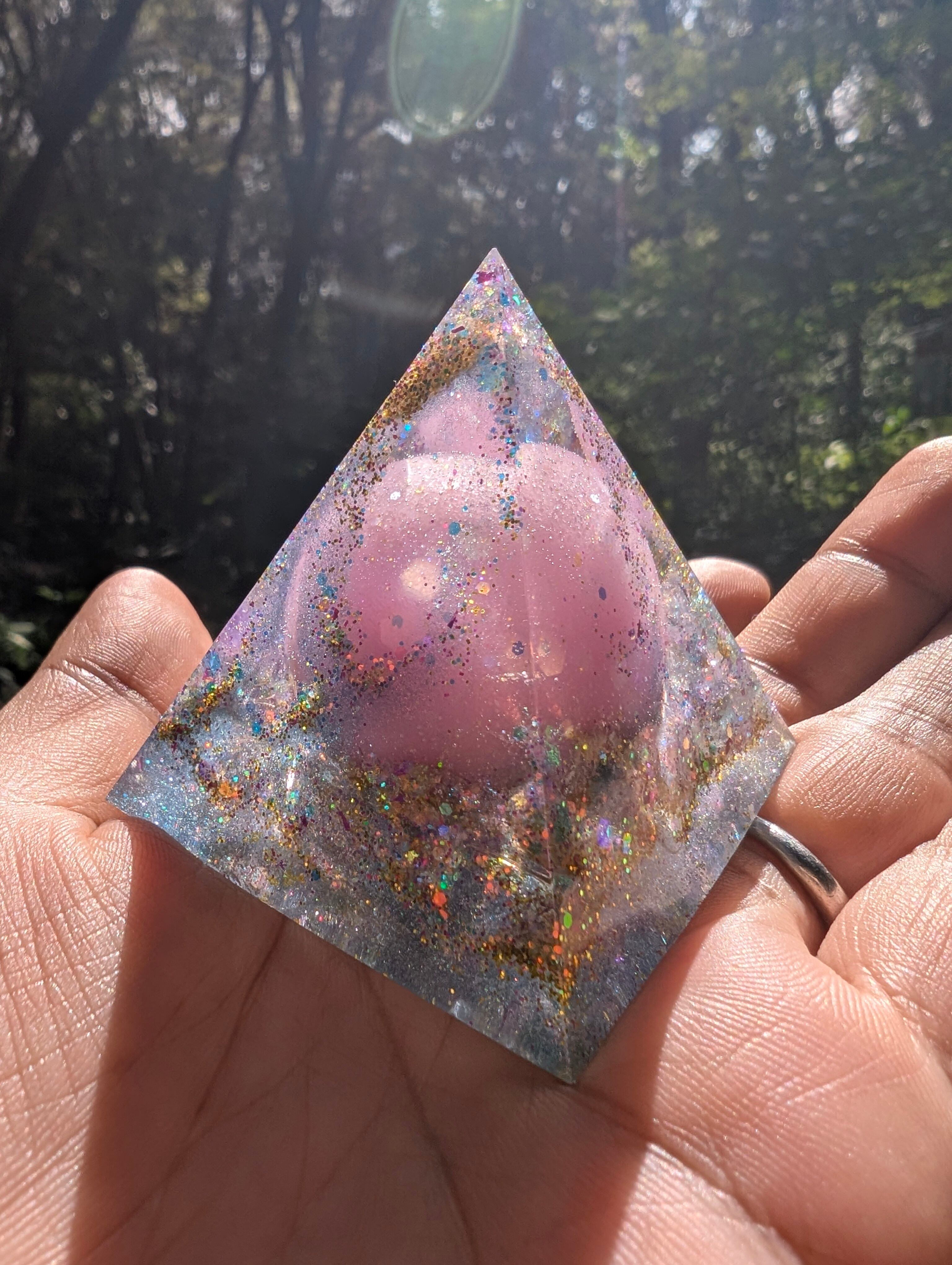 とても大きな大きなやさしいピンクの盛り塩の結晶と光の粒が、まるで女神の祈りを閉じ込めたように輝きます。