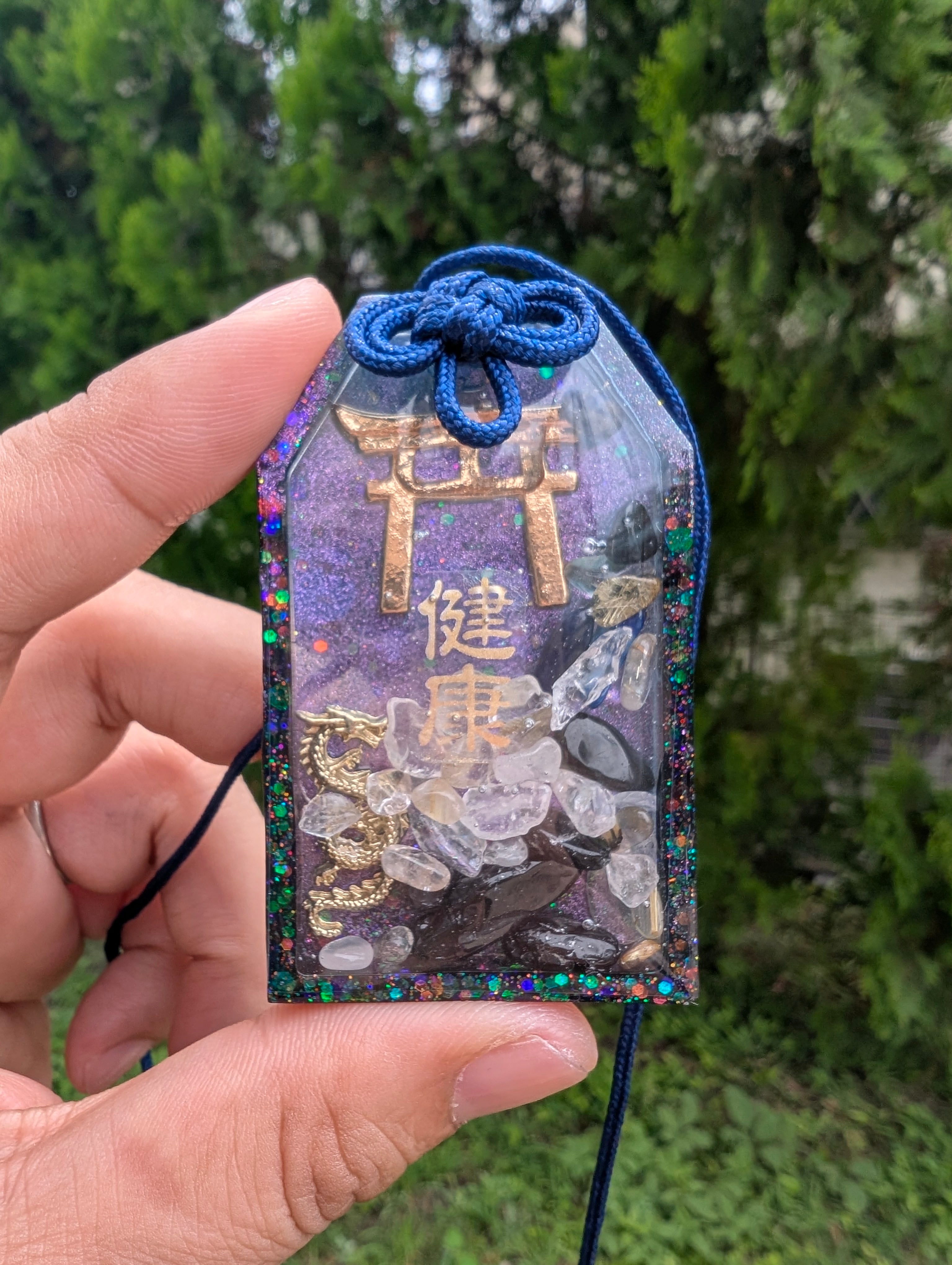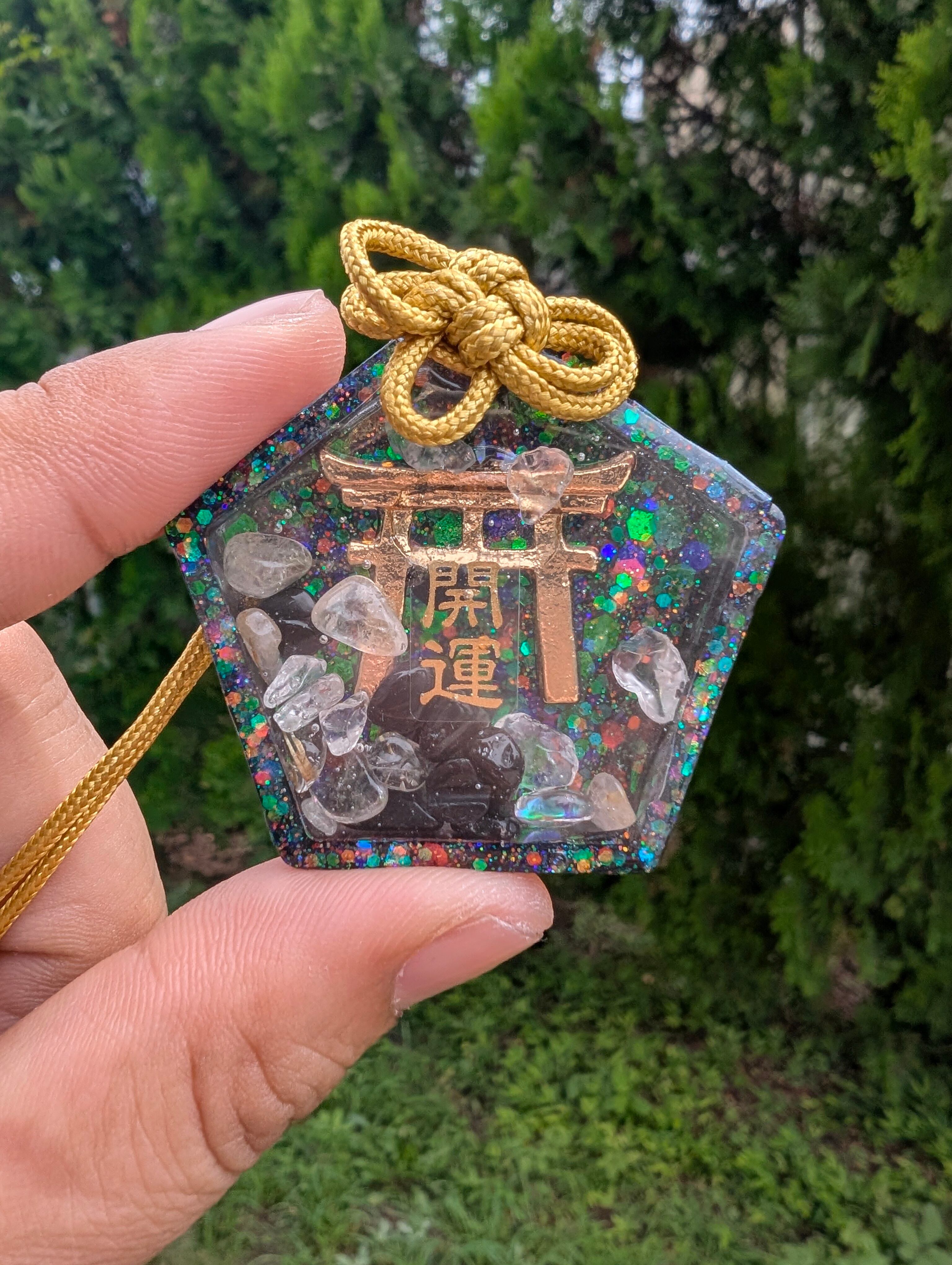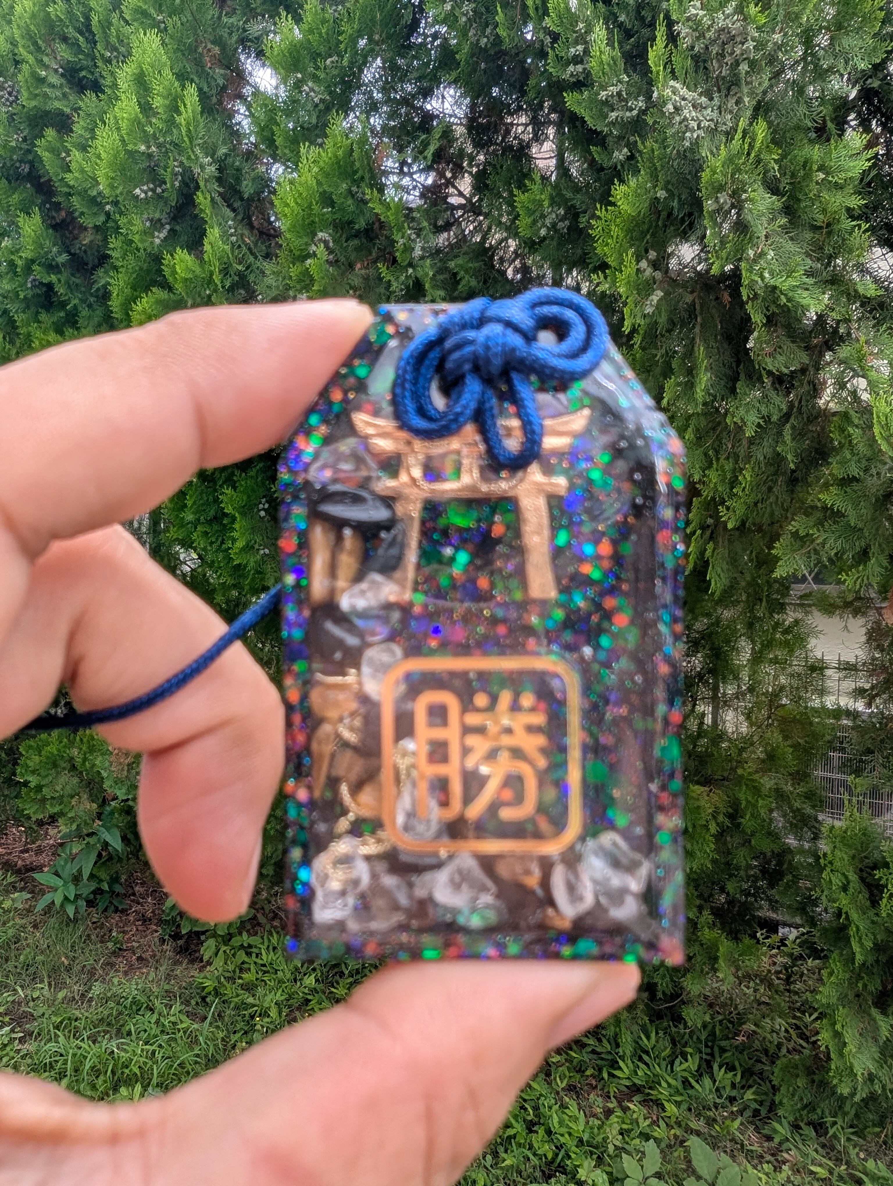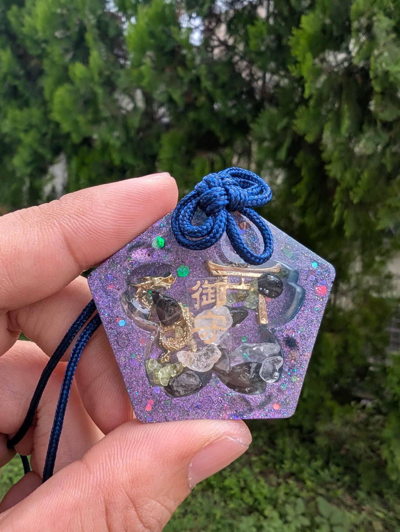 こちらは、モリオン、宮古島麻炭が入った結界の御守オルゴナイトです。