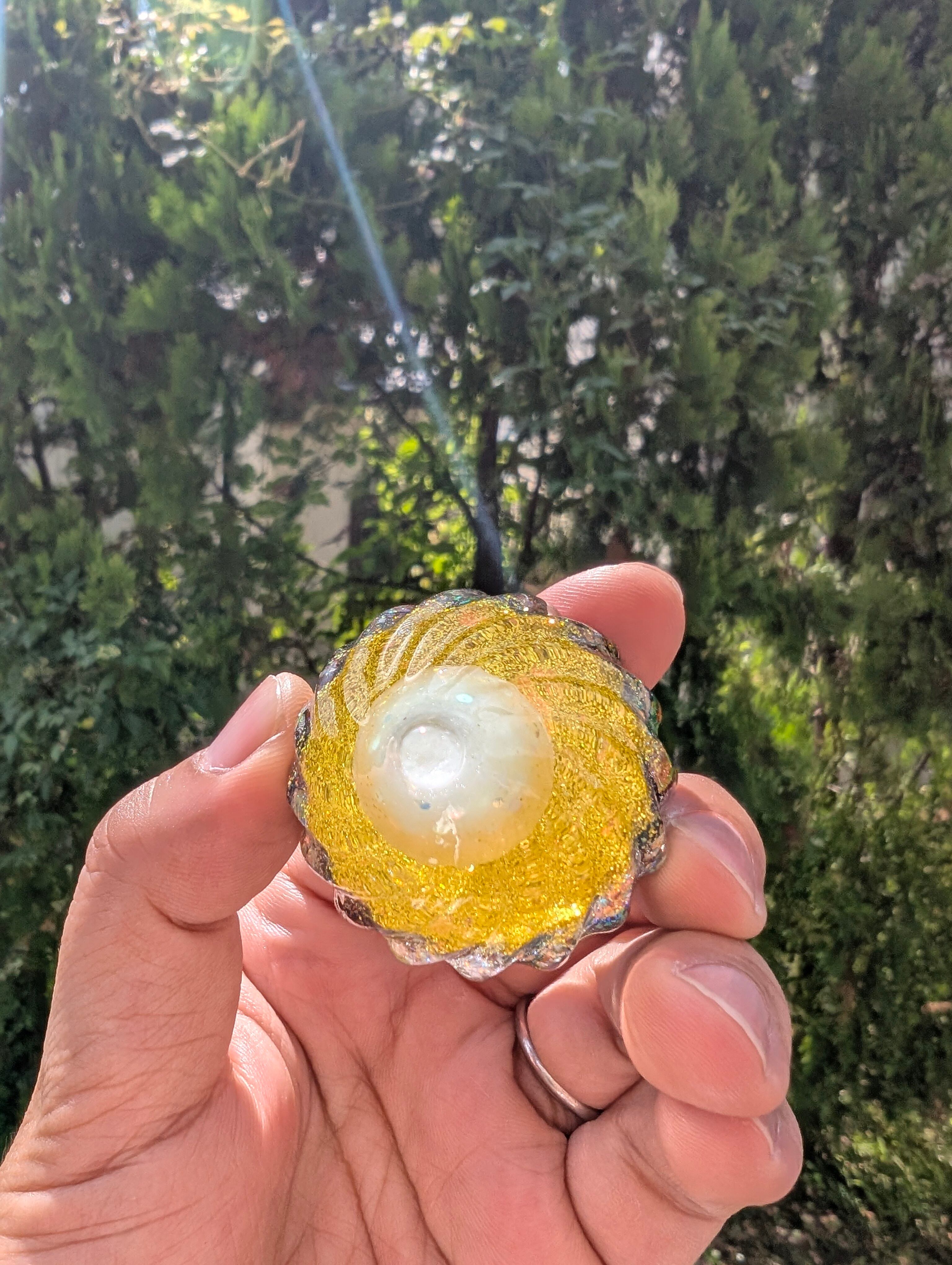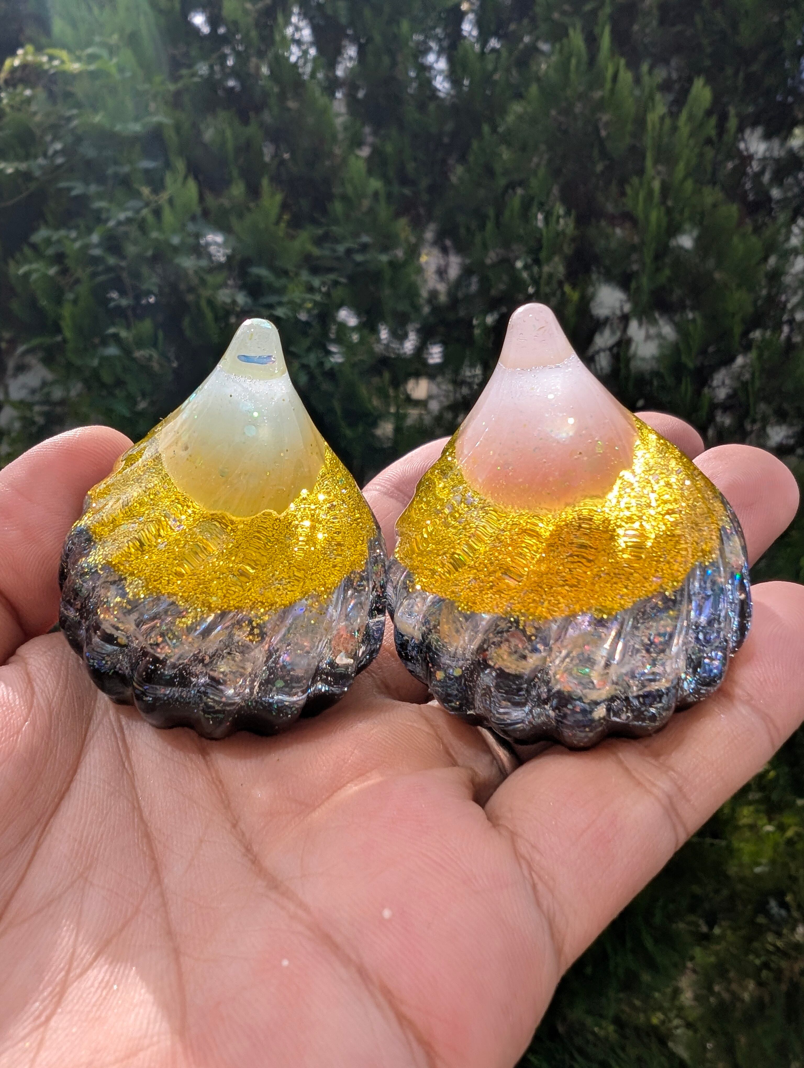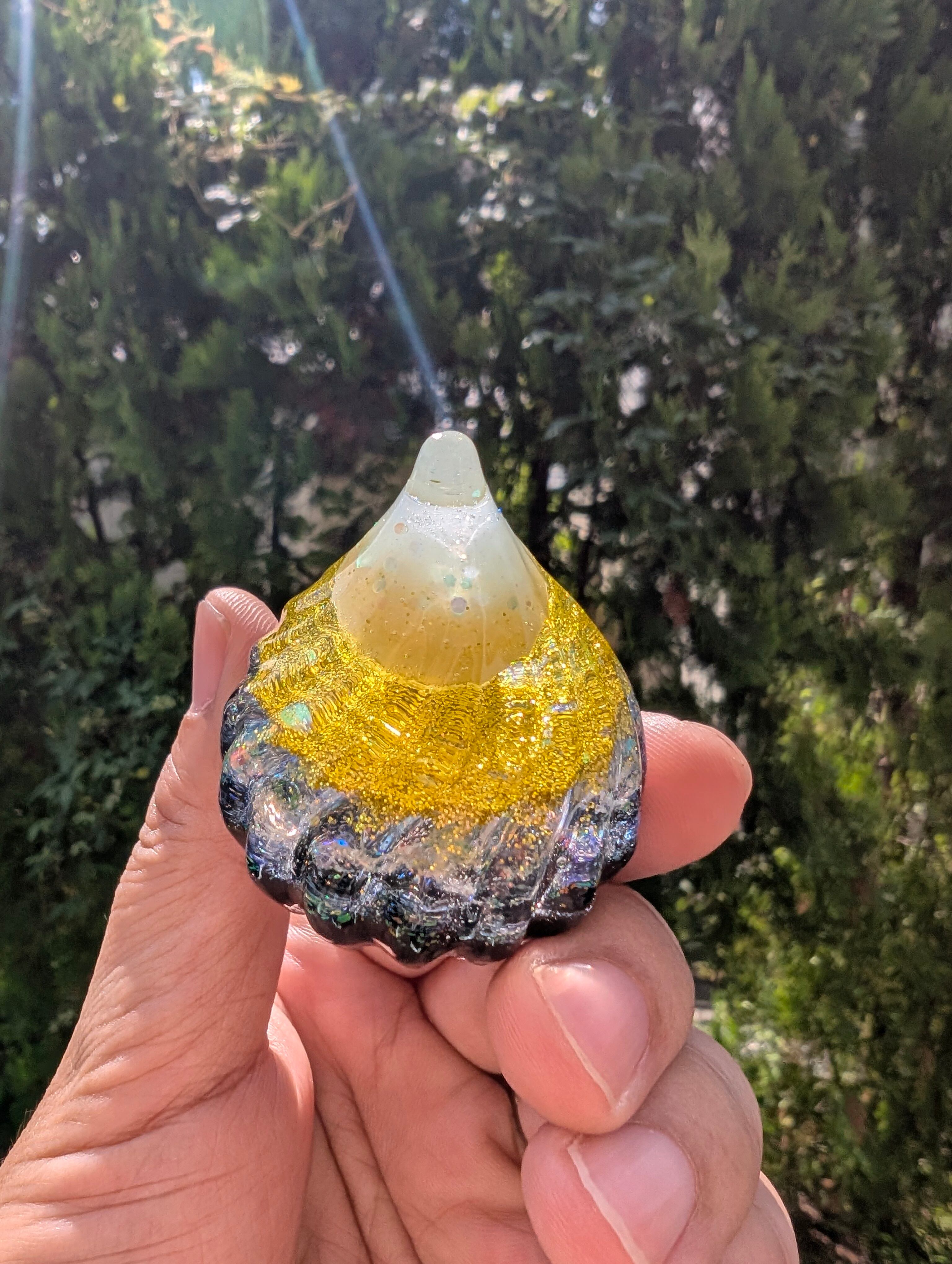 こちらは、オオクニヌシの盛り塩オルゴナイトです。下の黒い部分は宮古島の麻炭を使用しており、宇宙と繋がり、結界もはります!