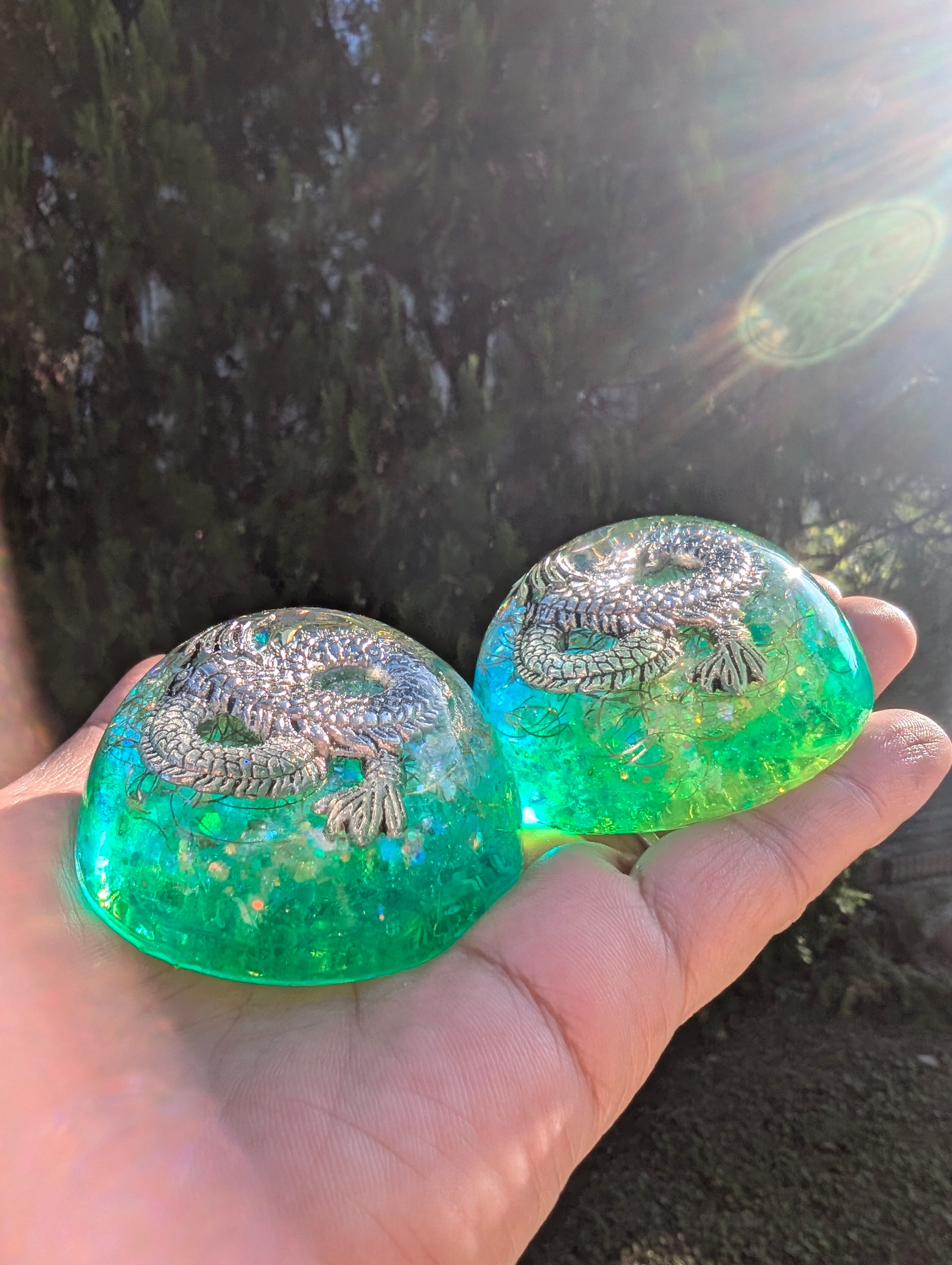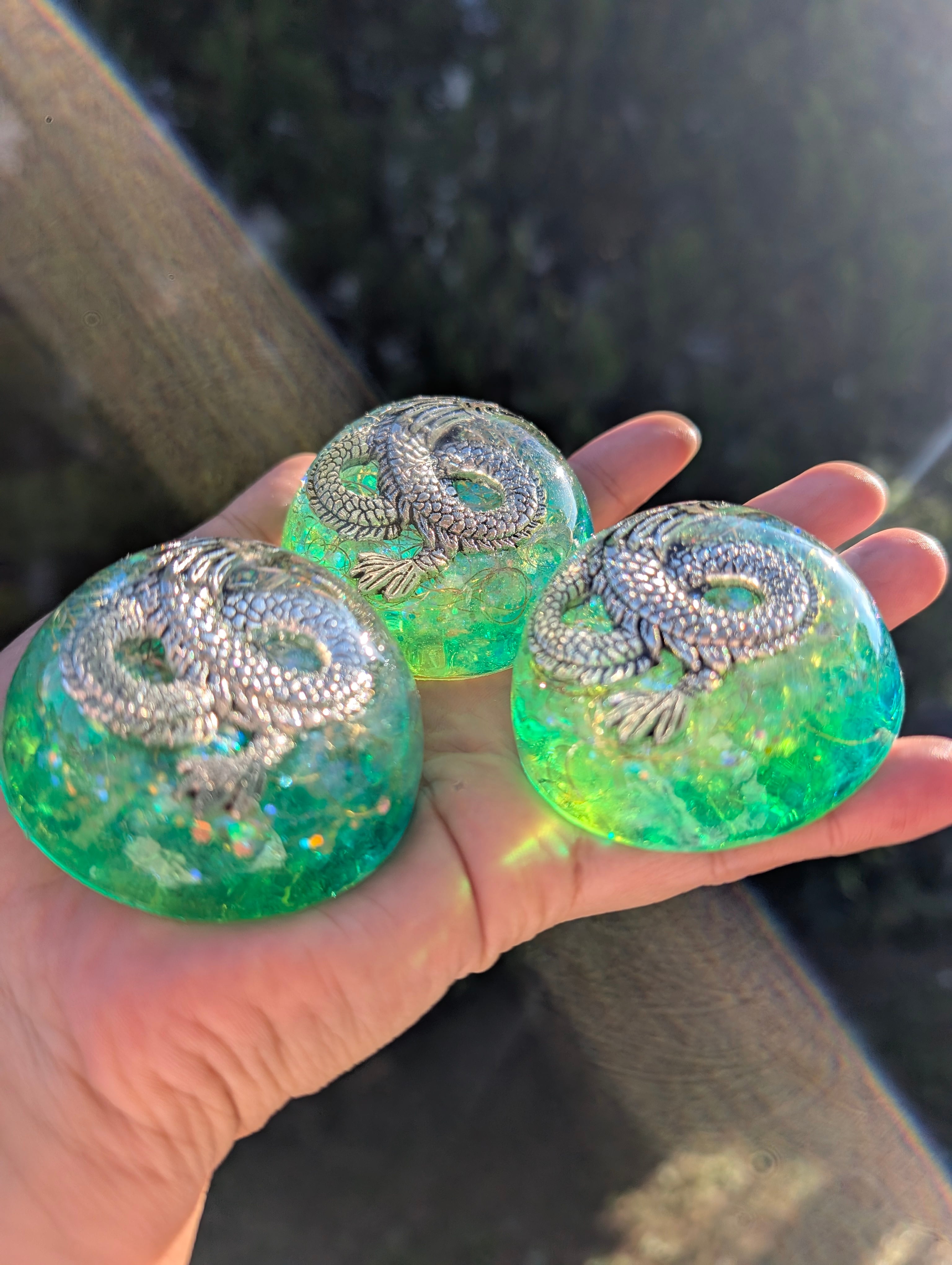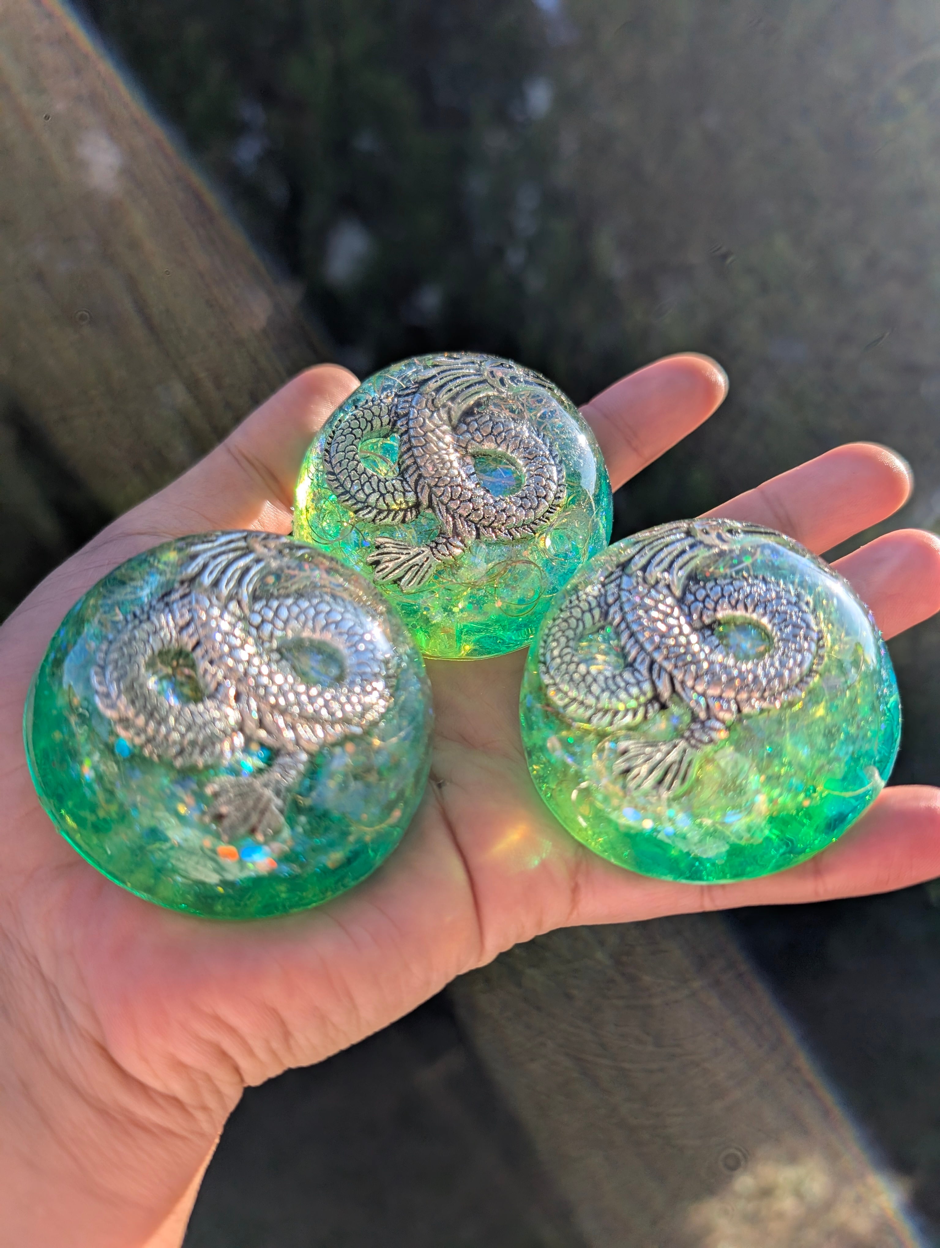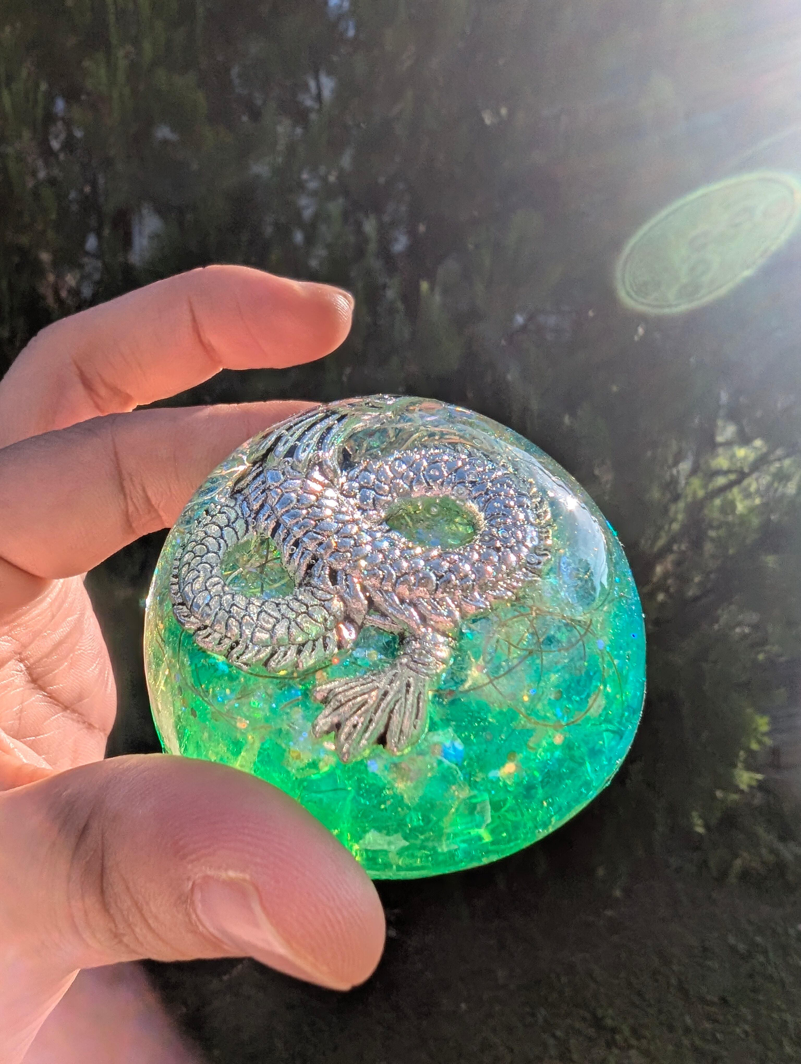 翠=自然・癒し”“龍=力・守護”“珠=願い・エネルギー”という三つの意味が調和し、みどりの光に龍の氣が宿る、神聖なオルゴナイト。