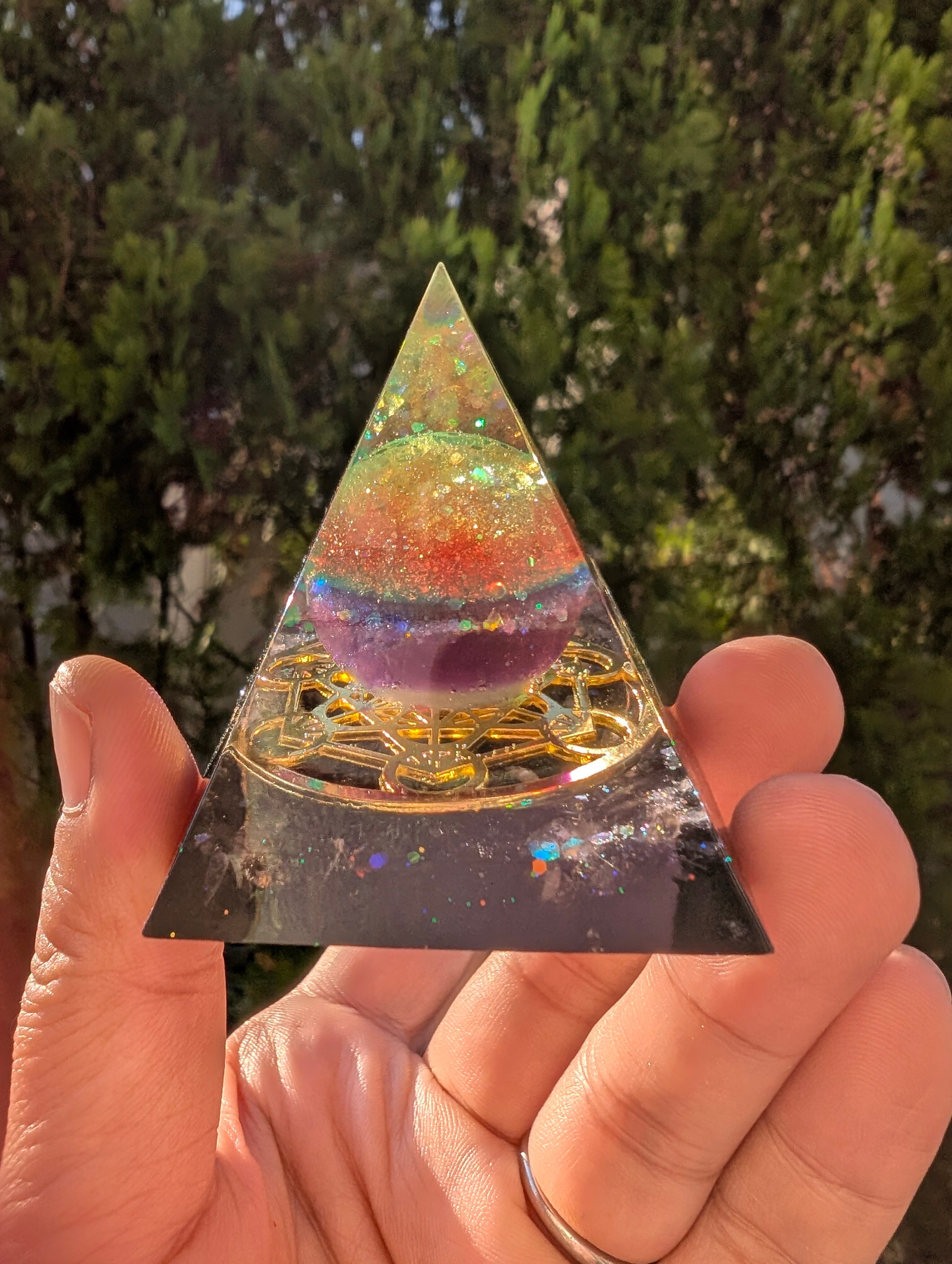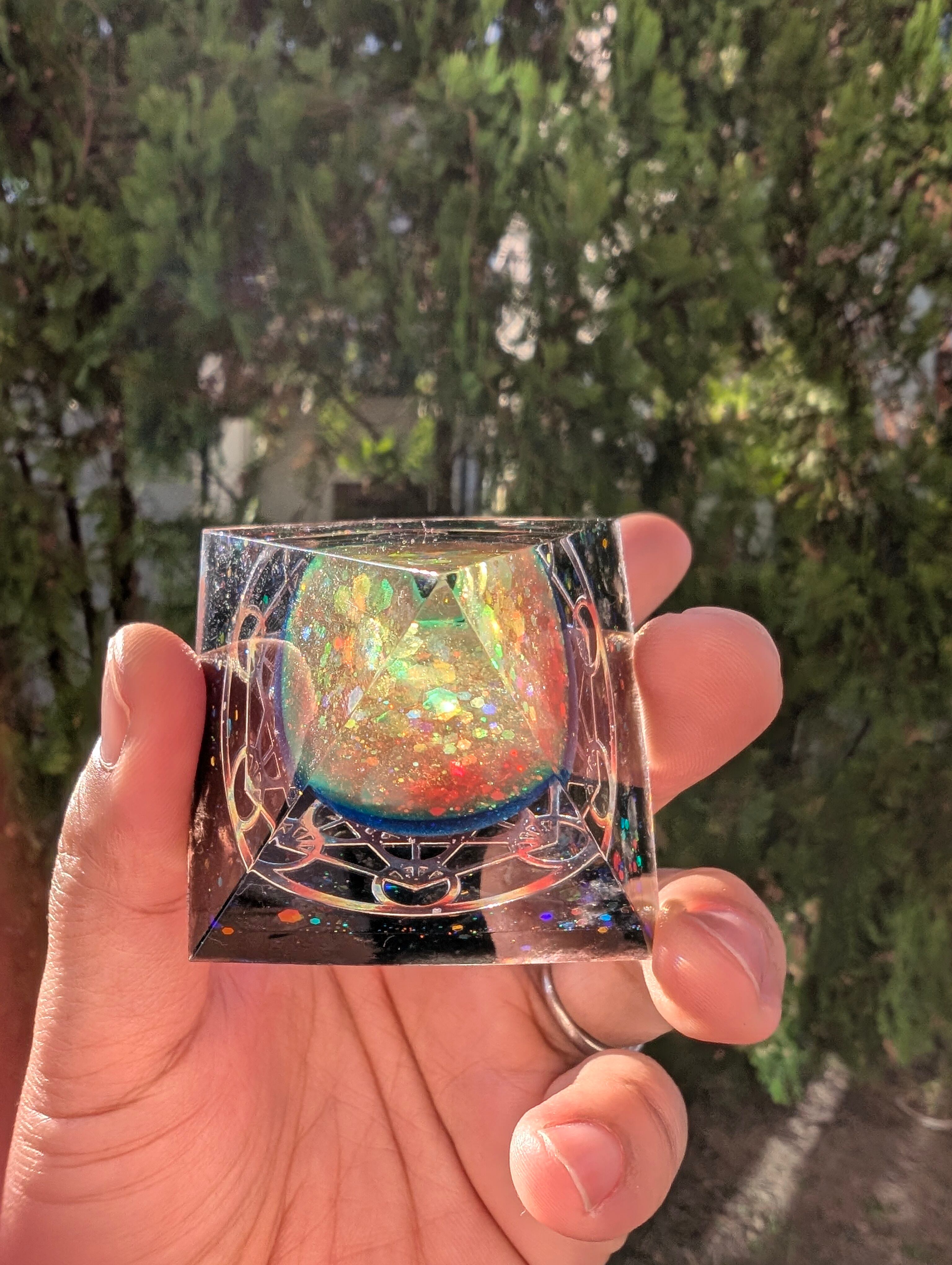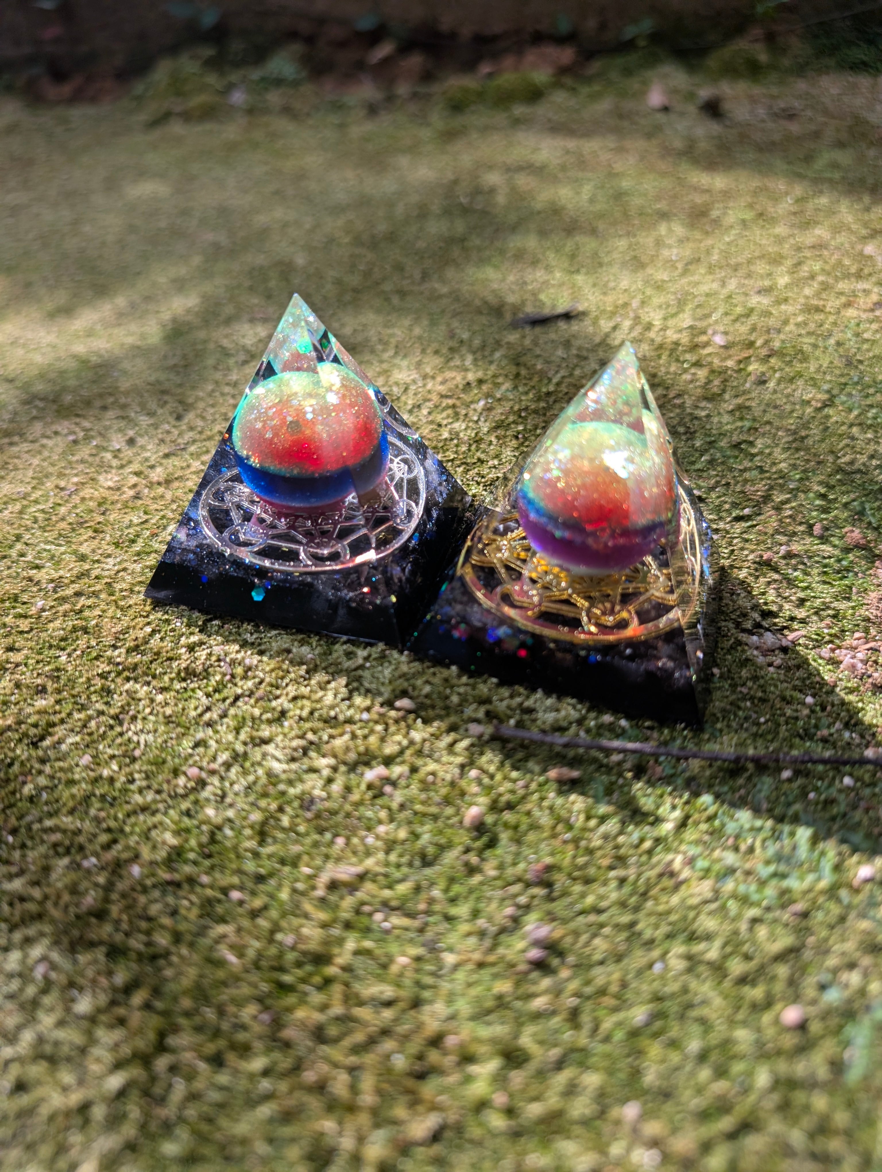 中央には、古代神聖幾何学メタトロンを封入しております。メタトロンのカラーがゴールドかシルバーのに色があります!