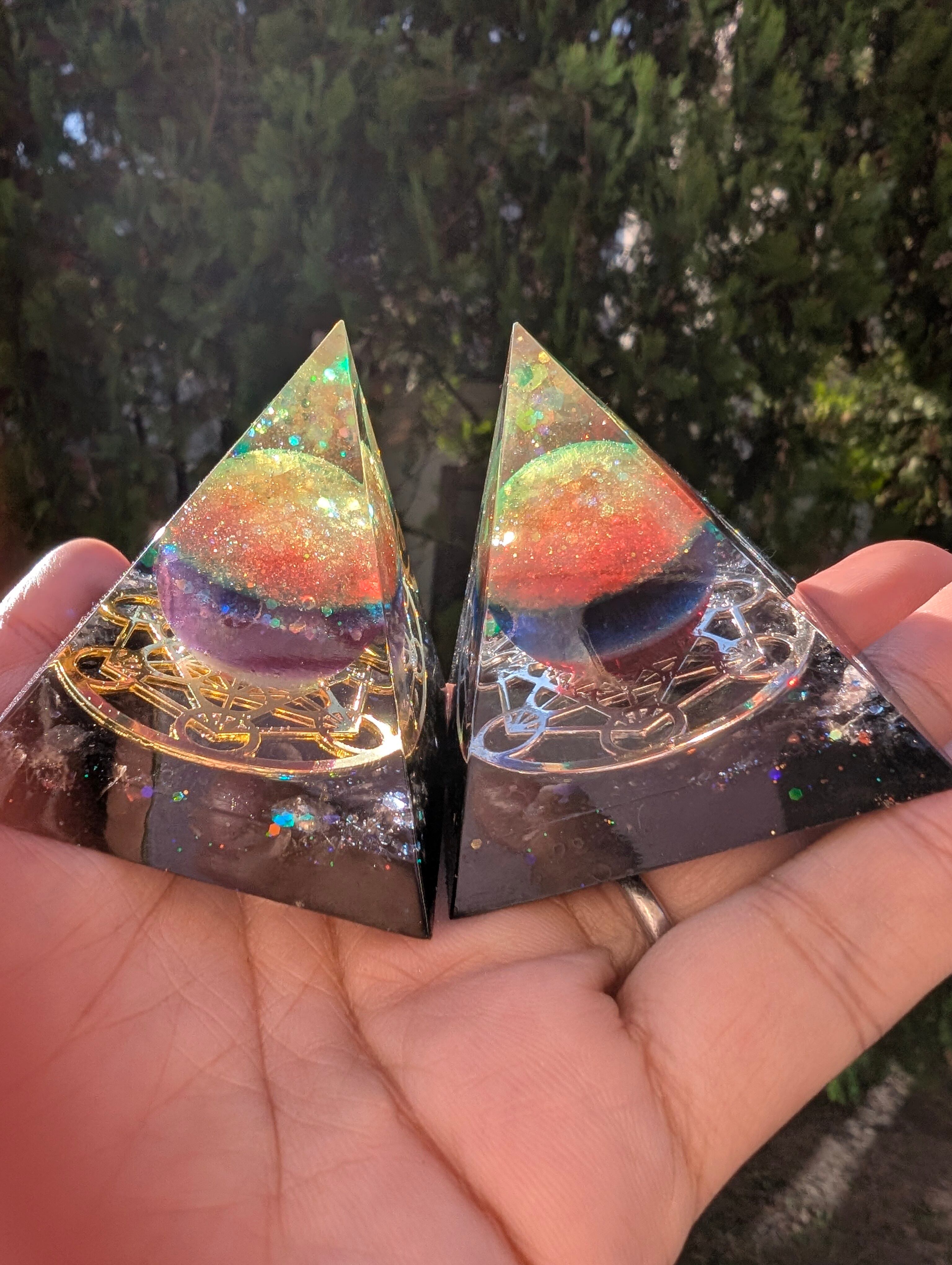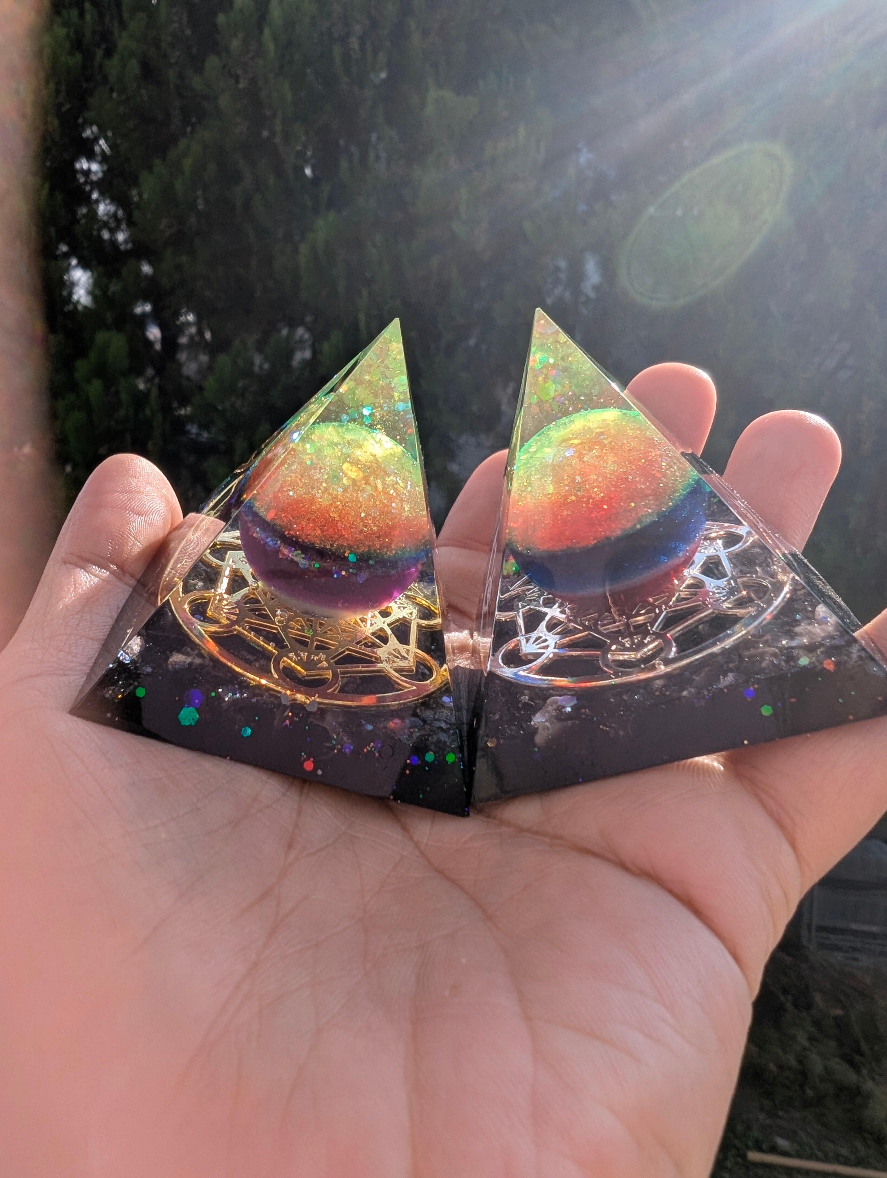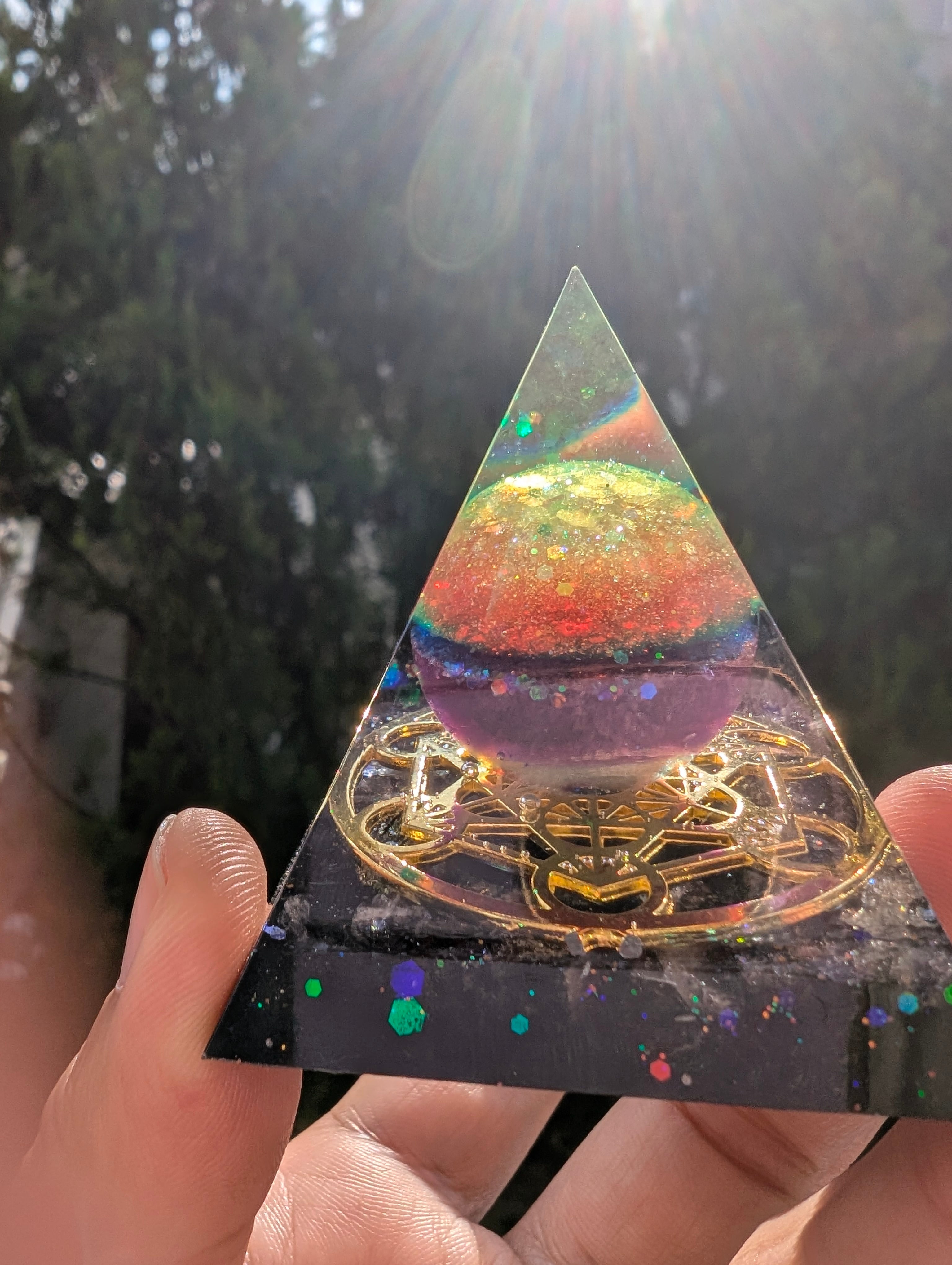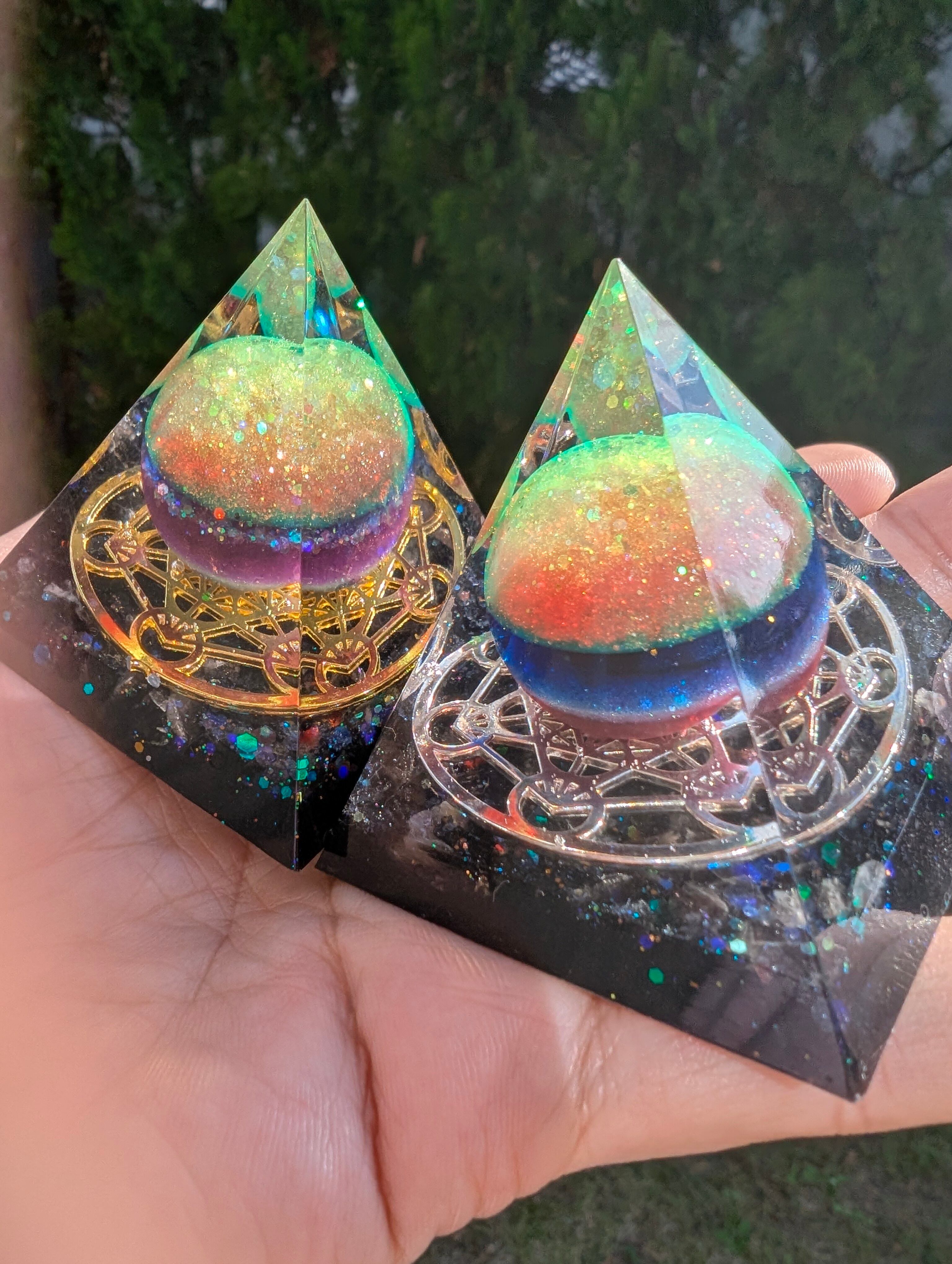 中央には、古代神聖幾何学メタトロンを封入しております。メタトロンのカラーがゴールドかシルバーのに色があります!