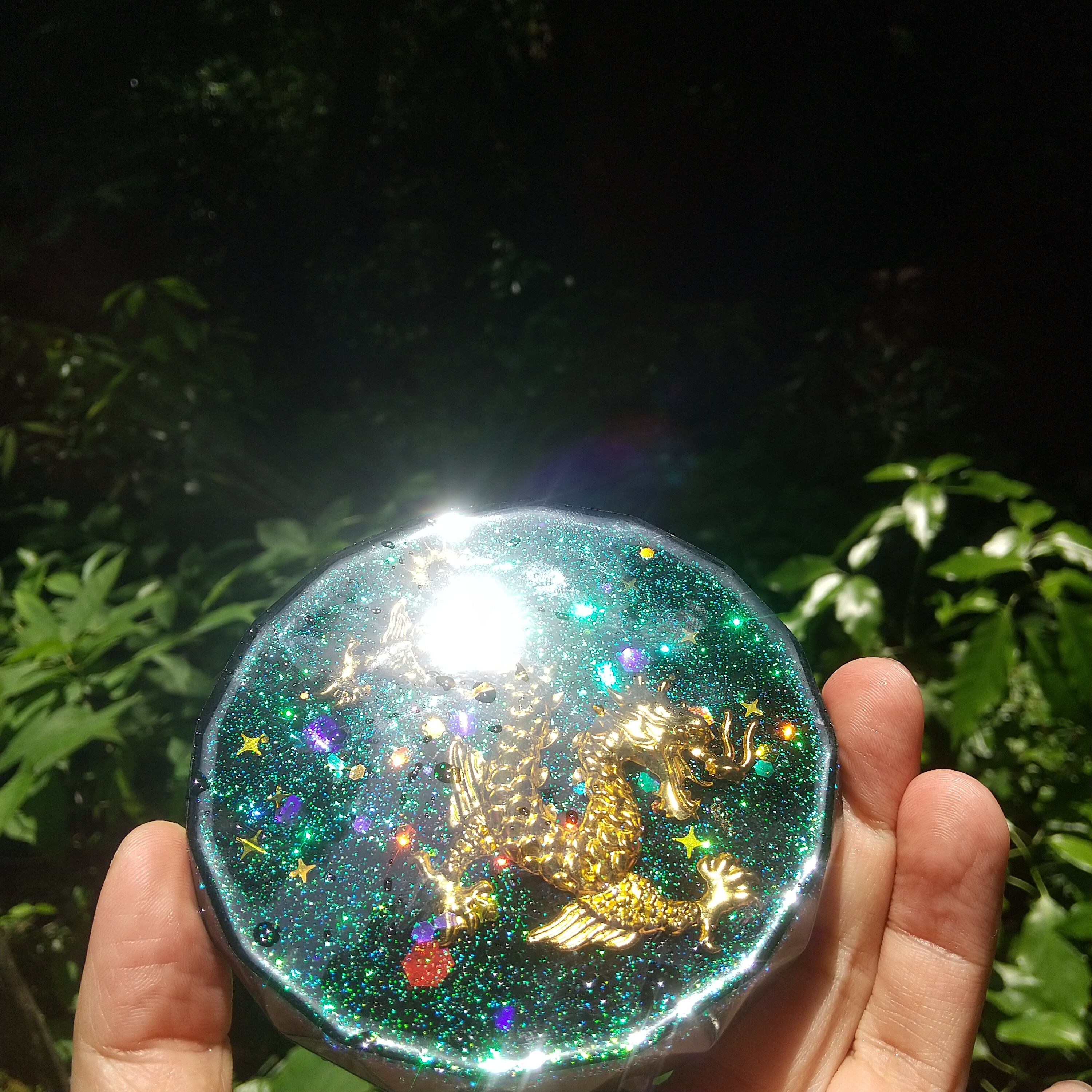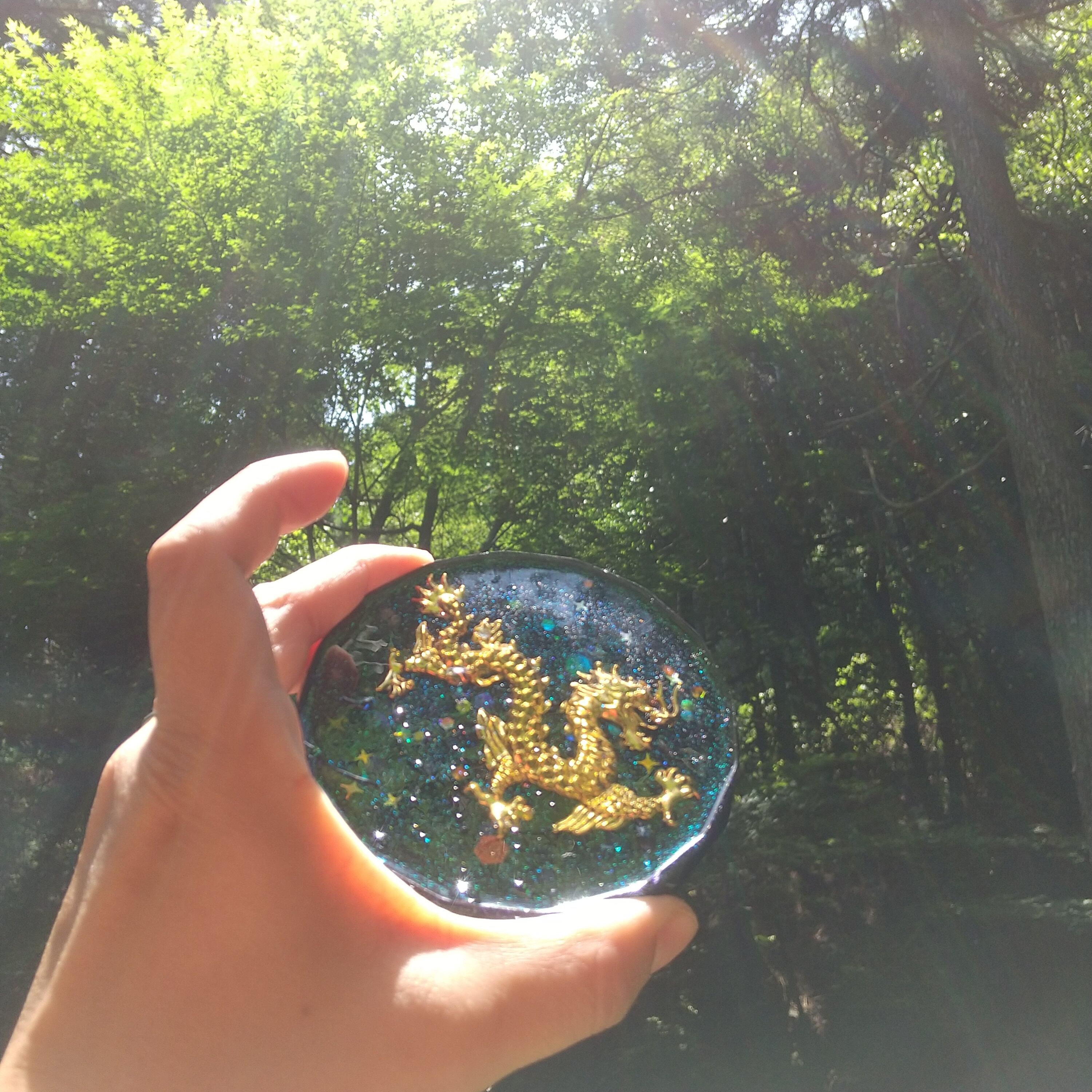 片面はフラワーオブライフを、そしてもう片面には金龍を。