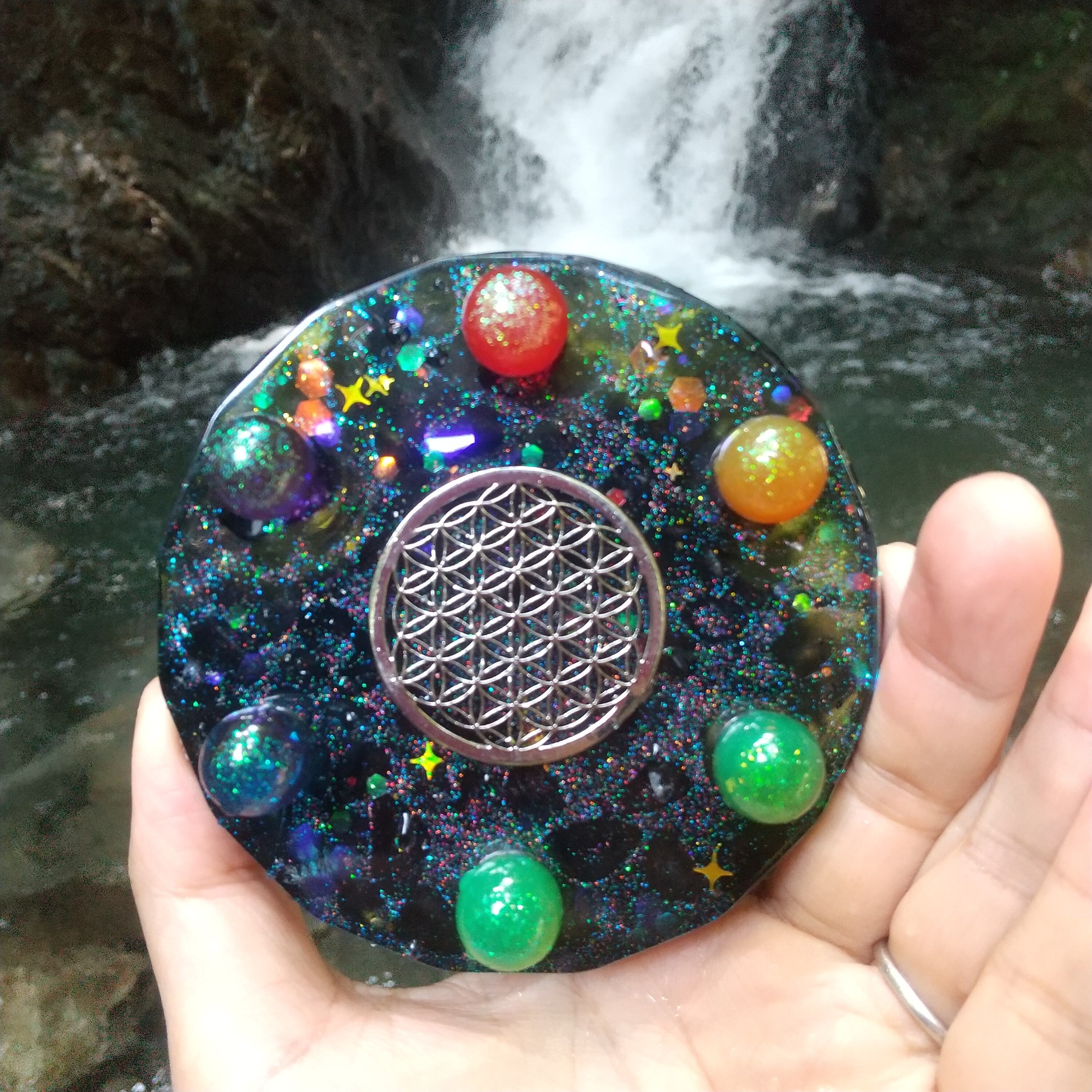 ギベオン隕石と宮古島麻炭のパウダー入り古代神聖幾何学フラワーオブライフのプレートオルゴナイト