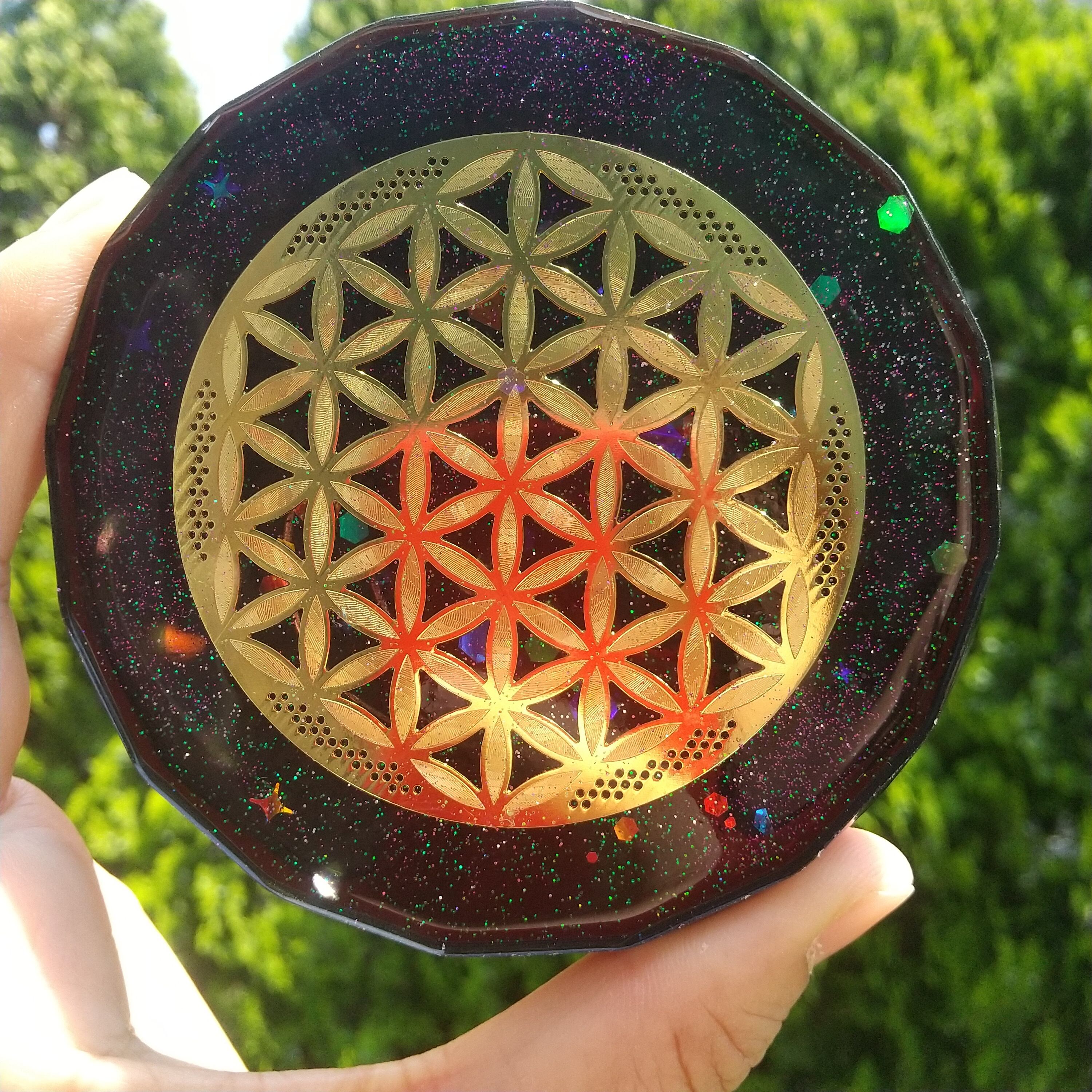 ギベオン隕石と宮古島麻炭のパウダー入り古代神聖幾何学フラワーオブライフのプレートオルゴナイト