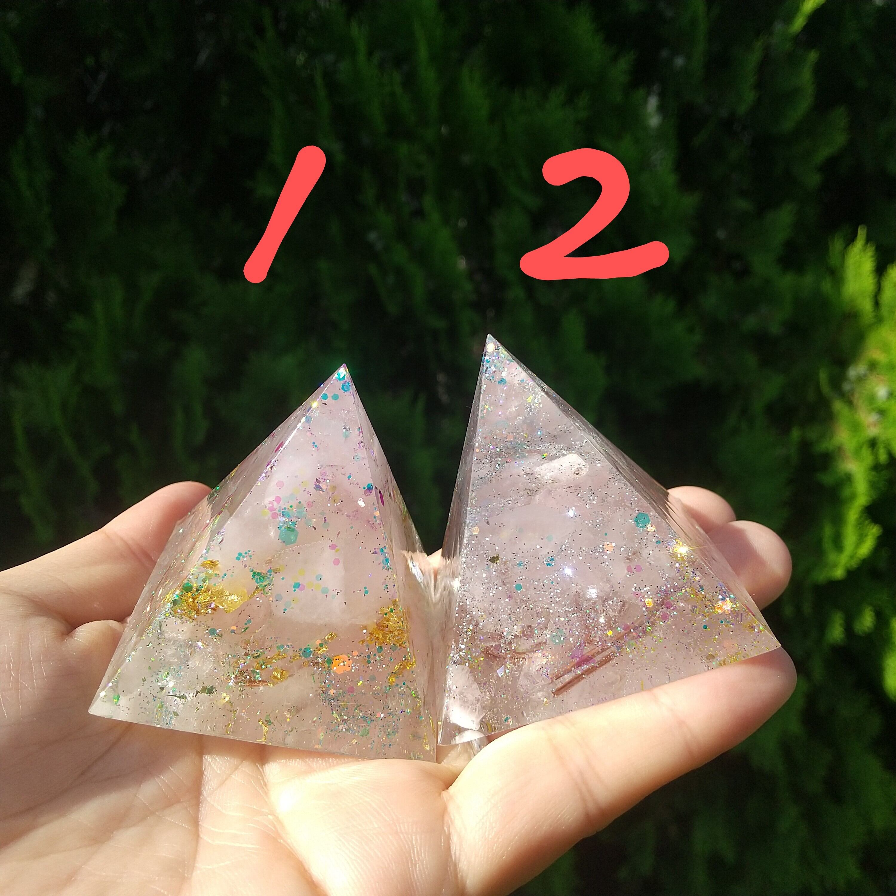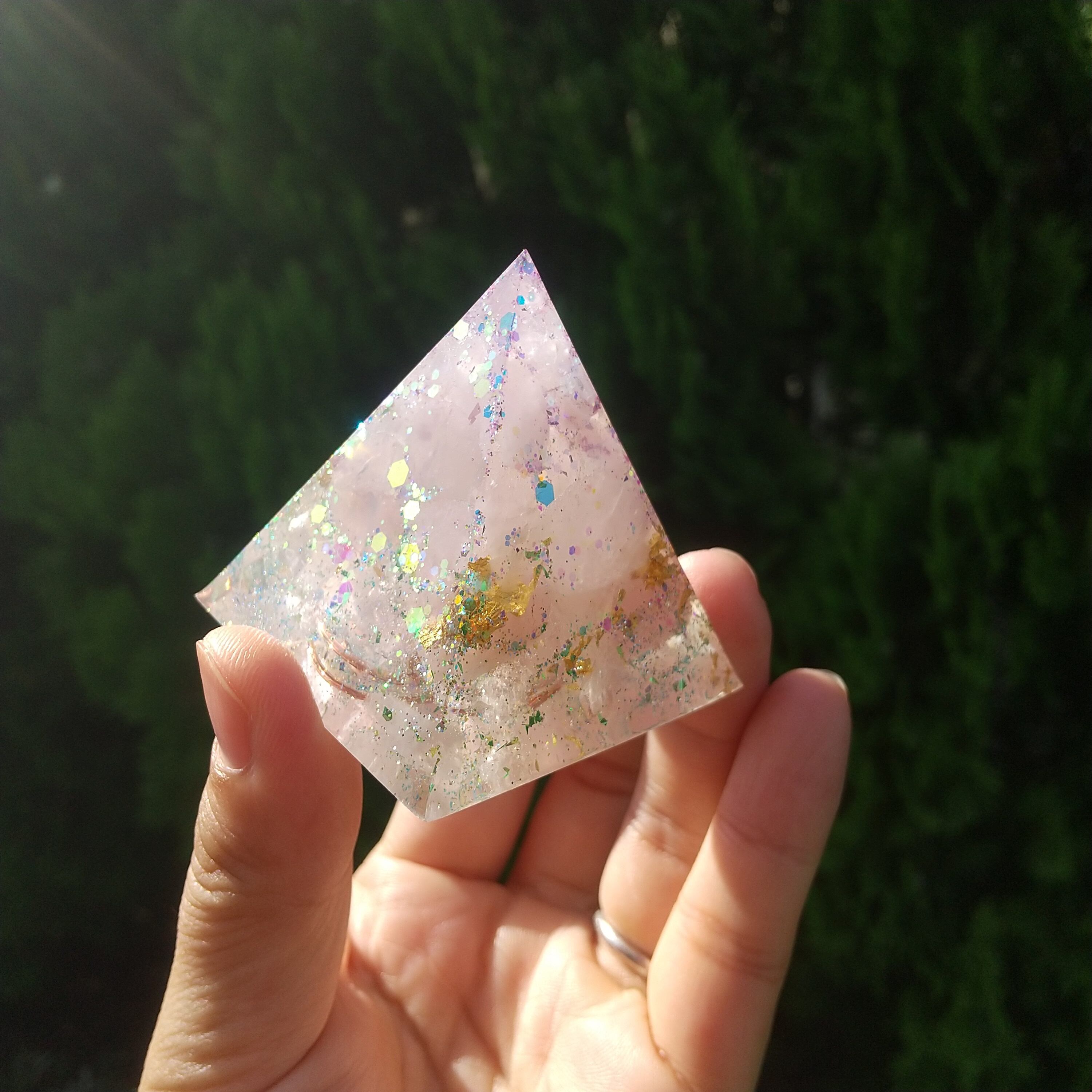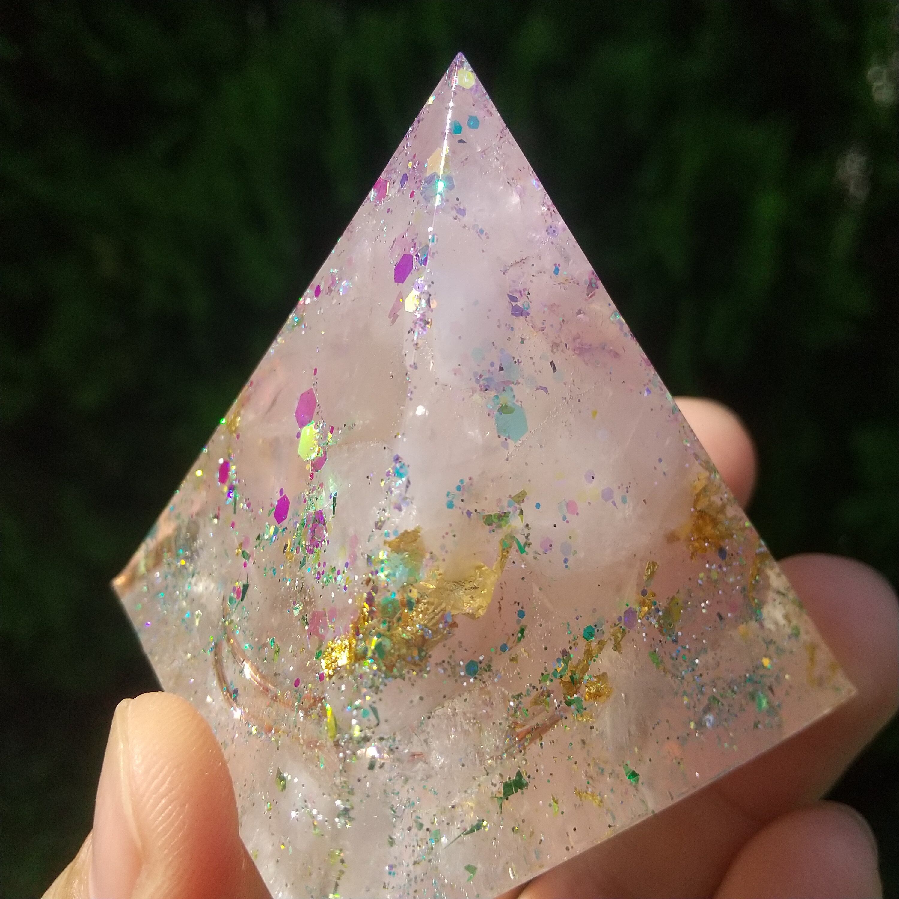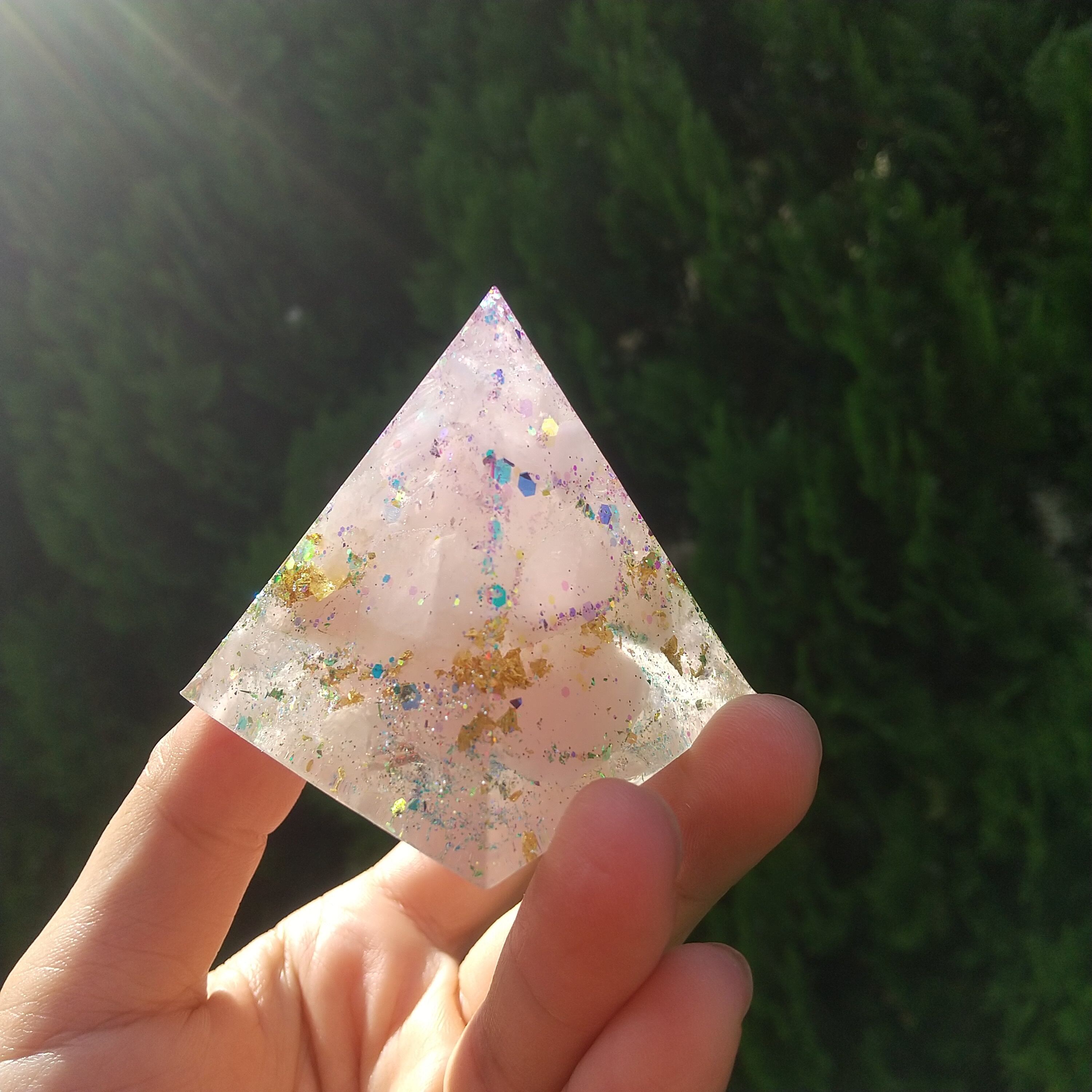 ゴールドは全面にローズクォーツ、A5ランクヒマラヤ水晶、金箔を封入しました。