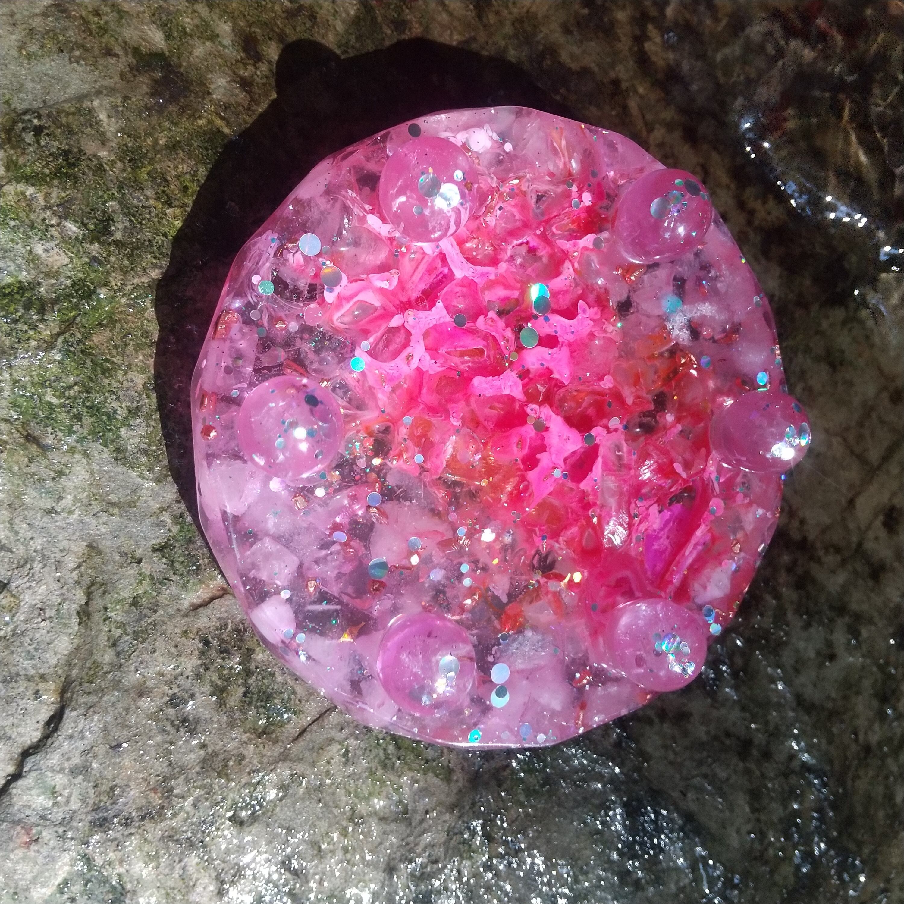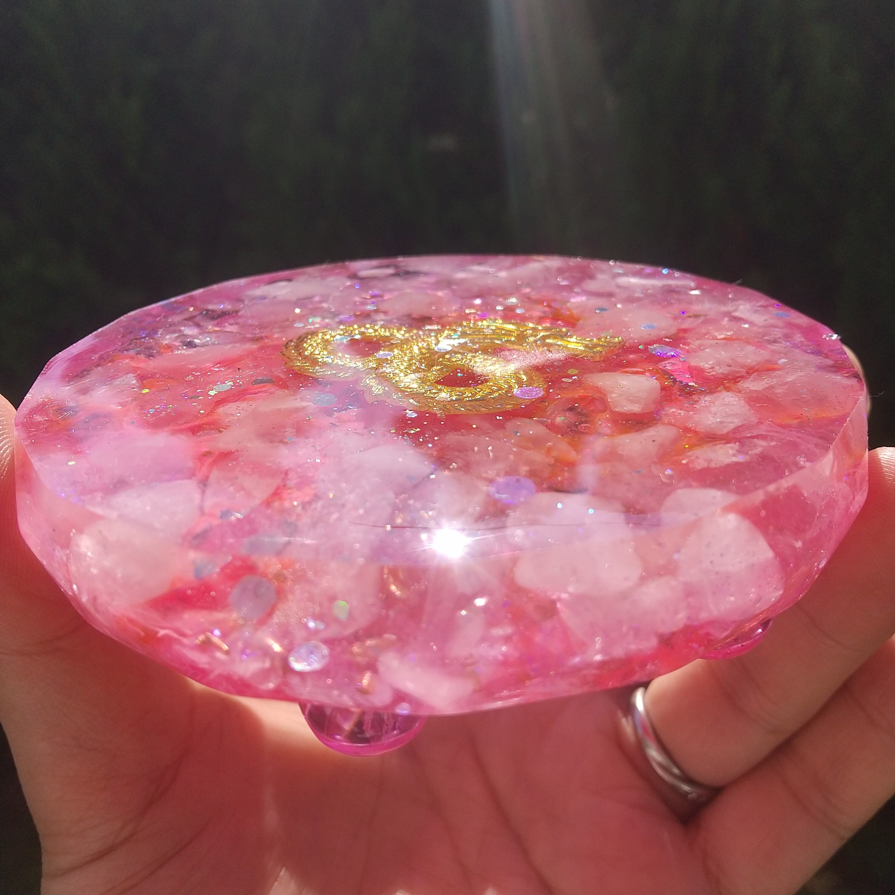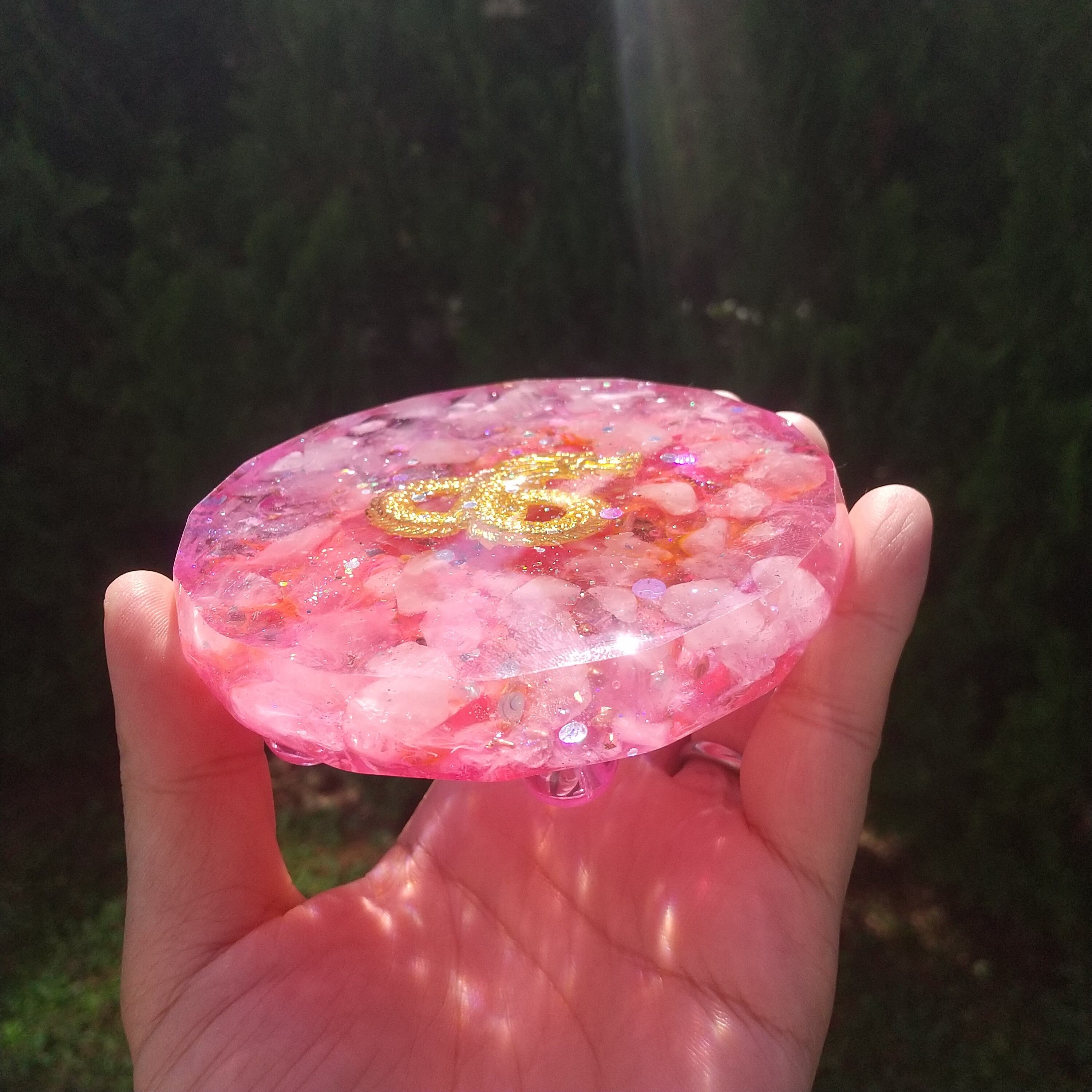直径9.8㎝×高さ2.2㎝の台座付オルゴナイトです。