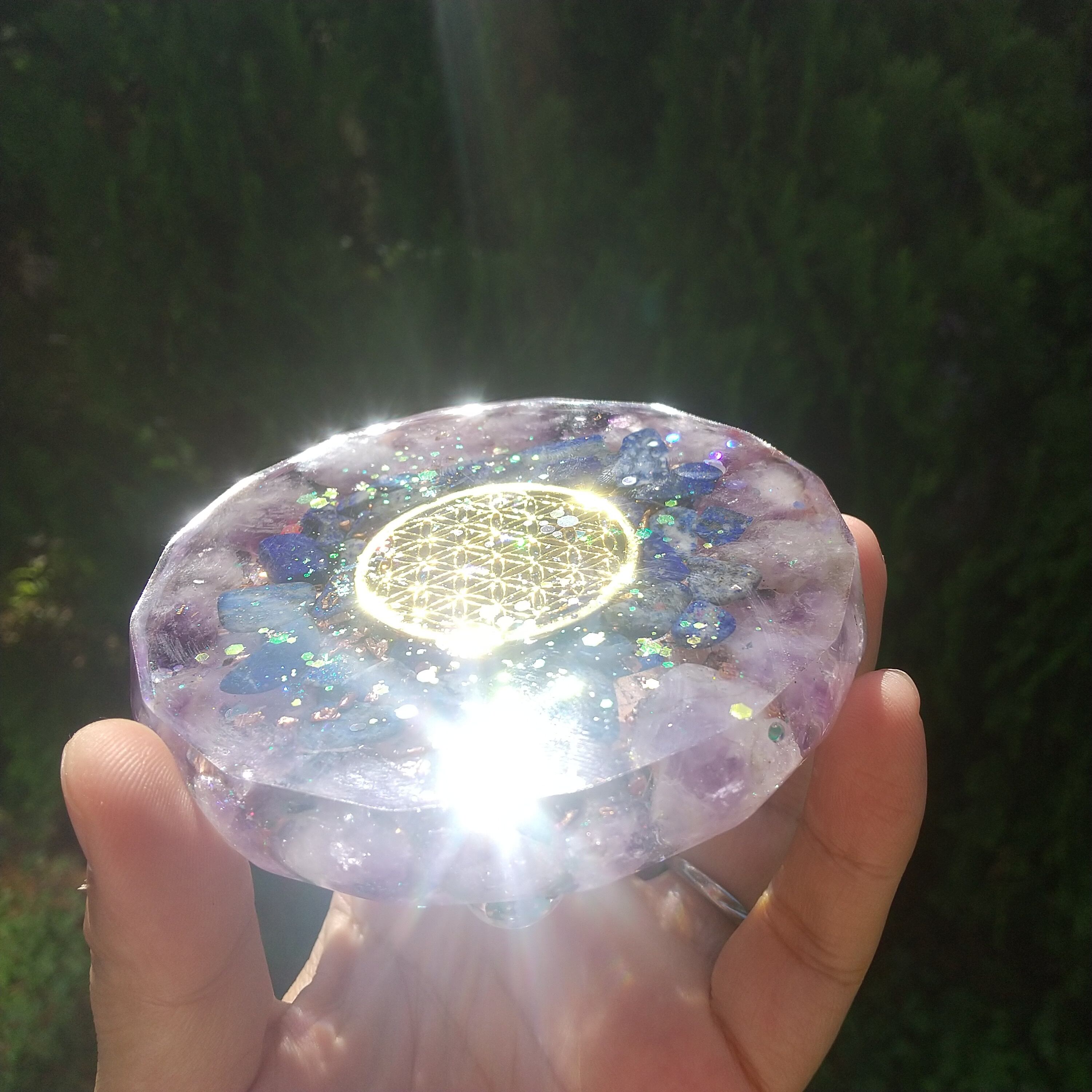 あなたの中のブロックを外す手助けをしてくれるシリウスアメジスト入りフラワーオブライフ(活性化)のプレートオルゴナイト