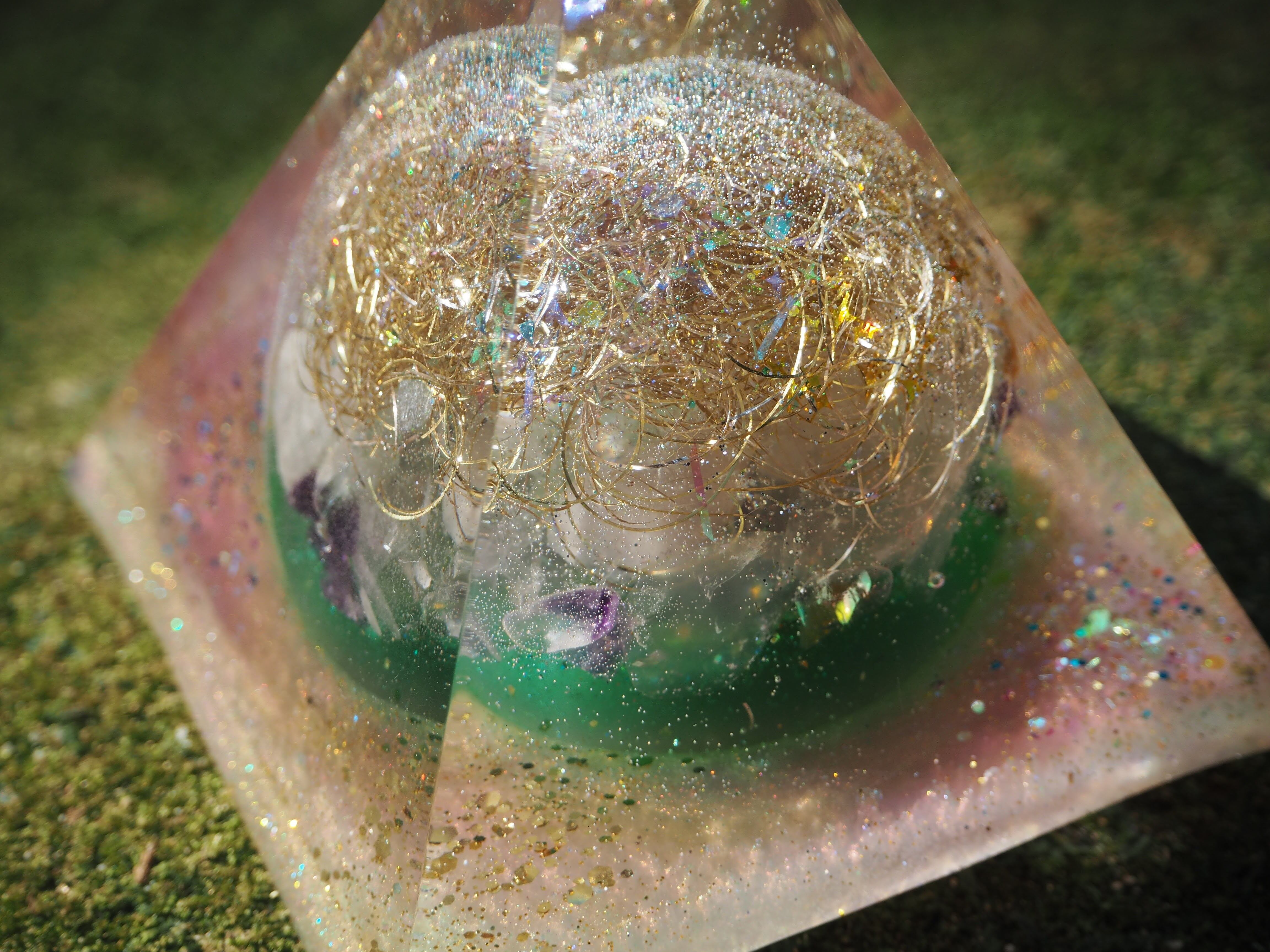 緑色のエナジーボールオルゴナイトを封入した美しい作品が完成致しました。
