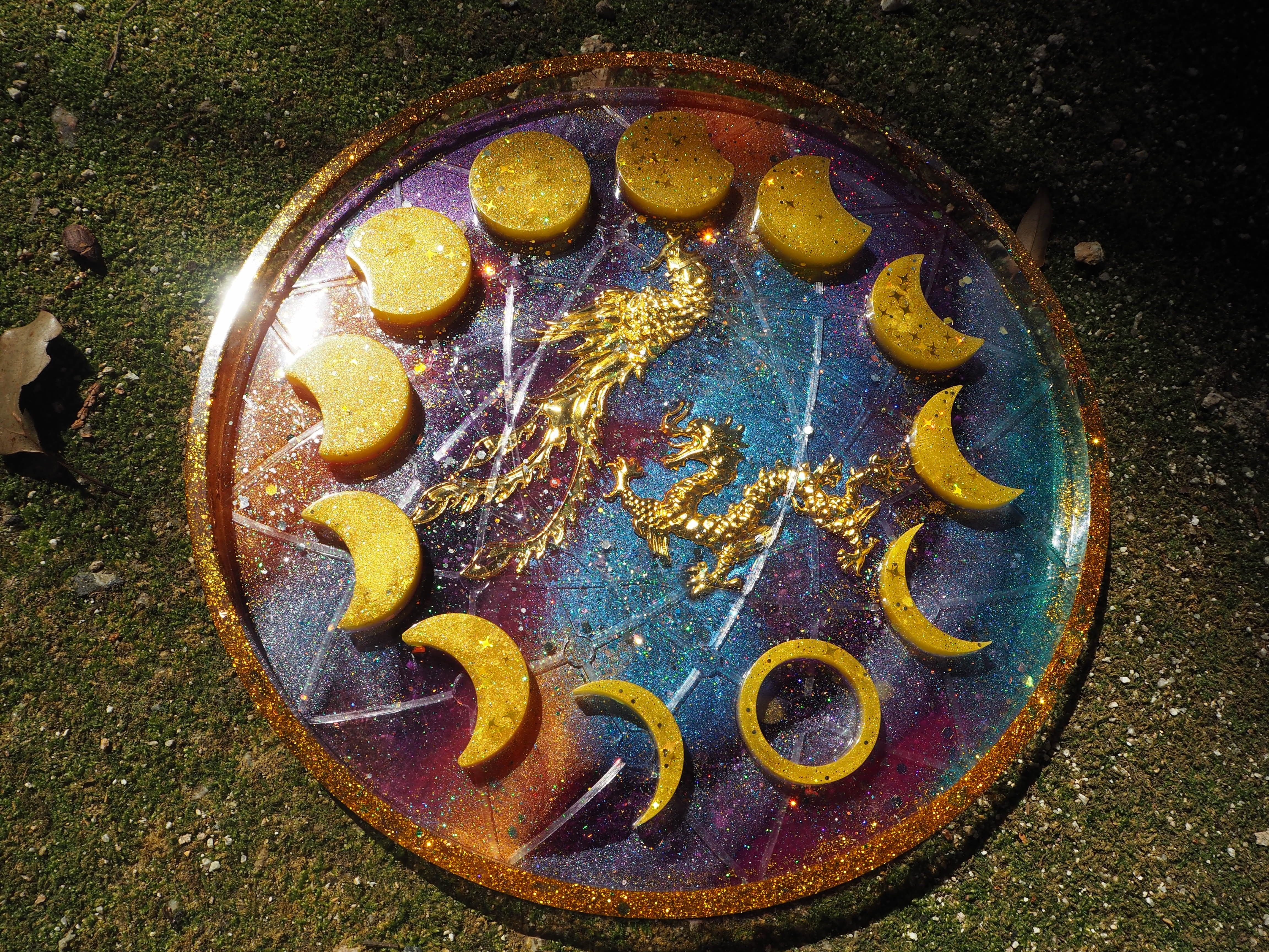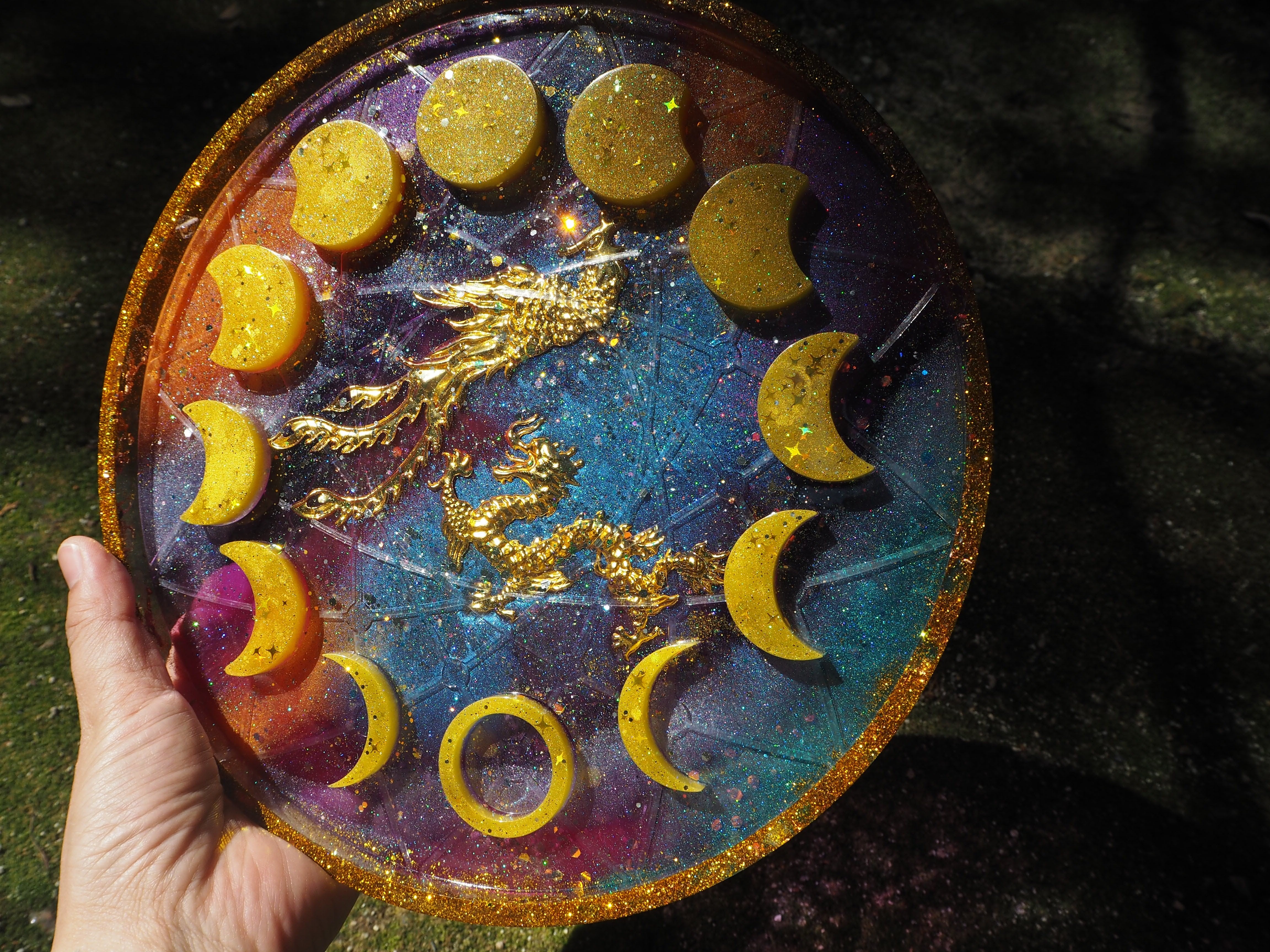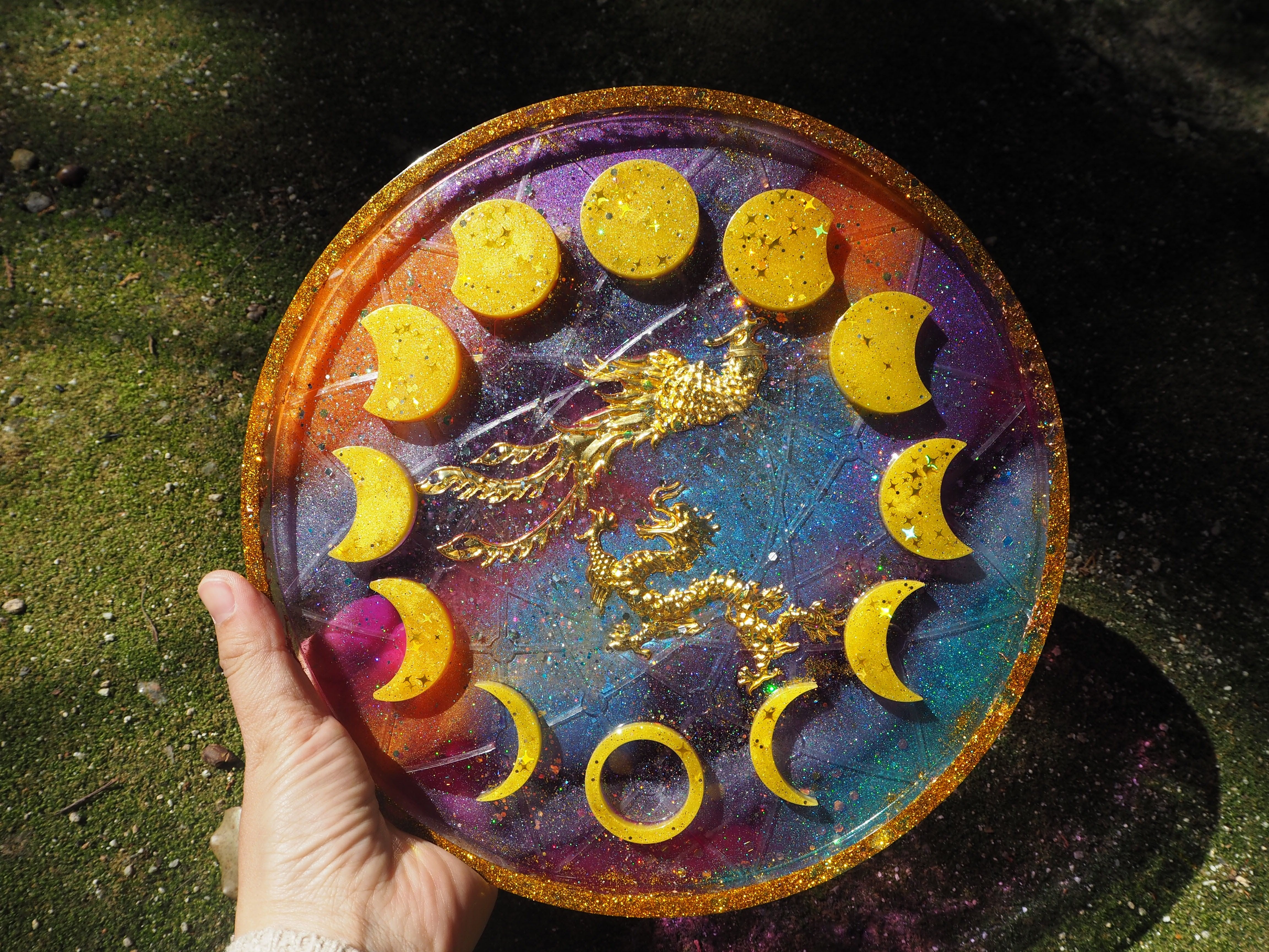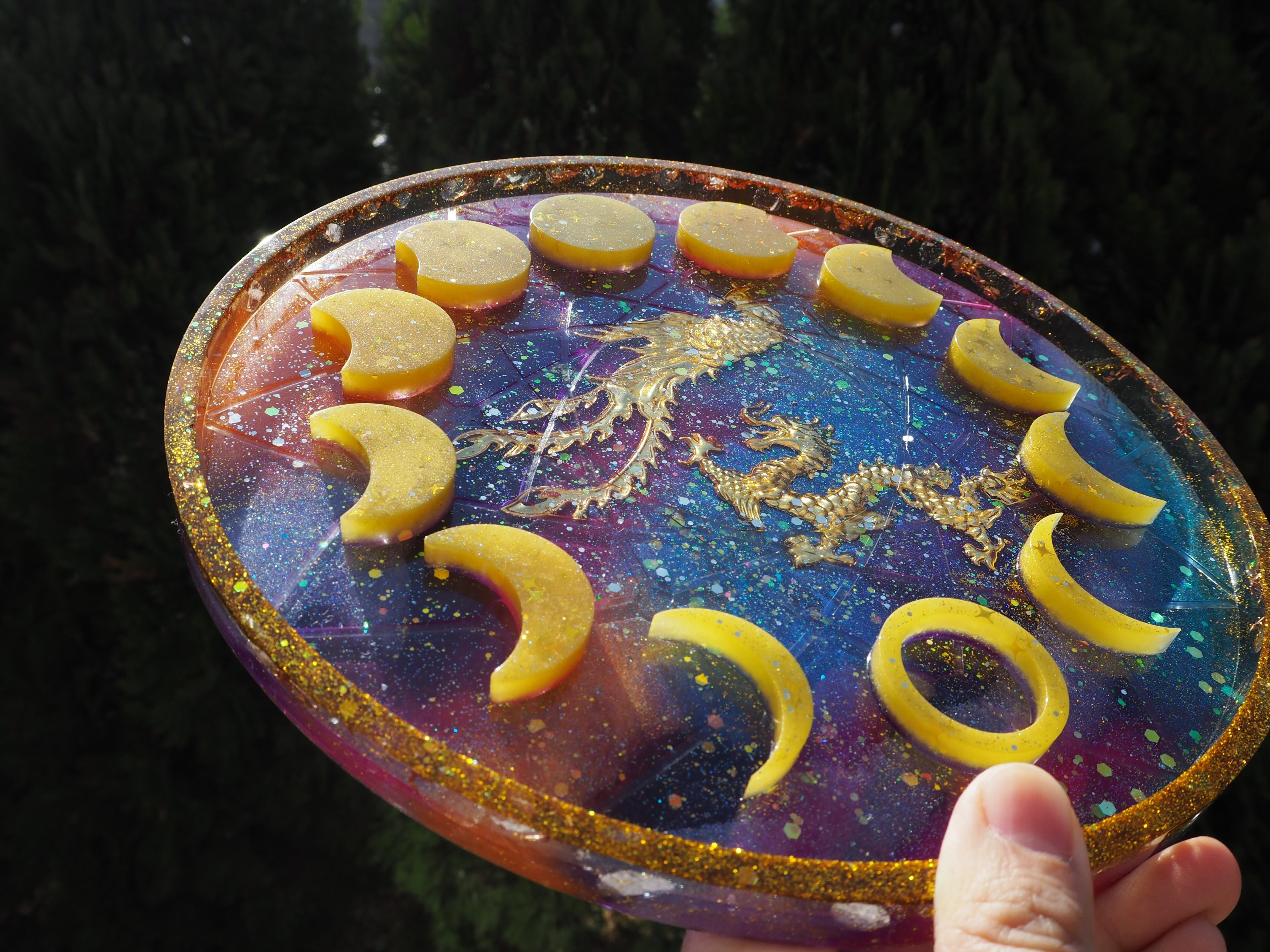 A 龍と鳳凰の月の満ち欠けプレートオルゴナイト(木製スタンド付き)