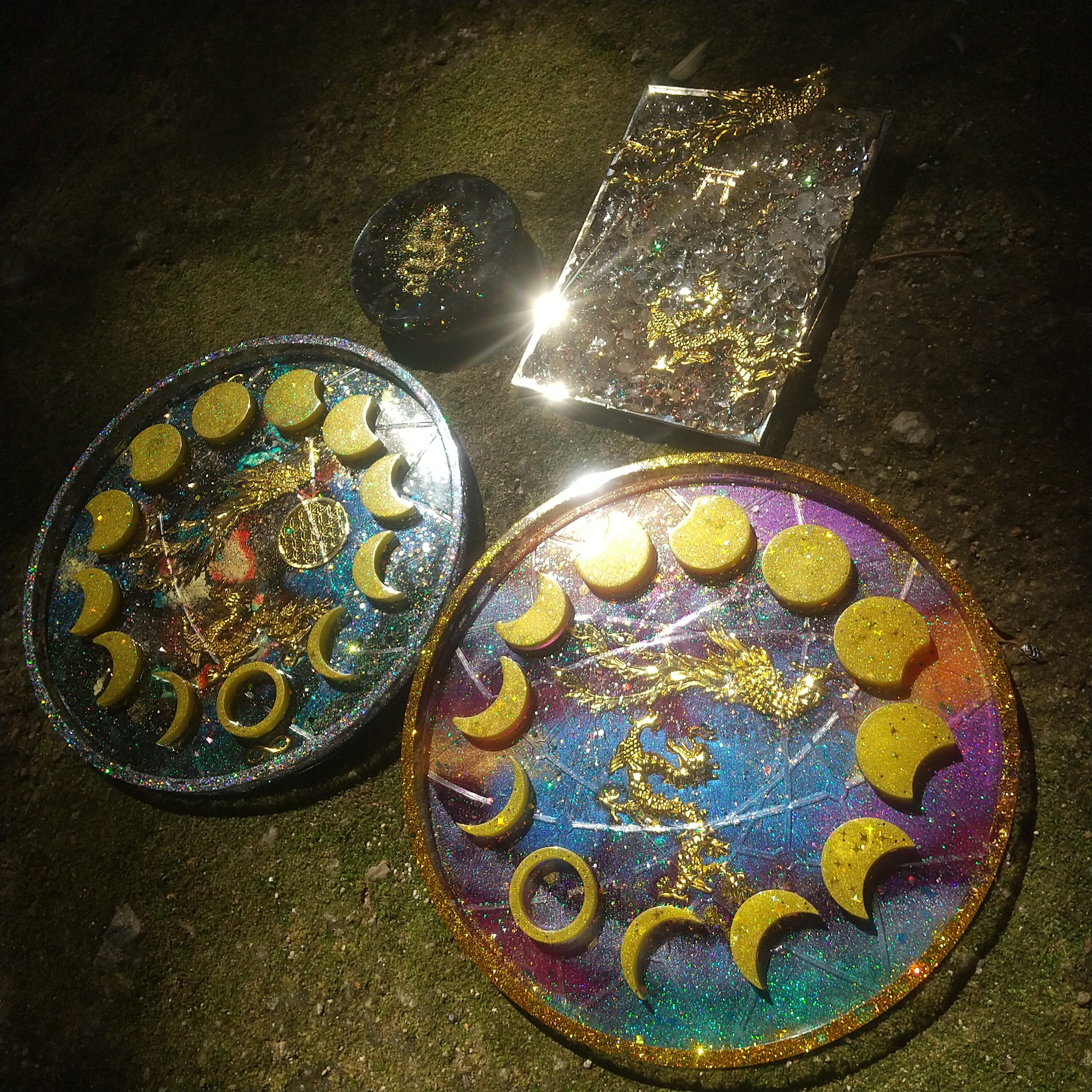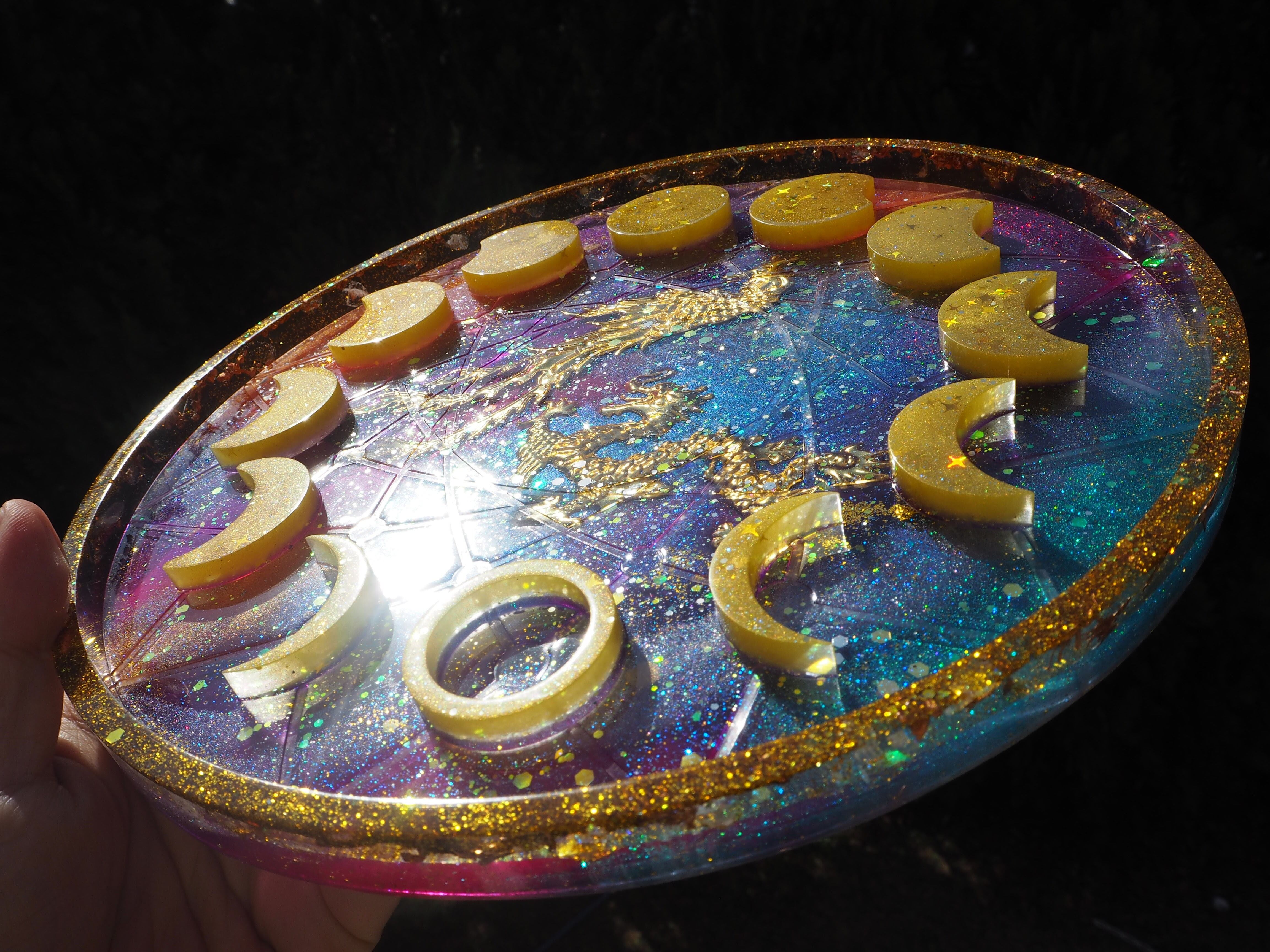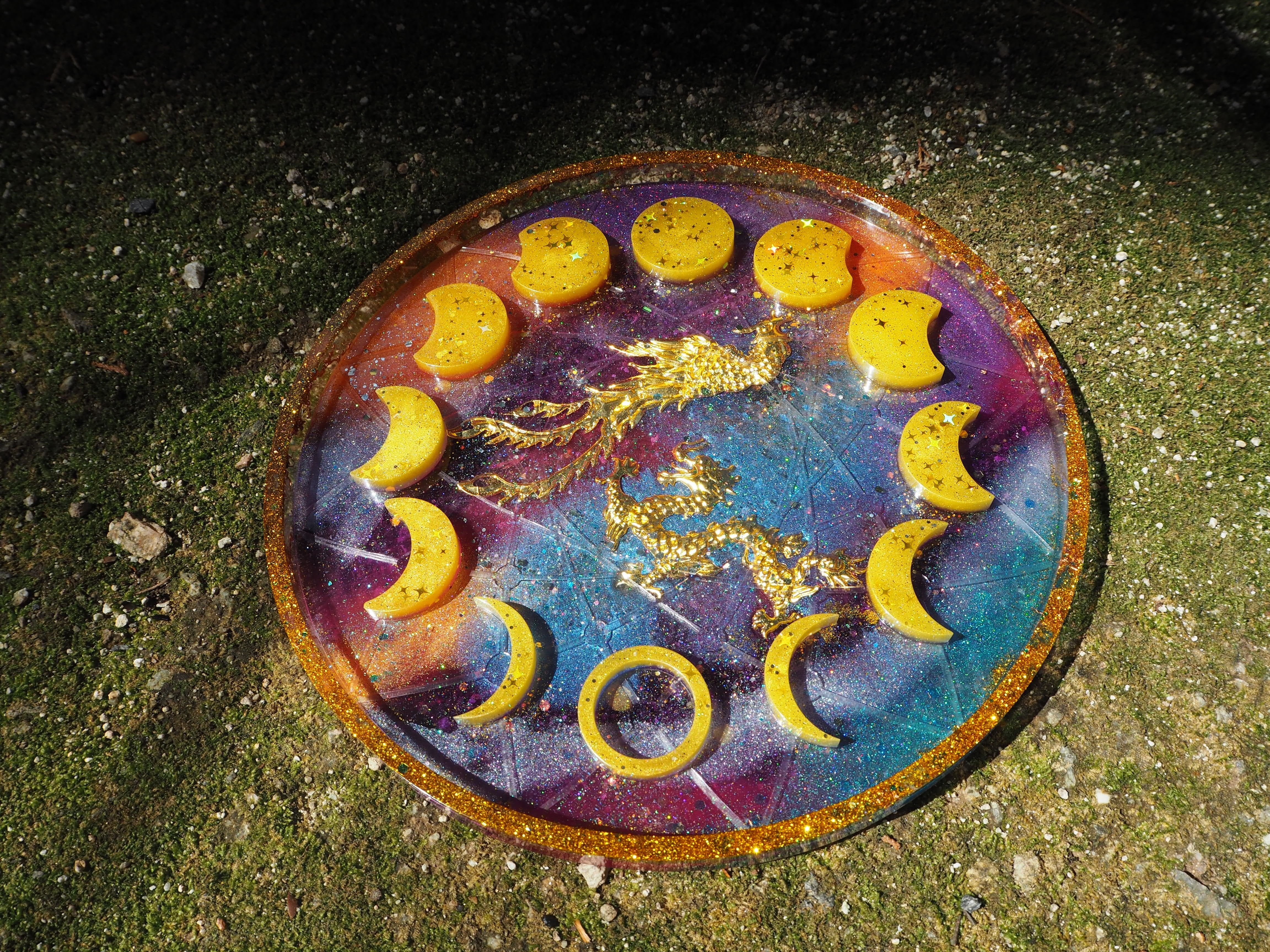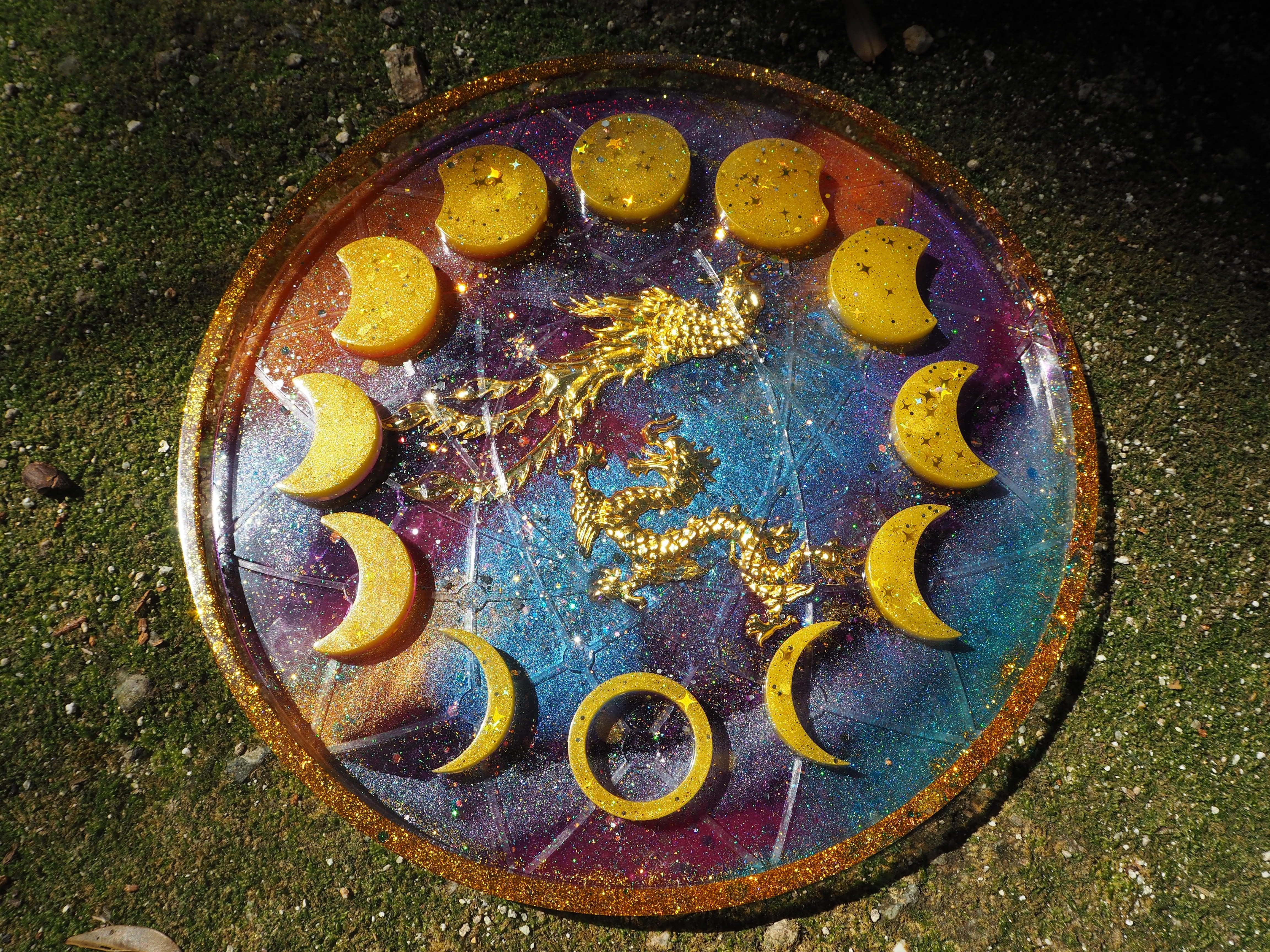 A 龍と鳳凰の月の満ち欠けプレートオルゴナイト(木製スタンド付き)