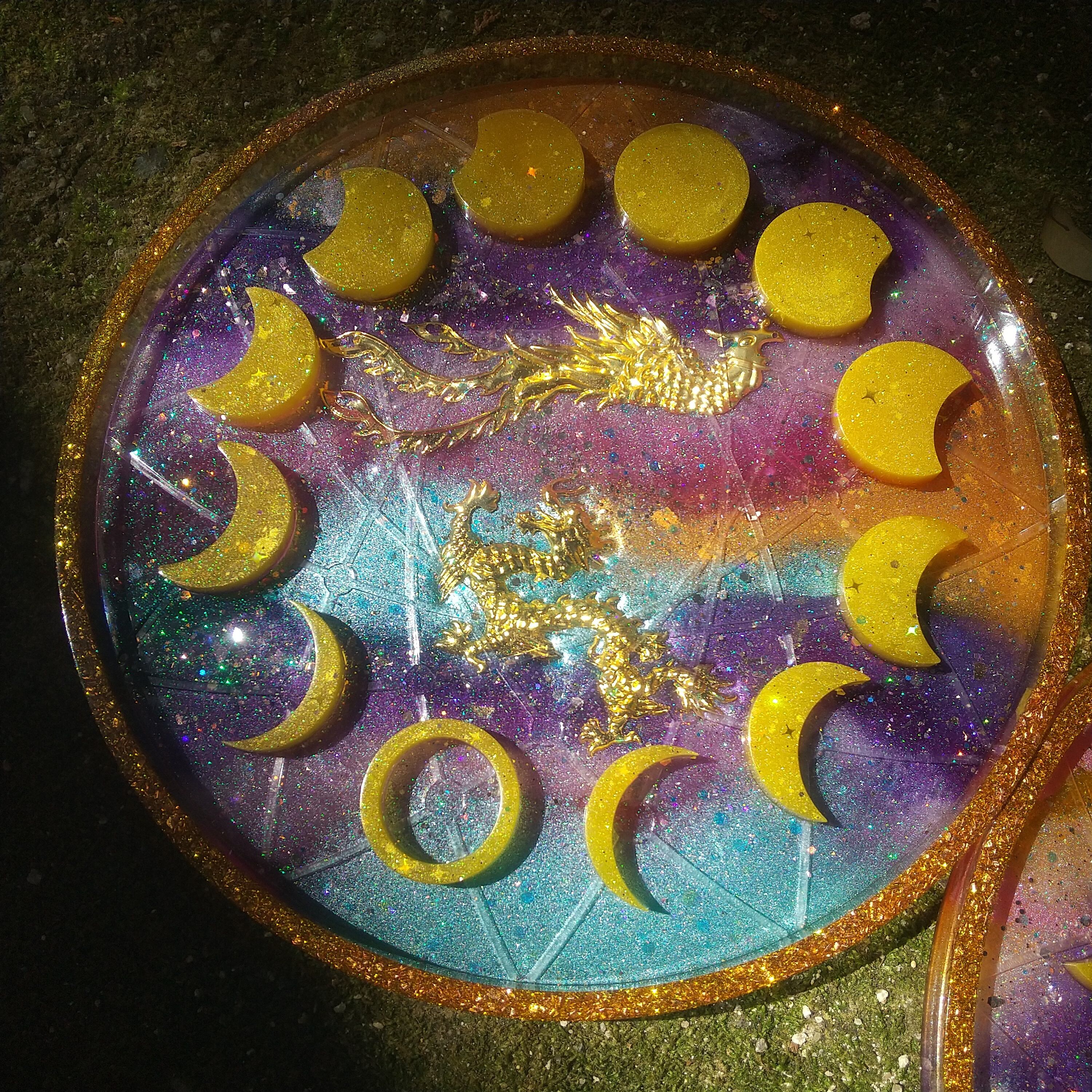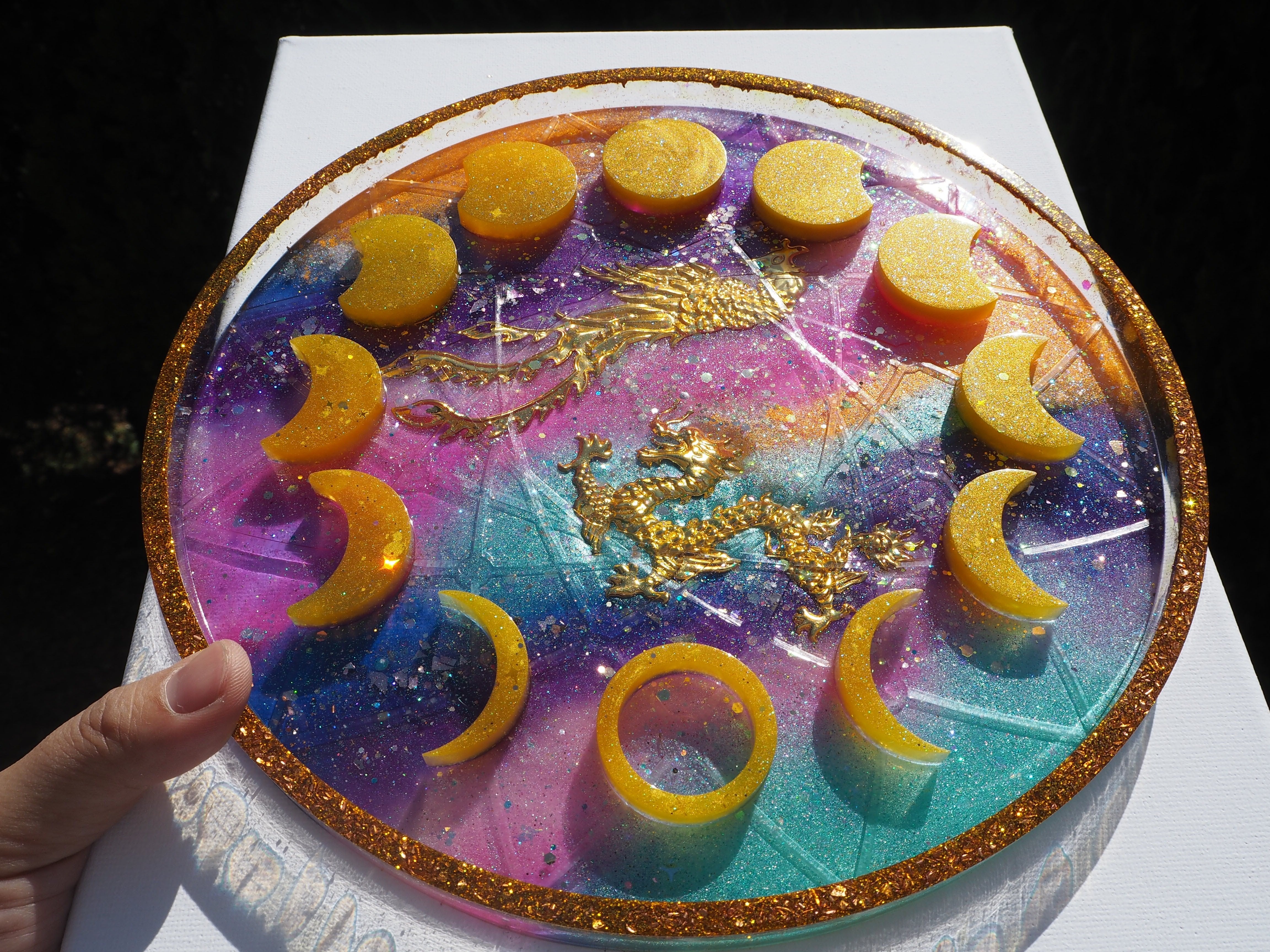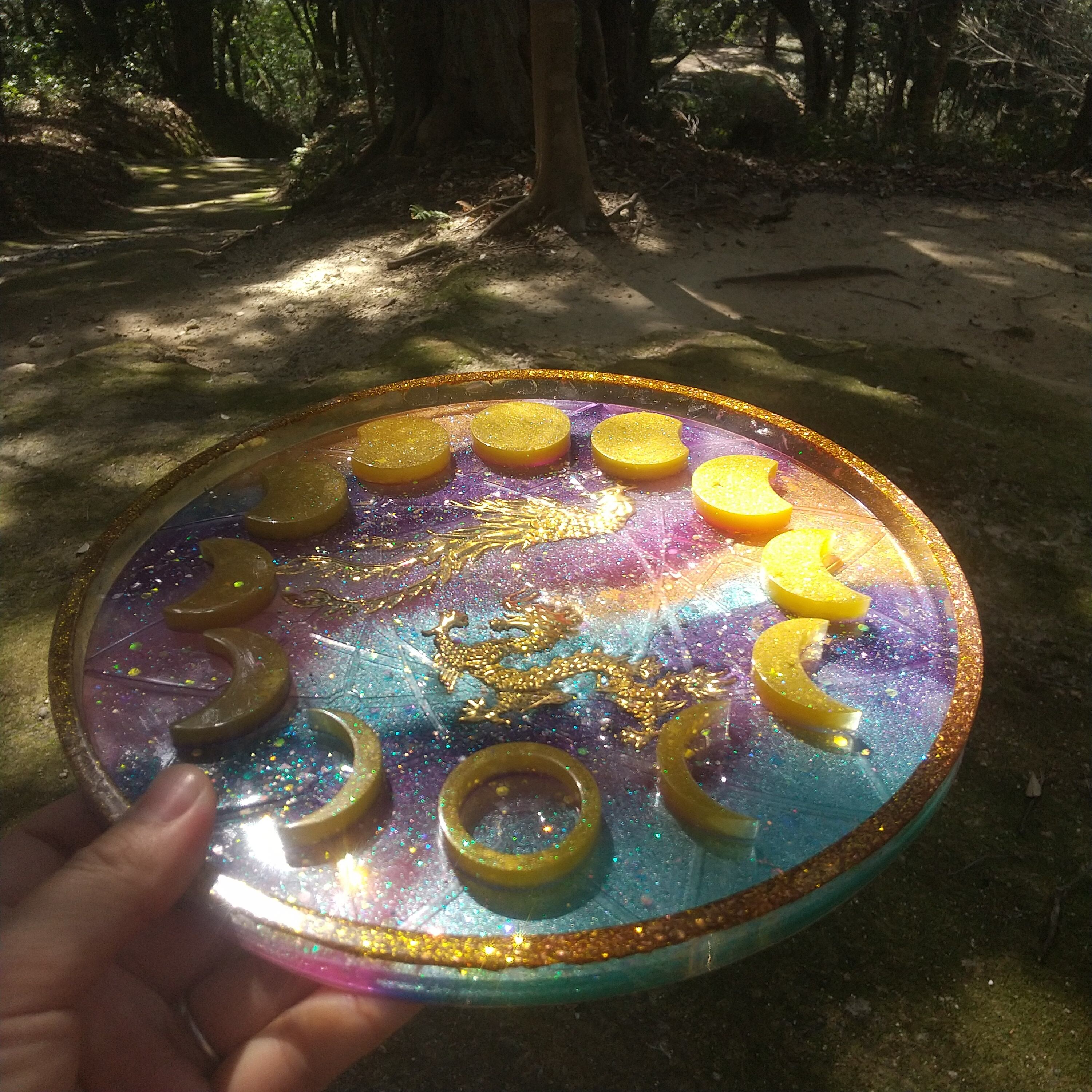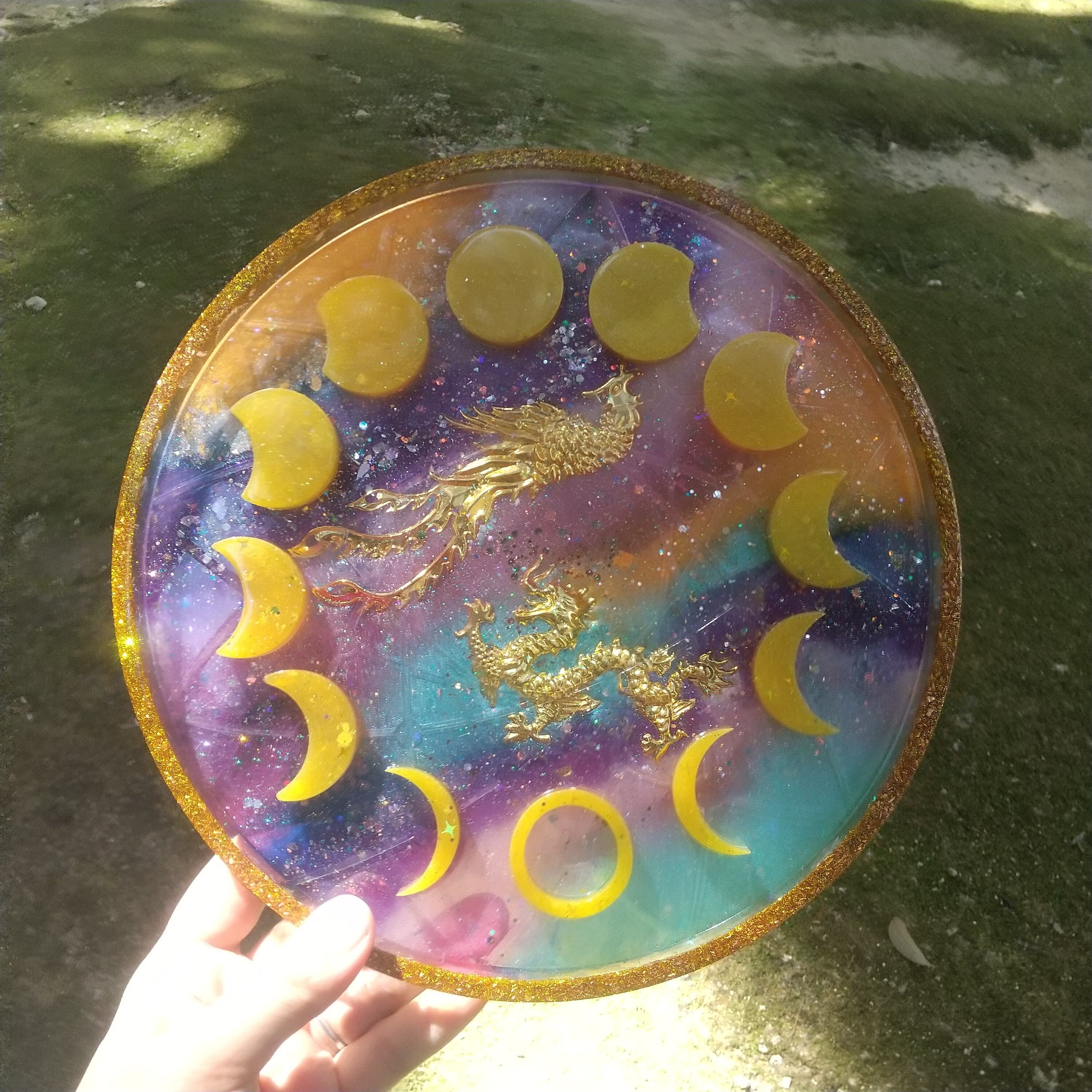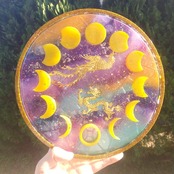C 龍と鳳凰の月の満ち欠けプレートオルゴナイト(木製スタンド付き)