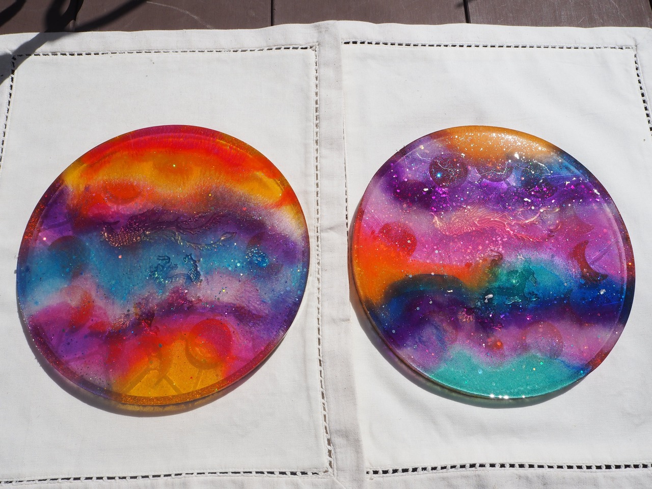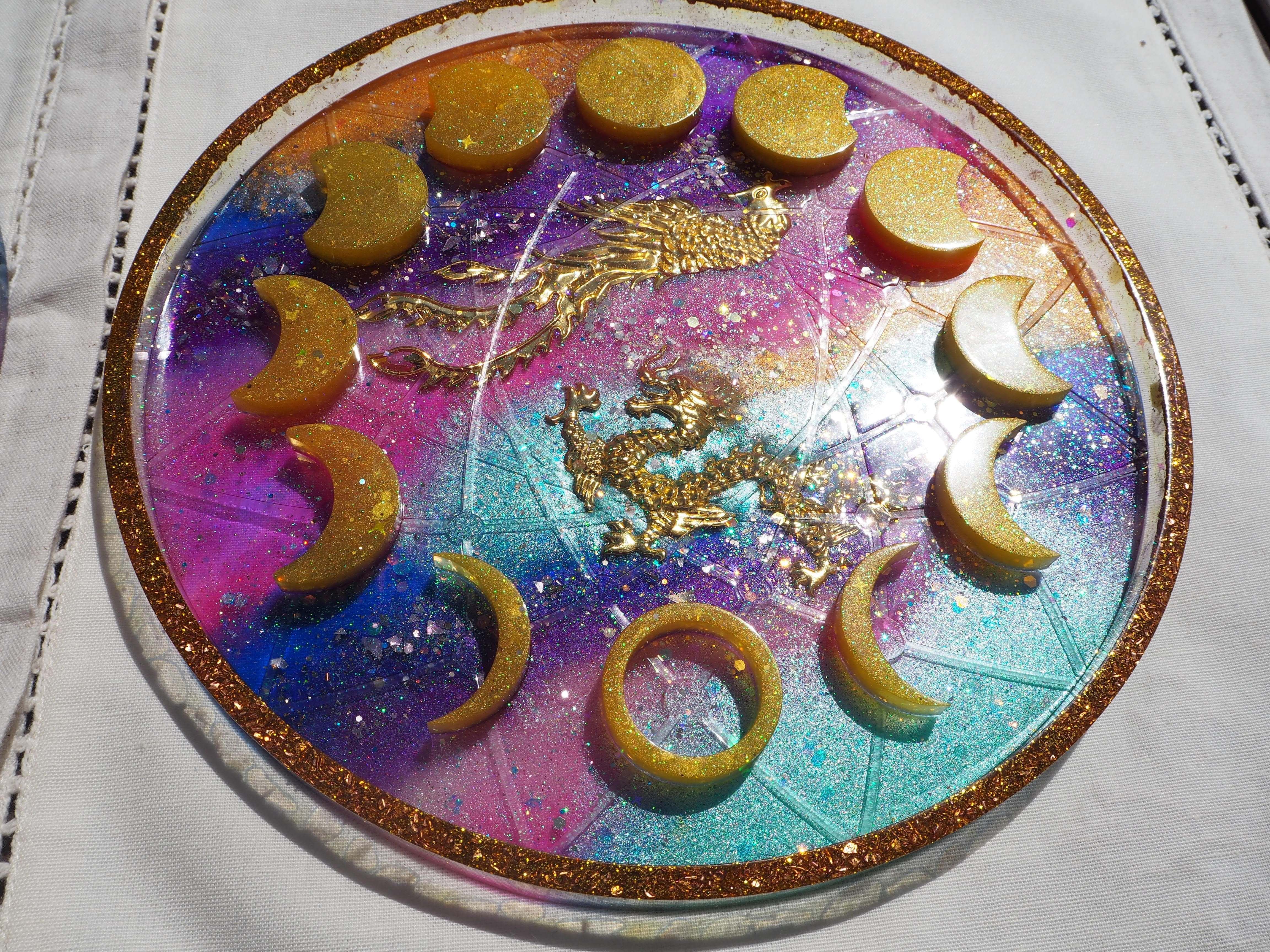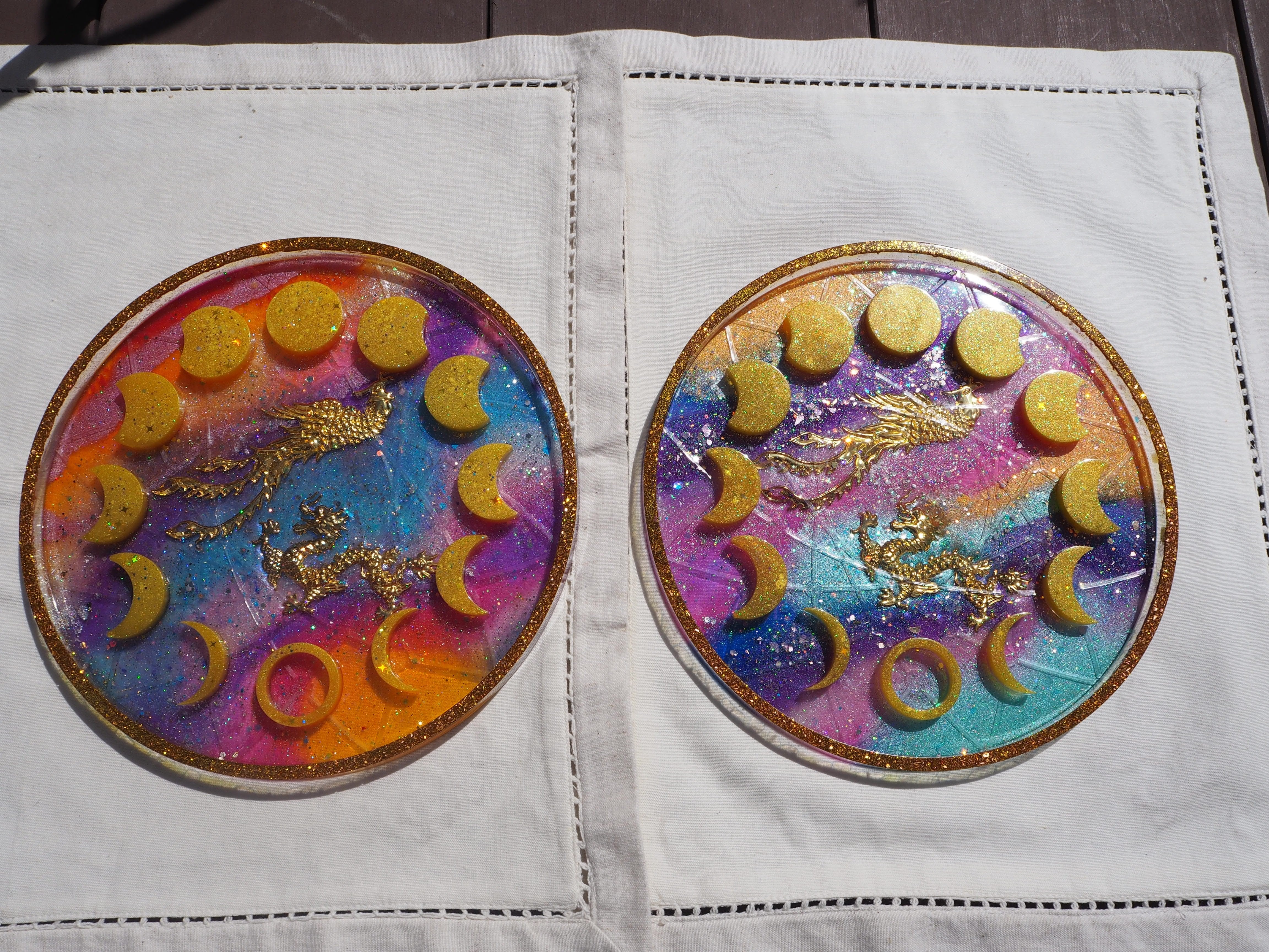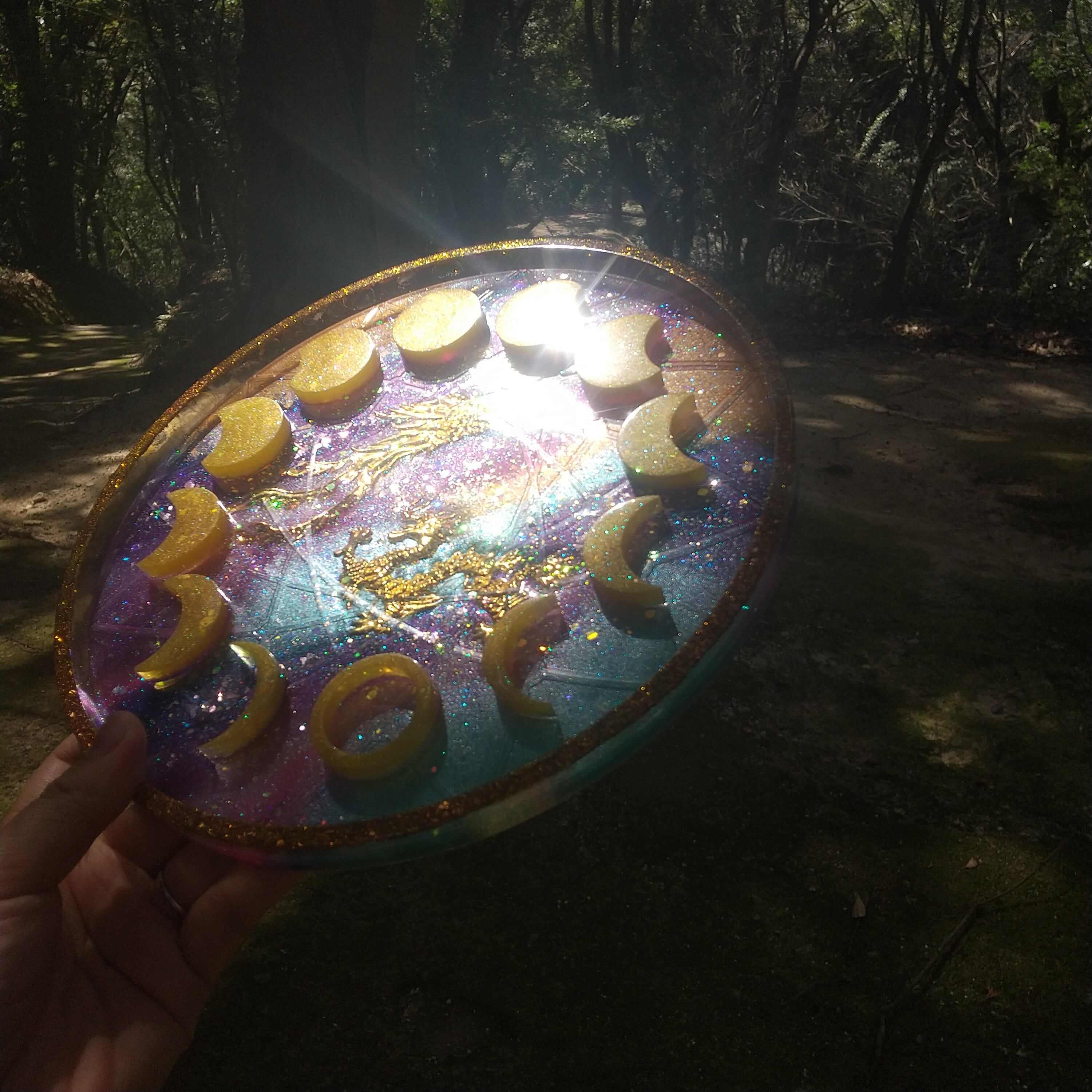 C 龍と鳳凰の月の満ち欠けプレートオルゴナイト(木製スタンド付き)