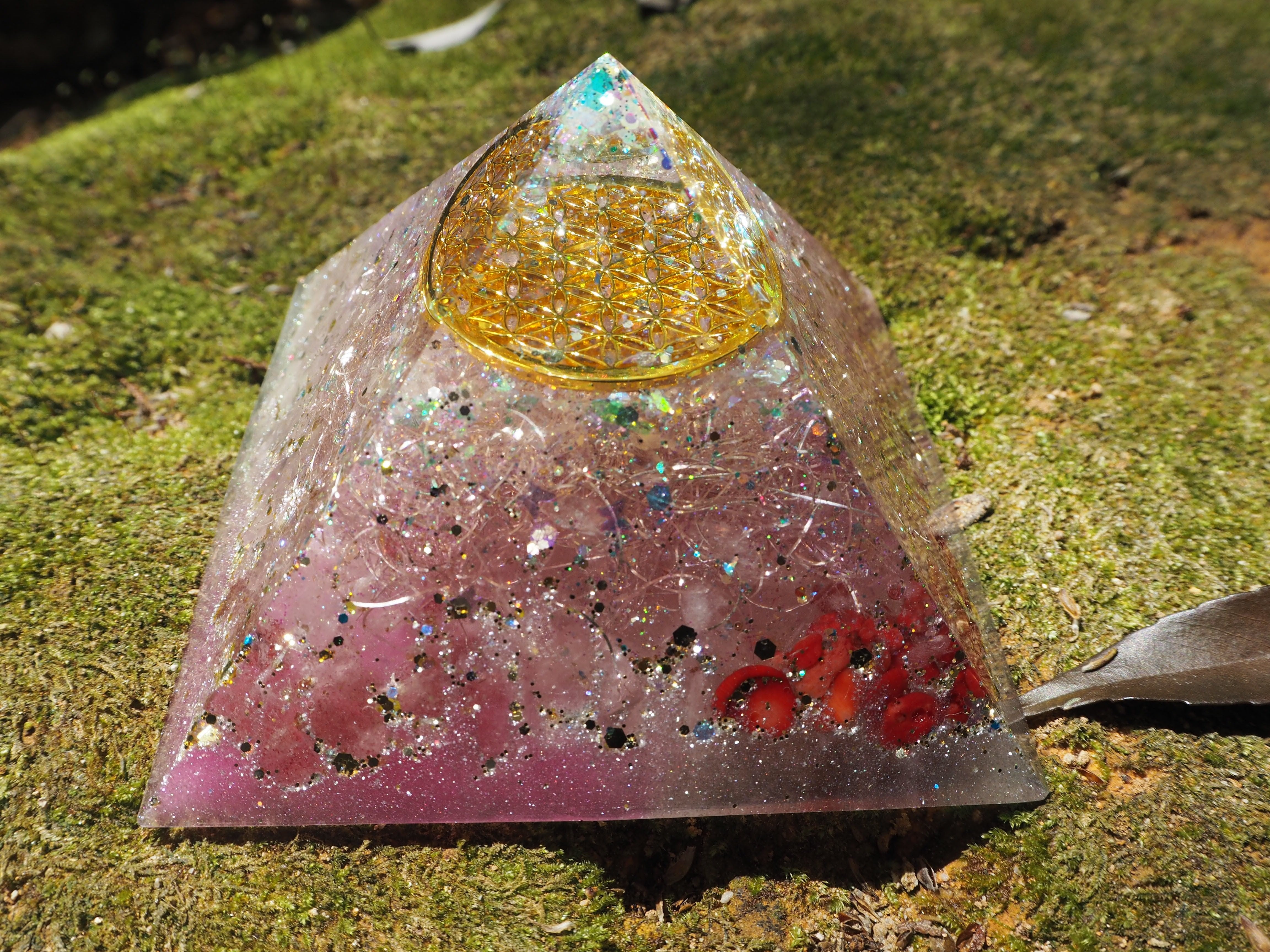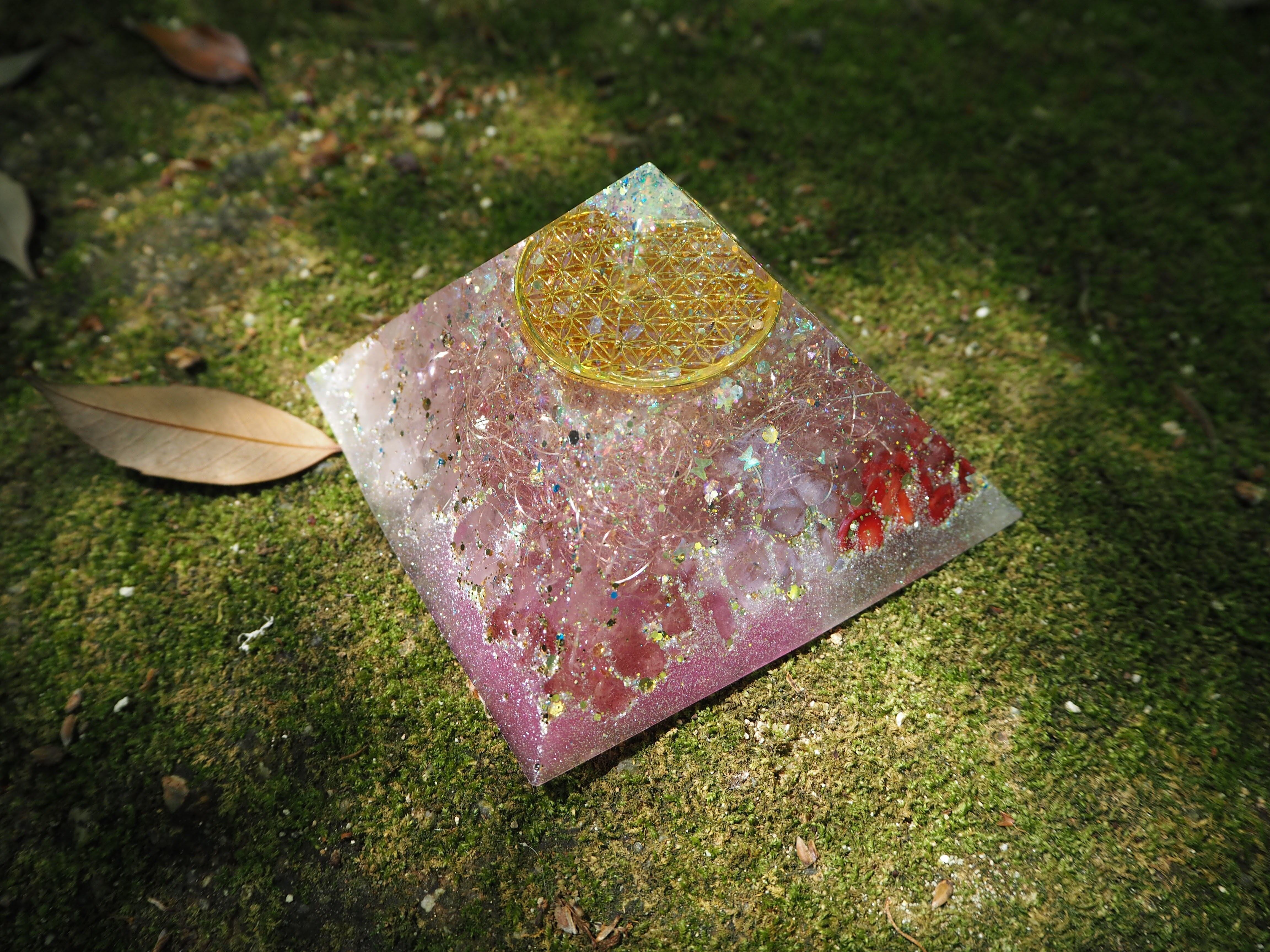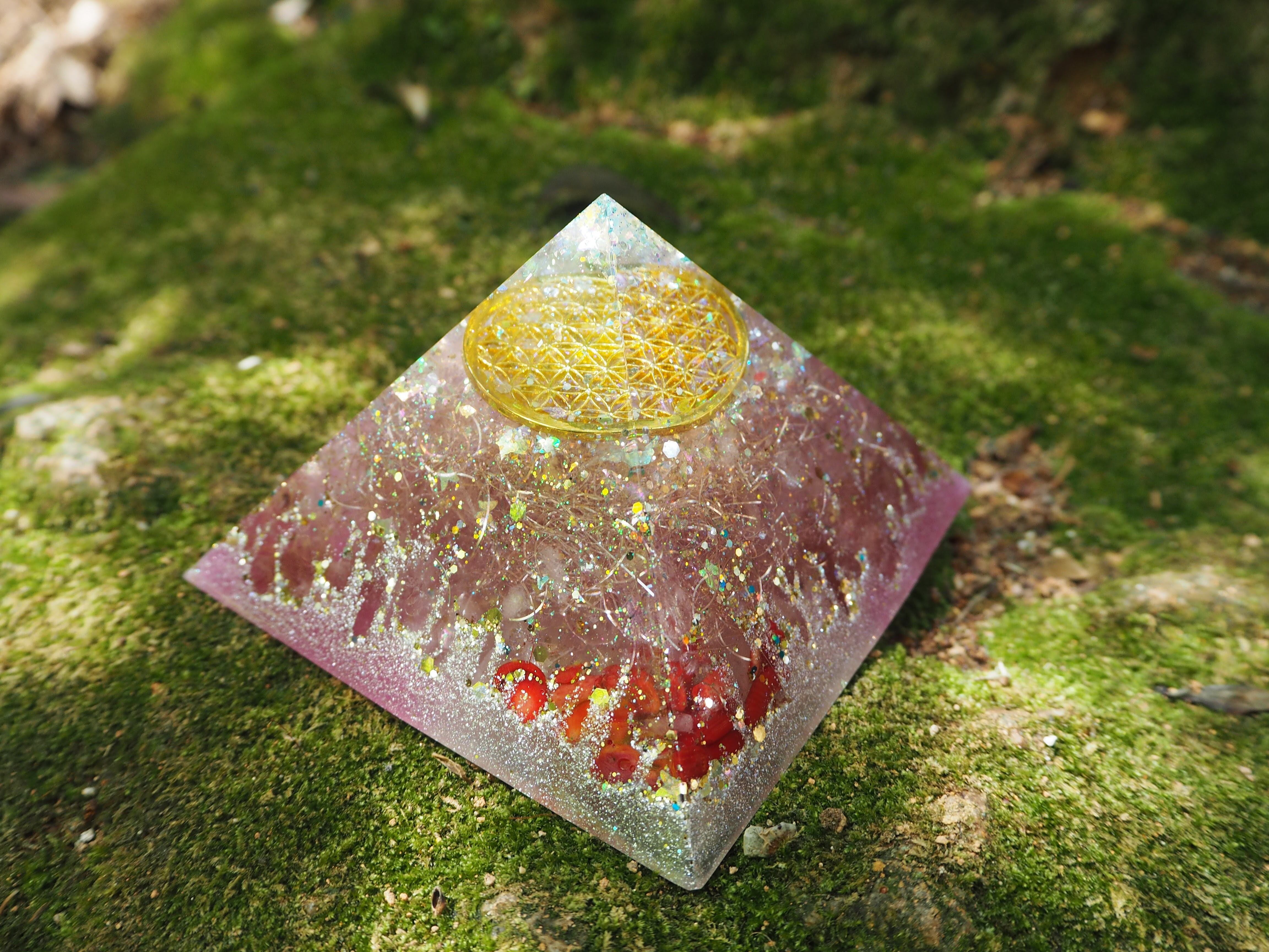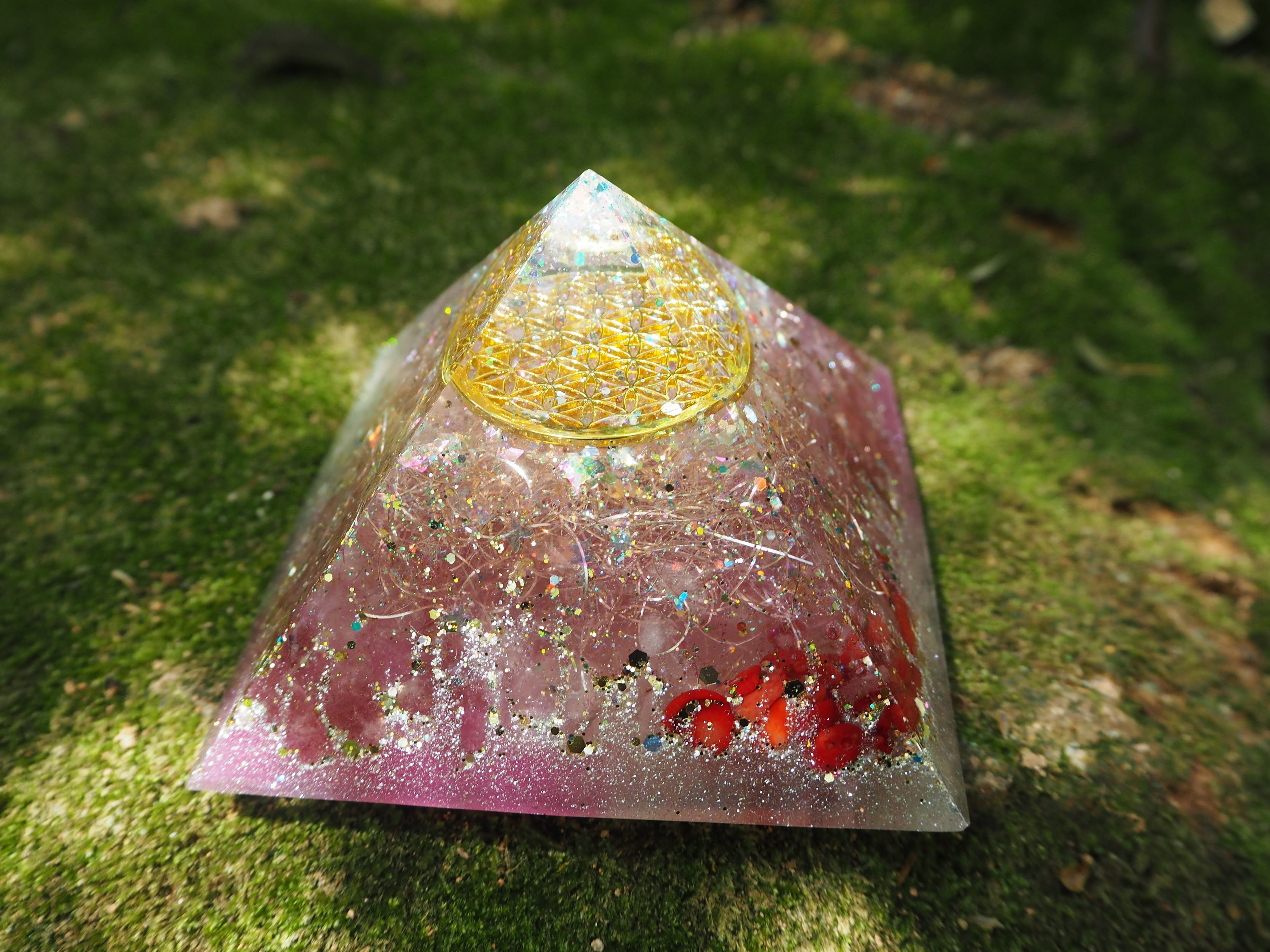 中には赤珊瑚、ローズクォーツ、ストロベリークォーツ、A5ランクヒマラヤ水晶を封入しました。