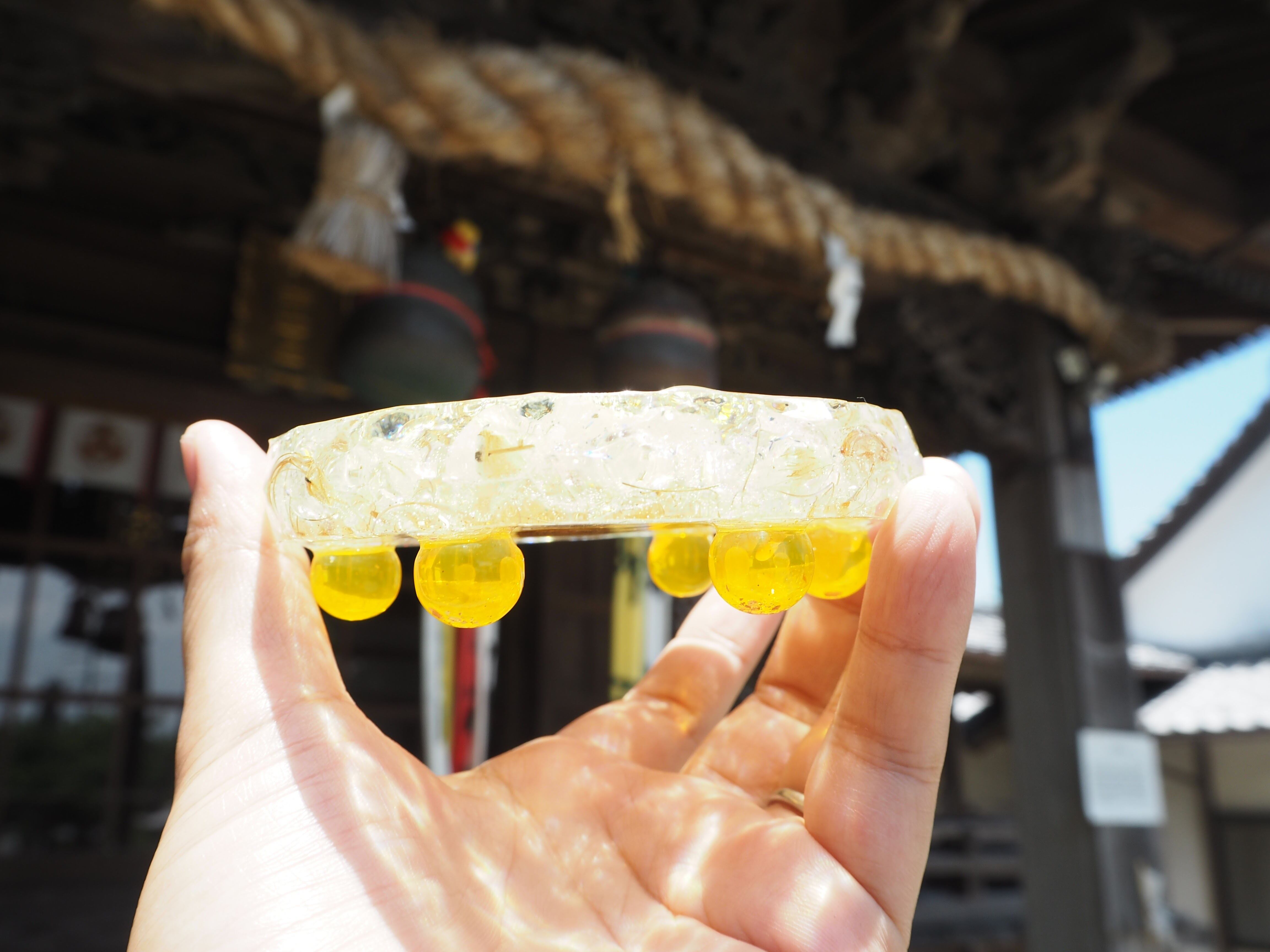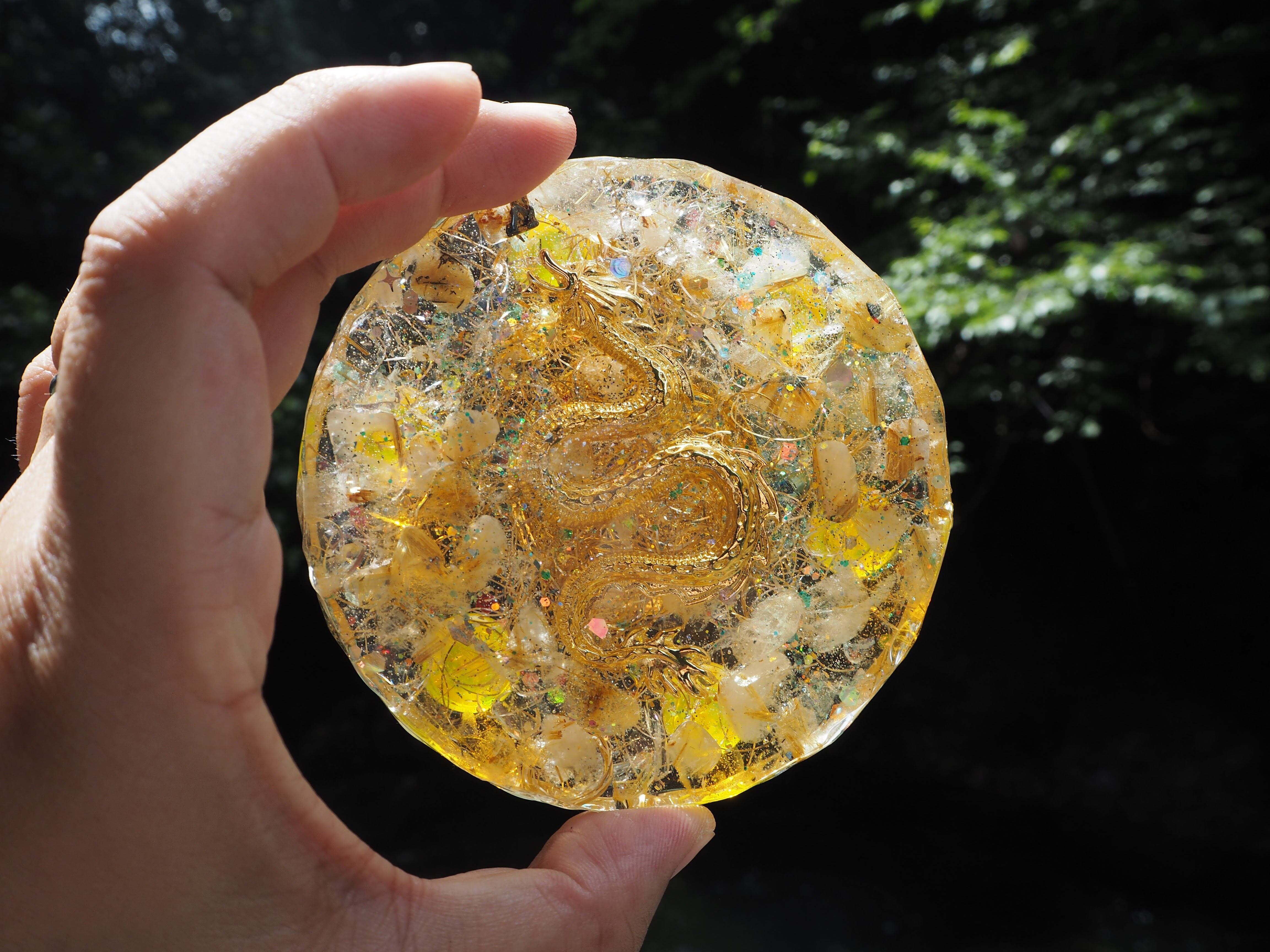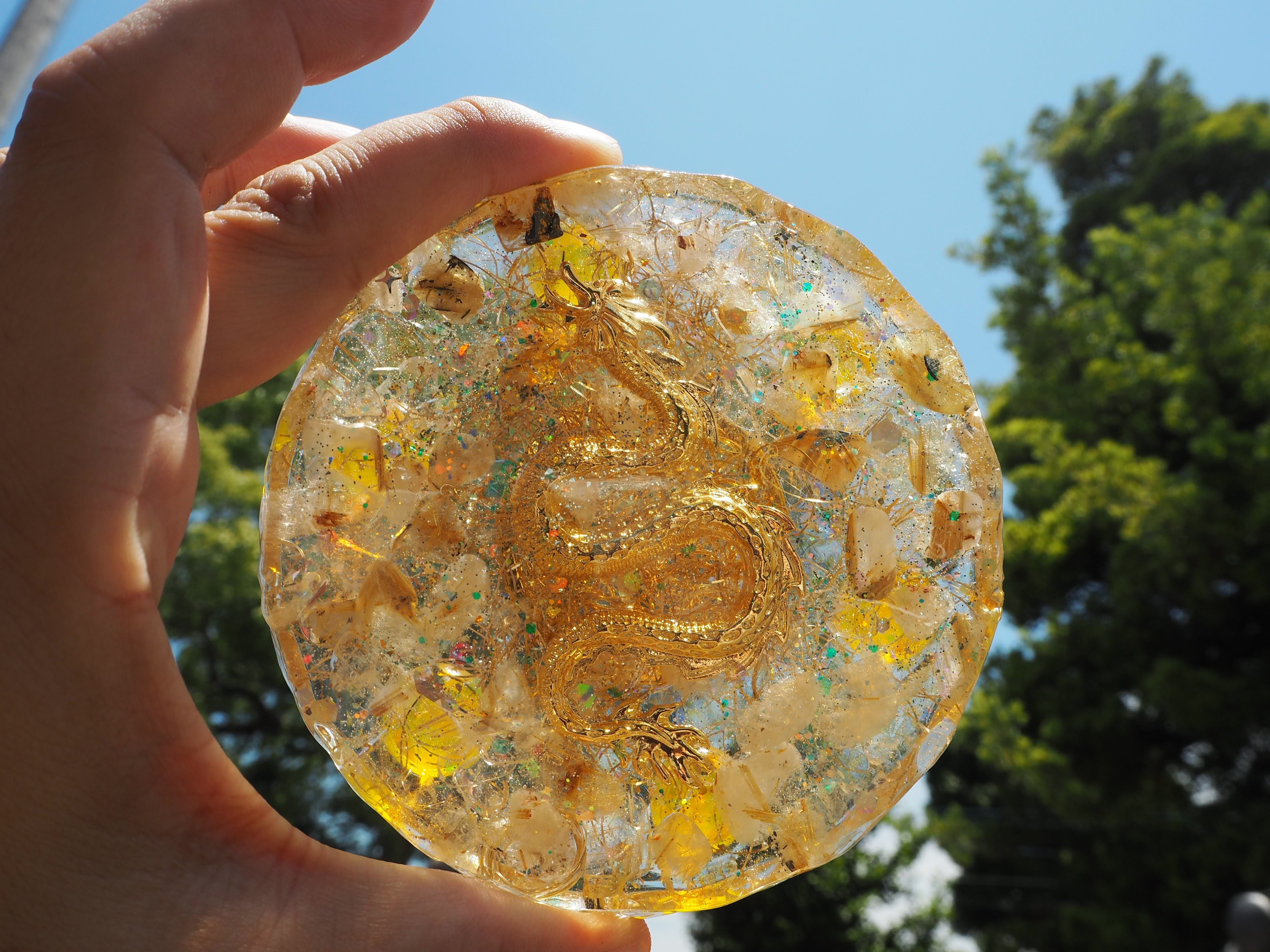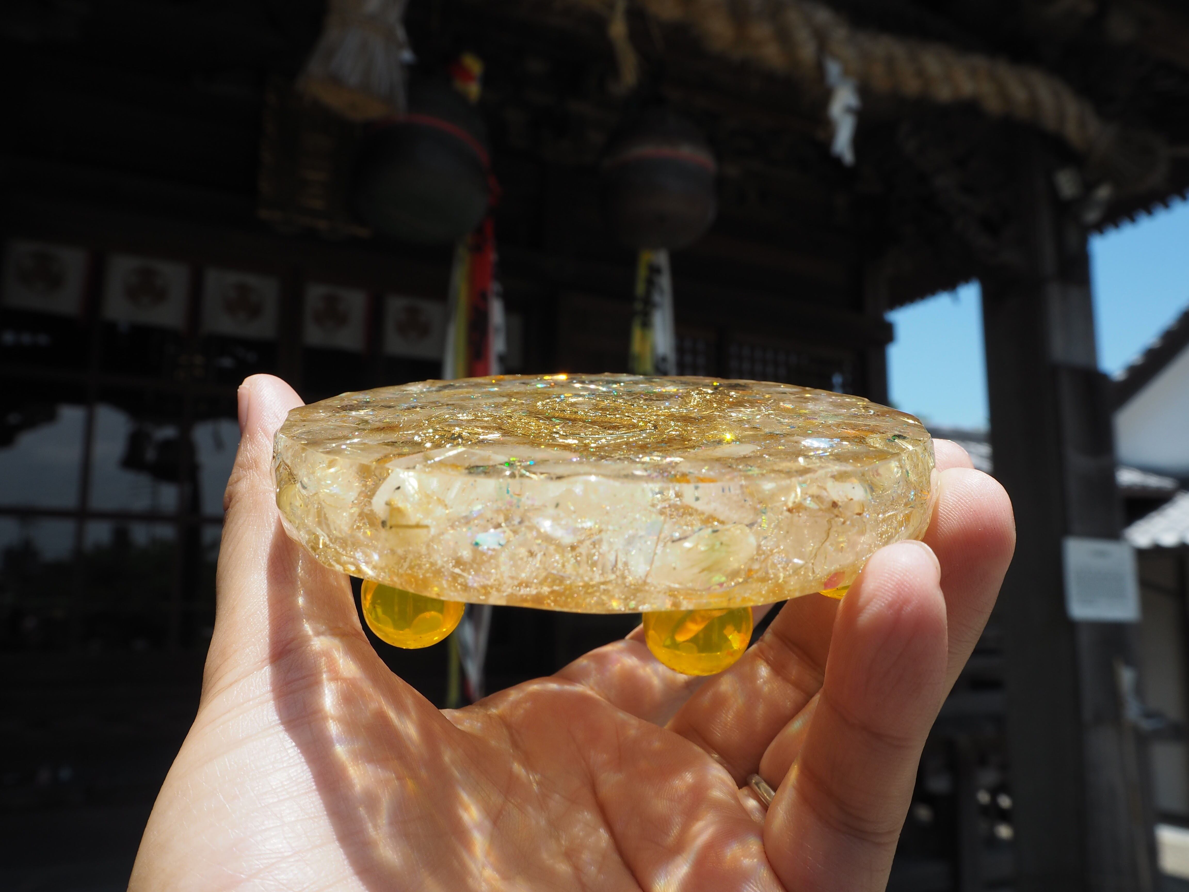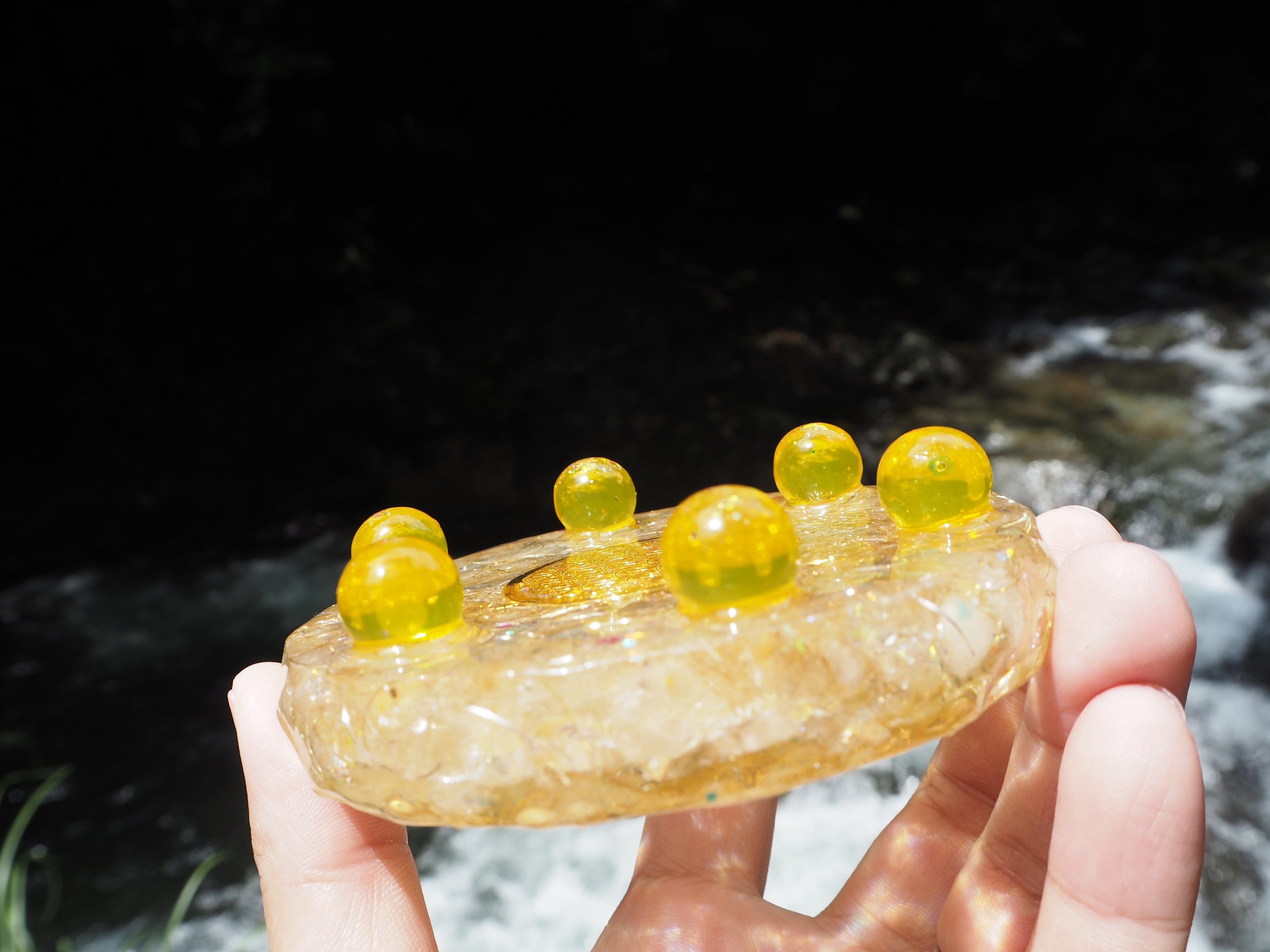 こちらはこちらは、金運アップの石シトリンと、ルチルクォーツを封入したプレートオルゴナイトです。