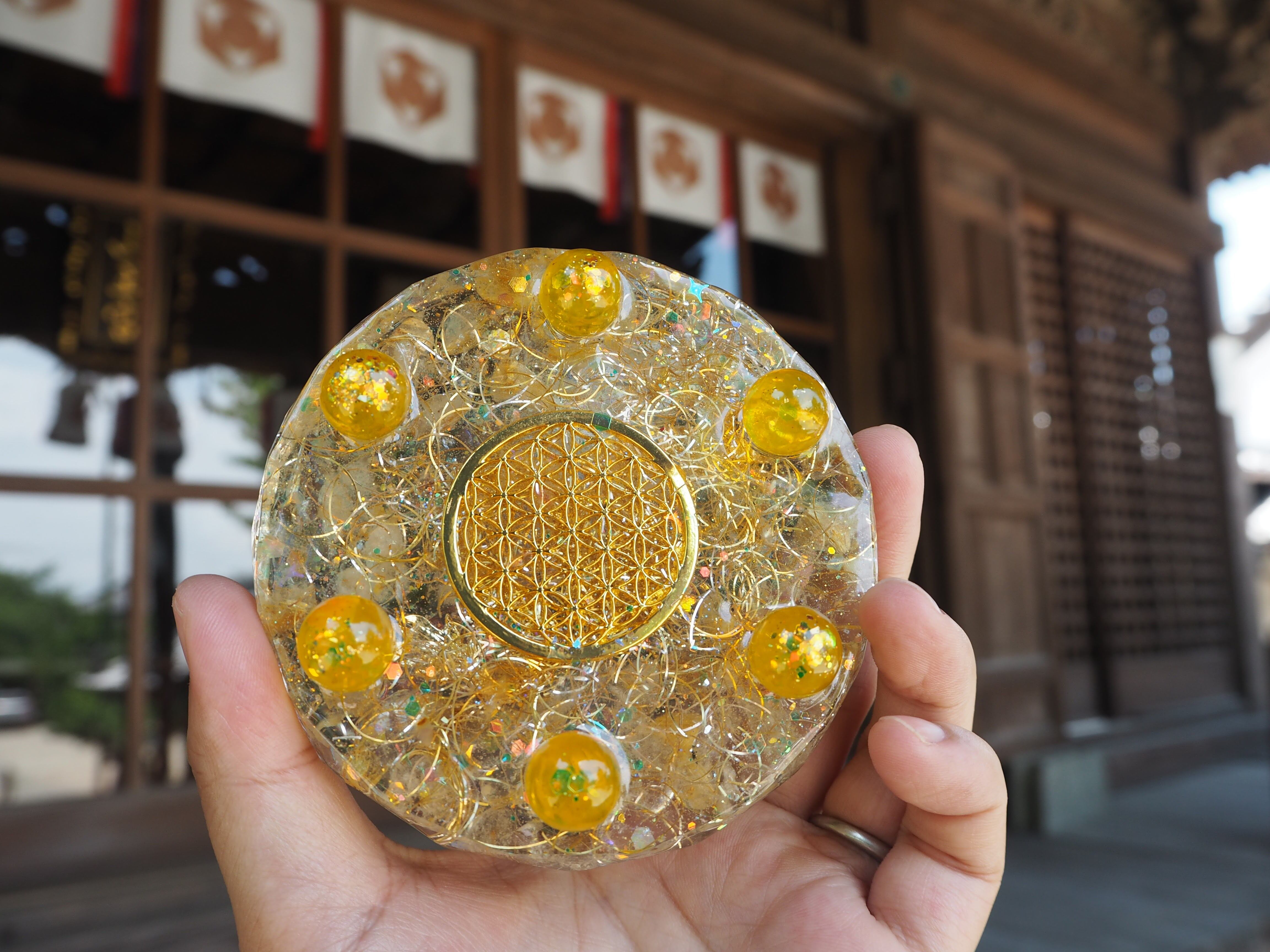アウトレット 金運・財運を呼ぶ石シトリン、ルチルクォーツ入りフラワーオブライフのプレートオルゴナイト