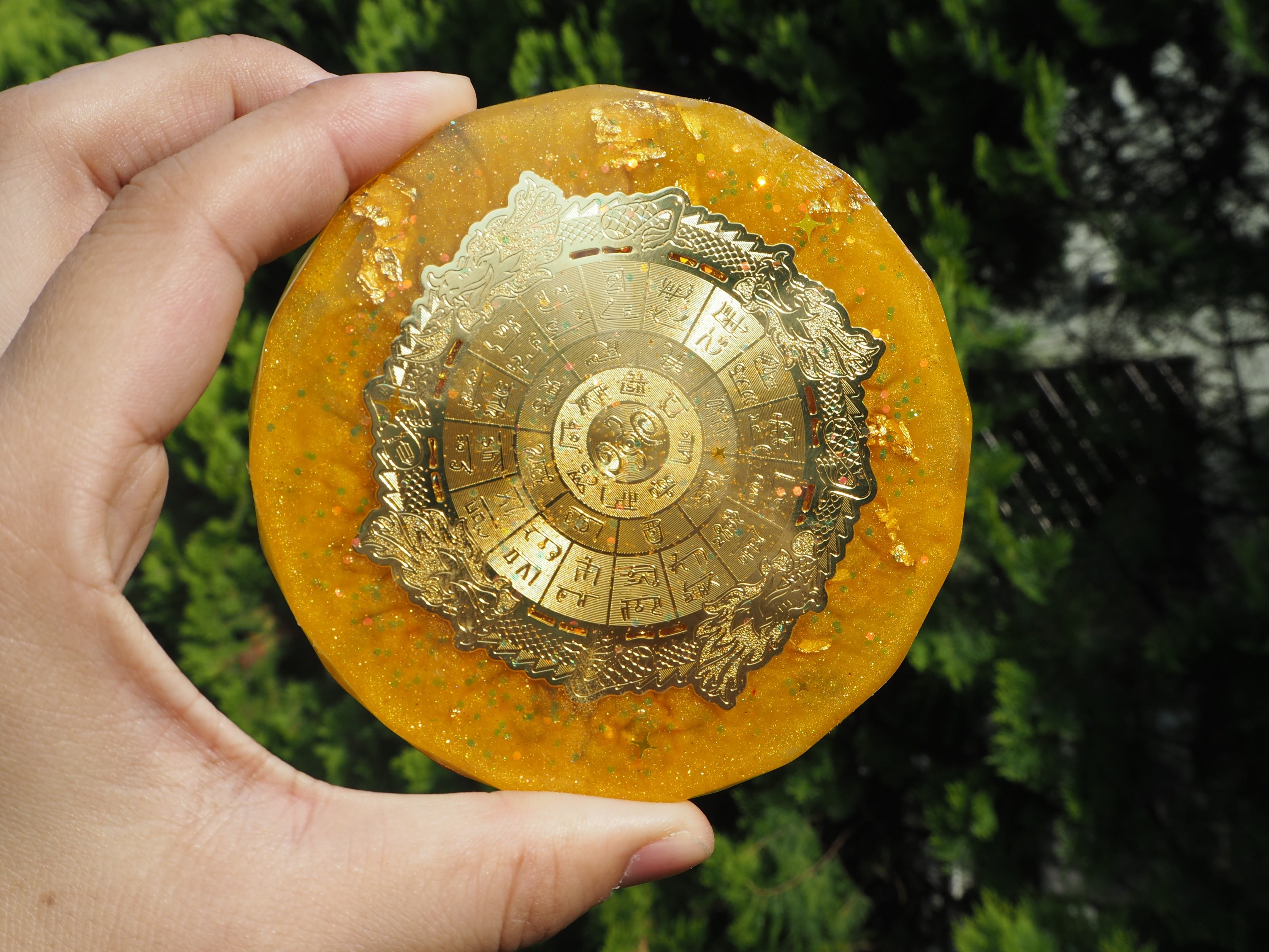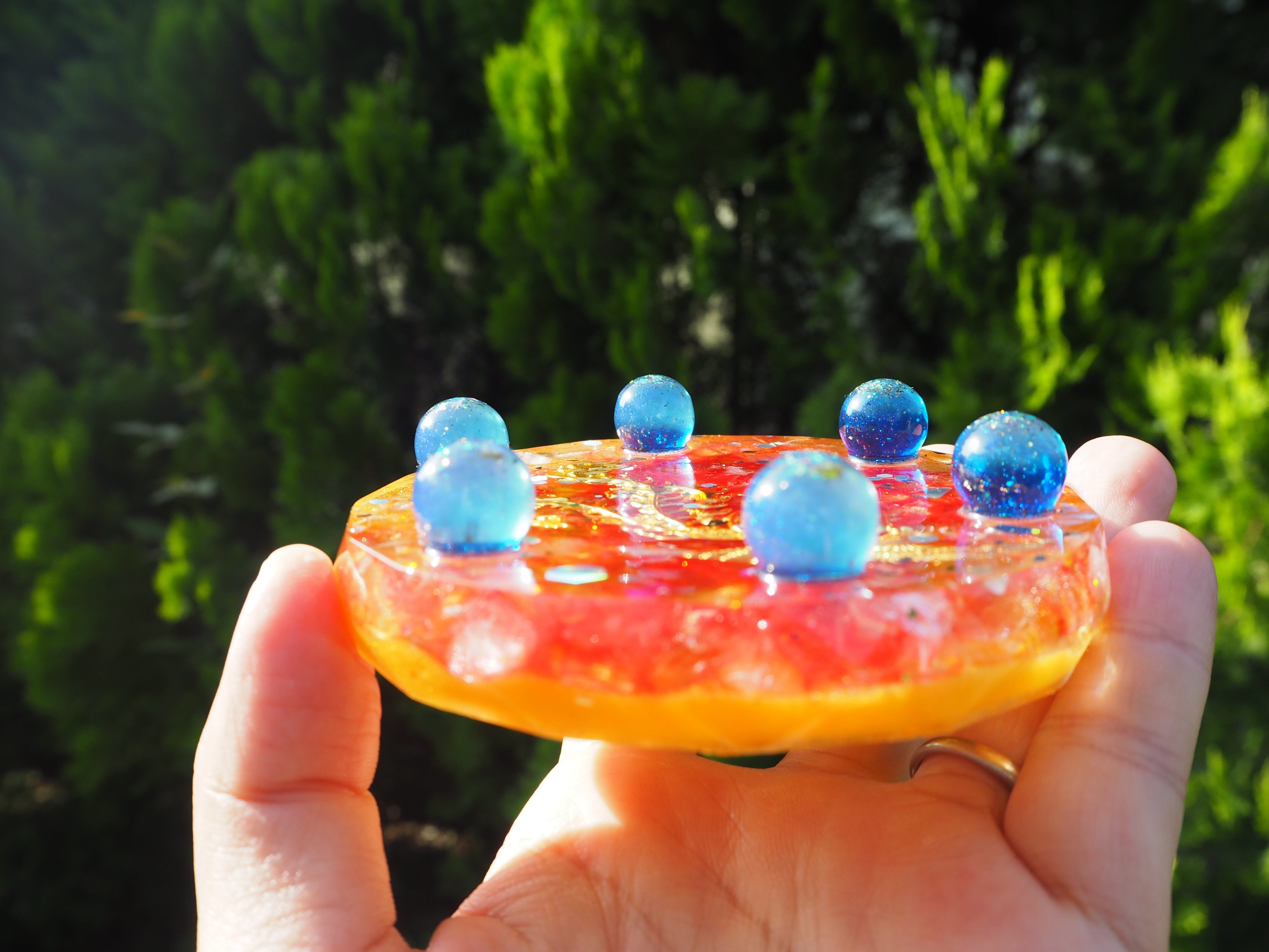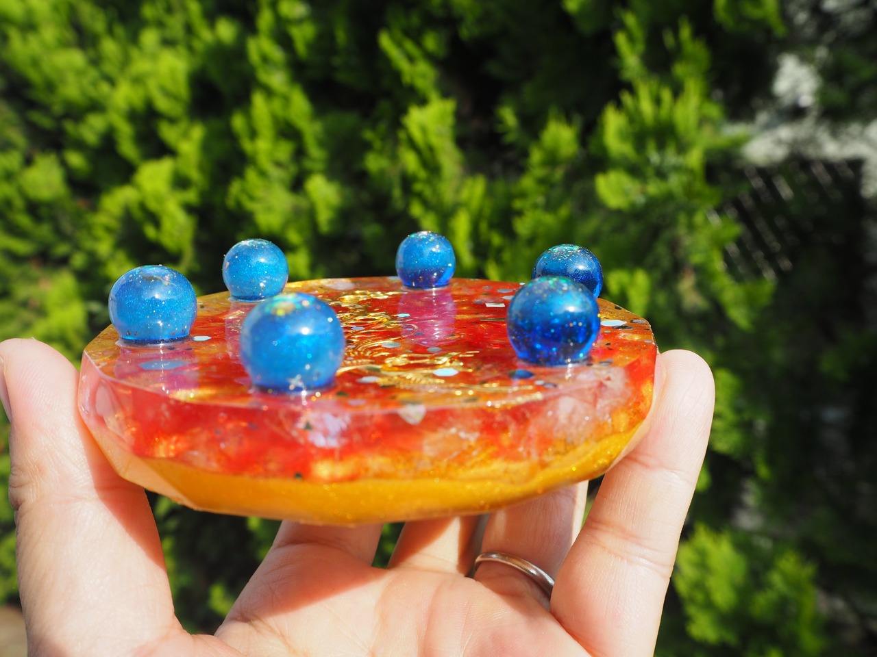 直径9.8㎝×高さ2.2㎝の台座付オルゴナイトです。