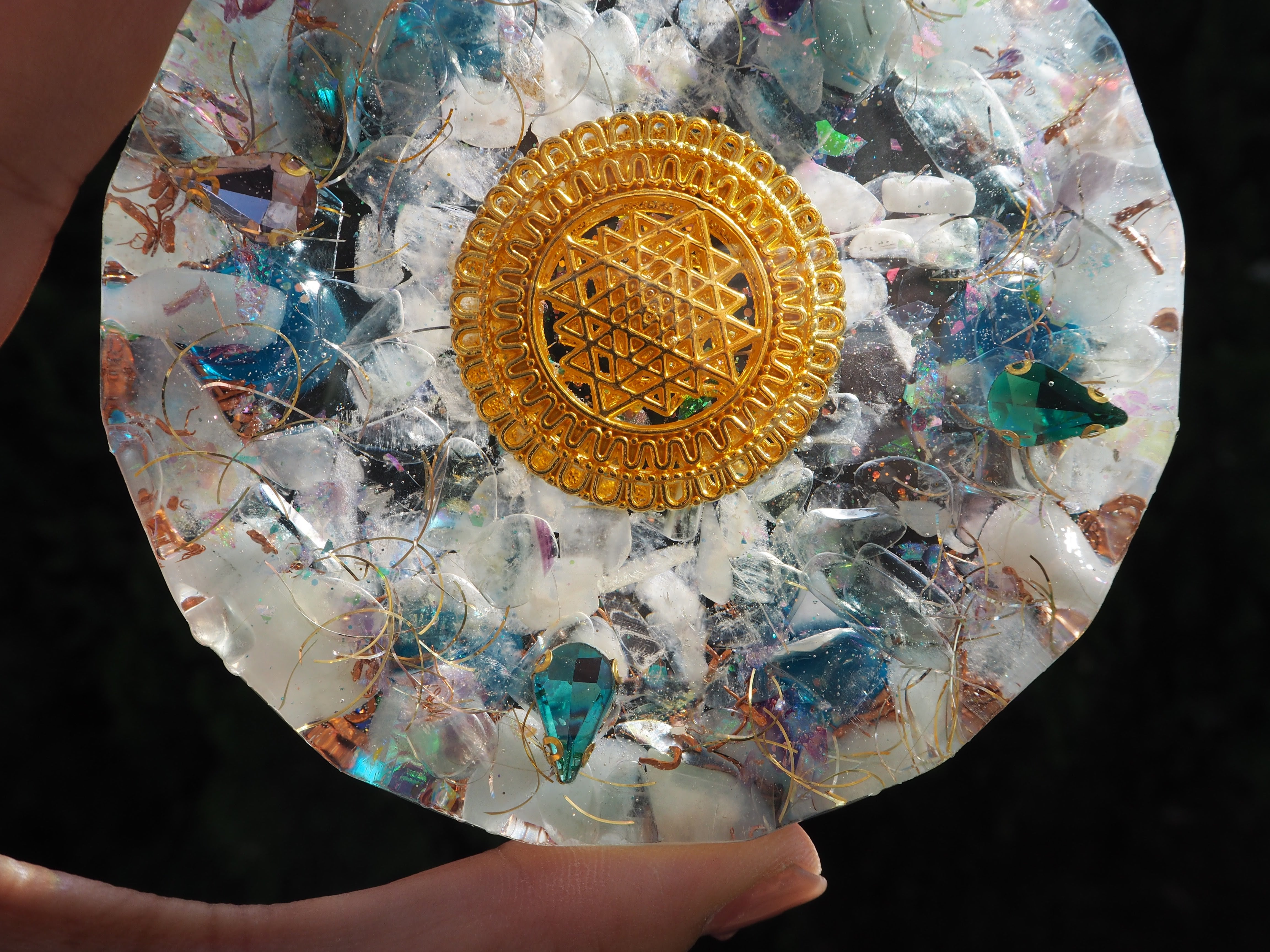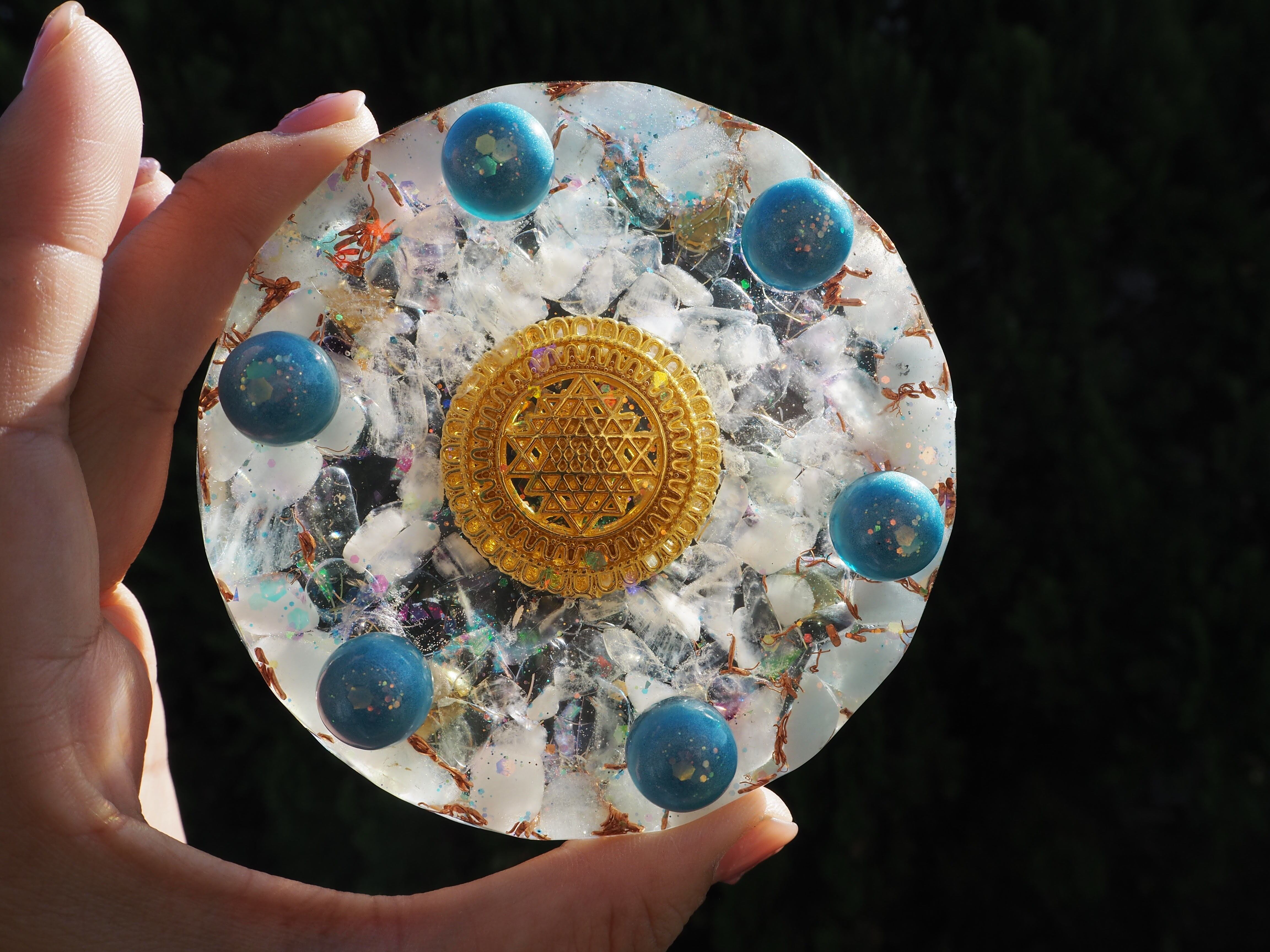 中央には、古代神聖幾何学のシャリーヤントラを封入しています。ヤントラは、望みの結果へ導き、幸福をもたらしてくれると言われています✨