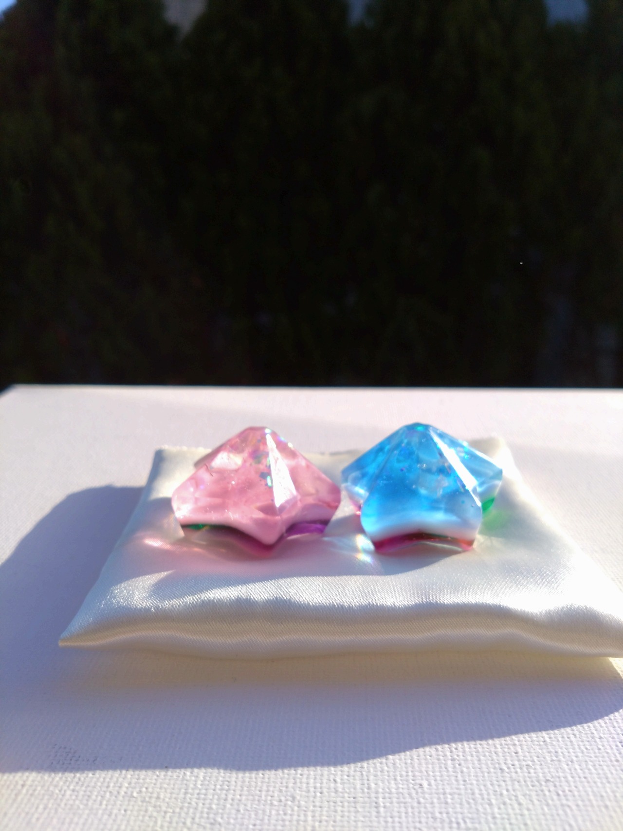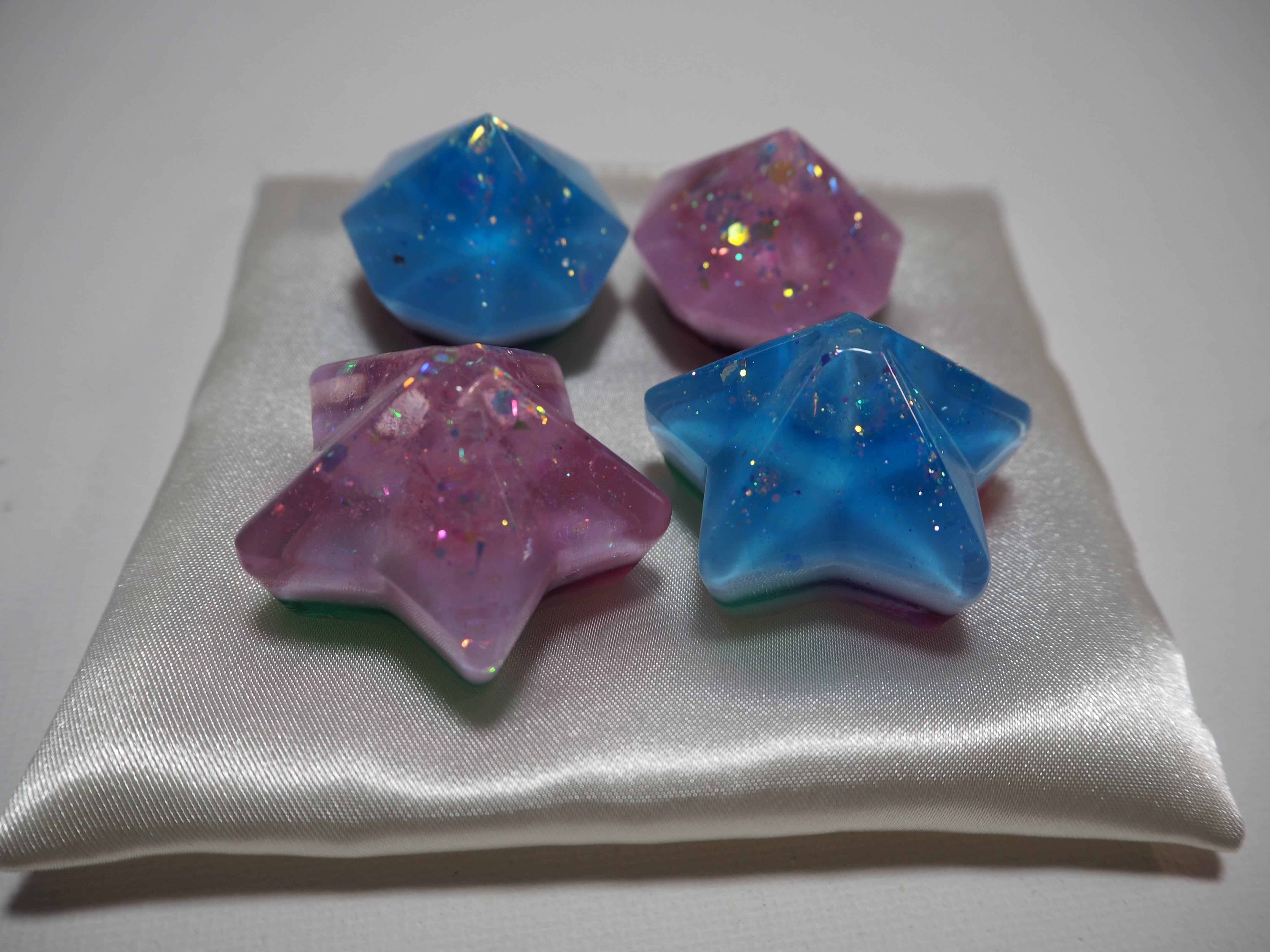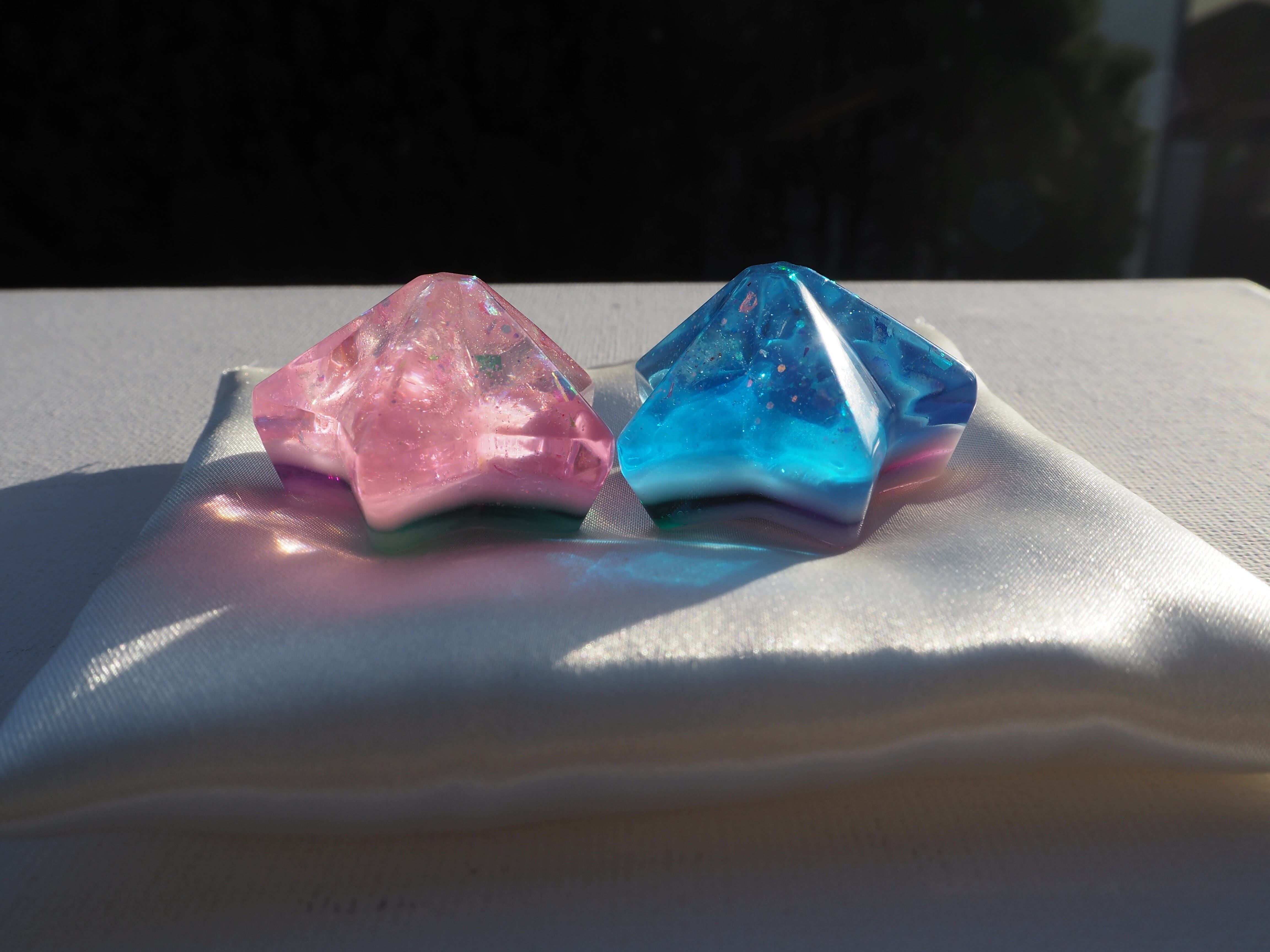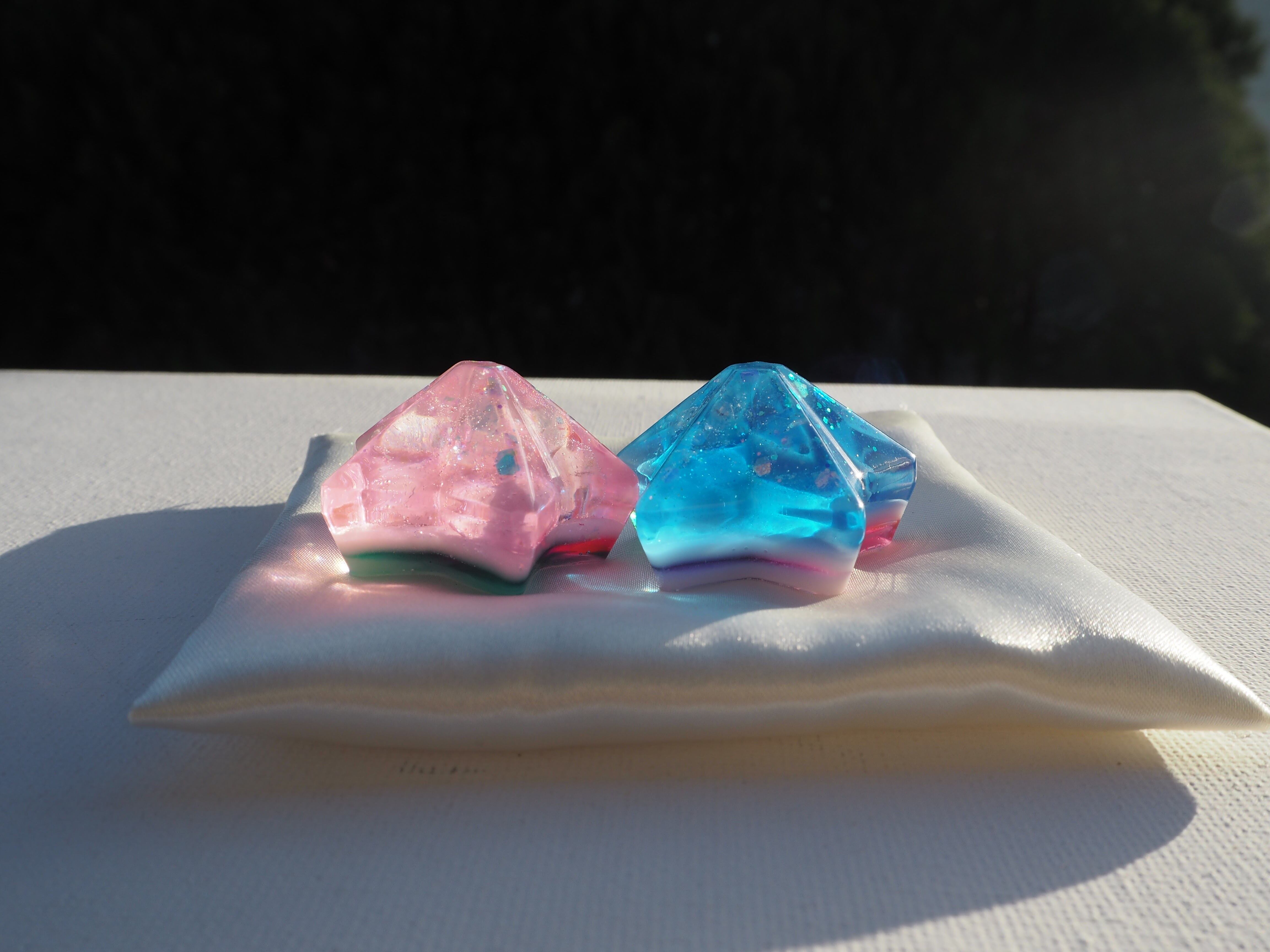 こちらは、ピンクとブルーのミニオルゴナイト、この為に生まれた新色のお座布団の三点セットです✨