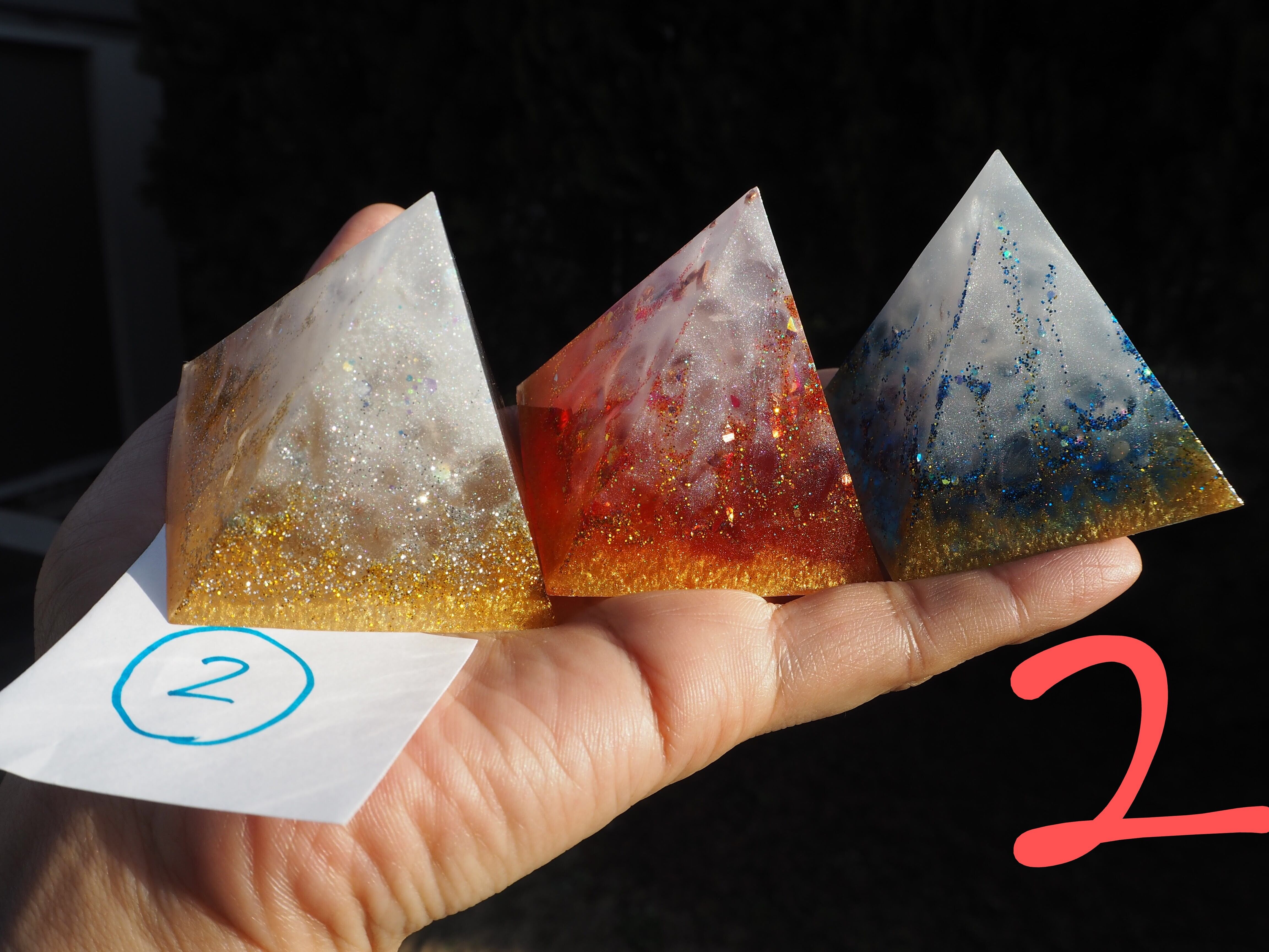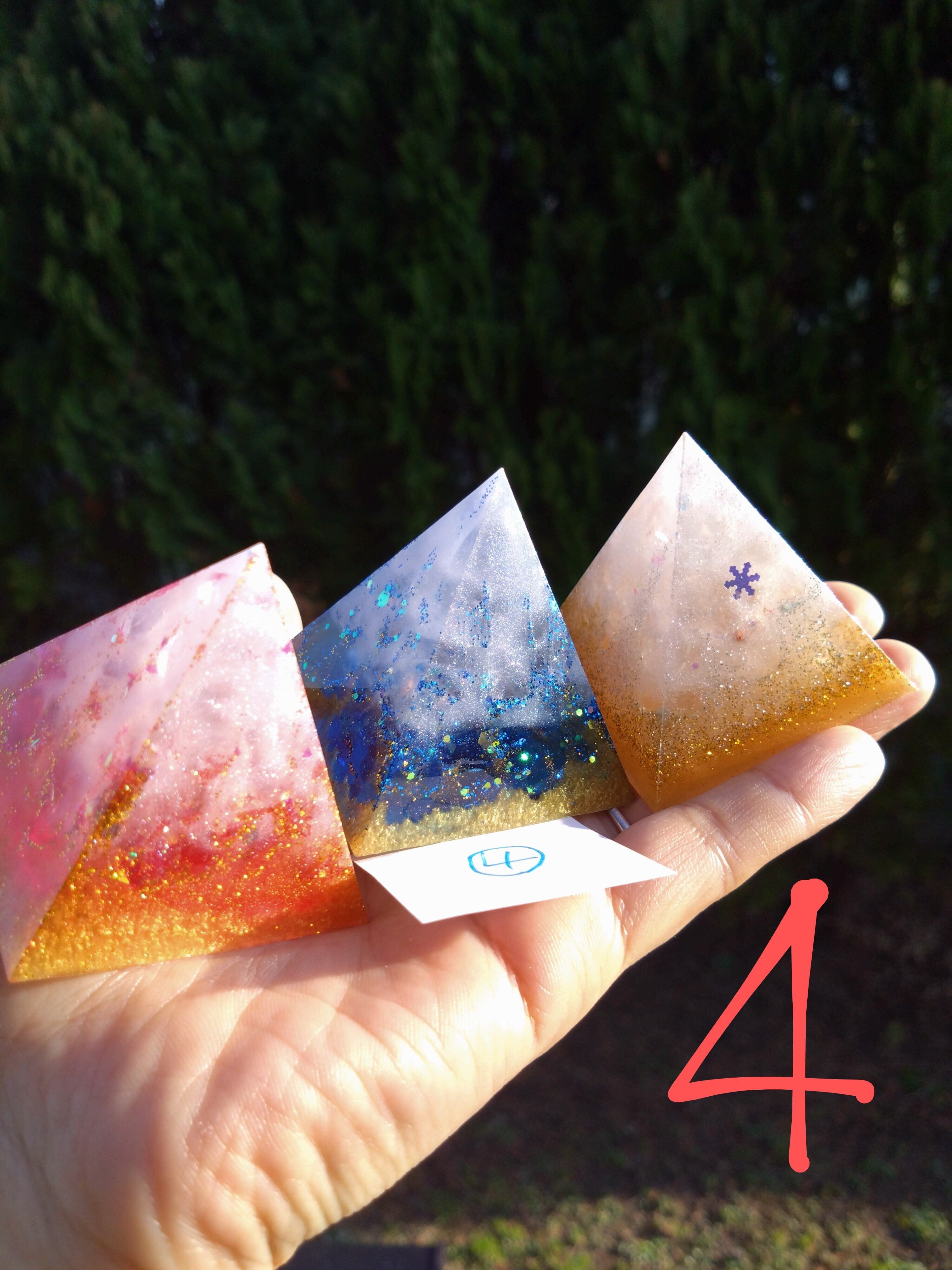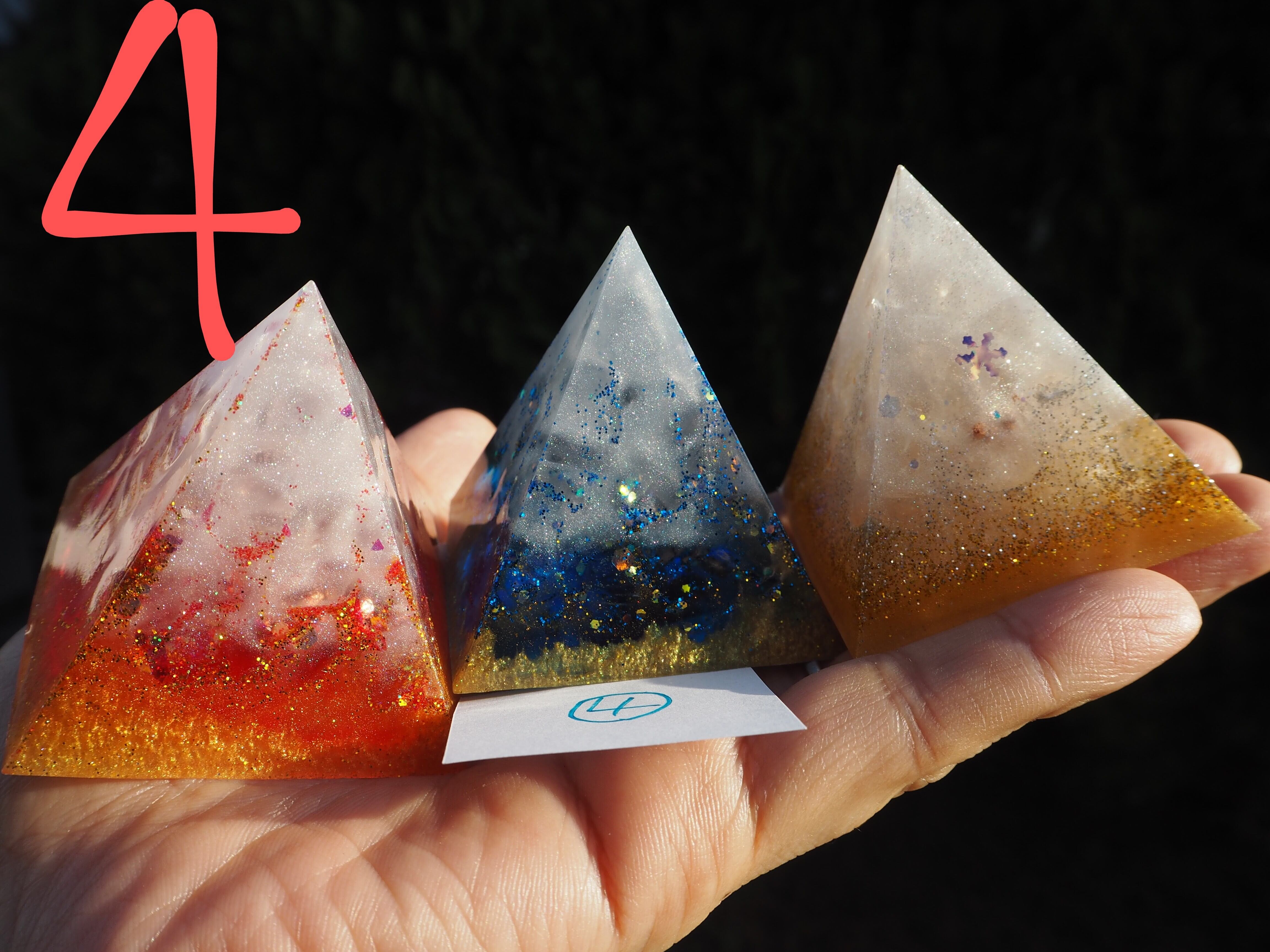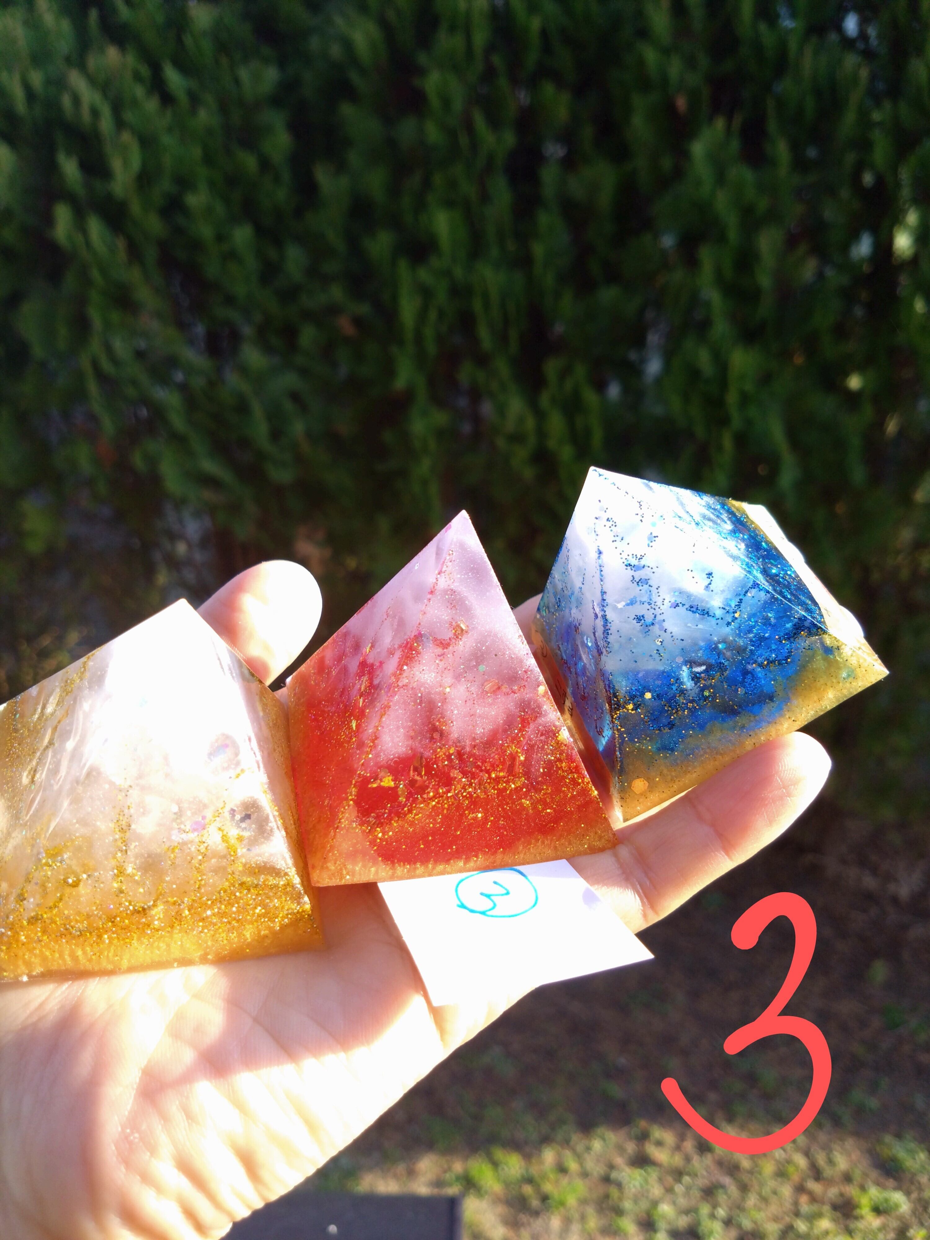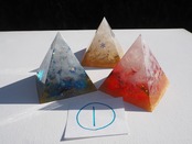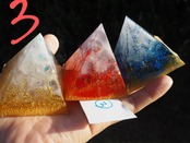 燃え上がる赤のオルゴナイト、清らかな青のオルゴナイト、金銀に輝く白のオルゴナイトすべて1つずつ中に入っているエネルギーが異なります。