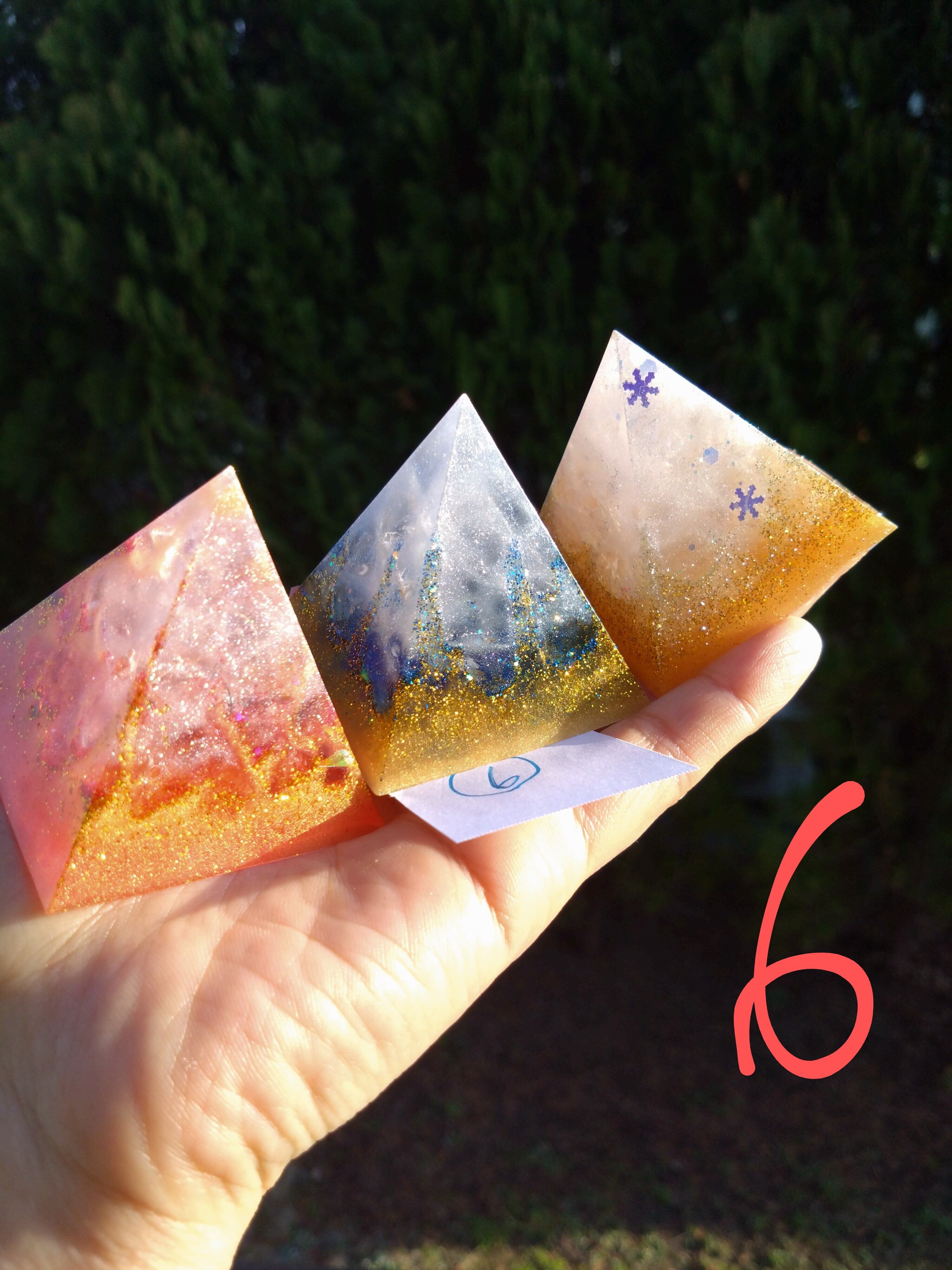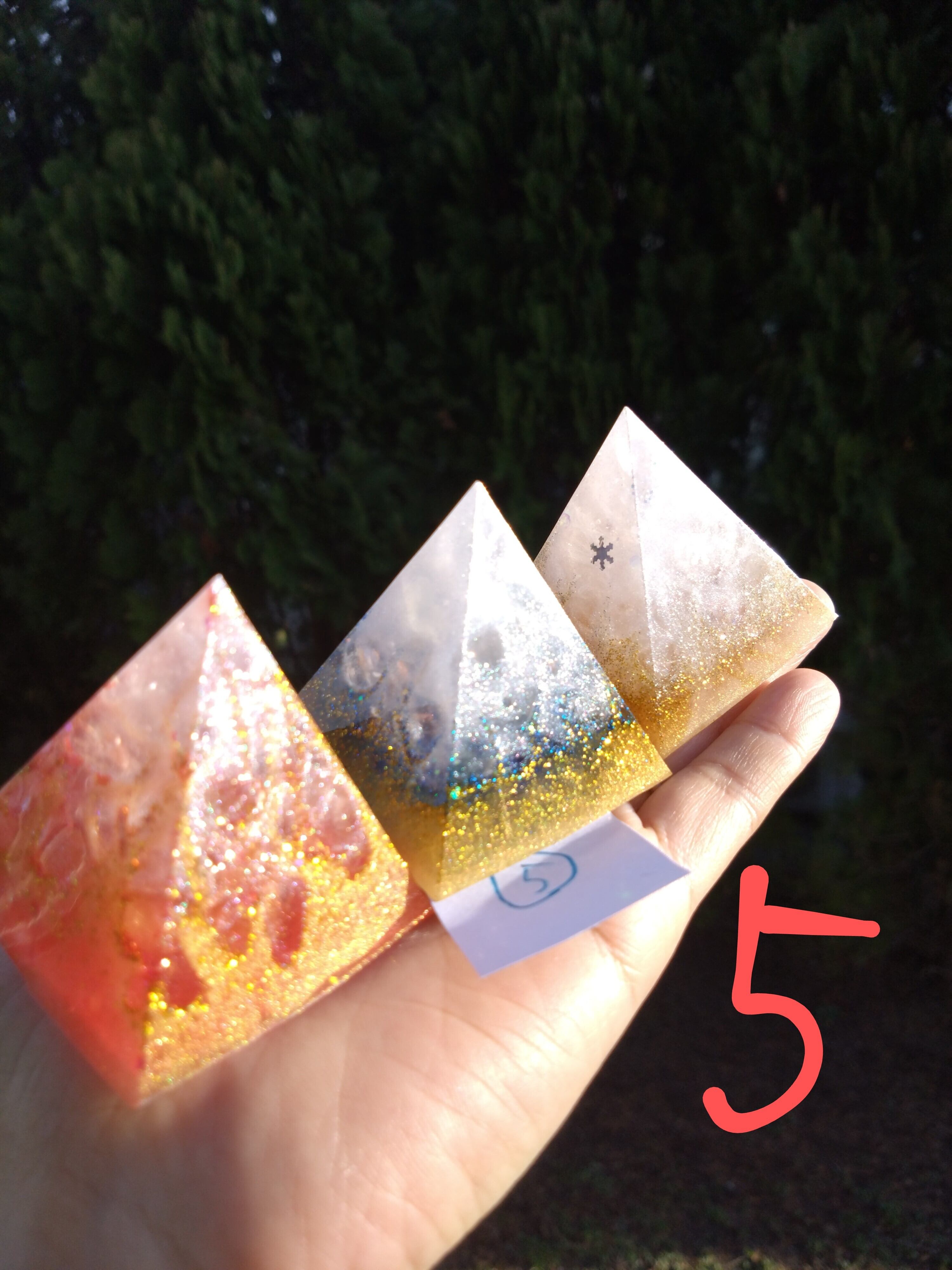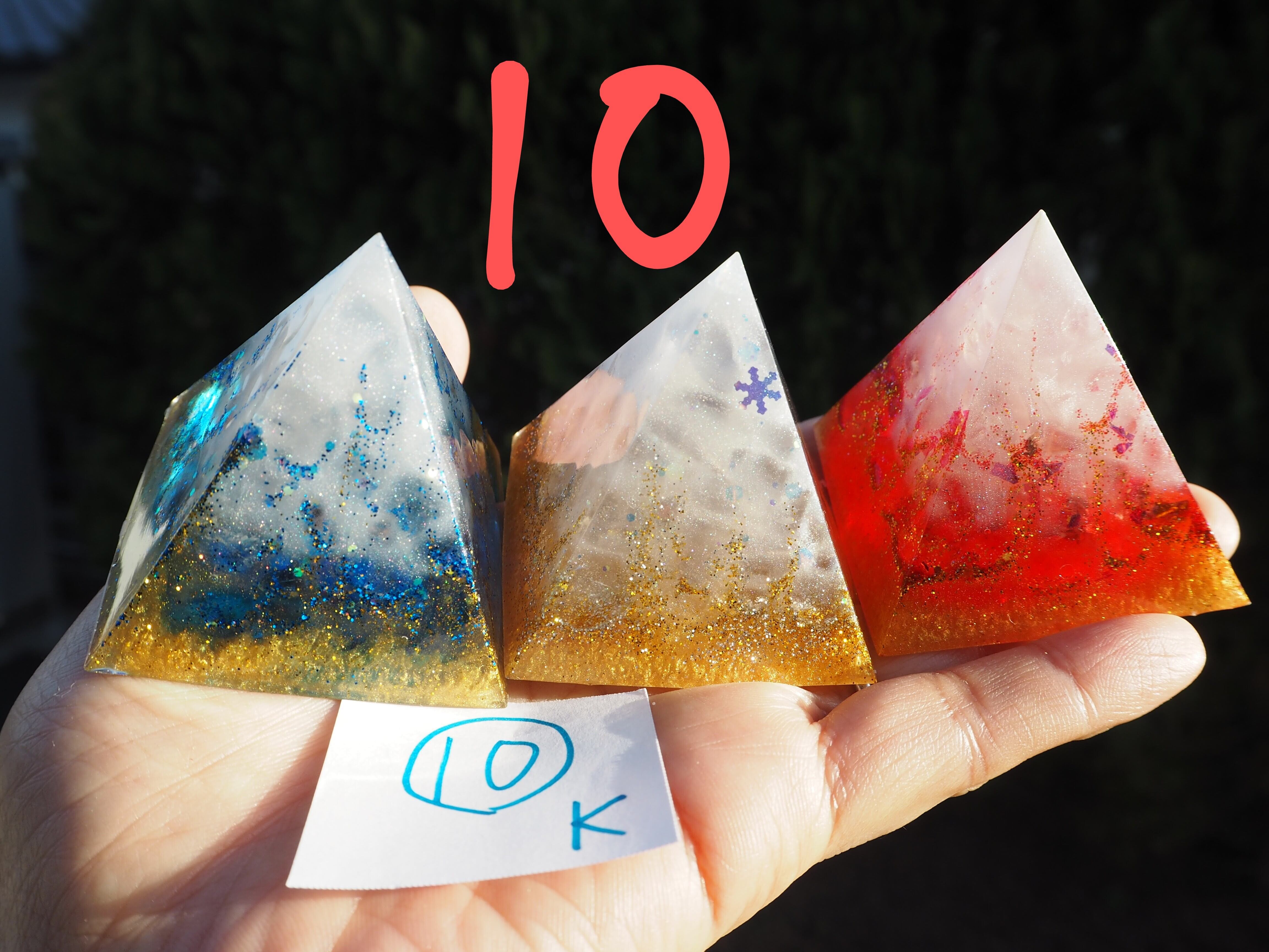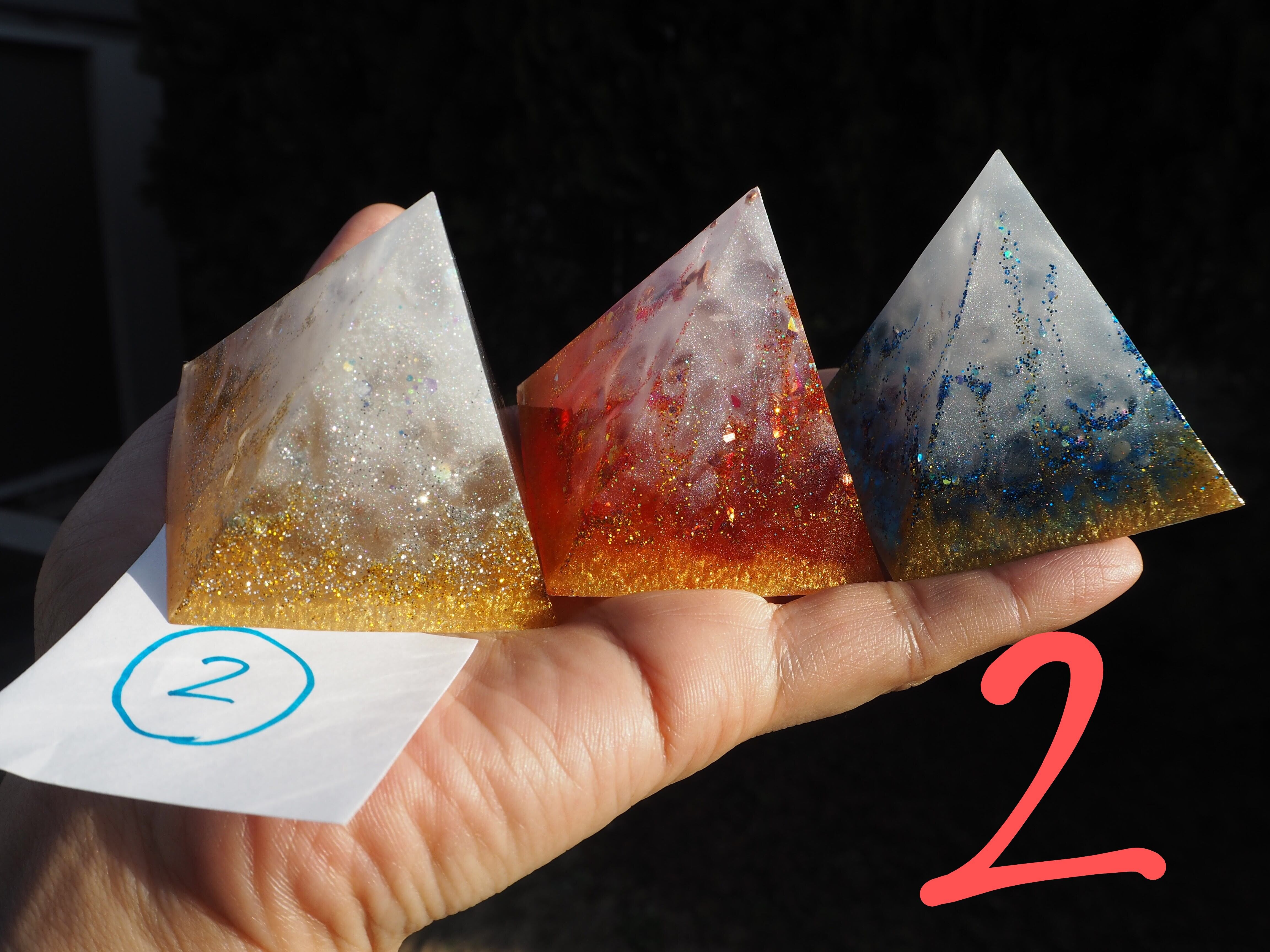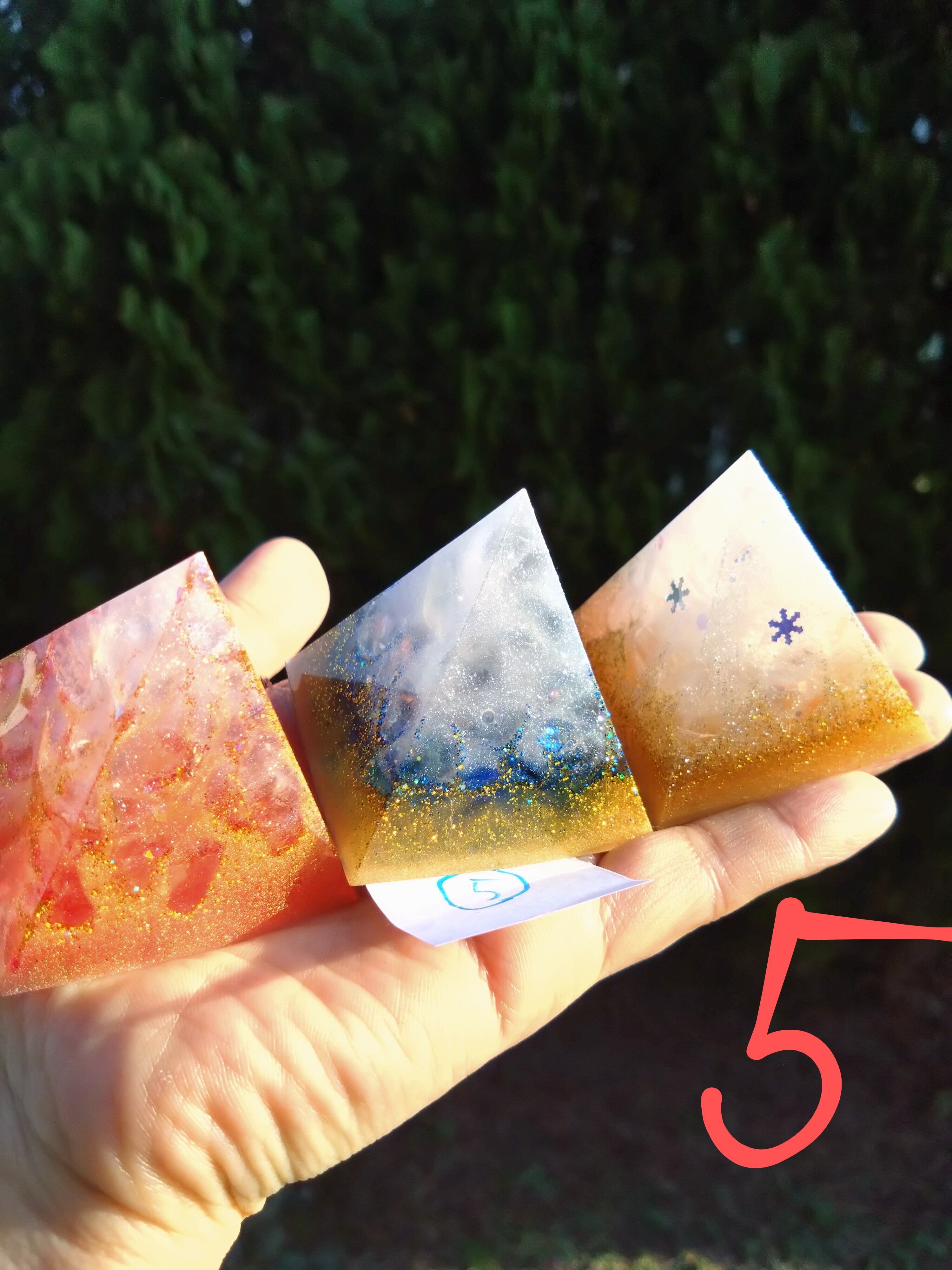燃え上がる赤のオルゴナイト、清らかな青のオルゴナイト、金銀に輝く白のオルゴナイトすべて1つずつ中に入っているエネルギーが異なります。