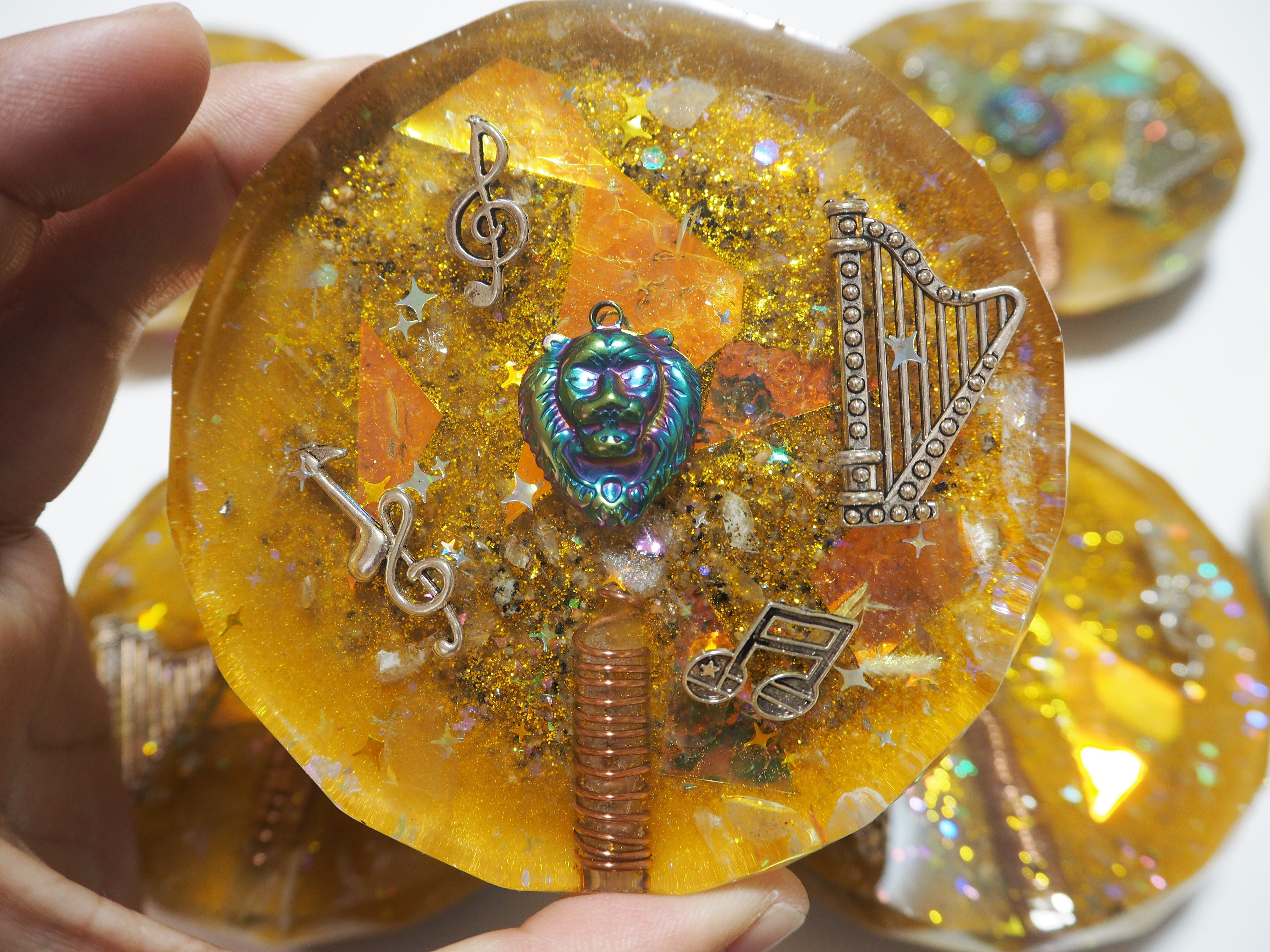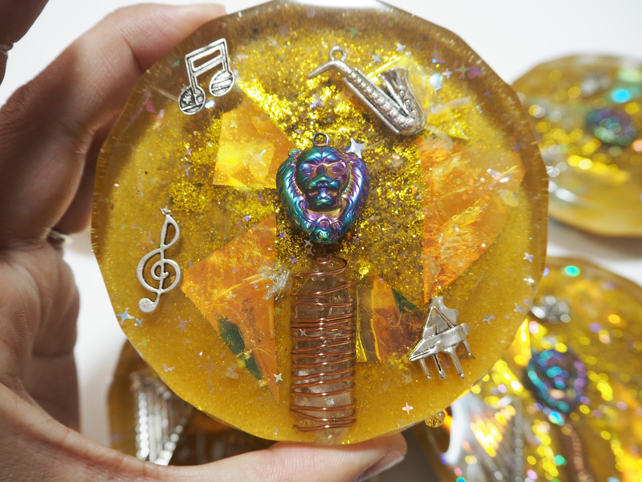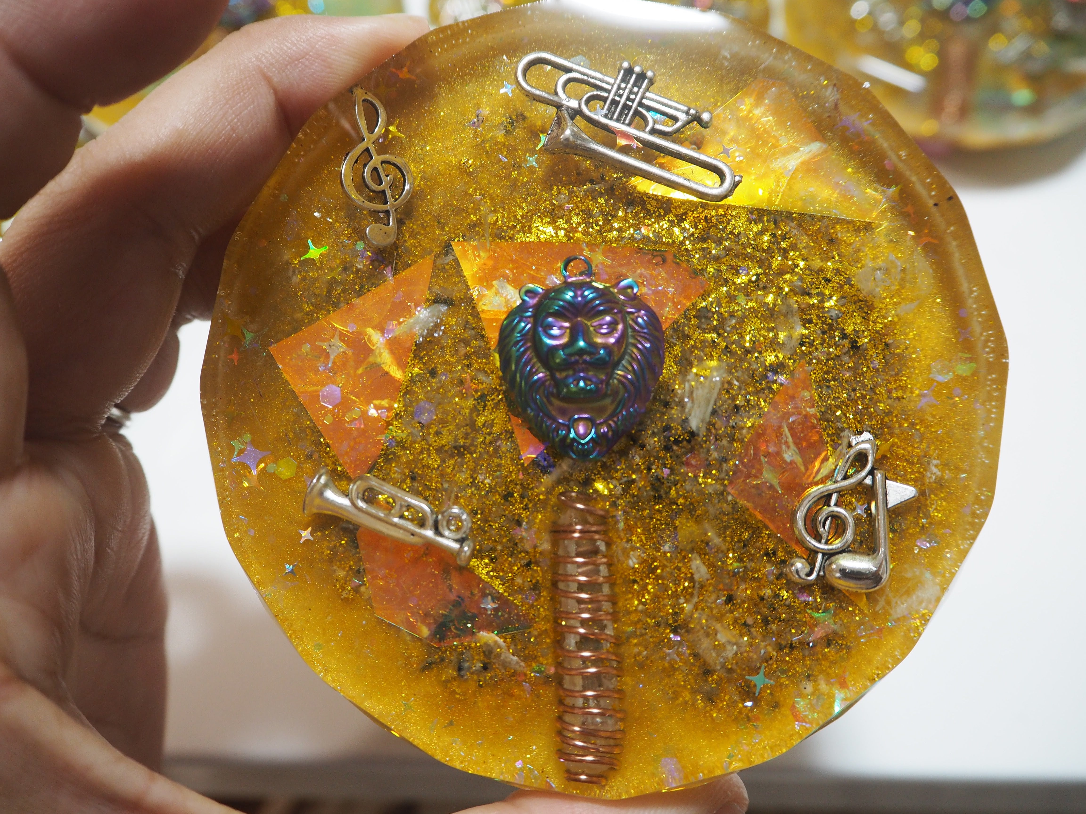 こちらは、日本で唯一天界(天使)と繋がる海(福岡糸島・櫻井神社二見ヶ浦)の黄金に輝くプレートオルゴナイトです。