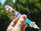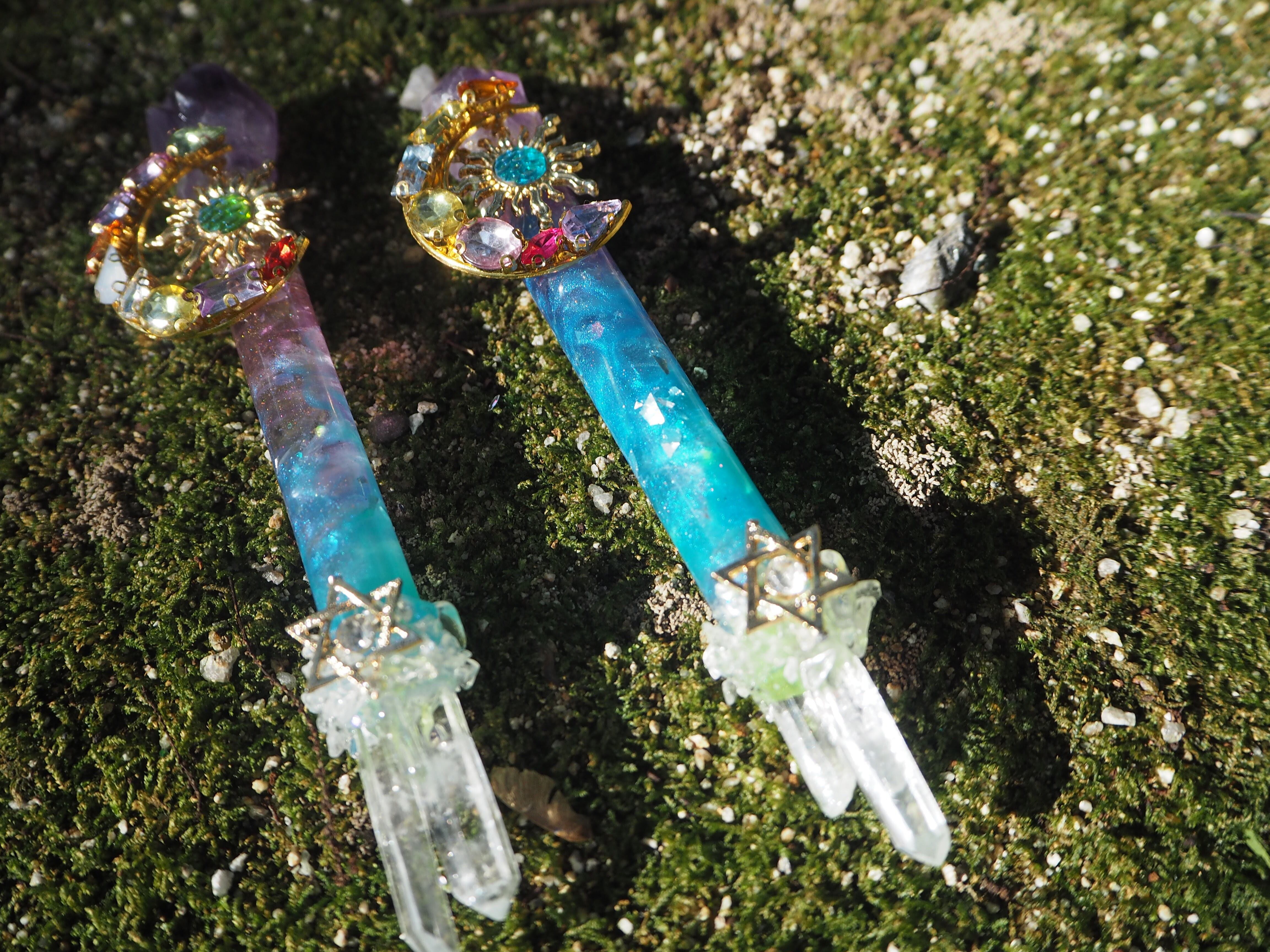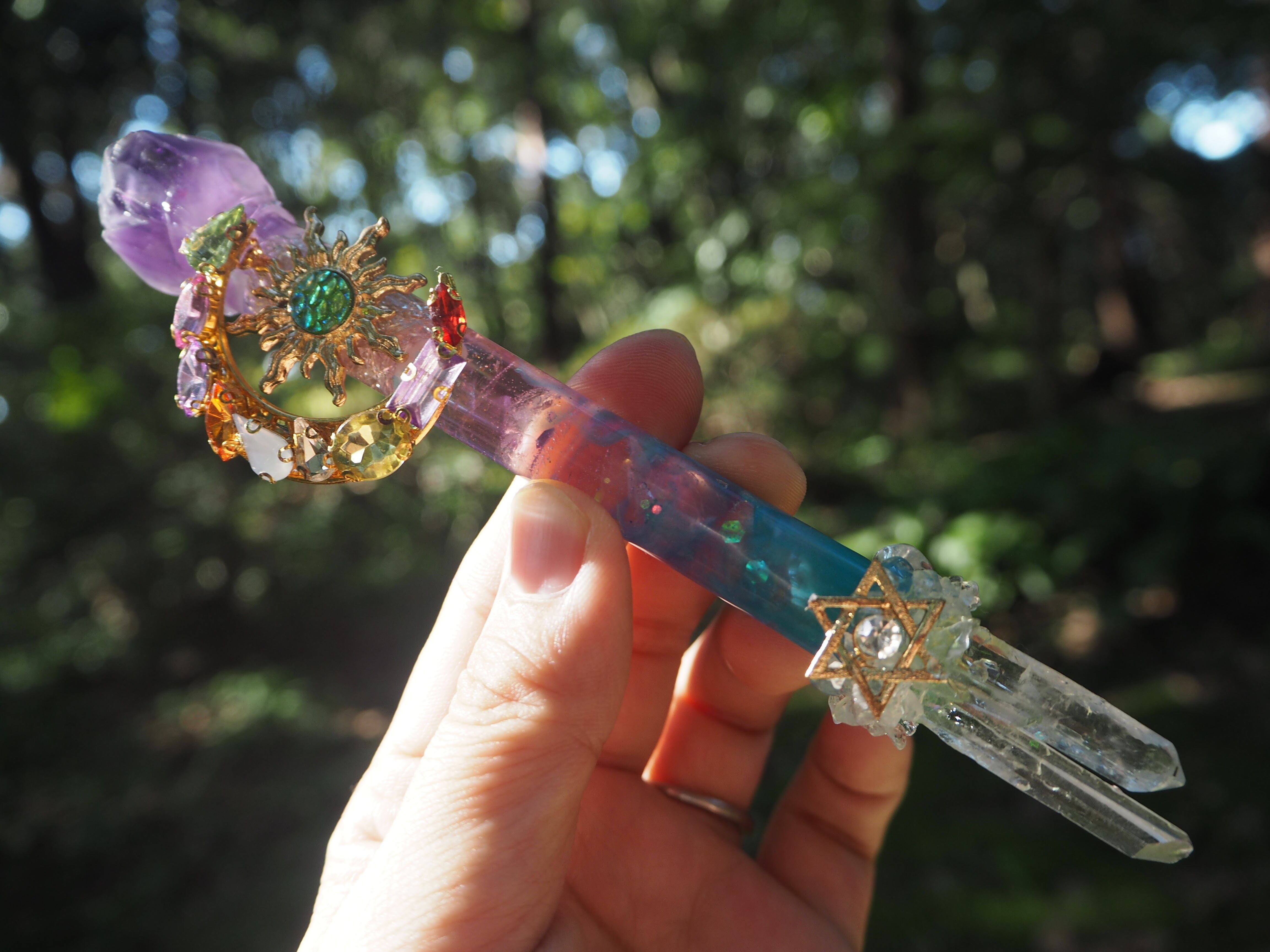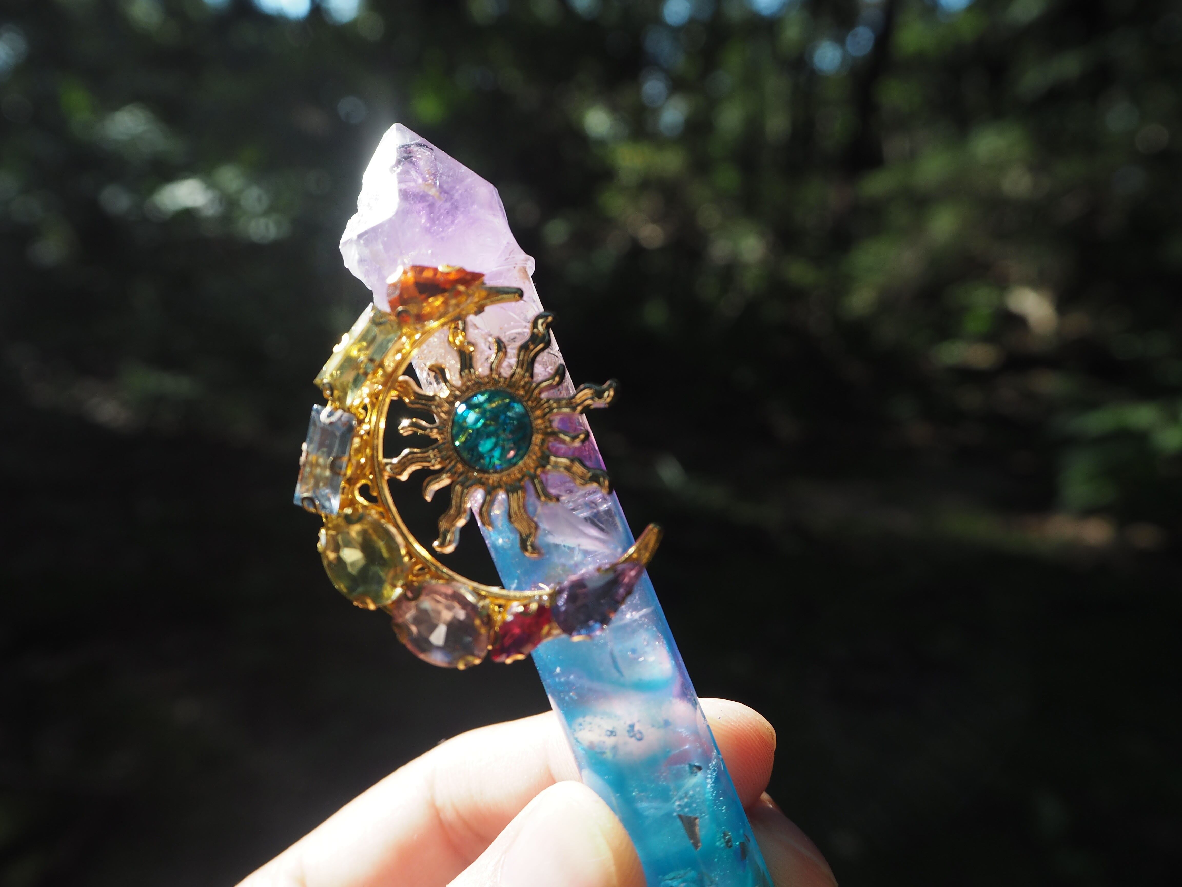 トップにアメジストの原石、スティック部には水晶、先端には、ポイント水晶その周りに水晶のさざれを貼り付けました。