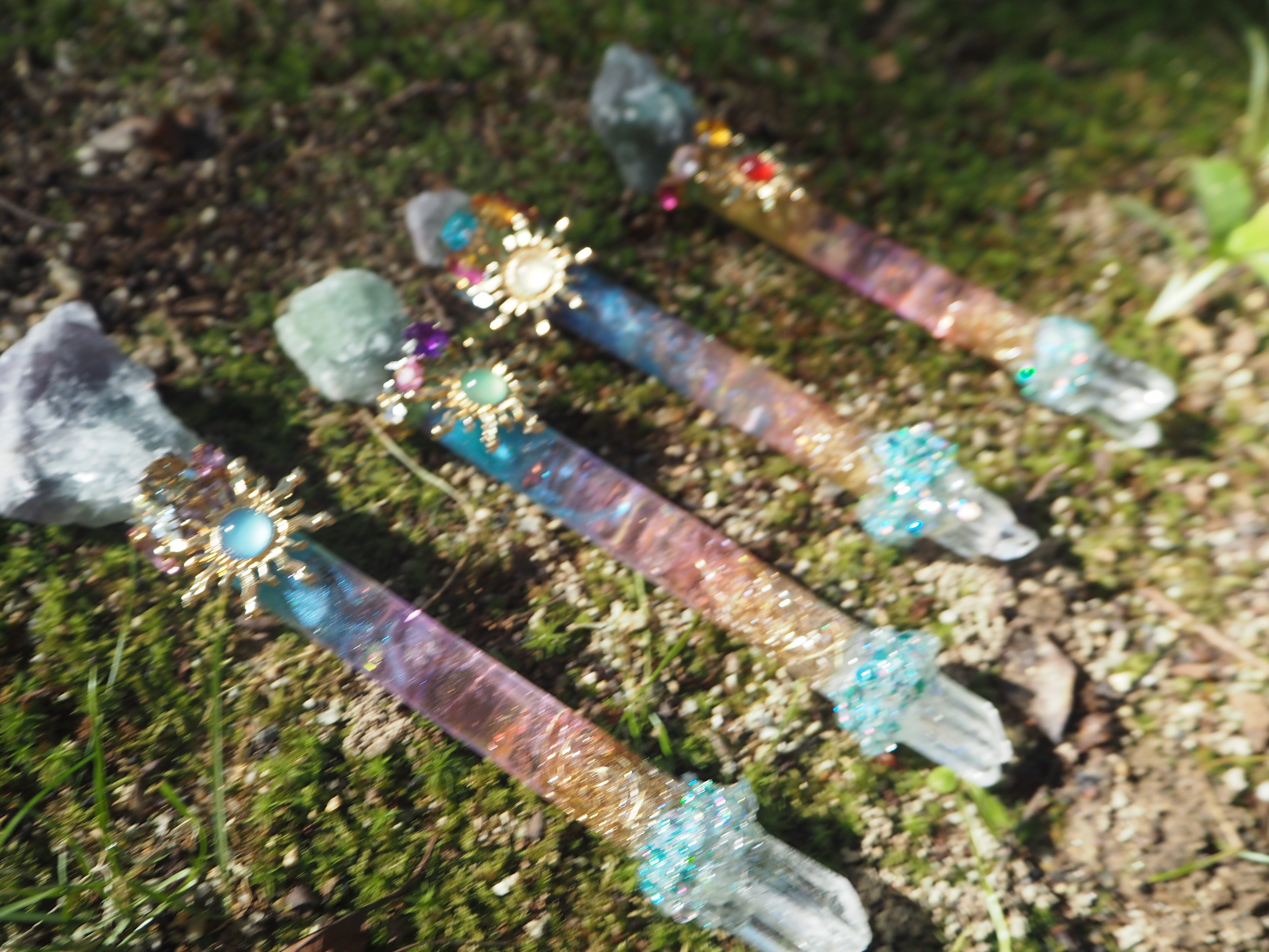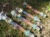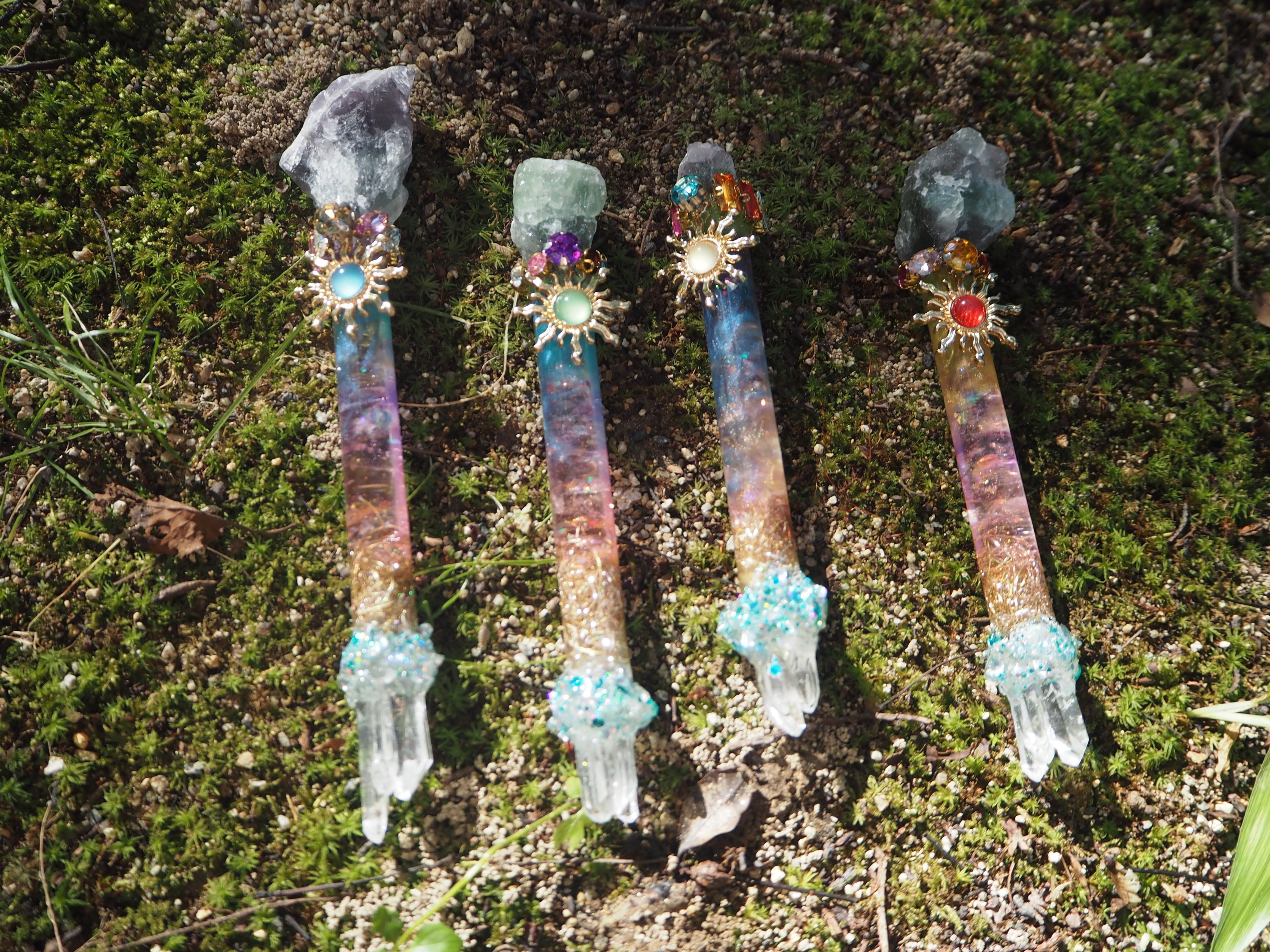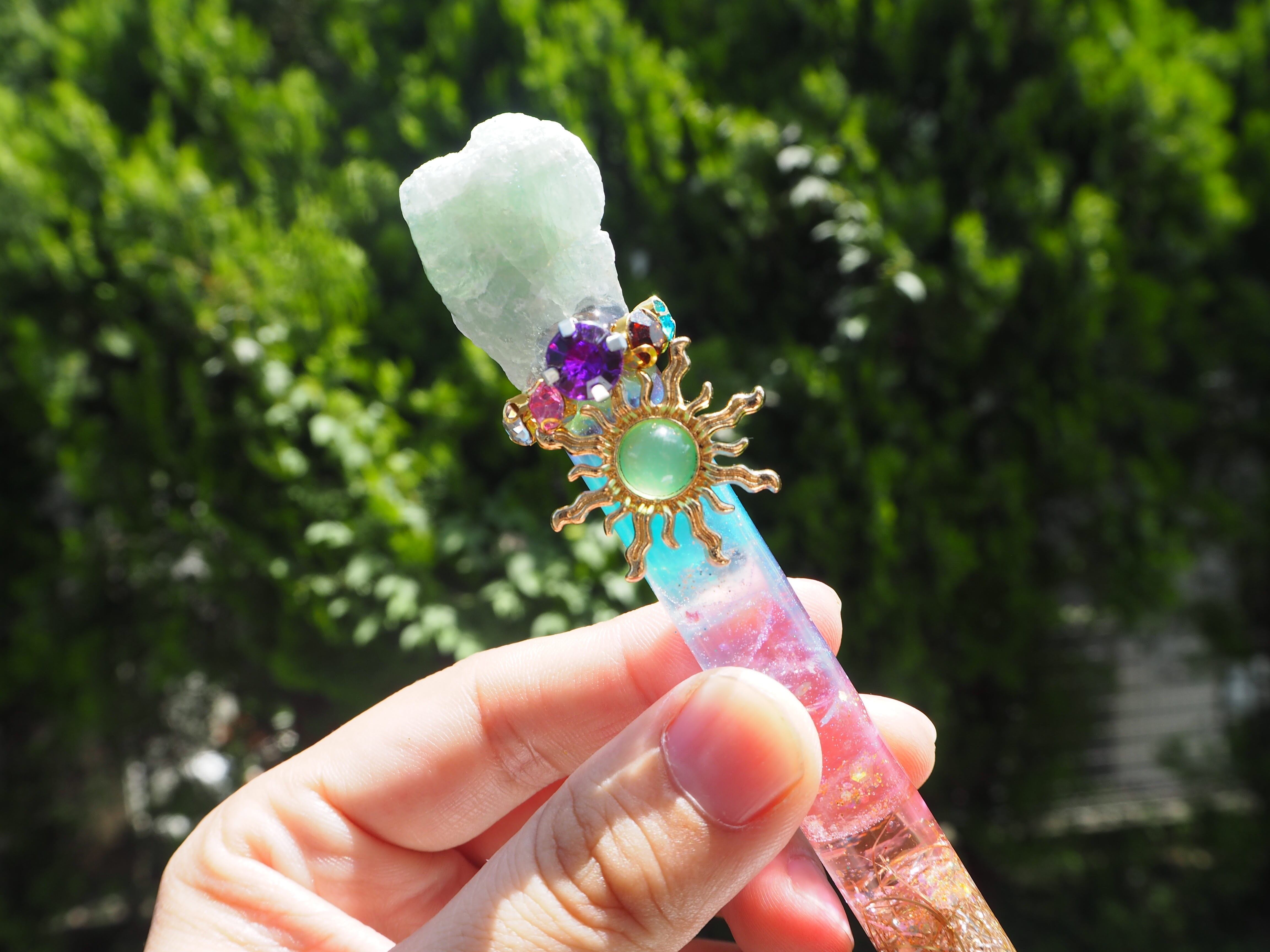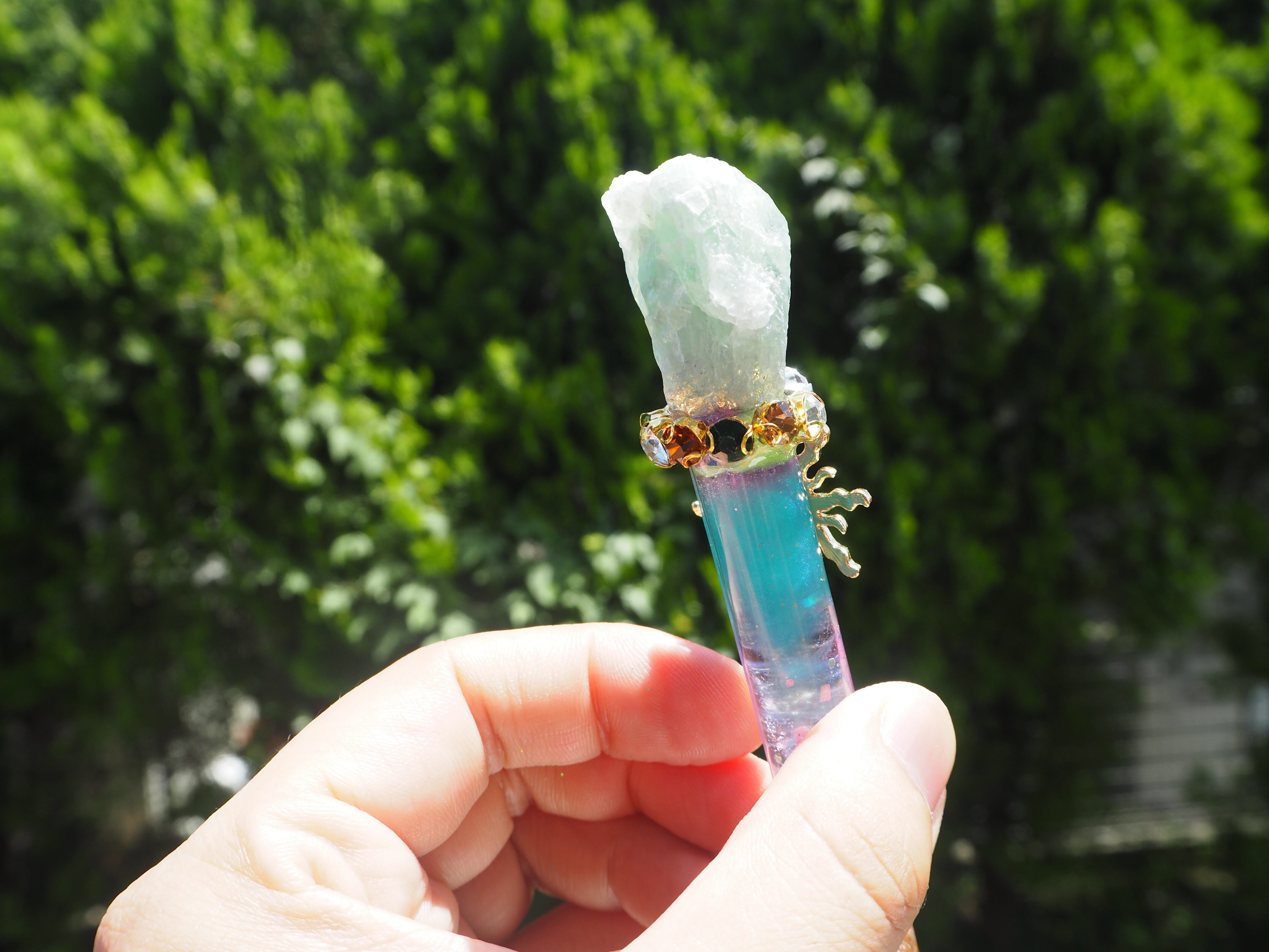 トップにフローライトの原石、スティック部には水晶、先端には、ポイント水晶その周りに水晶のさざれを貼り付けました。
