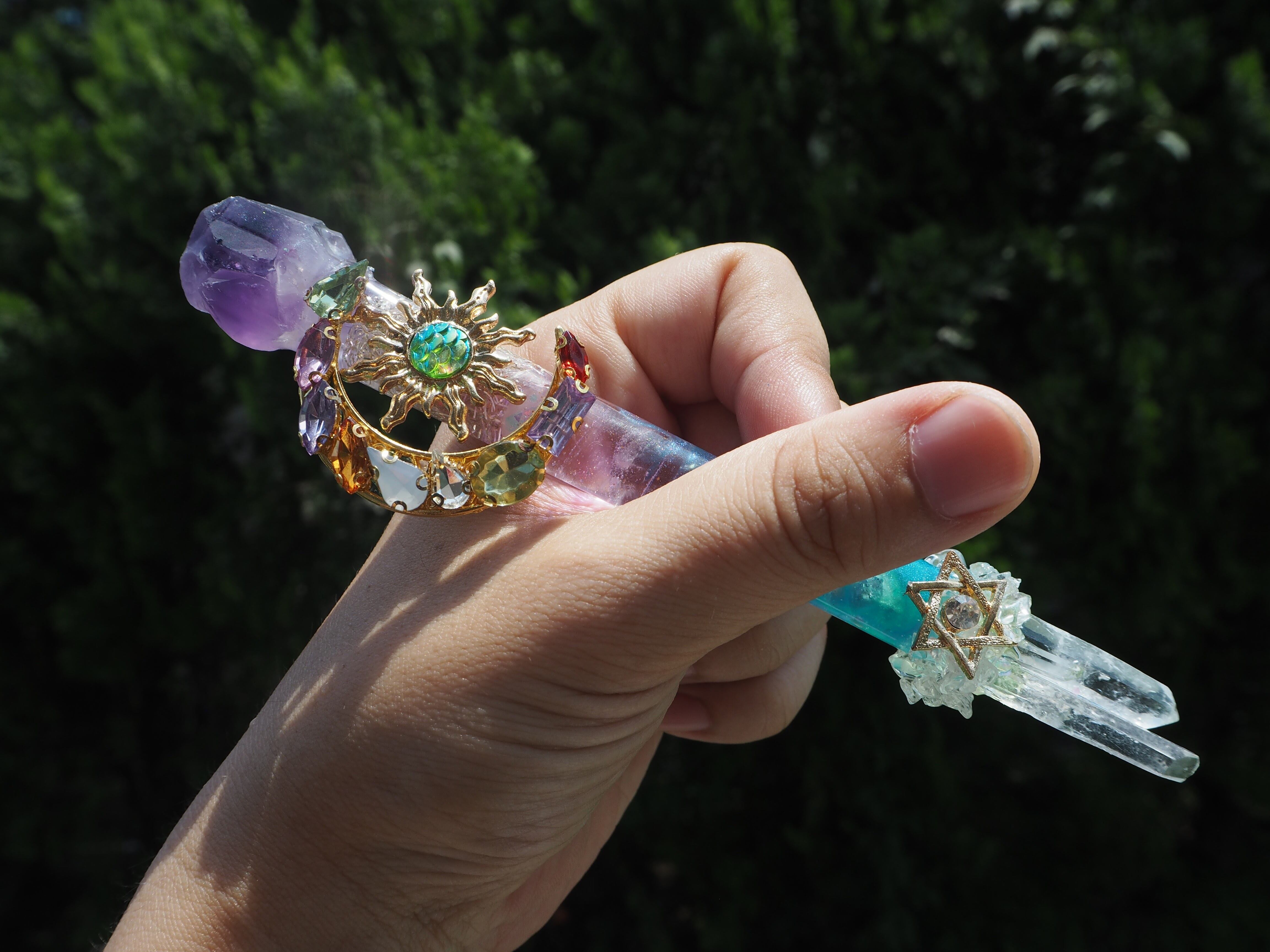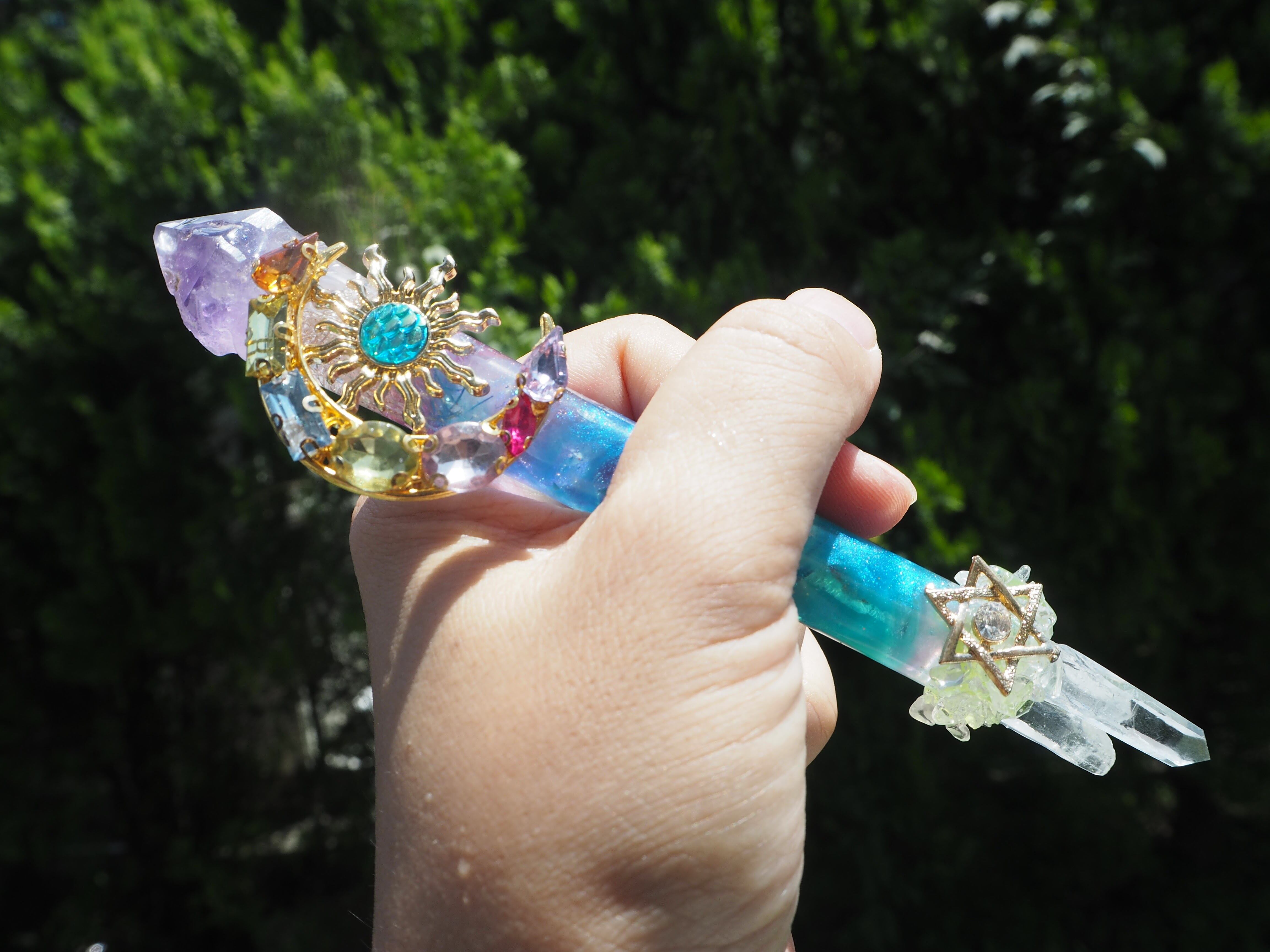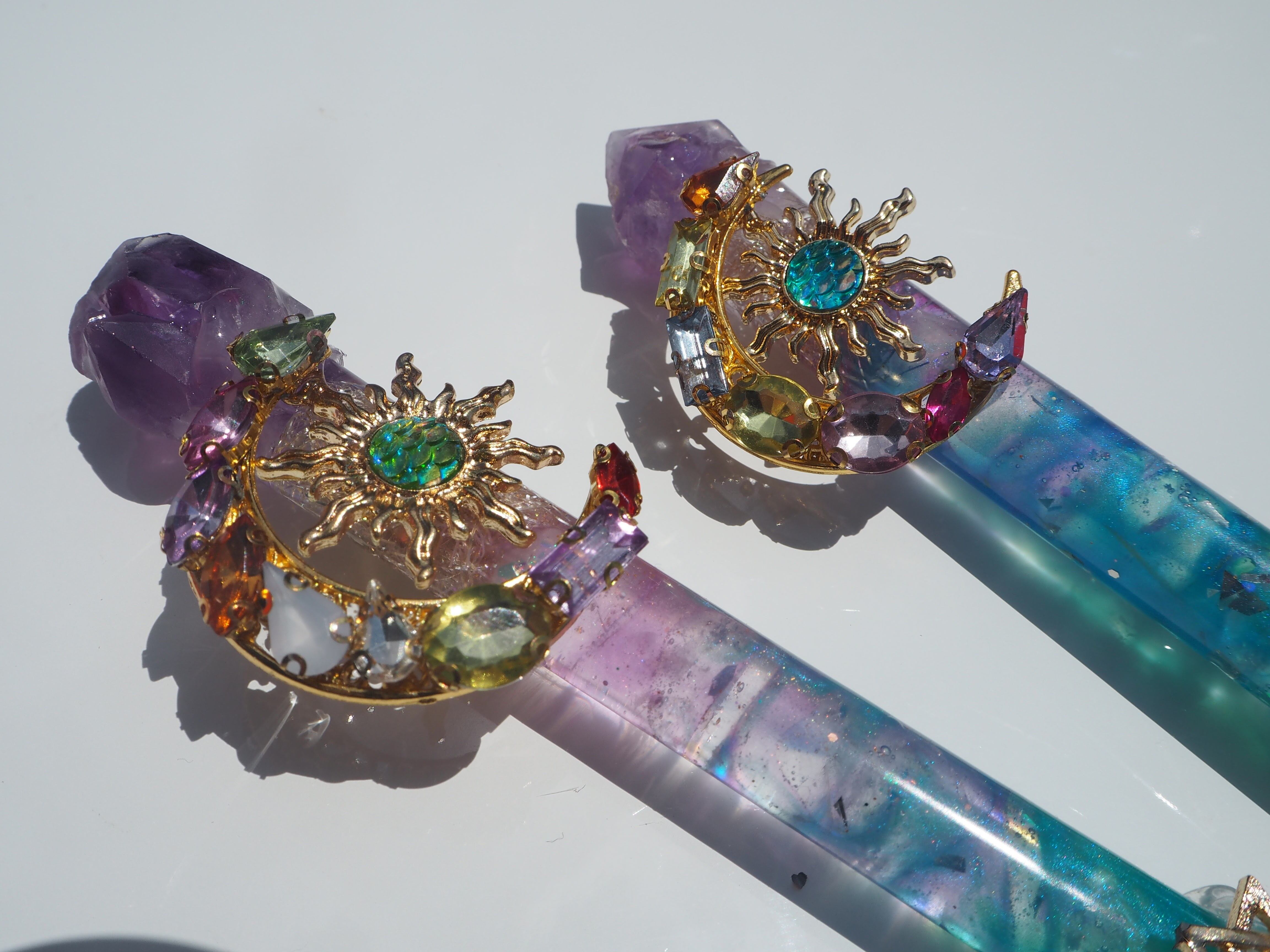 トップにアメジストの原石、スティック部には水晶、先端には、ポイント水晶その周りに水晶のさざれを貼り付けました。