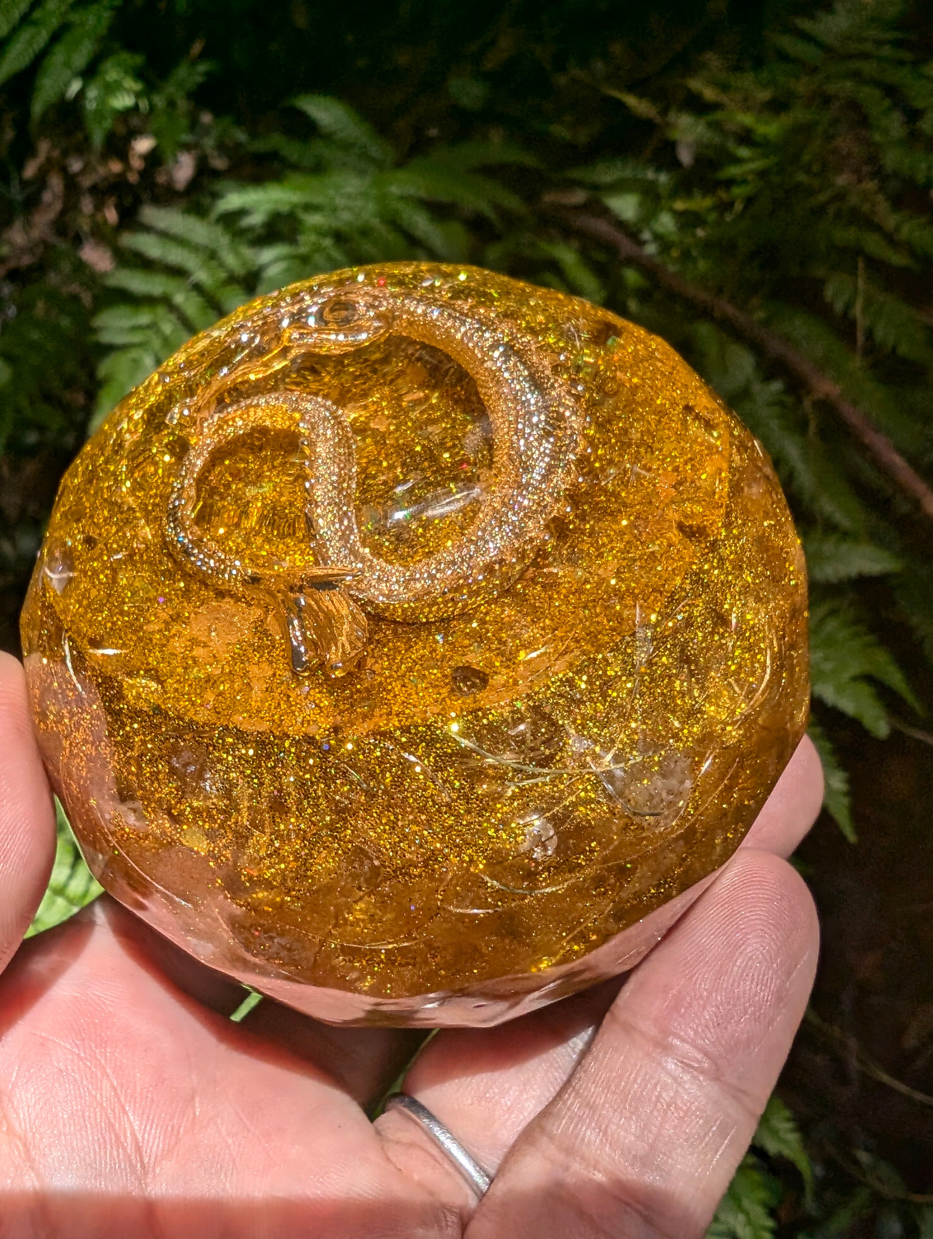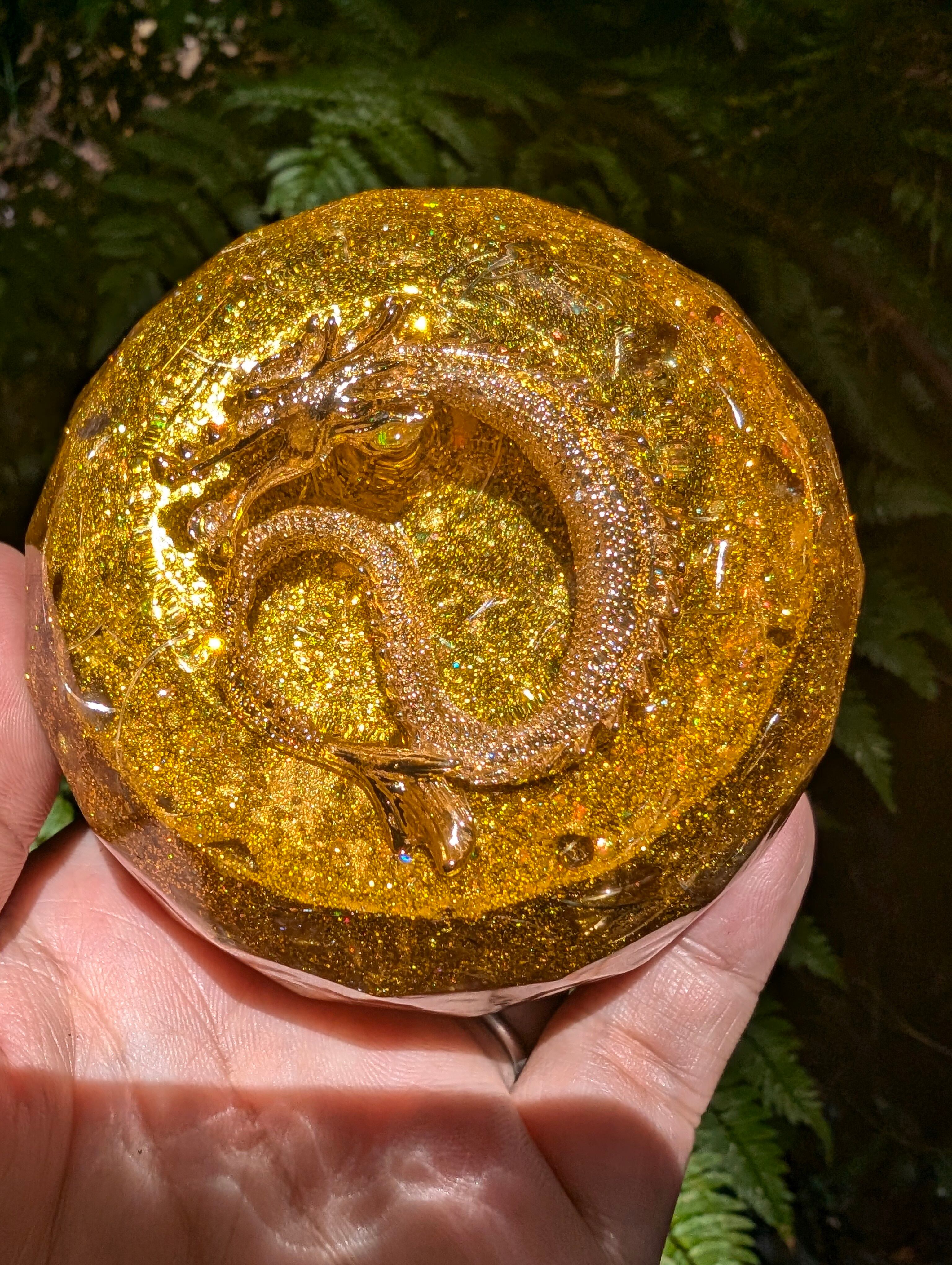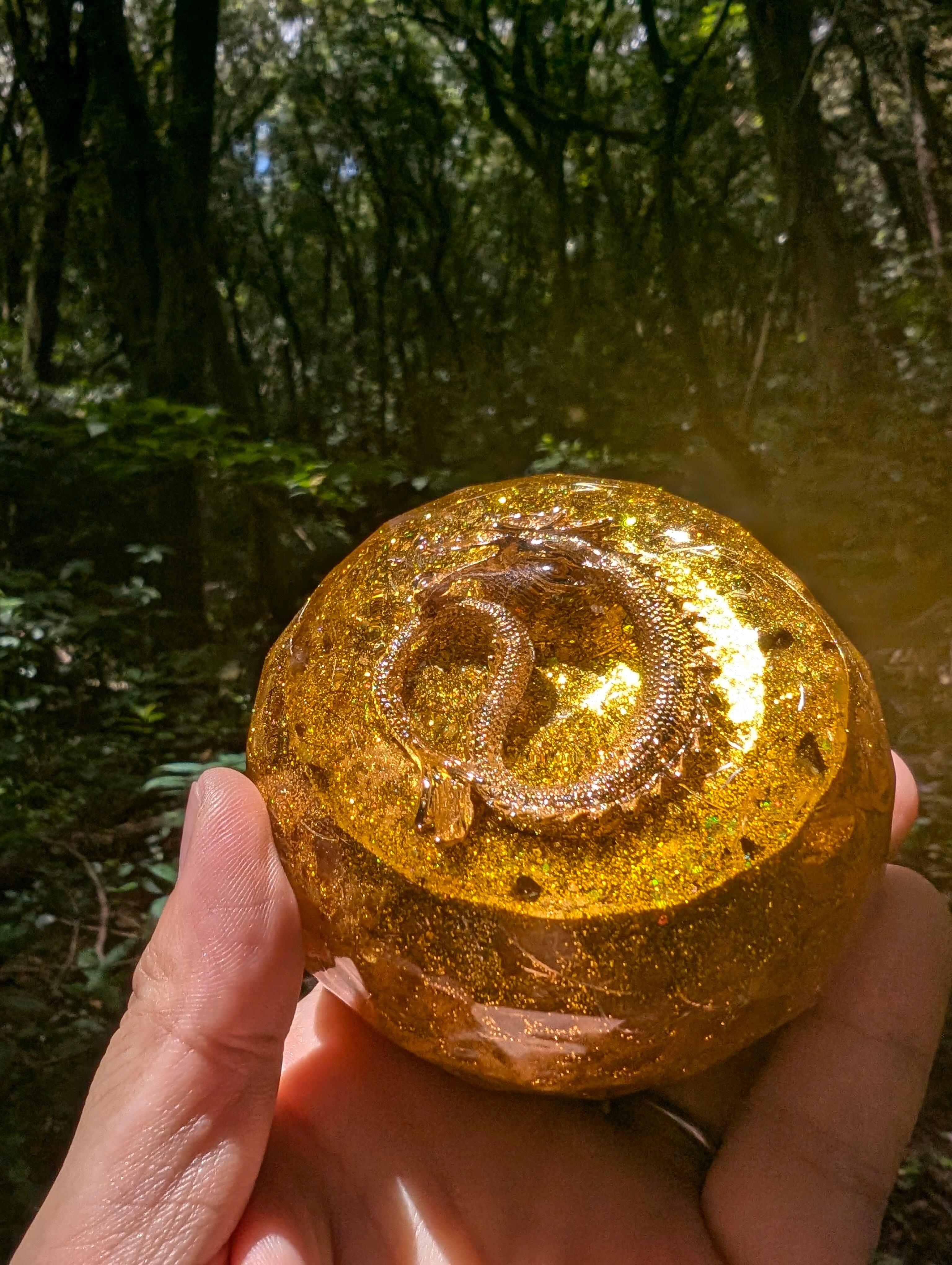 こちらは宇宙と繋がる✨宮古島の麻炭入り浄化の龍オルゴナイトです。数年ぶりの制作で、更にバージョンアップしました!今回は、一見全てゴールドに見えますが、下部に宮古島麻炭が入っています。