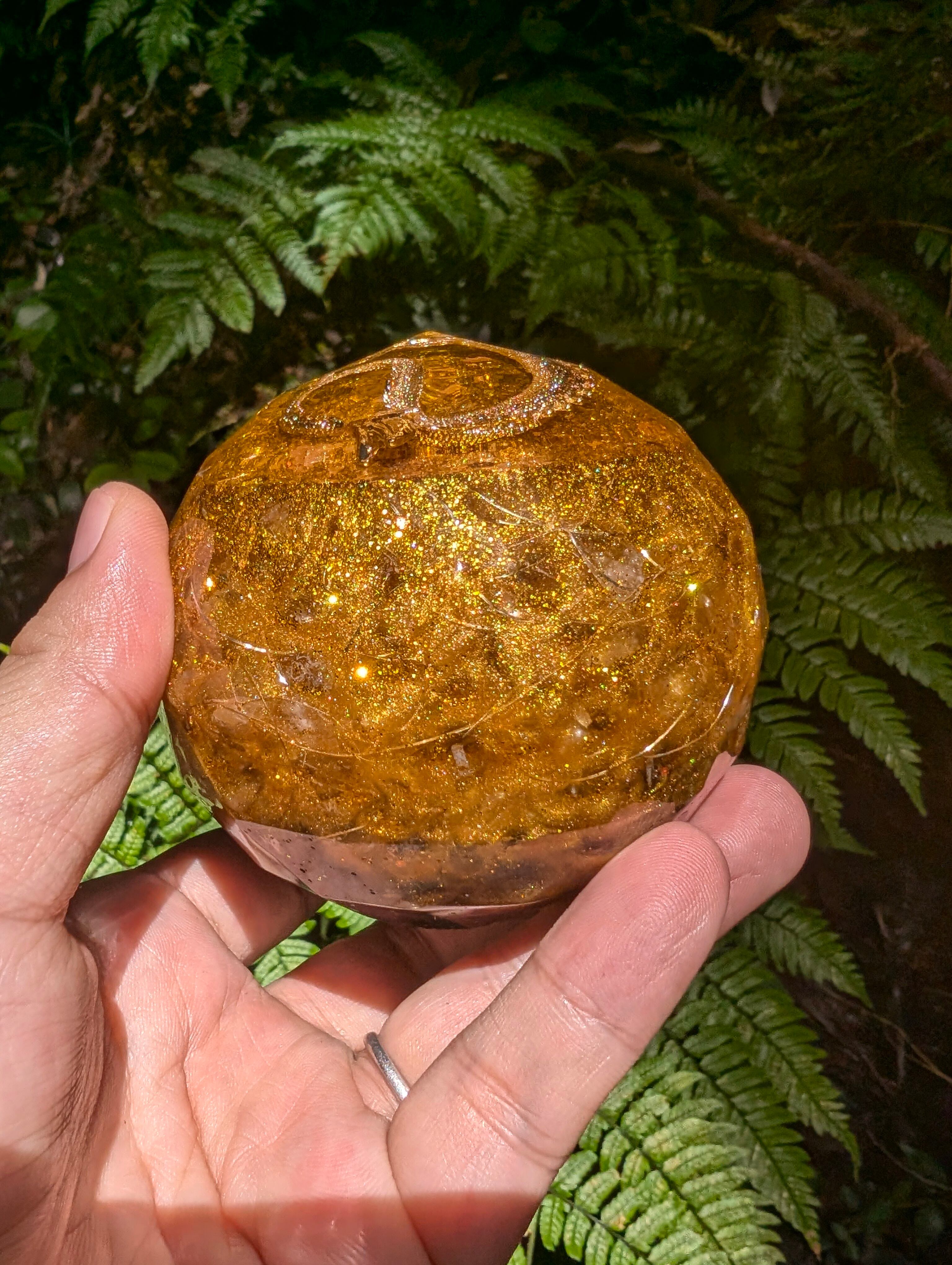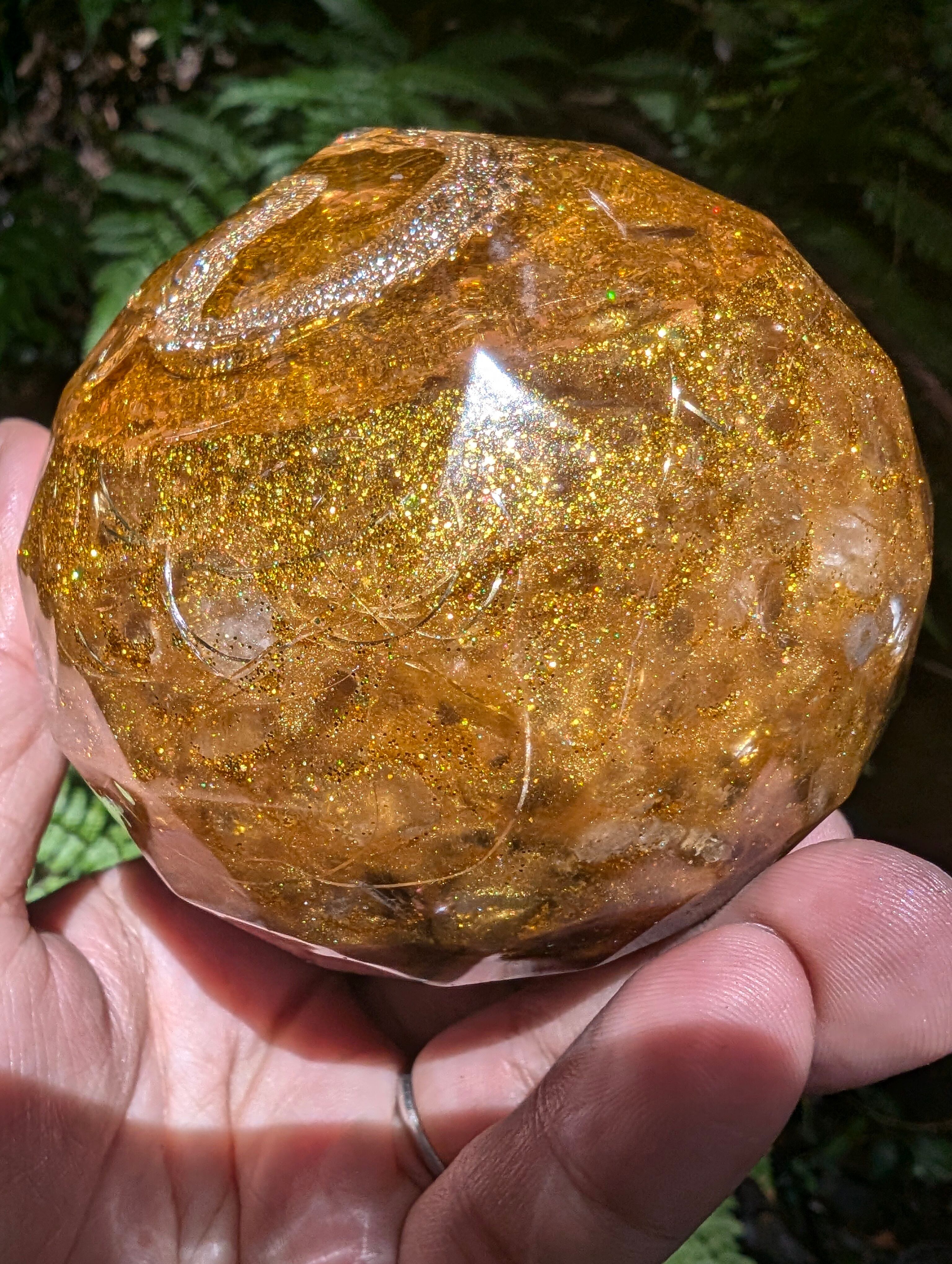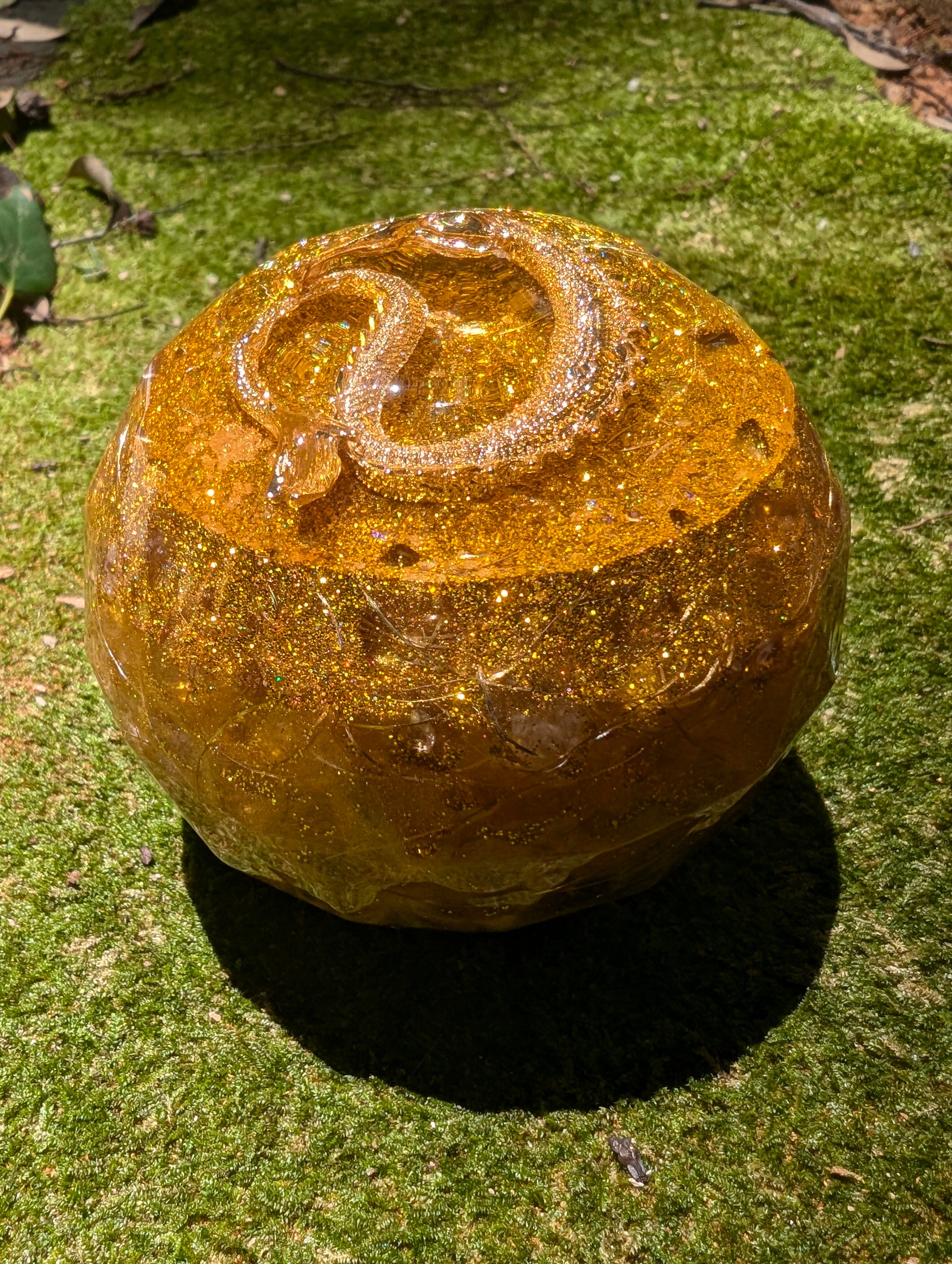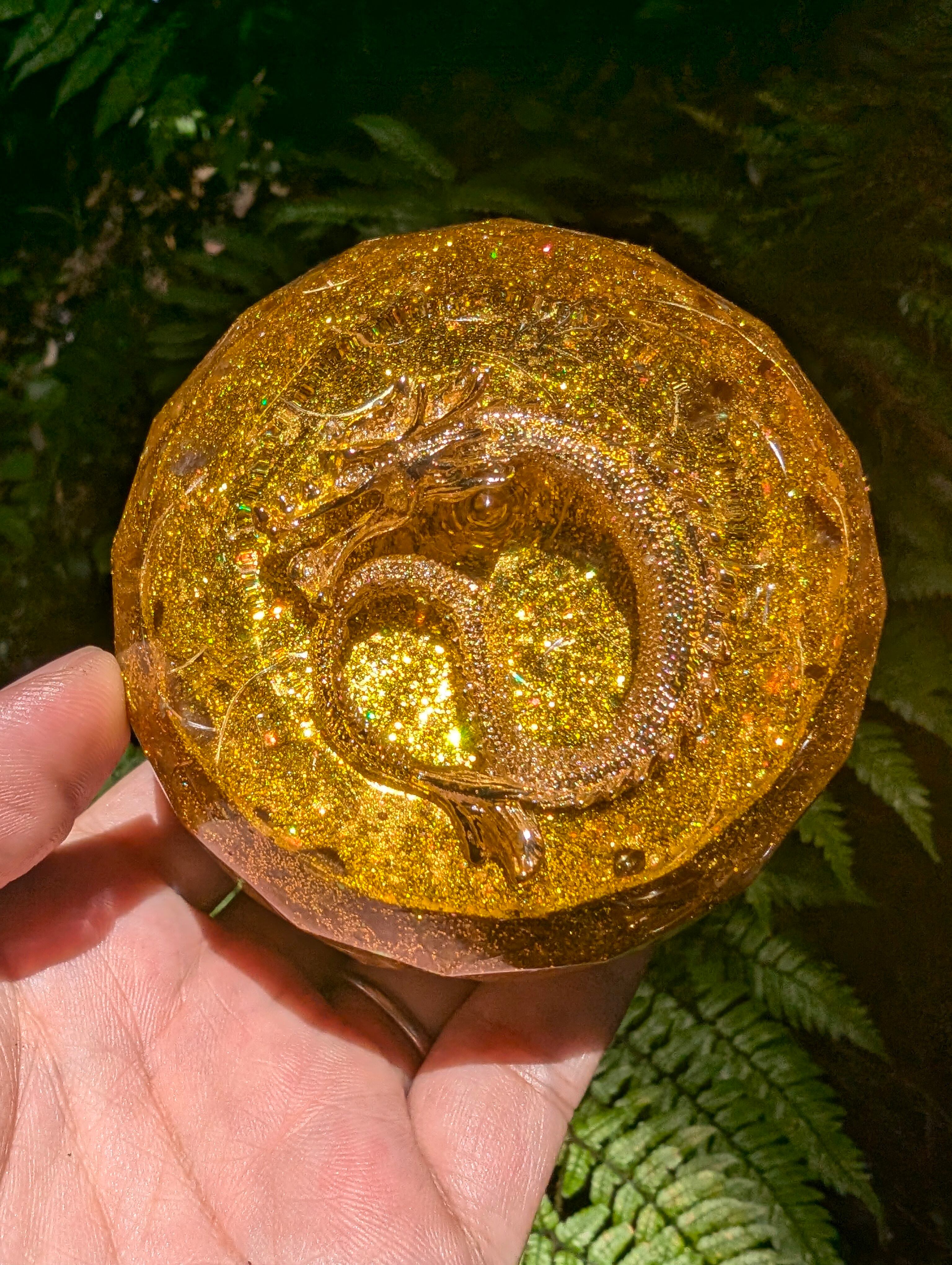 こちらは宇宙と繋がる✨宮古島の麻炭入り浄化の龍オルゴナイトです。数年ぶりの制作で、更にバージョンアップしました!今回は、一見全てゴールドに見えますが、下部に宮古島麻炭が入っています。