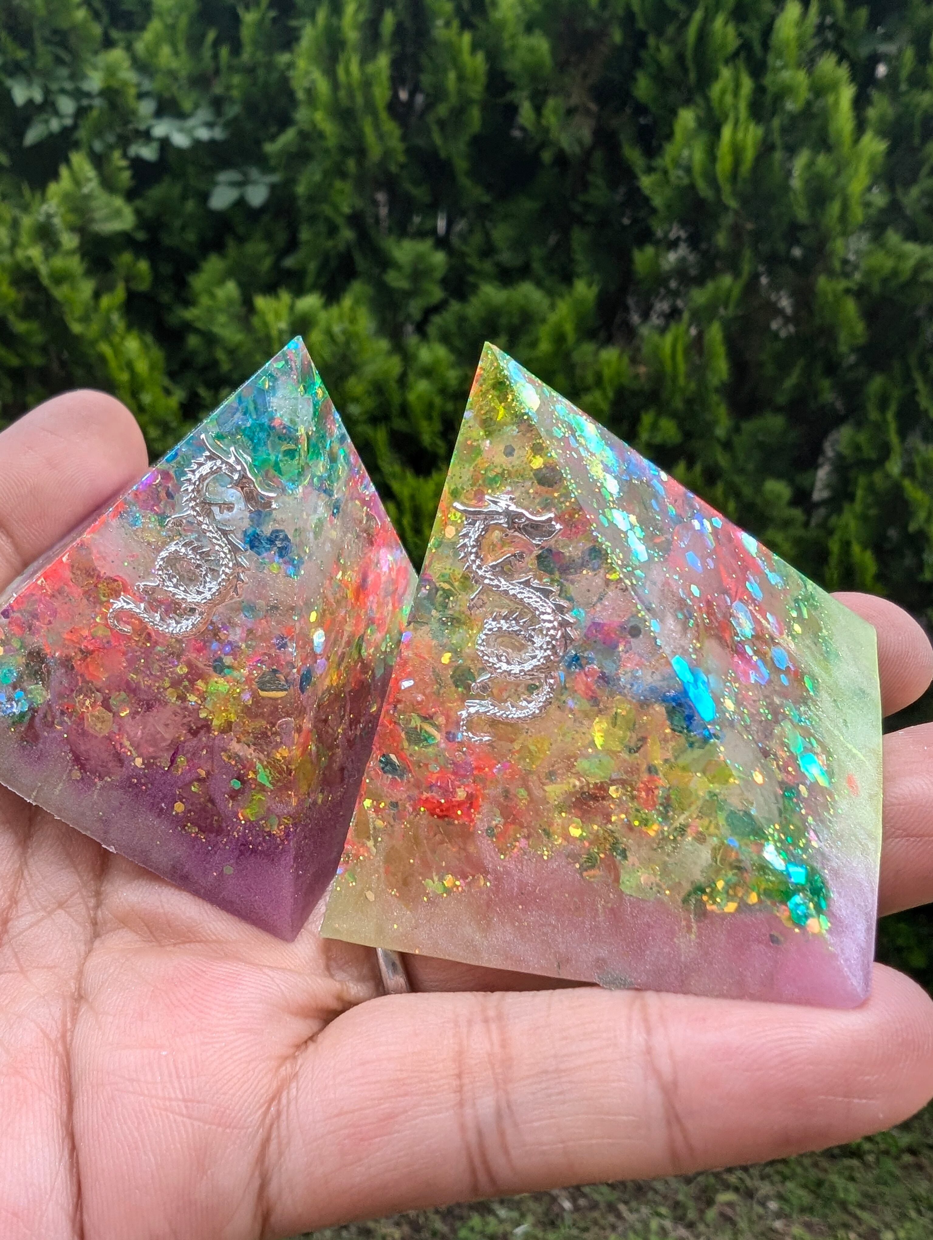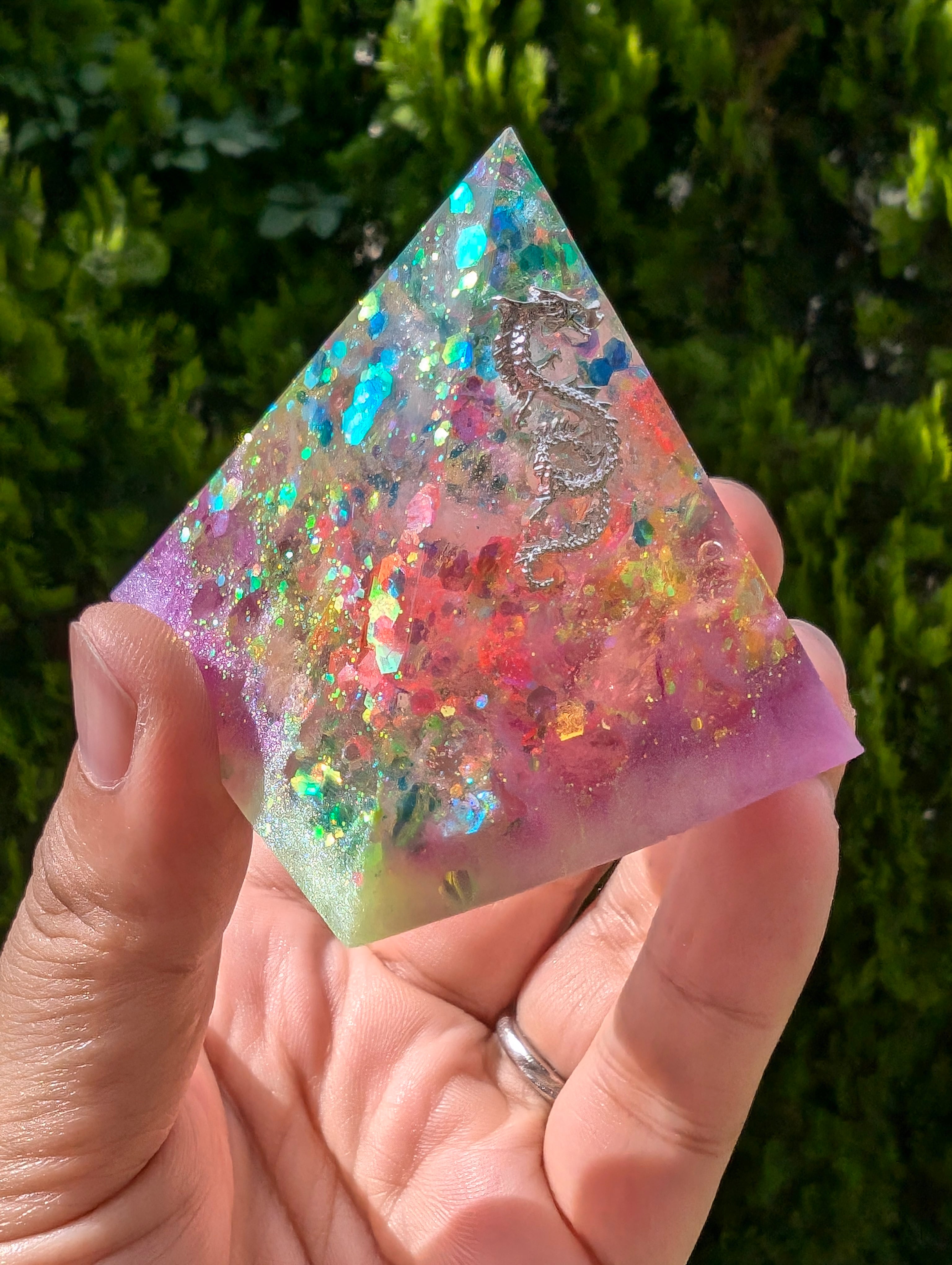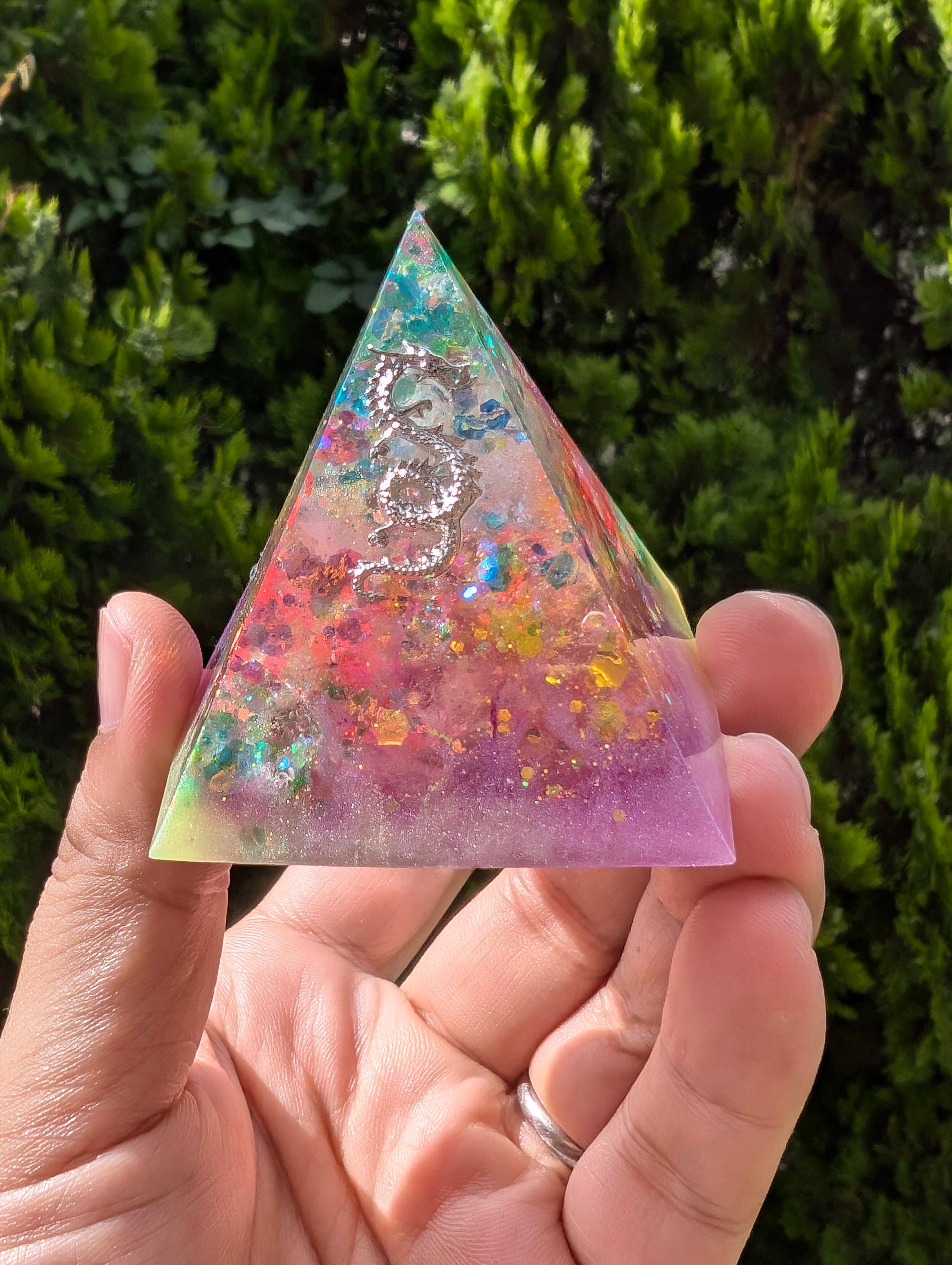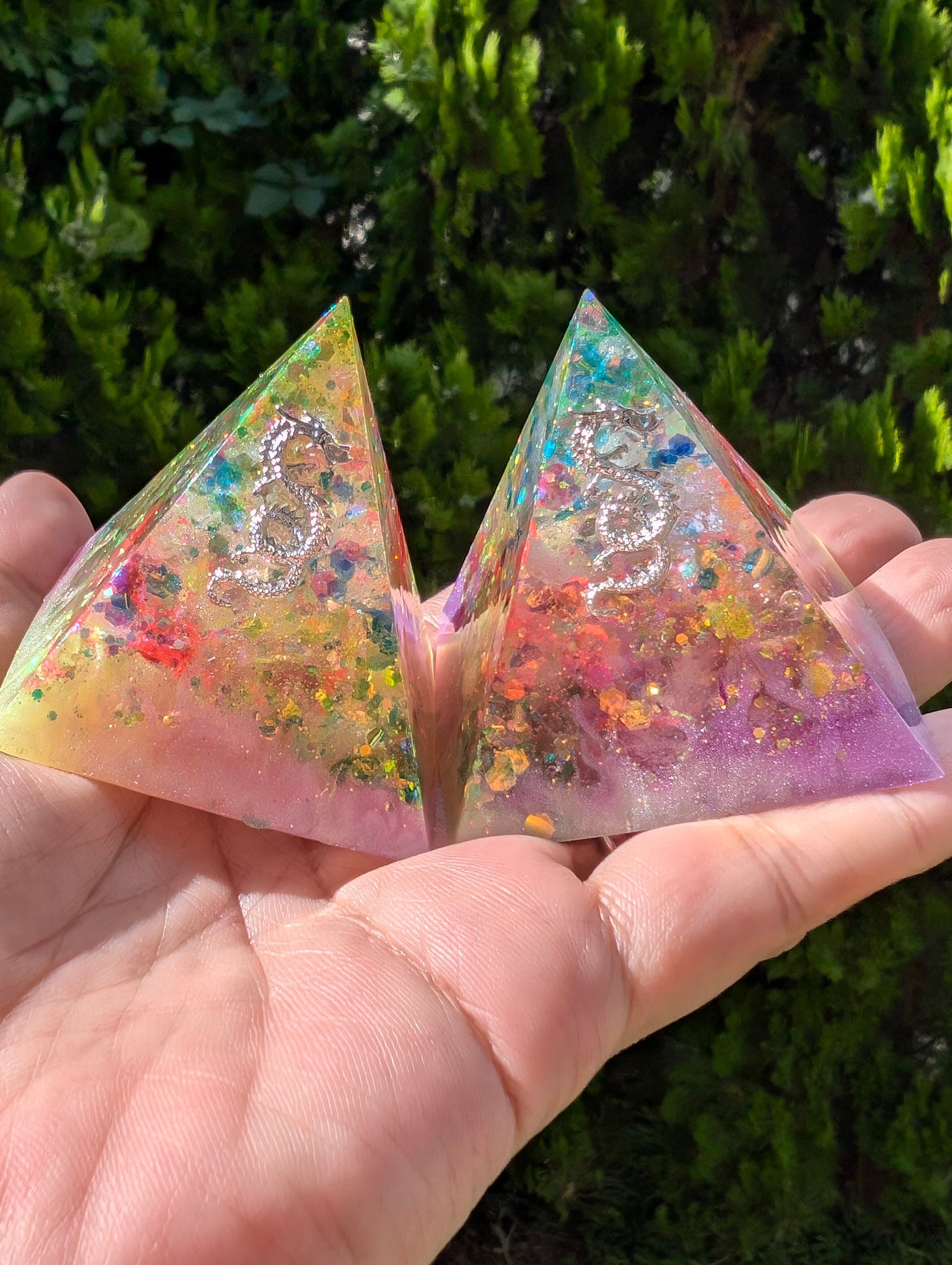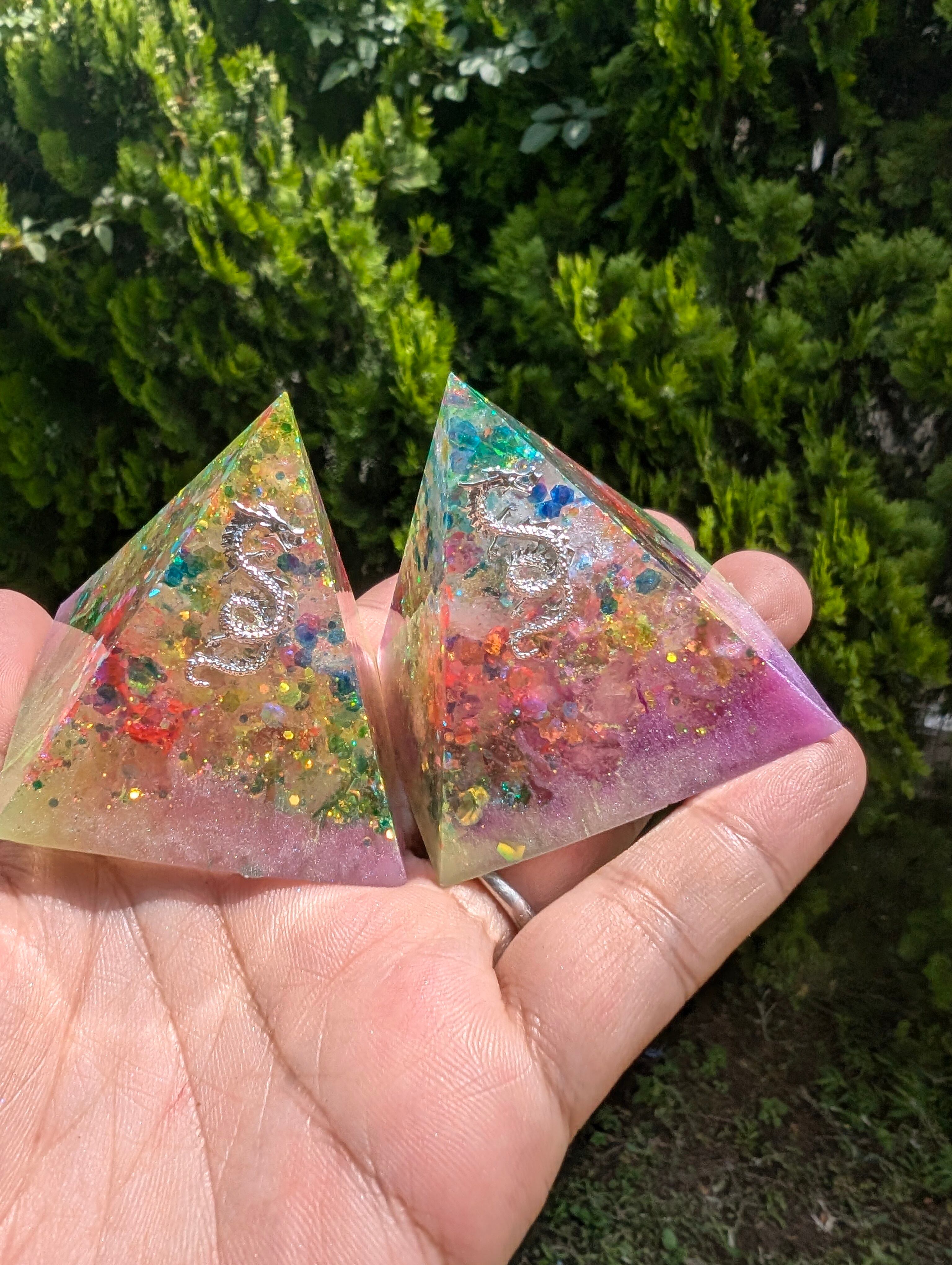 こちらは、不安を手放し、あなたの人生を明るく導くサポートをしてくれる虹龍のオルゴナイトです✨金龍さんはピラミッドの中に、銀龍さんは外側に✨