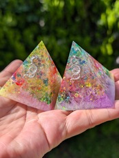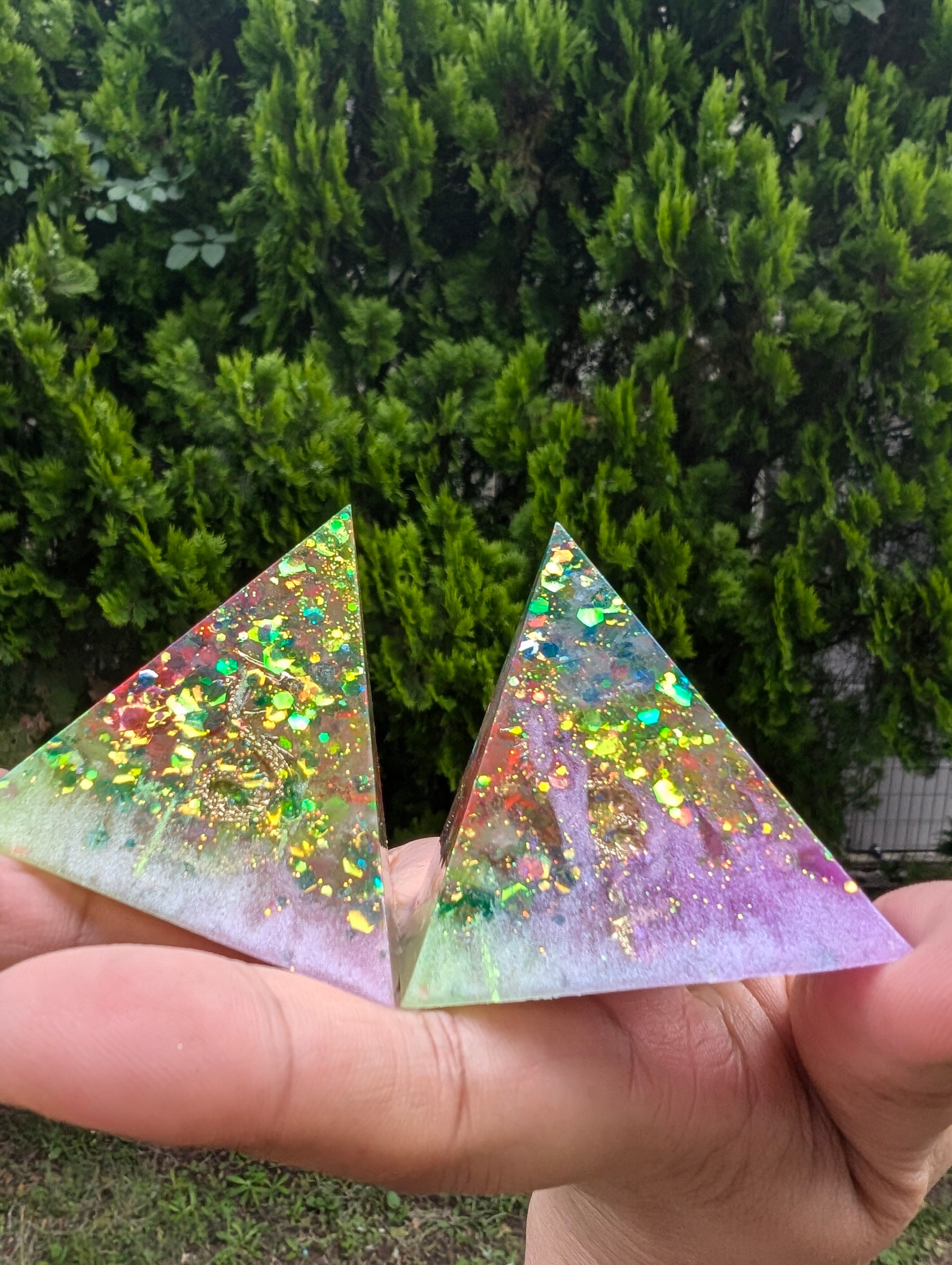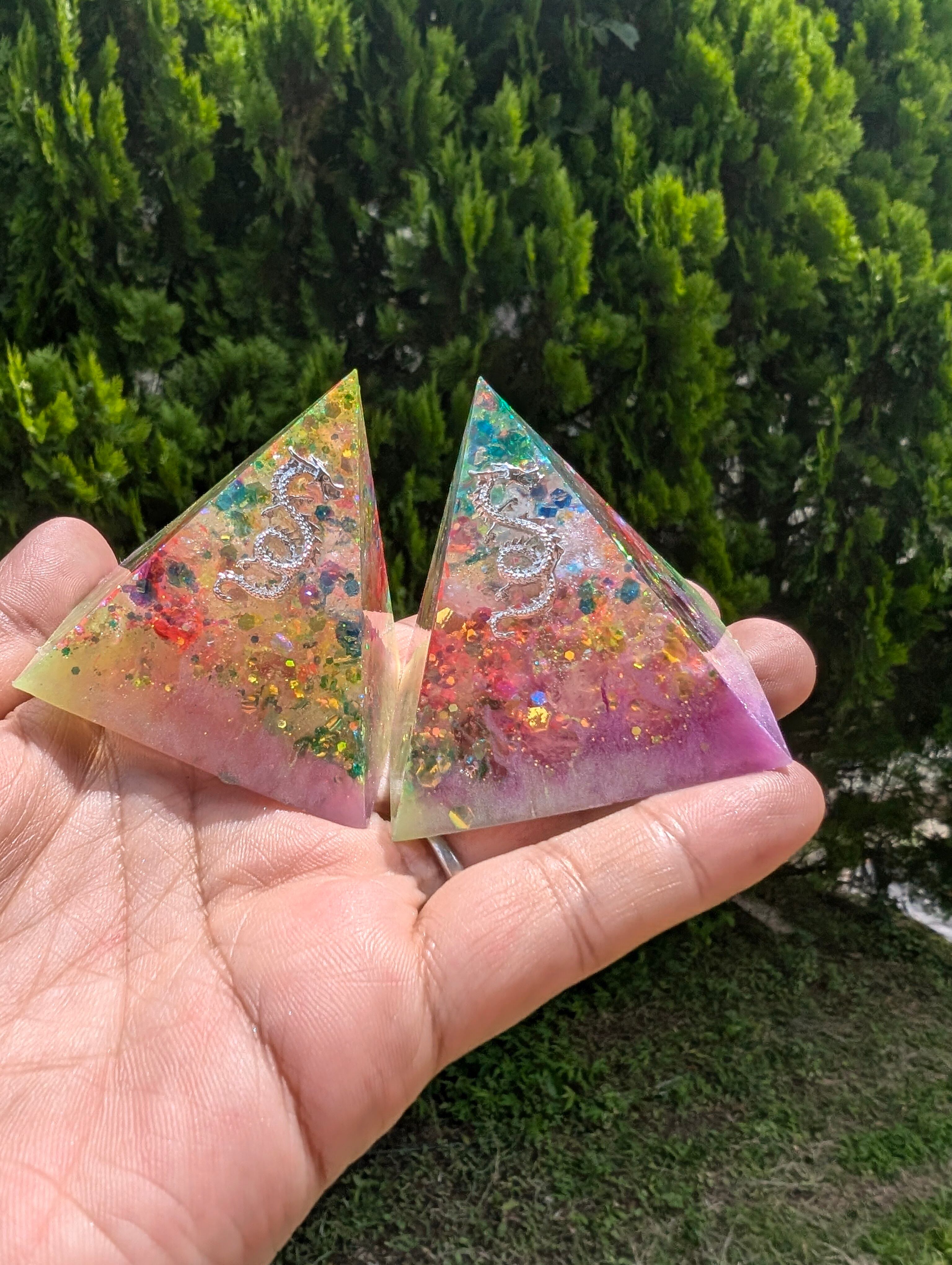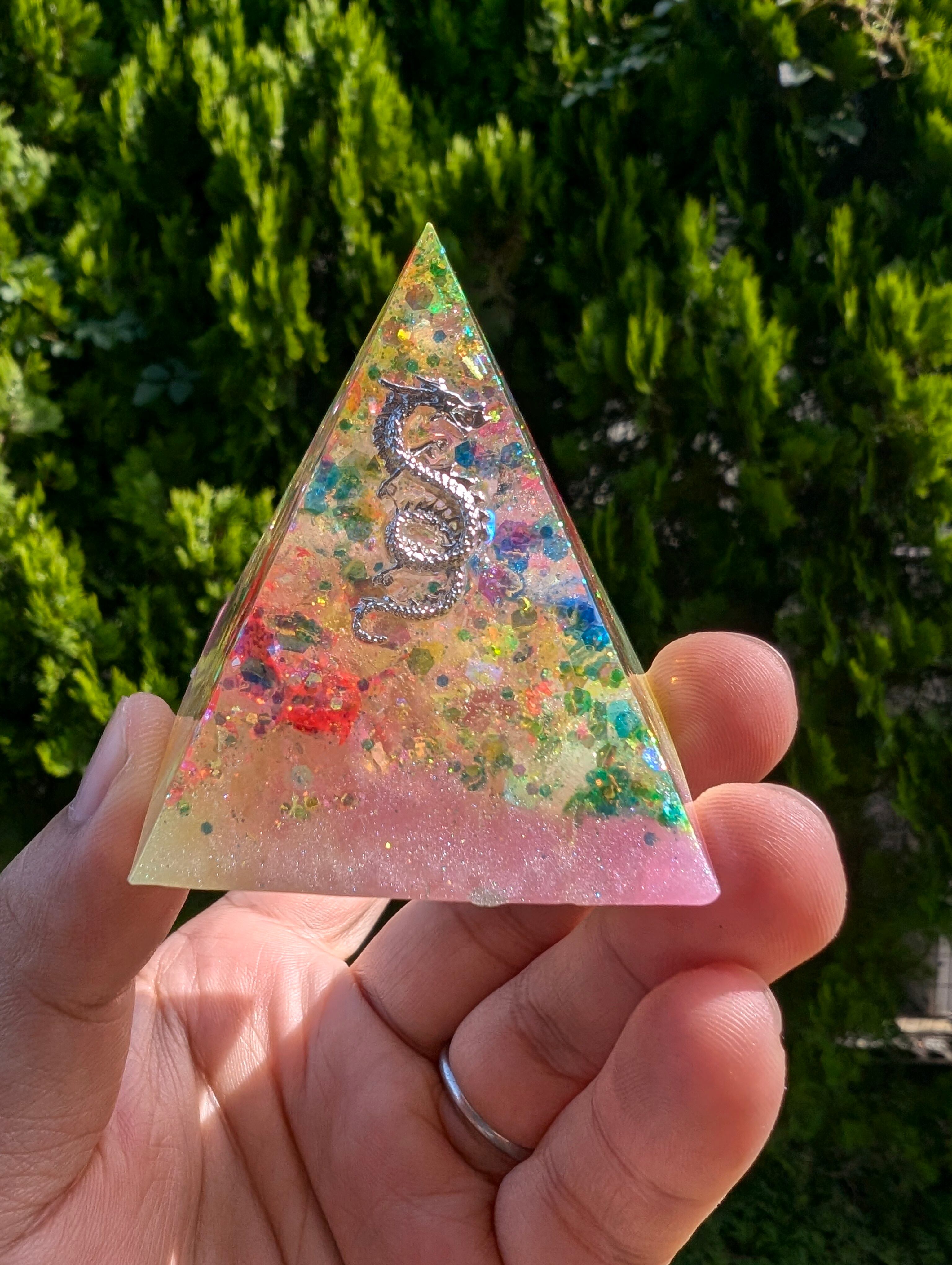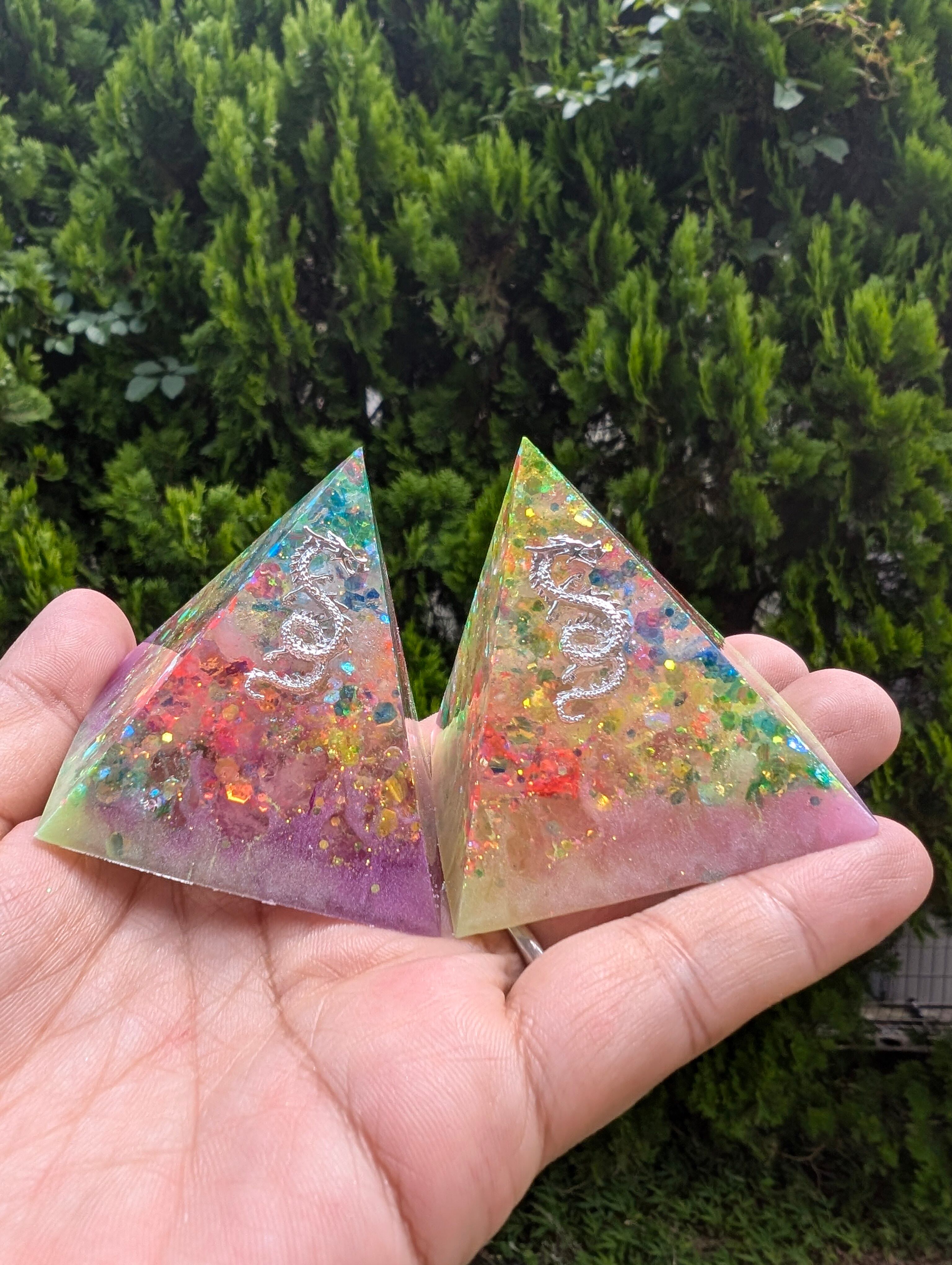 こちらは、不安を手放し、あなたの人生を明るく導くサポートをしてくれる虹龍のオルゴナイトです✨金龍さんはピラミッドの中に、銀龍さんは外側に✨