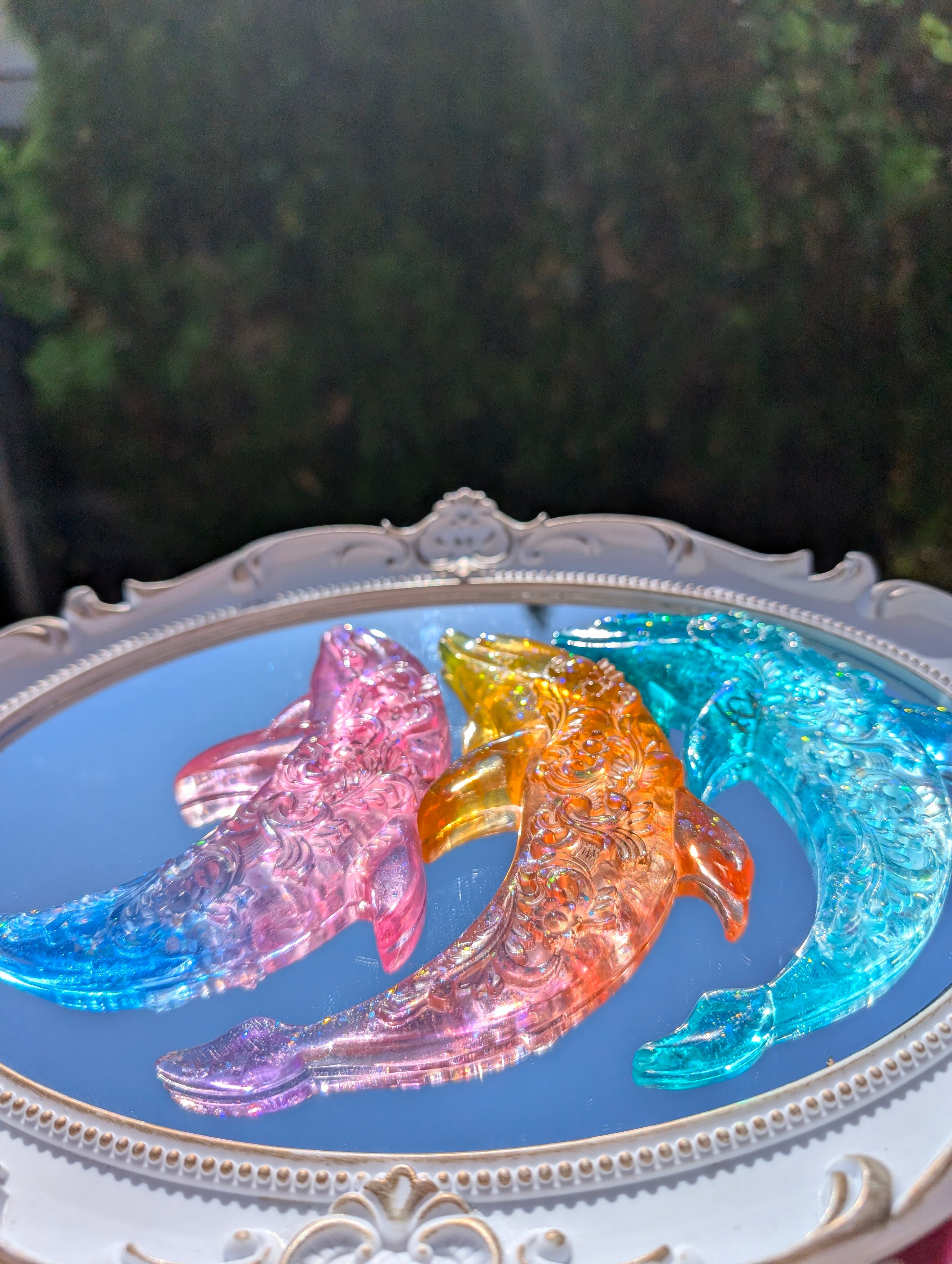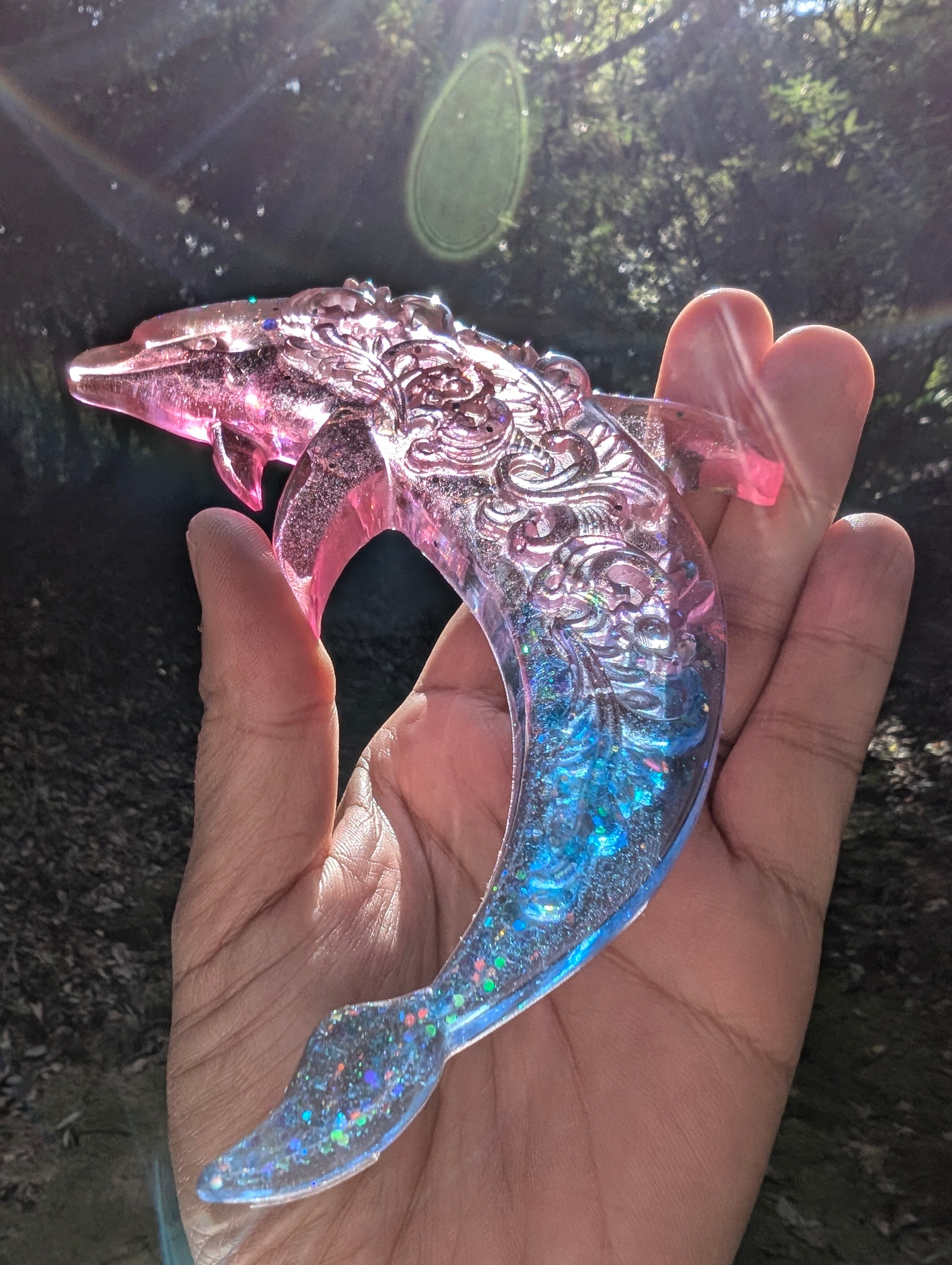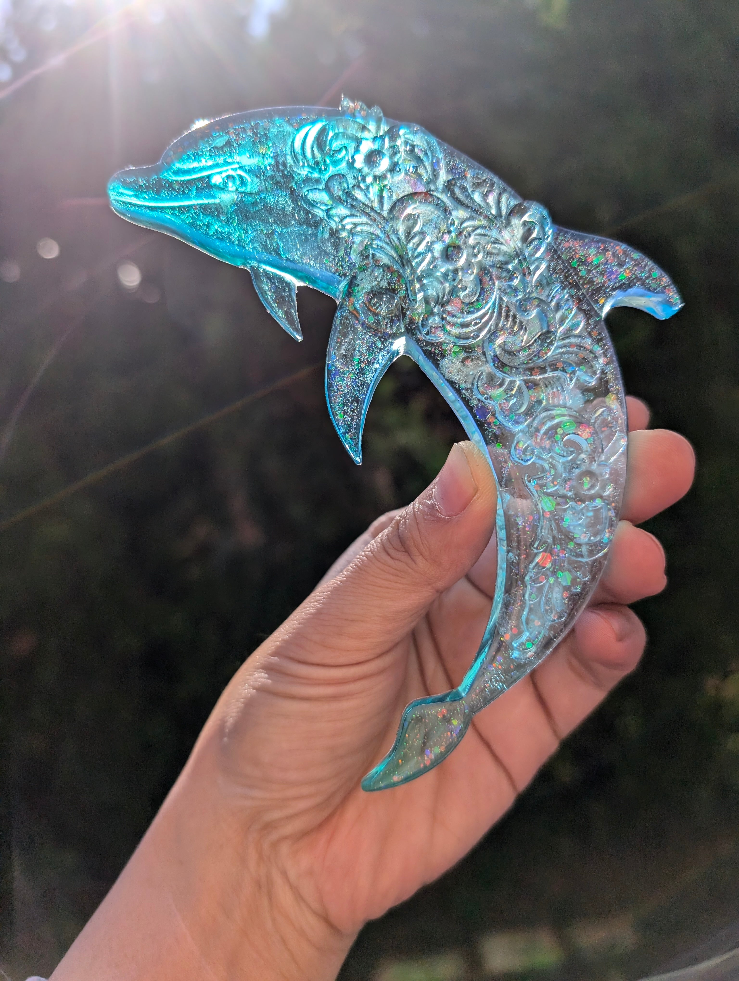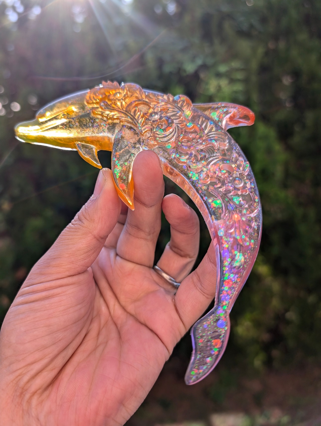 ドルフィンの体は全身が輝く光沢で包まれていて、非常に純粋な心を持っており、闇とは真逆のところにいる生き物で、悪を消し去る強いパワーを持っていると言われています。
